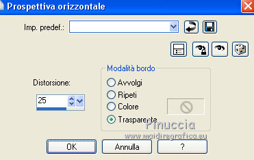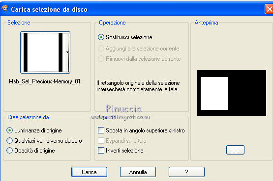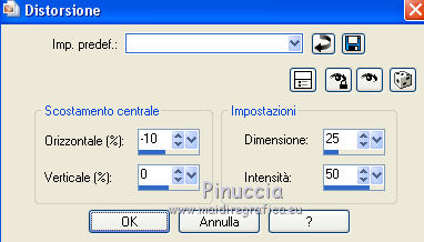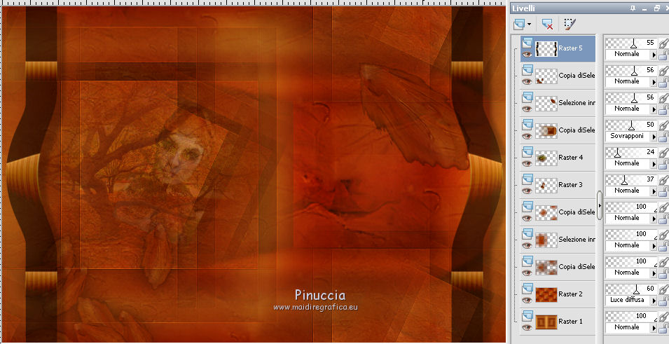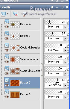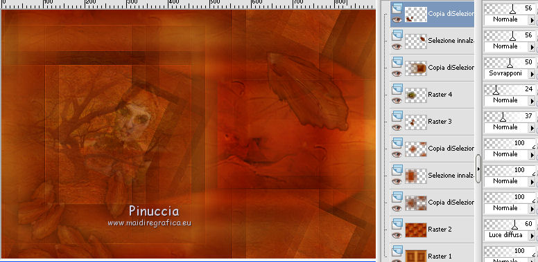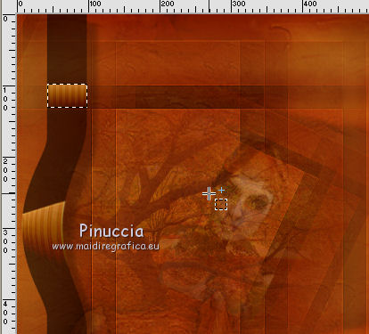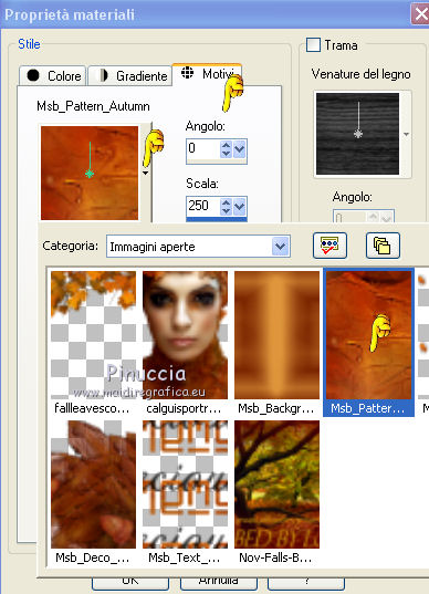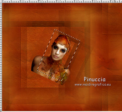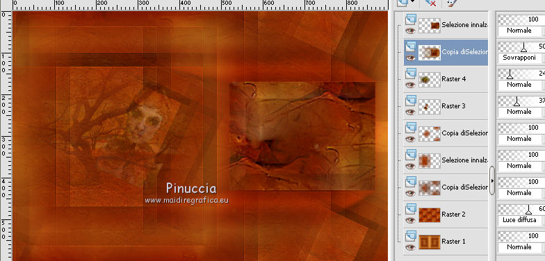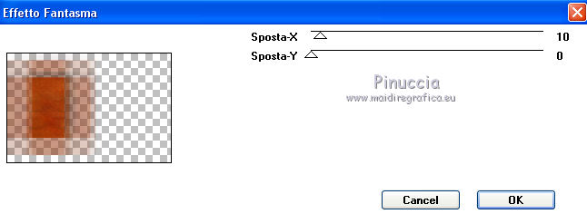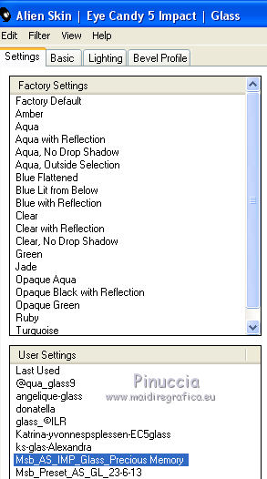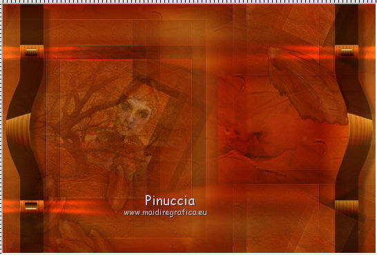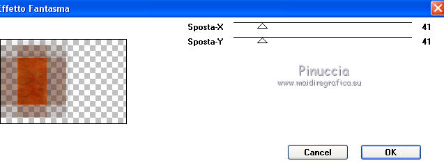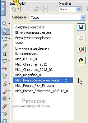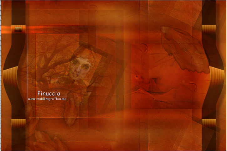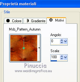 qui puoi trovare qualche risposta ai tuoi dubbi. Se l'argomento che ti interessa non è presente, ti prego di segnalarmelo. Questo tutorial è una creazione ©Meetjesplekje e non può essere copiato su altri siti nè essere offerto per il download. Lo stesso vale per la mia traduzione. Il materiale viene da vari gruppi di condivisione. Il copyright appartiene ai rispettivi autori. Grazie ai creatori dei tubes che mettono a disposizione il loro lavoro in vari gruppi di condivisione. Questo tutorial è stato tradotto con PSP X, ma può essere eseguito anche con le altre versioni di PSP. Nelle versioni più recenti X4 e X5, il comando Immagine>Rifletti è stato sostituito con Immagine>Capovolgi in orizzontale, e il comando Immagine>Capovolgi con Immagine>Capovolgi in verticale. Nella versione X5 le funzioni sono state migliorate con la disponibilità del menu "Oggetti". Vedi la scheda sull'argomento qui Occorrente: Materiale qui Grazie per il tube della donna Guismo e per il misted Lori Filtri: consulta, se necessario, la mia sezione filtri qui Filters Unlimited 2.0 qui It@lian Editors effect - Effetto Fantasma qui Graphics Plus - Cross Shadow qui Carolaine and Sensibility - CS-Hlines, CS-DLines qui Mura's Meister - Copies qui &<Bkg Designer sf10I> - Blinds Vertical (da importare in Unlimited) qui Alien Skin Eye Candy 5 Impact - Perspective Shadow, Glass, Backlight qui Alien Skin Xenofex 2.0 - Burnt Edges qui I filtri Graphics Plus e Italian Editors si possono usare da soli o importati in Filters Unlimited. (come fare vedi qui Se un filtro fornito appare con questa icona ![]() Metti i preset Cliccando sul file una o due volte (a seconda delle tue impostazioni), automaticamente il preset si installerà nella cartella corretta. perchè uno o due clic vedi qui Metti il preset "Preset Pick Msb Preset-Selecteren_Autumn_2013" nella cartella Impostazioni predefinite. Metti le selezioni nella cartella Selezioni. Se stai usando altri colori e tubes, sperimenta le modalità di miscelatura e le opacità più adatte Se non vuoi sentire la musica premi il tasto ESC Imposta il colore di primo piano con #7b2502, e il colore di sfondo con #f9b44c. ![]() Apri il motivo Msb_Pattern_Autumn e minimizzalo. Passa il colore di primo piano a Motivi e cerca l'immagine nella categoria Immagini aperte. Seleziona il motivo con i seguenti settaggi. ![]() 1. Apri una nuova immagine trasparente 900 x 600 pixels. Selezione>Seleziona tutto. Apri Msb_Background_21-7-13 e vai a Modifica>Copia. Torna al tuo lavoro e vai a Modifica>Incolla nella selezione. . Selezione>Deseleziona. 2. Livelli>Nuovo livello raster. Riempi il livello con il motivo.Cambia la modalità di miscelatura di questo livello in Luce diffusa, e abbassa l'opacità al 60%. ![]() 3. Selezione>Carica/Salva selezione>Carica selezione da disco. Cerca e carica la selezione Msb_Sel_ Precious-Memory_01. ![]() Selezione>Innalza selezione a livello. Selezione>Deseleziona. Regola>Messa a fuoco>Metti a fuoco. Effetti>Effetti 3D>Sfalsa ombra, con il colore nero. ![]() Riporta il colore di primo piano al colore iniziale #7b2502, e inverti i colori della paletta. ![]() Effetti>Plugins>It@lian Editors effect – Effetto Fantasma. ![]() Di nuovo Effetti>Plugins>It@lian Editors effect – Effetto Fantasma, con i seguenti settaggi: ![]() Effetti>Effetti di bordo>Aumenta. Livelli>Duplica. Effetti>Effetti di immagine>Motivo unico. ![]() Effetti>Effetti 3D>Sfalsa ombra, con il colore nero. ![]() Livelli>Disponi>Sposta giù. 4.Attiva il livello superiore. Livelli>Duplica. Immagine>Ruota per gradi - 25 gradi a destra. ![]() Immagine>Ridimensiona, al 60%, tutti i livelli non selezionato. Effetti>Effetti di immagine>Motivo unico, con i settaggi precedenti. ![]() 5. Apri calguisportraitautomnal18109 e vai a Modifica>Copia. non chiuderlo perchè ti servirà ancora Torna al tuo lavoro e vai a Modifica>Incolla come nuovo livello. Immagine>Ridimensiona, al 30%, tutti i livelli non selezionato. Immagine>Ruota per gradi - 25 gradi a destra. ![]() Selezione>Carica/Salva selezione>Carica selezione da disco. Cerca e carica la selezione Msb_Sel_ Precious-Memory_02. ![]() Posiziona correttamente il tube nell'area selezionata.![]() Selezione>Inverti. Premi sulla tastiera il tasto CANC ![]() Selezione>Deseleziona. Abbassa l'opacità di questo livello al 37%. 6. Apri Nov-Falls-By-Lory e vai a Modifica>Copia. Torna al tuo lavoro e vai a Modifica>Incolla come nuovo livello. Immagine>Ridimensiona, all'80%, tutti i livelli non selezionato. Effetti>Effetti di immagine>Scostamento. ![]() Abbassa l'opacità di questo livello al 24%. Effetti>Effetti 3D>Sfalsa ombra, con il colore nero. ![]() 7. Attiva il secondo livello dal basso. ![]() Attiva lo strumento Selezione ![]() clicca sull'icona Selezione personalizzata ![]() e imposta i seguenti settaggi ![]() Selezione>Innalza selezione a livello. Livelli>Disponi>Porta in alto. Effetti>Plugins>Alien Skin Eye Candy 5 Impact - Bevel. Seleziona il preset Msb_AS_Bevel_Precious Memory e ok. ![]() Questi i settaggi che, in caso di problemi con il preset, puoi impostare manualmente. ![]() Livelli>Duplica. Effetti>Plugins>Alien Skin Eye Candy 5 Impact - Backlight. Imposta il preset Msb_AS_BL_Precious Memory_01. ![]() Questi i settaggi che, in caso di problemi con il preset, puoi impostare manualmente. Se stai usando altri colori, sotto la tabella Color, potrai adattare i settaggi ai tuoi colori. ![]() Cambia la modalità di miscelatura di questo livello in Sovrapponi, e abbassa l'opacità al 50%. ![]() Livelli>Disponi>Sposta giù. Selezione>Deseleziona. Effetti>Effetti 3D>Sfalsa ombra, con il colore nero. ![]() Dovresti avere questo. ![]() 8. Attiva il livello superiore. Effetti>Plugins>Alien Skin Xenofex 2.0 - Burnt Edges. ![]() Abbassa l'opacità di questo livello al 56%. Effetti>Effetti di distorsione>Distorsione. ![]() Immagine>Ridimensiona, 2 volte al 70%, tutti i livelli non selezionato. Effetti>Effetti di immagine>Scostamento. ![]() Livelli>Duplica. Effetti>Pl