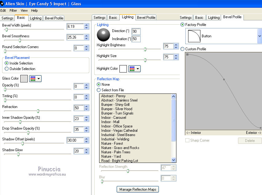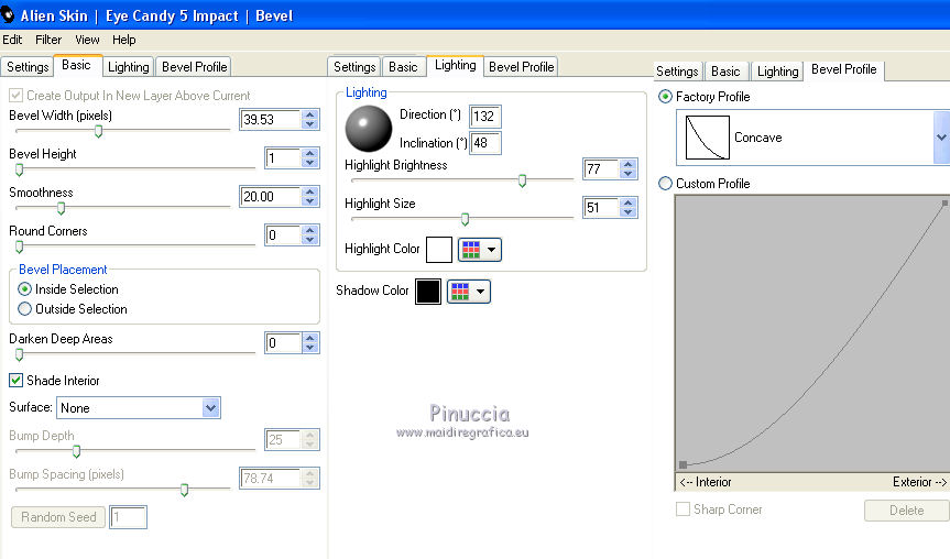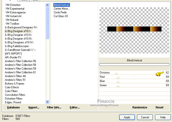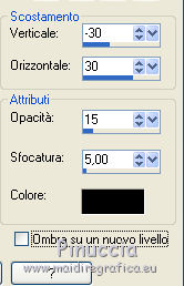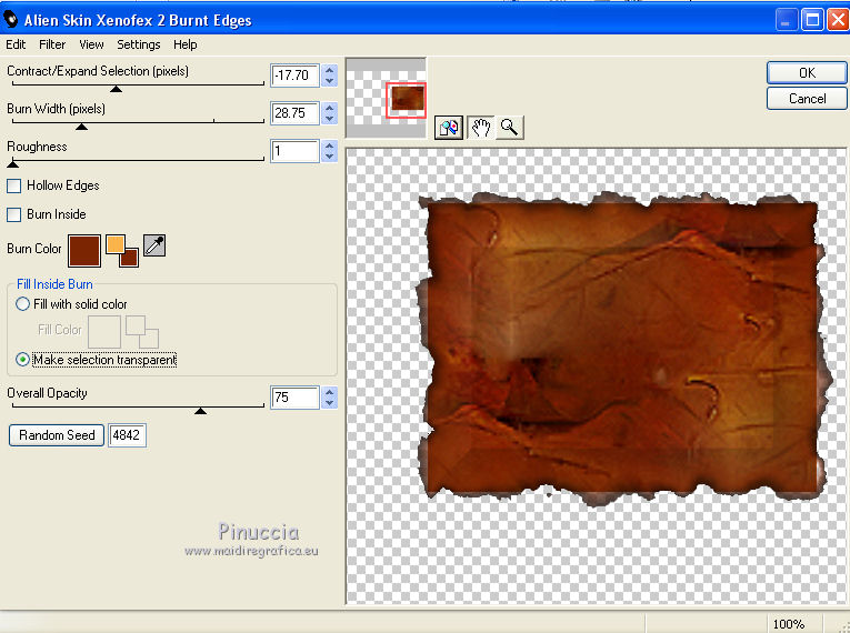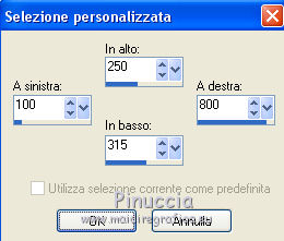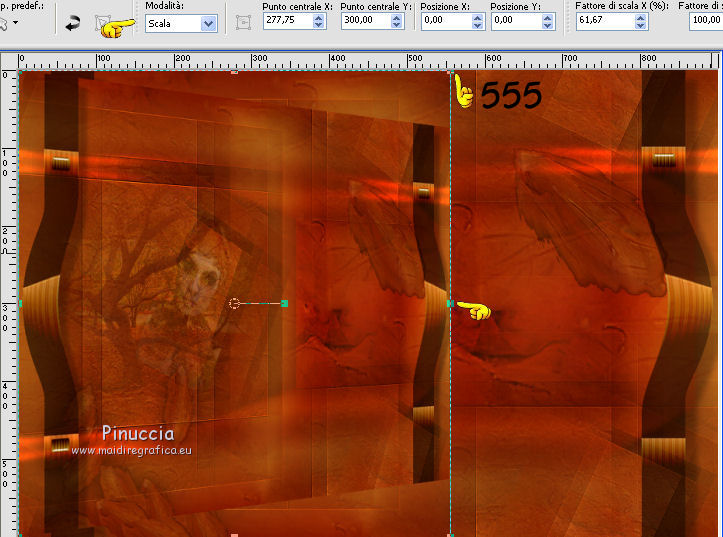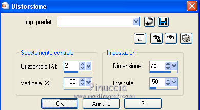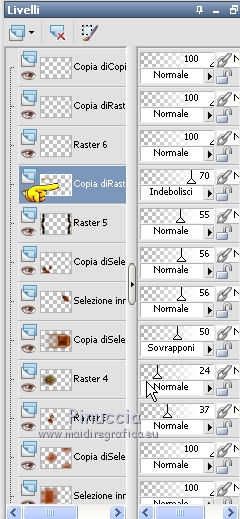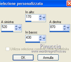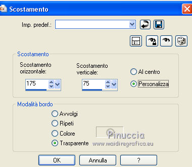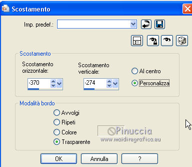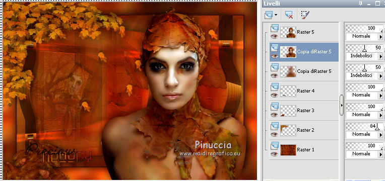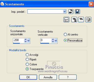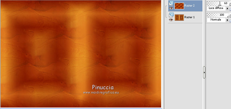 qui puoi trovare qualche risposta ai tuoi dubbi. Se l'argomento che ti interessa non è presente, ti prego di segnalarmelo. Questo tutorial è una creazione ©Meetjesplekje e non può essere copiato su altri siti nè essere offerto per il download. Lo stesso vale per la mia traduzione. Il materiale viene da vari gruppi di condivisione. Il copyright appartiene ai rispettivi autori. Grazie ai creatori dei tubes che mettono a disposizione il loro lavoro in vari gruppi di condivisione. Questo tutorial è stato tradotto con PSP X, ma può essere eseguito anche con le altre versioni di PSP. Nelle versioni più recenti X4 e X5, il comando Immagine>Rifletti è stato sostituito con Immagine>Capovolgi in orizzontale, e il comando Immagine>Capovolgi con Immagine>Capovolgi in verticale. Nella versione X5 le funzioni sono state migliorate con la disponibilità del menu "Oggetti". Vedi la scheda sull'argomento qui Occorrente: Materiale qui Grazie per il tube della donna Guismo e per il misted Lori Filtri: consulta, se necessario, la mia sezione filtri qui Filters Unlimited 2.0 qui It@lian Editors effect - Effetto Fantasma qui Graphics Plus - Cross Shadow qui Carolaine and Sensibility - CS-Hlines, CS-DLines qui Mura's Meister - Copies qui &<Bkg Designer sf10I> - Blinds Vertical (da importare in Unlimited) qui Alien Skin Eye Candy 5 Impact - Perspective Shadow, Glass, Backlight qui Alien Skin Xenofex 2.0 - Burnt Edges qui I filtri Graphics Plus e Italian Editors si possono usare da soli o importati in Filters Unlimited. (come fare vedi qui Se un filtro fornito appare con questa icona ![]() Metti i preset Cliccando sul file una o due volte (a seconda delle tue impostazioni), automaticamente il preset si installerà nella cartella corretta. perchè uno o due clic vedi qui Metti il preset "Preset Pick Msb Preset-Selecteren_Autumn_2013" nella cartella Impostazioni predefinite. Metti le selezioni nella cartella Selezioni. Se stai usando altri colori e tubes, sperimenta le modalità di miscelatura e le opacità più adatte Se non vuoi sentire la musica premi il tasto ESC Imposta il colore di primo piano con #7b2502, e il colore di sfondo con #f9b44c. ![]() Apri il motivo Msb_Pattern_Autumn e minimizzalo. Passa il colore di primo piano a Motivi e cerca l'immagine nella categoria Immagini aperte. Seleziona il motivo con i seguenti settaggi. ![]() 1. Apri una nuova immagine trasparente 900 x 600 pixels. Selezione>Seleziona tutto. Apri Msb_Background_21-7-13 e vai a Modifica>Copia. Torna al tuo lavoro e vai a Modifica>Incolla nella selezione. . Selezione>Deseleziona. 2. Livelli>Nuovo livello raster. Riempi il livello con il motivo.Cambia la modalità di miscelatura di questo livello in Luce diffusa, e abbassa l'opacità al 60%. ![]() 3. Selezione>Carica/Salva selezione>Carica selezione da disco. Cerca e carica la selezione Msb_Sel_ Precious-Memory_01. ![]() Selezione>Innalza selezione a livello. Selezione>Deseleziona. Regola>Messa a fuoco>Metti a fuoco. Effetti>Effetti 3D>Sfalsa ombra, con il colore nero. ![]() Riporta il colore di primo piano al colore iniziale #7b2502, e inverti i colori della paletta. ![]() Effetti>Plugins>It@lian Editors effect – Effetto Fantasma. ![]() Di nuovo Effetti>Plugins>It@lian Editors effect – Effetto Fantasma, con i seguenti settaggi: ![]() Effetti>Effetti di bordo>Aumenta. Livelli>Duplica. Effetti>Effetti di immagine>Motivo unico. ![]() Effetti>Effetti 3D>Sfalsa ombra, con il colore nero. ![]() Livelli>Disponi>Sposta giù. 4.Attiva il livello superiore. Livelli>Duplica. Immagine>Ruota per gradi - 25 gradi a destra. ![]() Immagine>Ridimensiona, al 60%, tutti i livelli non selezionato. Effetti>Effetti di immagine>Motivo unico, con i settaggi precedenti. ![]() 5. Apri calguisportraitautomnal18109 e vai a Modifica>Copia. non chiuderlo perchè ti servirà ancora Torna al tuo lavoro e vai a Modifica>Incolla come nuovo livello. Immagine>Ridimensiona, al 30%, tutti i livelli non selezionato. Immagine>Ruota per gradi - 25 gradi a destra. ![]() Selezione>Carica/Salva selezione>Carica selezione da disco. Cerca e carica la selezione Msb_Sel_ Precious-Memory_02. ![]() Posiziona correttamente il tube nell'area selezionata.![]() Selezione>Inverti. Premi sulla tastiera il tasto CANC ![]() Selezione>Deseleziona. Abbassa l'opacità di questo livello al 37%. 6. Apri Nov-Falls-By-Lory e vai a Modifica>Copia. Torna al tuo lavoro e vai a Modifica>Incolla come nuovo livello. Immagine>Ridimensiona, all'80%, tutti i livelli non selezionato. Effetti>Effetti di immagine>Scostamento. ![]() Abbassa l'opacità di questo livello al 24%. Effetti>Effetti 3D>Sfalsa ombra, con il colore nero. ![]() 7. Attiva il secondo livello dal basso. ![]() Attiva lo strumento Selezione ![]() clicca sull'icona Selezione personalizzata ![]() e imposta i seguenti settaggi ![]() Selezione>Innalza selezione a livello. Livelli>Disponi>Porta in alto. Effetti>Plugins>Alien Skin Eye Candy 5 Impact - Bevel. Seleziona il preset Msb_AS_Bevel_Precious Memory e ok. ![]() Questi i settaggi che, in caso di problemi con il preset, puoi impostare manualmente. ![]() Livelli>Duplica. Effetti>Plugins>Alien Skin Eye Candy 5 Impact - Backlight. Imposta il preset Msb_AS_BL_Precious Memory_01. ![]() Questi i settaggi che, in caso di problemi con il preset, puoi impostare manualmente. Se stai usando altri colori, sotto la tabella Color, potrai adattare i settaggi ai tuoi colori. ![]() Cambia la modalità di miscelatura di questo livello in Sovrapponi, e abbassa l'opacità al 50%. ![]() Livelli>Disponi>Sposta giù. Selezione>Deseleziona. Effetti>Effetti 3D>Sfalsa ombra, con il colore nero. ![]() Dovresti avere questo. ![]() 8. Attiva il livello superiore. Effetti>Plugins>Alien Skin Xenofex 2.0 - Burnt Edges. ![]() Abbassa l'opacità di questo livello al 56%. Effetti>Effetti di distorsione>Distorsione. ![]() Immagine>Ridimensiona, 2 volte al 70%, tutti i livelli non selezionato. Effetti>Effetti di immagine>Scostamento. ![]() Livelli>Duplica. Effetti>Pl
