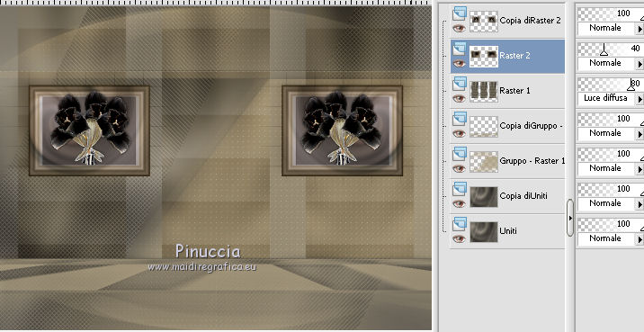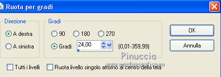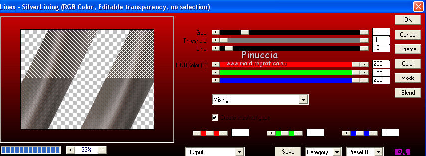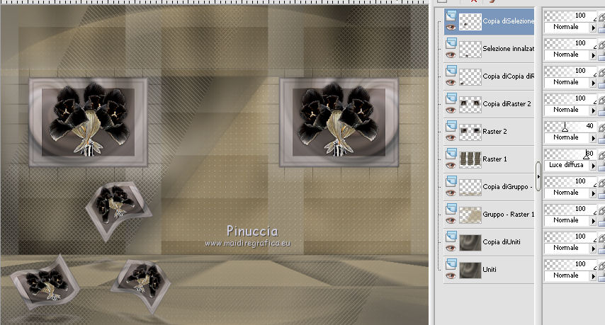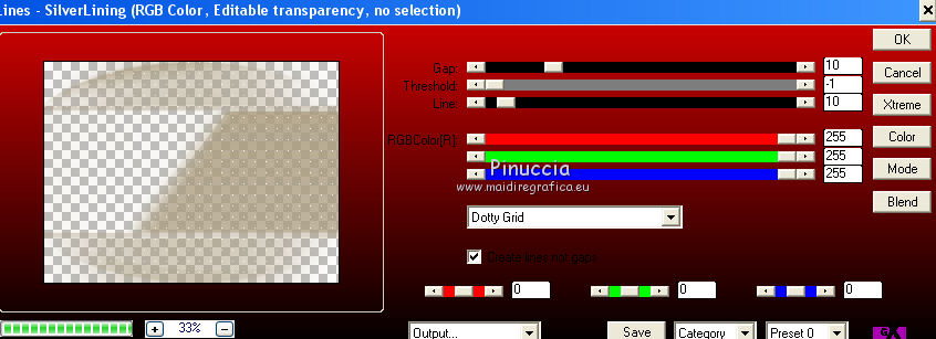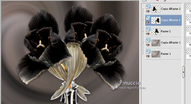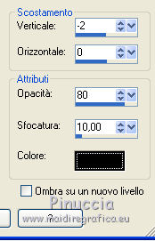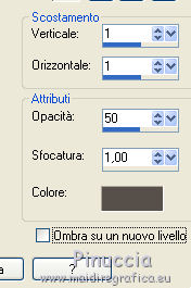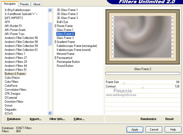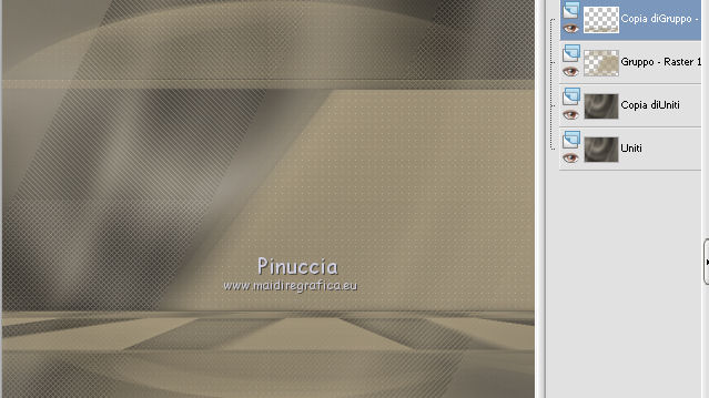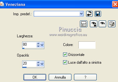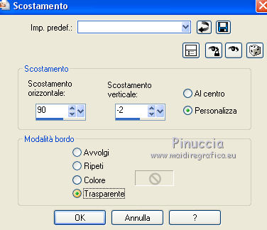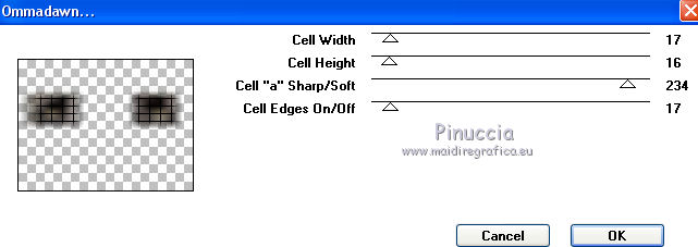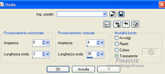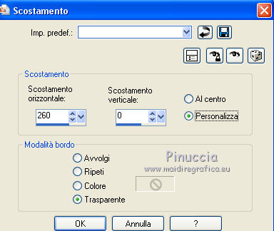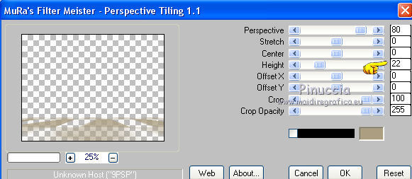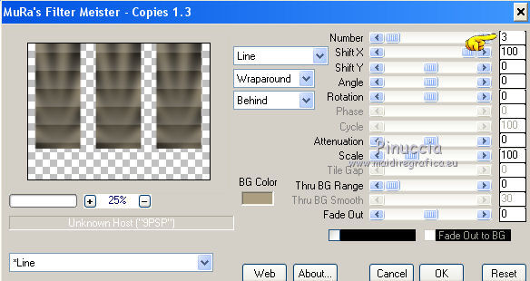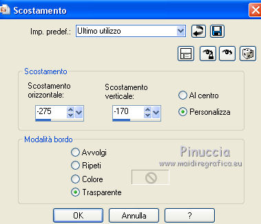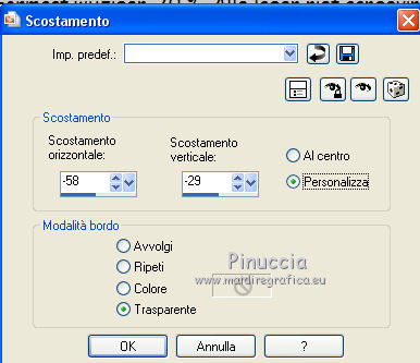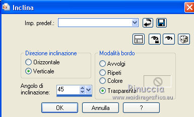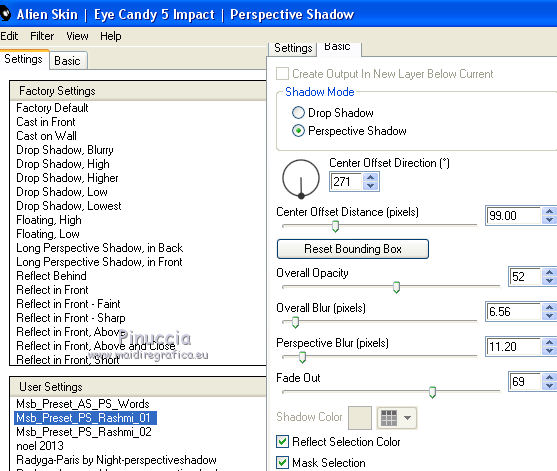 qui puoi trovare qualche risposta ai tuoi dubbi. Se l'argomento che ti interessa non è presente, ti prego di segnalarmelo. Questo tutorial è una creazione ©Meetjesplekje e non può essere copiato su altri siti nè essere offerto per il download. Lo stesso vale per la mia traduzione. Il materiale viene da vari gruppi di condivisione. Il copyright appartiene ai rispettivi autori. Grazie ai creatori dei tubes che mettono a disposizione il loro lavoro in vari gruppi di condivisione. Per tradurre questo tutorial ho usato PSP X3 per l'immagine in alto e PSP X per l'immagine in fondo al tutorial. Occorrente: Materiale qui Per il tube della donna grazie Mary. Per il tube trasparente grazie Brigitte Filtri: consulta, se necessario, la mia sezione filtri qui Filters Unlimited 2.0 qui AP [Innovations] - Lines SilverLining qui Flaming Pear - Flexify 2 qui Mura's Meister - Perspective Tiling qui Mura's Meister - Copies qui Alien Skin Eye Candy 5 Impact - Perspective Shadow qui Graphics Plus - Cross Shadow qui Toadies - Ommadawn qui I filtri Toadies e Graphics Plus si possono usare da soli o importati in Filters Unlimited (come fare vedi qui) Se un filtro fornito appare con questa icona ![]() Se stai usando altri colori puoi sperimentare le modalità di miscelatura e le opacità più adatte ai tuoi colori. Apri il font e minimizzalo. Lo troverai nella lista dei font disponibili quando ti servirà. Con i nuovi sistemi operativi questo non è più possibile. Per usare un font occorre copiarlo nella cartella Fonts di Windows. Metti i preset Cliccando sul file una o due volte (a seconda delle tue impostazioni), automaticamente il preset si installerà nella cartella corretta. perchè uno o due clic vedi qui Metti il preset Flexify2_settingsMsb 28.3.12 nella cartella del Filtro. Se preferisci puoi importarlo, quando ti servirà, direttamente dalla cartella in cui hai salvato il preset. Metti il pennello nella cartella Pennelli. Attenzione il pennello è composto da due files che non devono essere separati. vedi gli appunti sui pennelli qui Apri la maschera in PSP e minimizzala con il resto del materiale. Imposta il colore di primo piano con #000000, Imposta il colore di sfondo con # ac9e81. ![]() Passa il colore di primo piano a Gradiente di primo piano/sfondo, stile Radiale: ![]() 1. Apri una nuova immagine trasparente 800 x 600 pixels, e riempila con il gradiente.Selezione>Seleziona tutto. Apri il tube Mary 0312-41 e vai a Modifica>Copia. Torna al tuo lavoro e vai a Modifica>Incolla nella selezione. Selezione>Deseleziona. Effetti>Effetti di immagine>Motivo unico, con i settaggi standard. ![]() Regola>Sfocatura>Sfocatura radiale. ![]() Livelli>Duplica. Cambia la modalità di miscelatura di questo livello in Moltiplica. Regola>Sfocatura>Sfocatura gaussiana - raggio 20. ![]() Fai una copia del lavoro usando la combinazione di tasti maiuscola+D, e salva la copia in formato PSP. La userai più tardi. 2. Torna al tuo lavoro originale. Attiva nuovamente il tube Mary 0312-40 e vai a Modifica>Copia. Torna al tuo lavoro e vai a Modifica>Incolla come nuovo livello. Immagine>Ridimensiona, al 70%, tutti i livelli non selezionato. Effetti>Effetti di immagine>Scostamento. ![]() Regola>Messa a fuoco>Metti a fuoco. Effetti>Effetti 3D>Sfalsa ombra, colore nero. ![]() Livelli>Duplica. Immagine>Rifletti. Immagine>Ruota per gradi - 15 gradi a sinistra. ![]() Effetti>Effetti di immagine>Scostamento. ![]() 3, Attiva il livello sottostante. Livelli>Duplica. Livelli>Disponi>Porta in alto. Immagine>Ruota per gradi - 24 gradi a destra. ![]() Effetti>Effetti di immagine>Scostamento. ![]() Livelli>Disponi>Sposta giù. ![]() Attiva il livello superiore. Regola>Messa a fuoco>Metti a fuoco. Livelli>Unisci>Unisci giù. Di nuovo Livelli>Unisci>Unisci giù. Attiva il livello sottostante. ![]() Selezione>Seleziona tutto. Immagine>Ritaglia la selezione. Immagine>Ridimensiona, al 77%, tutti i livelli non selezionato. Effetti>Plugins>Filters Unlimited 2.0 - Buttons and Frames - Glass Frame 2, con i settaggi standard. Attenzione: circola in rete una versione del filtro Unlimited, che non si installa, ed 'è composta da files in formato .8bf. Usando questa versione, in alcuni casi e con alcuni filtri si possono ottenere risultati differenti. Non ci sono regole codificate, per questo si può rilevare la differenza soltanto confrontando i propri risultati, con quelli del tutorial che si sta eseguendo. Questo è uno dei casi. Il risultato con la versione installante è questo: ![]() Usando invece la versione con files in formato 8bf si ottiene questo. ![]() L'autrice per il suo tutorial ha usato la versione che non si installa, che puoi scaricare qui Attiva nuovamente il livello superiore. Immagine>Ridimensiona, all'85%, tutti i livelli non selezionato. Effetti>Effetti di immagine>Scostamento. ![]() Effetti>Effetti 3D>Sfalsa ombra, colore nero. ![]() Livelli>Unisci>Unisci tutto. Salva l'immagine in formato PSP. Ti servirà più tardi. Se hai usato Unlimited installante avrai questo. ![]() Usando Unlimited in file in 8bf questo sarà il risultato. ![]() 4. Apri il duplicato che hai salvato al punto 1. ![]() Fai una copia del lavoro usando la combinazione di tasti maiuscola+D, e minimizzala. Lavora sulla copia, che sarà la nuova base del tuo lavoro. Livelli>Unisci>Unisci visibile. Regola>Sfocatura>Sfocatura gaussiana - raggio 25. ![]() Livelli>Duplica. Effetti>Plugins>Flaming Pear – Flexify 2. Clicca sull'icona della freccia rossa, e cerca - nella cartella in cui lo hai salvato - il preset Msb_28-3-12 e clicca Apri per confermare. ![]() Questi i settaggi che, in caso di problemi con il preset, puoi impostare manualmente. ![]() Modifica>Copia. Torna al tuo lavoro e vai a Modifica>Incolla come nuova immagine. Salva l'immagine in formato PSP. La userai più tardi. Torna al tuo lavoro. Modifica>Annulla azione Flexify, oppure più velocemente clicca sull'icona corrispondente sulla barra superiore degli strumenti. ![]() 5. Effetti>Effetti geometrici