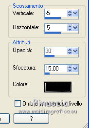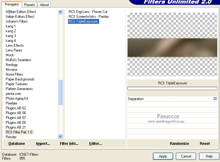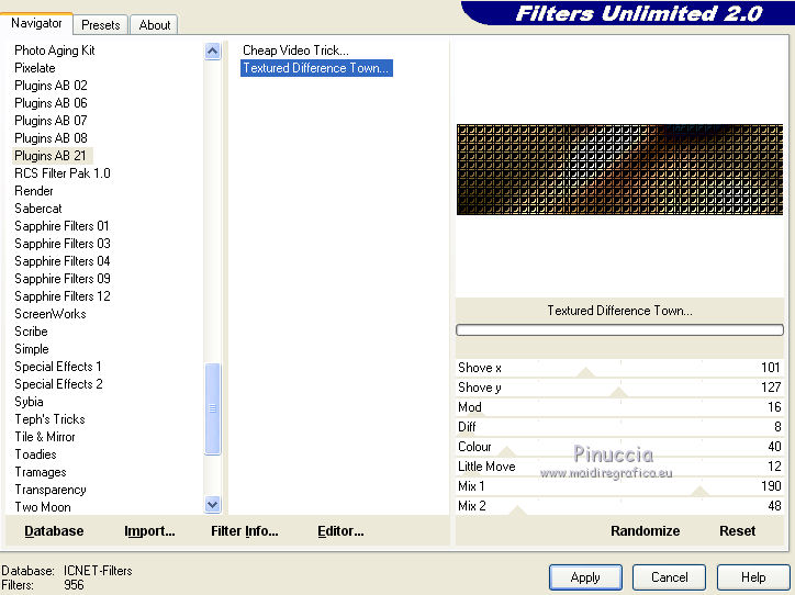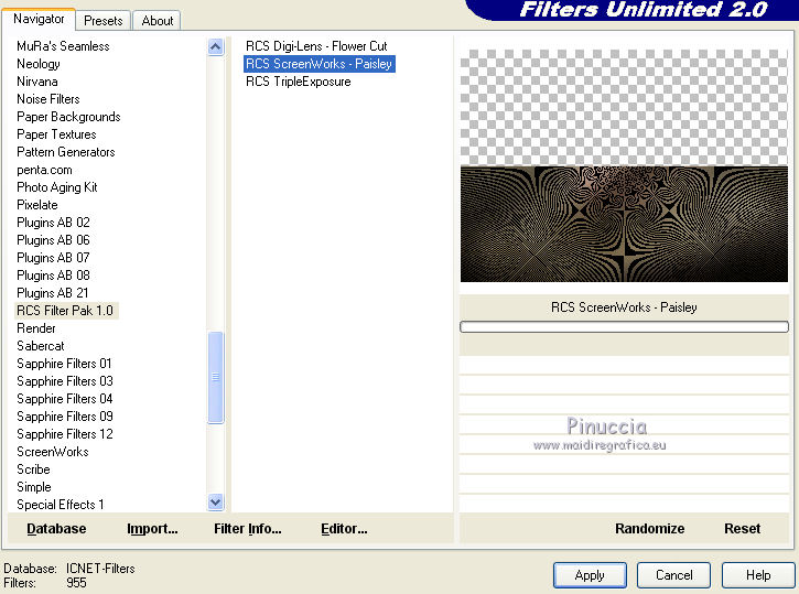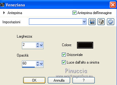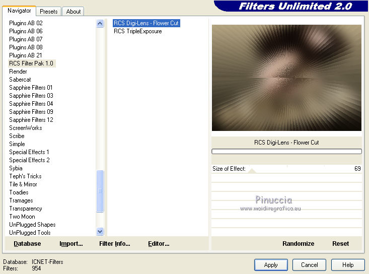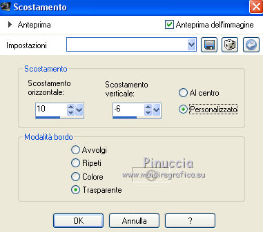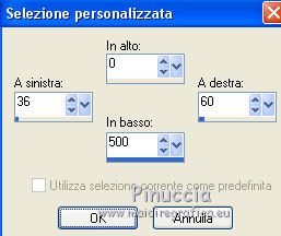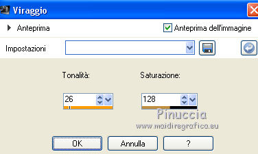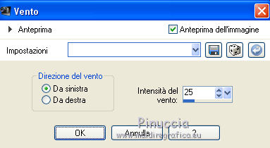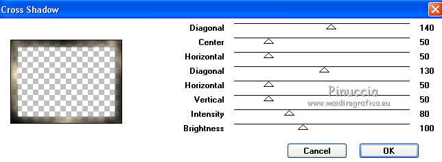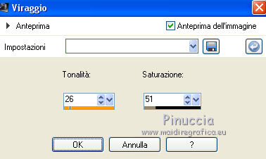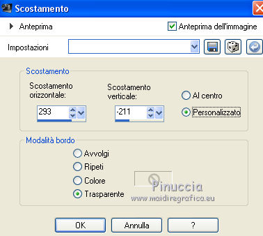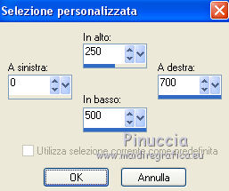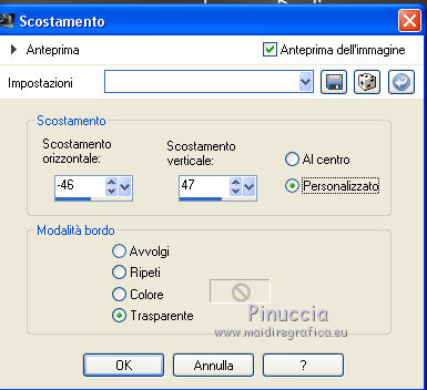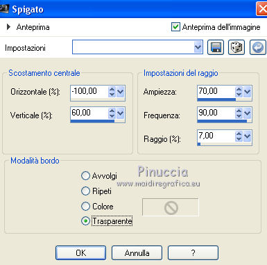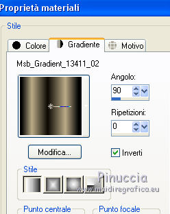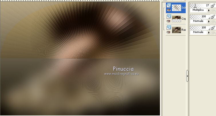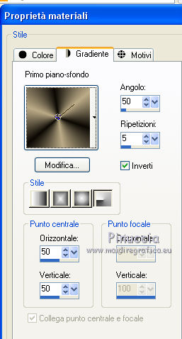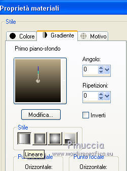 qui puoi trovare qualche risposta ai tuoi dubbi. Se l'argomento che ti interessa non è presente, ti prego di segnalarmelo. Questo tutorial è una creazione ©Meetjesplekje e non può essere copiato su altri siti nè essere offerto per il download. Lo stesso vale per la mia traduzione. Il materiale viene da vari gruppi di condivisione. Il copyright appartiene ai rispettivi autori. Grazie ai creatori dei tubes che mettono a disposizione il loro lavoro in vari gruppi di condivisione. Per tradurre questo tutorial ho usato CorelX, ma può essere realizzato anche con le altre versioni di PSP. Dalla versione X4, il comando Immagine>Rifletti è stato sostituito con Immagine>Capovolgi in orizzontale, e il comando Immagine>Capovolgi con Immagine>Capovolgi in verticale. Nelle versioni X5 e X6, le funzioni sono state migliorate rendendo disponibile il menu Oggetti. Vedi la scheda sull'argomento qui Occorrente: Materiale qui Grazie: per il tube della donna Kitty per il tube dei fiori Liza per il tube dei vasi Kts. Filtri: consulta, se necessario, la mia sezione filtri qui Filters Unlimited 2.0 qui RCS Filter Pak 1.0 qui Plugins AB 21 qui Alien Skin Eye Candy 6 Impact - Motion Trail, Extrude qui Vizros - Box qui Mura's Meister - Copies qui Graphics Plus - Cross Shadow qui I filtri Plugins AB, RCS Filter Pak e Graphics Plus si possono usare da soli o importati in Filters Unlimited (come fare vedi qui) Se un filtro fornito appare con questa icona ![]() Se stai usando altri colori puoi sperimentare le modalità di miscelatura e le opacità più adatte ai tuoi colori. Apri il font e minimizzalo. Lo troverai nella lista dei font disponibili quando ti servirà. Con i nuovi sistemi operativi questo non è più possibile. Per usare un font, occorre copiarlo nella cartella Font di Windows. Metti il gradiente nella cartella Gradienti. Metti le selezioni nella cartella Selezioni. Imposta il colore di primo piano con #0c0904, e il colore di sfondo con #bbab87. ![]() Passa il colore di primo piano a Gradiente di primo piano/sfondo, con i seguenti settaggi. ![]() 1. Apri una nuova immagine trasparente 700 x 500 pixels, e riempila con il gradiente.Selezione>Seleziona tutto. Apri il tube kitty-whishes lady e vai a Modifica>Copia. non chiuderlo perchè ti servirà ancora Torna al tuo lavoro e vai a Modifica>Incolla nella selezione. Selezione>Deseleziona. Regola>Sfocatura>Sfocatura gaussiana - raggio 55. ![]() Livelli>Duplica. 2. Effetti>Plugins>Filters Unlimited 2.0 – RCS Flter Pak 1.0 – RCS Digi-Lens - Flower Cut, con i settaggi standard. ![]() Effetti>Effetti di bordo>Aumenta. Attiva lo strumento Selezione ![]() clicca sull'icona Selezione personalizzata ![]() e imposta i seguenti settaggi. ![]() Selezione>Innalza selezione a livello. Attiva il livello sottostante. Premi sulla tastiera il tasto CANC ![]() Selezione>Deseleziona. Attiva il livello superiore. Immagine>Capovolgi. Effetti>Effetti di distorsione>Coordinate polari. ![]() Abbassa l'opacità di questo livello al 27%. Selezione personalizzata , con i settaggi precedenti.![]() Premi sulla tastiera il tasto CANC. Selezione>Deseleziona. Selezione>Carica/Salva selezione>Carica selezione da disco. Cerca e carica la selezione Msb_Sahita_01. ![]() Attiva il livello sottostante (il livello centrale). ![]() Regola>Tonalità e saturazione>Vivacità. ![]() Attiva nuovamente il livello superiore. Selezione>Inverti. Premi sulla tastiera il tasto CANC. Selezione>Deseleziona. Effetti>Effetti di distorsione>Spigato. ![]() Cambia la modalità di miscelatura di questo livello in Moltiplica, e abbassa l'opacità al 27%. ![]() Effetti>Effetti di distorsione>Vento - da sinistra, intensità 25. ![]() Livelli>Unisci>Unisci giù. 3. Attiva il livello inferiore. Selezione personalizzata , con i settaggi precedenti.![]() Selezione>Innalza selezione a livello. Selezione>Deseleziona. Effetti>Plugins>Filters Unlimited 2.0 – RCS Flter Pak 1.0 – RCS ScreenWorks-Paisley, con i settaggi standard. ![]() Selezione personalizzata ![]() ![]() Premi sulla tastiera il tasto CANC. Cambia la modalità di miscelatura di questo livello in Luce diffusa. Attiva il livello superiore. Premi sulla tastiera il tasto CANC. Attiva il livello inferiore. Selezione>Innalza selezione a livello. Selezione>Deseleziona. Effetti>Plugins>Filters Unlimited 2.0 – RCS Filter Pak 1.0 – RCS TripleExposure. ![]() Effetti>Effetti di trama>Veneziana - colore di primo piano. ![]() Cambia la modalità di miscelatura di questo livello in Luminanza (esistente) e abbassa l'opacità al 50%. Regola>Tonalità e saturazione>Viraggio. ![]() 4. Attiva il livello inferiore. Selezione personalizzata ![]() ![]() Selezione>Innalza selezione a livello. Effetti>Plugins>Filters Unlimited 2.0 – Plugins AB 21 – Textured Difference Town. ![]() Attiva il livello soprastante. Livelli>Unisci>Unisci giù. Livelli>Disponi>Porta in alto. Selezione>Deseleziona. Effetti>EFfetti 3D>Sfalsa ombra, colore nero. ![]() Effetti>Effetti 3D>Sfalsa ombra, colore nero. ![]() 5. Riporta il colore di primo piano a Colore (#0c0904). Selezione personalizzata ![]() ![]() Livelli>Nuovo livello raster. Riempi con il colore di primo piano.Selezione>Modifica>Contrai - 3 pixel. Passa il colore di primo piano a Gradiente, e seleziona il gradiente Msb_Gradient_13411_02, con i seguenti settaggi. ![]() Regola>Sfocatura>Sfocatura gaussiana - raggio 55. ![]() Livelli>Nuovo livello raster. Attiva nuovamente il tube kitty-whishes lady. Attiva lo strumento Selezione , rettangolo,e traccia una selezione sulla gonna della donna. ![]() Modifica>Copia. Selezione>Deseleziona, e minimizza nuovamente il tube che userai ancora. Torna al tuo lavoro e vai a Modifica>Incolla nella selezione. Selezione>Deseleziona. Livelli>Unisci>Unisci giù. Effetti>Plugins>MuRa’s Meister – Copies. ![]() Livelli>Duplica. Attiva il livello sottostante dell'originale. Effetti>Plugins>Alien Skin Eye Candy 5 Impact - Motion Trail. Settings: Slam Down - Basic: ![]() Cambia la modalità di miscel