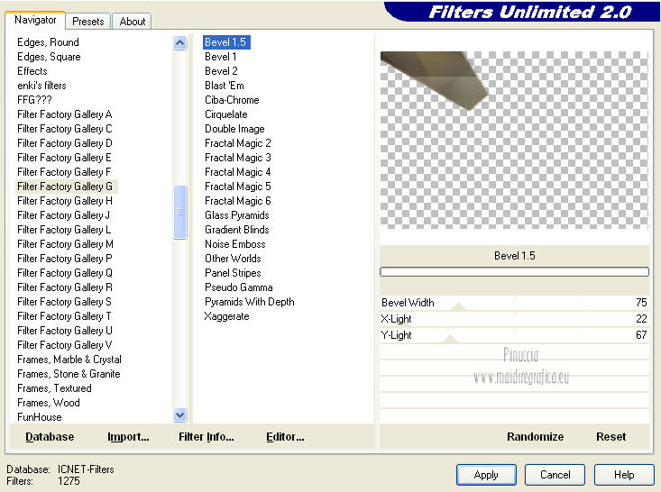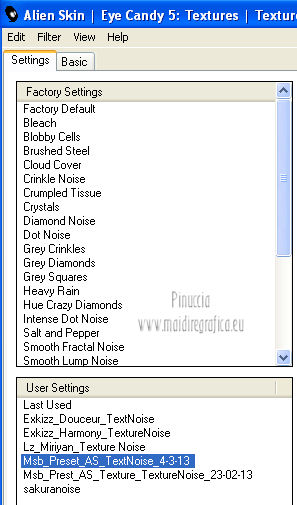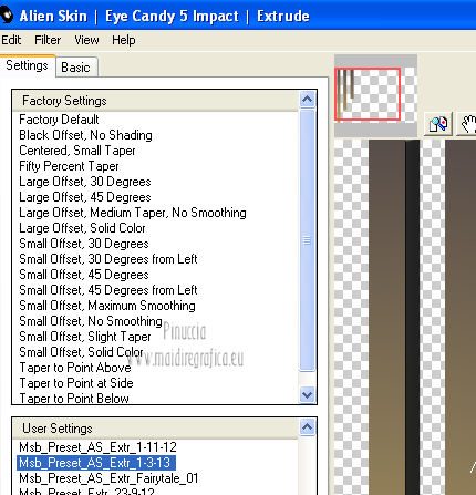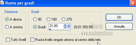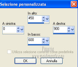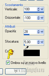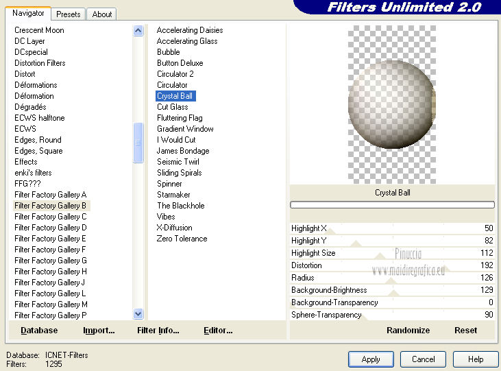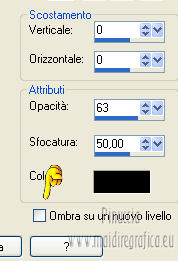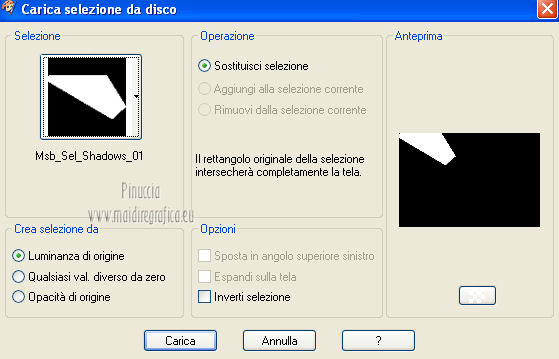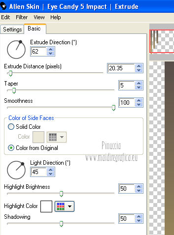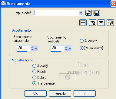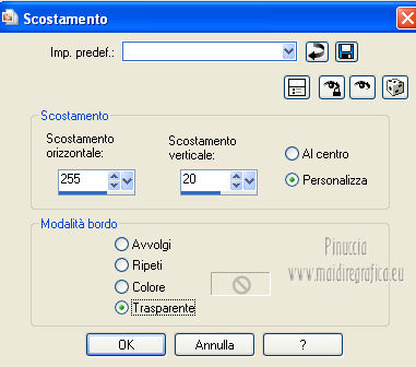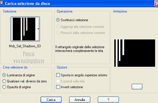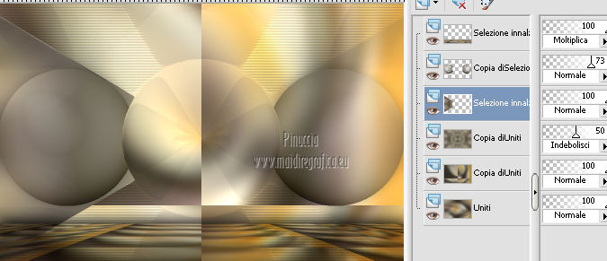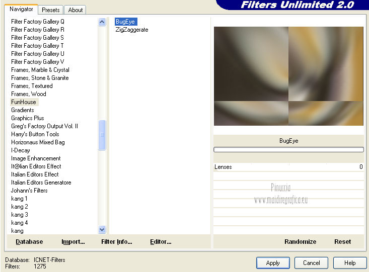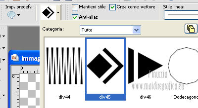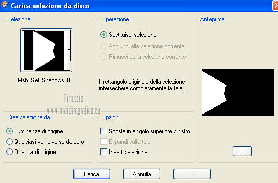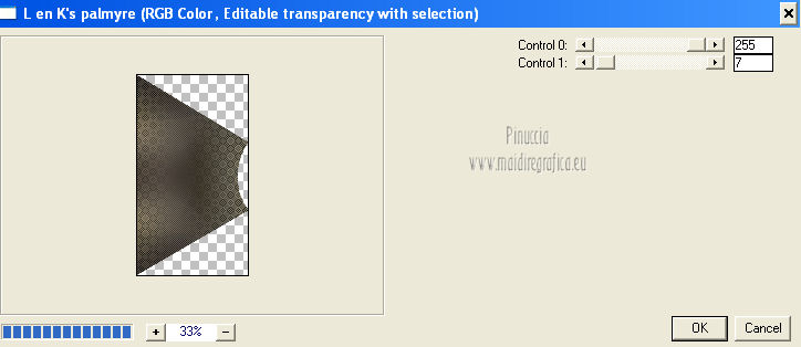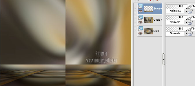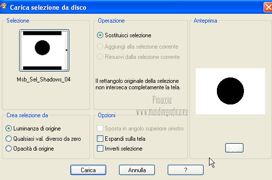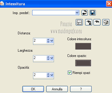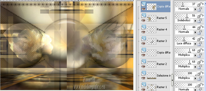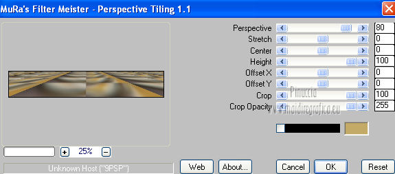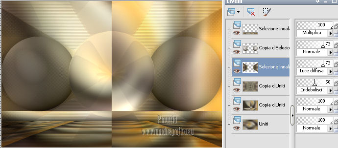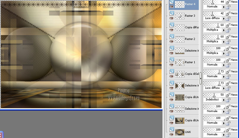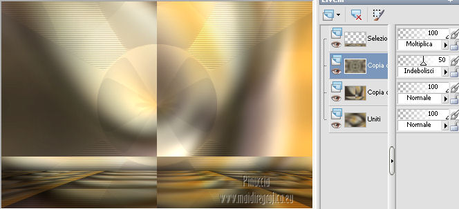 qui puoi trovare qualche risposta ai tuoi dubbi. Se l'argomento che ti interessa non è presente, ti prego di segnalarmelo. Questo tutorial è una creazione ©Meetjesplekje e non può essere copiato su altri siti nè essere offerto per il download. Lo stesso vale per la mia traduzione. Il materiale viene da vari gruppi di condivisione. Il copyright appartiene ai rispettivi autori. Grazie ai creatori dei tubes che mettono a disposizione il loro lavoro in vari gruppi di condivisione. Per tradurre questo tutorial ho usato PSP X. Occorrente: Materiale qui Per i tubes grazie Yoka e Libellule Filtri: consulta, se necessario, la mia sezione filtri qui Filters Unlimited 2.0 qui Funhouse - BugEye qui Filter Factory Gallery G - Bevel 1.5 qui Filter Factory Gallery B - Crystal Ball qui Carolaine and Sensibility - CS_Halloween 2 qui Mura's Meister - Perspective Tiling qui Mura's Meister - Copies qui Simple qui Simple - Left Right Wrap (bonus) qui L&K landsiteofwonders - L & K's Palmyre qui Alien Skin Eye Candy 5 Impact - Perspective Shadow, Extrude qui Alien Skin Eye Candy 5 Textures - Texture Noise qui I filtri Factory Gallery per essere usati devono prima essere convertiti. Come fare vedi qui Si usano importandoli in Filters Unlimited (come fare vedi qui) ma possono funzionare anche da soli. Le factory fornite sono state già convertite. Anche i filtri Funhouse e Simple si possono usare da soli o importati in Filters Unlimited Le vostre versioni qui ![]() Se stai usando altri colori puoi sperimentare le modalità di miscelatura e le opacità più adatte ai tuoi colori. Metti i preset nelle rispettive cartelle del filtro Alien Skin Eye Candy 5 Impact>Settings>Extrude, e Alien Skin Eye Candy 5 Textures>Settings>Texture Noise. Cliccando sul file una o due volte (a seconda delle tue impostazioni), automaticamente il preset si installerà nella cartella corretta. perchè uno o due clic vedi qui Metti le forme pspforum_diversen5 nella cartella Forme predefinite. Metti le selezioni nella cartella Selezioni. Imposta il colore di primo piano con #534948, e il colore di sfondo con #c3aa66. ![]() Passa il colore di primo piano a Gradiente, stile Sprazzo di luce. ![]() 1. Apri una nuova immagine trasparente 900 x 600 pixels. Selezione>Seleziona tutto. Apri il tube libellulegraphisme_Twins_Girls_merci_DANAE e vai a Modifica>Copia. non chiuderlo perchè ti servirà ancora Torna al tuo lavoro e vai a Modifica>Incolla nella selezione. Selezione>Deseleziona. Effetti>Effetti di immagine>Motivo unico. ![]() Selezione>Seleziona tutto. Livelli>Nuovo livello raster. Apri il tube Yoka-Faces-Shadows-230213 e vai a Modifica>Copia. non chiuderlo, perchè ti servirà ancora Torna al tuo lavoro e vai a Modifica>Incolla nella selezione. Selezione>Deseleziona. Effetti>Effetti di immagine>Motivo unico. ![]() Livelli>Disponi>Sposta giù. Livelli>Unisci>Unisci visibile. Regola>Sfocatura>Sfocatura radiale. ![]() Lielli>Duplica. Immagine>Rifletti. Immagine>Capovolgi. Livelli>Unisci>Unisci giù. Regola>Sfocatura>Sfocatura gaussiana - raggio 25. ![]() 2. Livelli>Duplica. Effetti>Plugins>Filters Unlimited 2.0 - Funhouse - BugEye. ![]() Attiva lo strumento Selezione ,clicca sull'icona Selezione personalizzata ![]() e imposta i seguenti settaggi: ![]() Selezione>Innalza selezione a livello. Effetti>Plugins>Mura's Meister - Perspective Tiling, con i settaggi standard. ![]() Selezione>Deseleziona. Effetti>Effetti di distorsione>Allarga (nelle versioni più recenti di PSP ha assunto la denominazione "Espansione") ![]() Effetti>Effetti 3D>Sfalsa ombra, con il colore nero. ![]() Cambia la modalità di miscelatura di questo livello in Moltiplica. ![]() 3. Attiva il livello inferiore. Livelli>Duplica. Livelli>Disponi>Sposta su. Effetti>Plugins>Simple – Blintz. Effetti>Plugins>Simple – Left Right Wrap. Livelli>Duplica. Immagine>Capovolgi. Abbassa l'opacità di questo livello al 50%. Livelli>Unisci>Unisci giù. Effetti>Plugins>Filters Unlimited 2.0 – Tile & Mirror – Radial Tile, con i settaggi standard. ![]() Dovresti avere questo. ![]() 4. Selezione>Carica/Salva selezione>Carica selezione da disco. Cerca e carica la selezione Msb_Sel_Shadows_01. ![]() Selezione>Innalza selezione a livello. Selezione>Deseleziona. Effetti>Effetti di distorsione>Vento - da sinistra, intensità 25. ![]() Effetti>Plugins>Filters Unlimited 2.0 - Filter Factory G – Bevel 1.5, con i settaggi standard. ![]() Effetti>Plugins>Alien Skin Eye Candy 5 Textures - Texture Noise. Seleziona il preset Msb_Preset_AS_TextNoise_4-3-13 e ok. ![]() Questi i settaggi, che puoi impostare manualmente, in caso di problemi con il preset. ![]() Effetti>Effetti di bordo>Aumenta. Cambia la modalità di miscelatura di questo livello in Sovrapponi, e abbassa l'opacità al 63%. Effetti>Effetti di trama>Veneziana, con il colore nero #000000. ![]() Effetti>Effetti di bordo>Aumenta. Effetti>Plugins>Simple – Top Left Mirror. ![]() Livelli>Unisci>Unisci giù. Cambia la modalità di miscelatura di questo livello in Indebolisci, e abbassa l'opacità al 50%. ![]() 5. Selezione>Carica/Salva selezione>Carica selezione da disco. Cerca e carica la selezione Msb_Sel_Shadows_02. ![]() Selezione>Innalza selezione a livello. Livelli>Duplica. Effetti>Plugins>Filters Unlimited 2.0 - Filter Factory B – Crystal Ball, con i seguenti settaggi. ![]() Selezione>Deseleziona. Effetti>Effetti 3D>Sfalsa ombra, con il colore nero. ![]() Livelli>Duplica. Immagine>Rifletti. Livelli>Unisci>Unisci giù. Abbassa l'opacità di questo livello al 73%. Attiva il livello sottostante dell'originale (selezione innalzata 1). ![]() 6. Selezione>Carica/Salva selezione>Carica selezione da disco. Carica nuovamente la selezione Msb_Sel_Shadows_02. ![]() Effetti>Plugins>L & K landsiteofwonders - L & K’s Palmyre, con i settaggi standard. ![]() Cambia la modalità di miscelatura di questo livello in Luce diffusa. Livelli>Duplica. Cambia la modalità di miscelatura di questo livello in Indebolisci, e abbassa l'opacità al 68%. Li