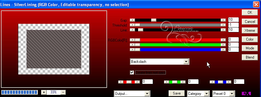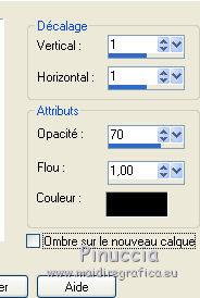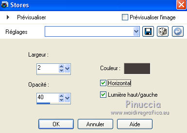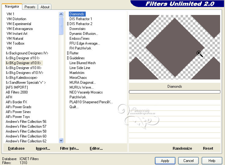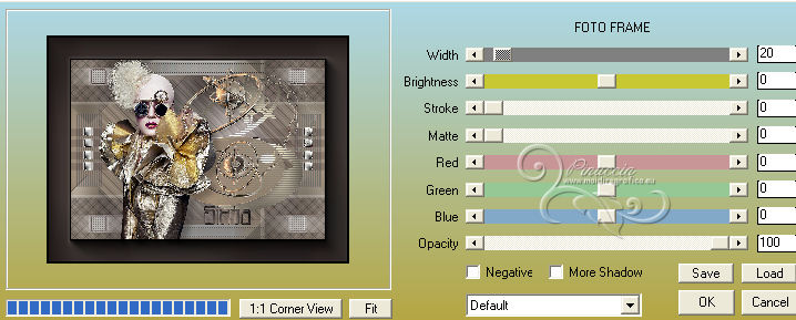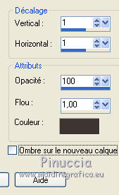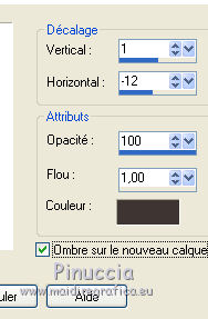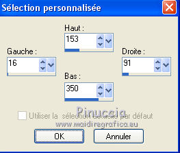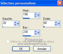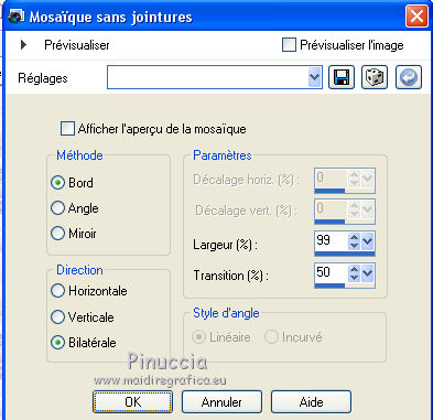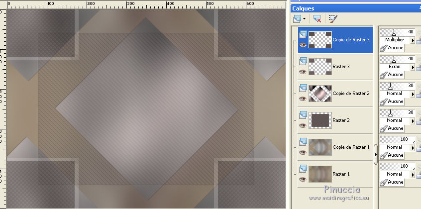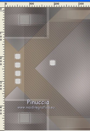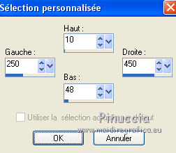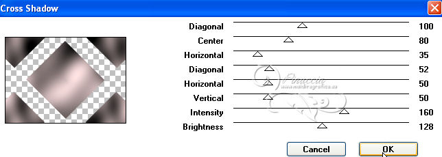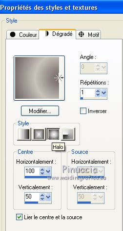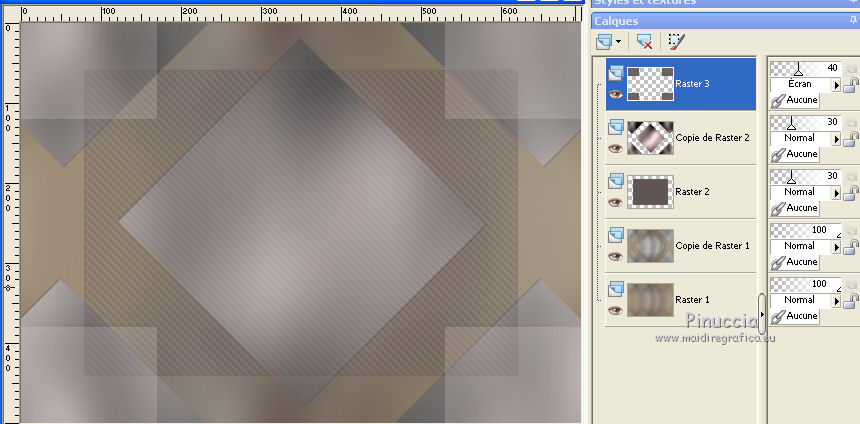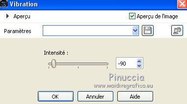 qui puoi trovare qualche risposta ai tuoi dubbi. Se l'argomento che ti interessa non è presente, ti prego di segnalarmelo. Pour traduire ce tutoriel j'ai utilisé Corel X2, mais il peut également être exécuté avec les autres versions. Suivant la version utilisée, vous pouvez obtenir des résultats différents. Depuis la version X4, la fonction Image>Miroir a été remplacée par Image>Renverser horizontalement, et Image>Renverser avec Image>Renverser verticalement. Dans les versions X5 et X6, les fonctions ont été améliorées par la mise à disposition du menu Objets. Avec la nouvelle version X7, nous avons à nouveau Miroir/Retourner, mais avec nouvelles différences. Consulter, si vouz voulez, mes notes ici Certaines dénominations ont changées entre les versions de PSP. Les plus frequentes dénominations utilisées: ![]() traduction italienne ici vos versions iciNécessaire pour réalise le tutoriel: Matériel ici Pour les tubes merci Syl et No (les liens des sites des tubeuses ici) Modules Externes. consulter, si nécessaire, ma section de filtre ici Filters Unlimited 2.0 ici &<Bkg Designer sf10I> - Cruncher (da importare in Unlimited) ici &<Bkg Designer sf10I> - Diamonds (da importare in Unlimited) ici Simple - Top Left Mirror ici AAA Frames - Foto Frame ici AP 01 [Innovations] - Lines SilverLining ici Greg's Factory Output II - Pool Shadow ici Graphics Plus - Cross Shadow ici Filtres Simple, Greg's Factory Output et Graphics Plus peuvent être utilisés seuls ou importés dans Filters Unlimited. voir comment le faire ici). Si un filtre est fourni avec cette icône, ![]() N'hésitez pas à changer le mode mélange des calques et leur opacité selon les couleurs que vous utiliserez Dans les plus récentes versions de PSP, vous ne trouvez pas le dégradé d'avant plan/arrière plan ou Corel_06_029. Vous pouvez utiliser le dégradé des versions antérieures. Ici le dossier Dégradés de CorelX. Ouvrez la police et la minimiser. Vous la trouverez dans la liste des polices disponibles lorsque vous en avez besoin. Avec les nouveaux s.o. ce n'est plus possible. Pour utiliser une police, vous devez le copier dans le dossier Fonts de Windows. Placer le dégradé dans le dossier Dégradés. Placer les sélections dans le dossier Sélections. Placer en avant plan la couleur #6c6060, et en arrière plan la couleur #c8c4ba. ![]() Préparer en avant plan un dégradé de premier plan/arrière plan, style Halo. ![]() 1. Ouvrir une nouvelle image transparente 700 x 500 pixels, et remplir l'image transparente du dégradéSélections>Sélectionner tout. Ouvrir le tube SvB (404) Beauty e via a Édition>Copier. Revenir sur votre travail et Édition>Coller dans la sélection. Sélections>Désélectionner tout. Réglage>Flou>Flou radial. ![]() Effets>Effets d'image>Mosaïque sans jointures. ![]() Réglage>Flou>Flou gaussien - rayon 15. ![]() Calques>Dupliquer. Image>Renverser. Réduire l'opacité de ce calque à 50%. Calques>Fusionner>Fusionner le calque de dessous. Calques>Dupliquer. 2. Calques>Nouveau calque raster. Activer l'outil Sélection ,clicca sull'icona Sélection personnalisée ![]() e imposta i seguenti settaggi: ![]() Placer en avant plan la Couleur Remplir la sélection avec la couleur d'avant plan.Sélections>Désélectionner tout. Calques>Dupliquer. Fermer ce calque et vous positionner sur le calque de dessous de l'original. Effets>Modules Externes>AP 01 [Innovations] - Lines SilverLining. ![]() Réduire l'opacité de ce calque à 30%. Effets>Effets 3D>Ombre portée, couleur #3f3533. ![]() Répéter Ombre portée, vertical et horizontal -1. Ouvrir et vous positionner sur le calque du haut de la pile. Effets>Modules Externes>Unlimited 2.0 - &<Bkg Designer sf10 II> – Diamonds. ![]() Réduire l'opacité de ce calque à 30%. Sélections>Sélectionner tout. Sélections>Flottante. Sélections>Statique. Effets>Modules Externes>Graphic Plus – CrossShadow. ![]() Réglage>Teinte et Saturation>Vibration ![]() Dans les anciennes versions de PSP, vous ne trouvez pas cet effet. Vous pouvez utiliser Clarifier. Pour plus d'informations, voir ci-dessous la différence avant et après l'application di Vibration. ![]() Réglage>Luminosité et Contraste>Luminosité et Contraste. ![]() Effets>Effets 3D>Ombre portée, couleur #3f3533. ![]() Répéter Ombre portée, vertical et horizontal -1. Sélections>Désélectionner tout. 3. Calques>Nouveau calque raster. Sélection personnalisée ![]() ![]() Remplir la sélection avec la couleur d'avant plan.Sélections>Désélectionner tout. Effets>Modules Externes>Simple – Top Left Mirror. ![]() Placer le calque en mode Écran et réduire l'opacité à 40%. ![]() Calques>Dupliquer. Vous positionner sur le calque de dessous de l'original. Effets>Modules Externes>Filters Unlimited 2.0 - &<Bkg Designer sf10 I> – Cruncher. ![]() Vous positionner sur le calque du haut de la pile. Effets>Modules Externes>AP 01 [Innovations> - Lines SilverLining. ![]() Placer le calque en mode Multiplier. ![]() 4. Calques>Nouveau calque raster. Sélection personnalisée ![]() ![]() Remplir la sélection avec la couleur d'arrière plan.Sélections>Désélectionner tout. Calques>Dupliquer. Vous positionner sur le calque de dessous de l'original. Effets>Effets de distorsion>Vent - vers la droite, intensité 100. ![]() Placer le calque en mode Lumière douce. Vous positionner sur le calque du haut de la pile. Effets>Effets de distorsion>Vent - vers la gauche, intensité 100. ![]() Placer le calque en mode Lumière douce. Calques>Fusionner>Fusionner le calque de dessous. Effets>Effets de bords>Accentuer. Image>Redimensionner, à 97%, redimensionner tous les calques décoché. Déplacer la forme un peu plus en haut, au centre.![]() Calques>Dupliquer. Image>Renverser. Calques>Fusionner>Fusionner le calque de dessous. Garder le calque en mode Lumière douce. Effets>Effets de bords>Accentuer. 5. Calques>Nouveau calque raster. Sélection personnalisée ![]() ![]() Remplir la sélection