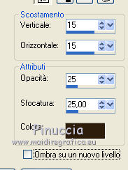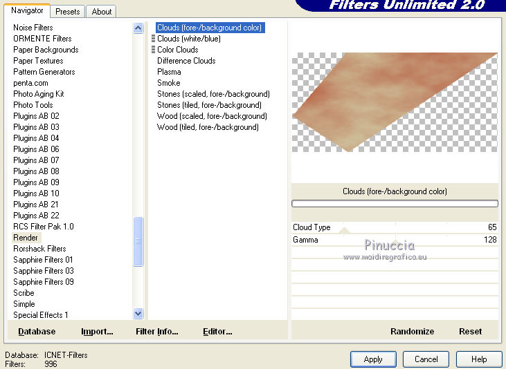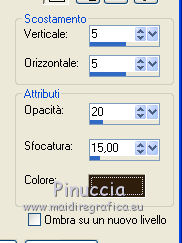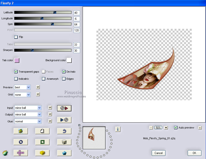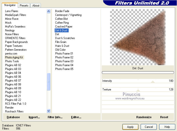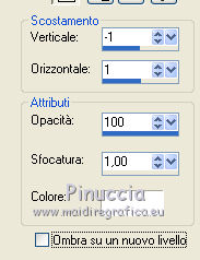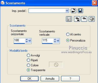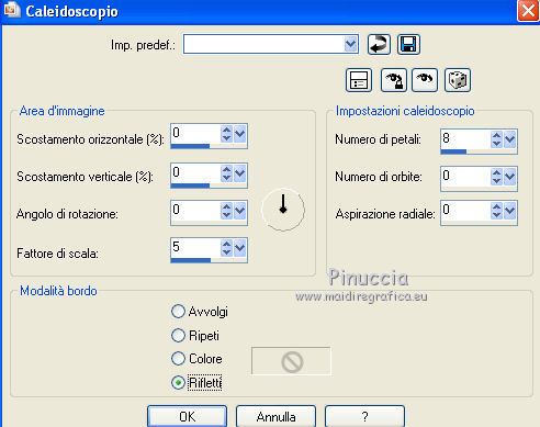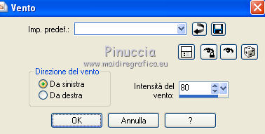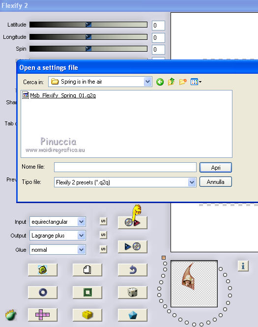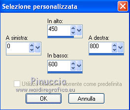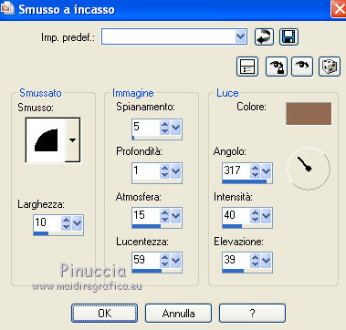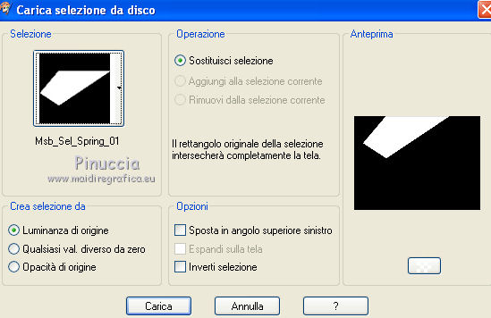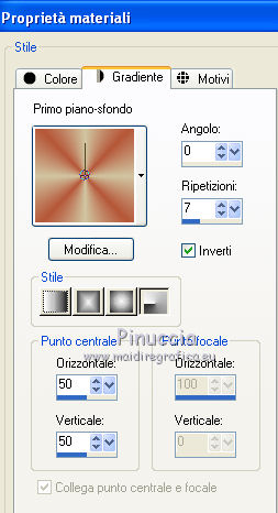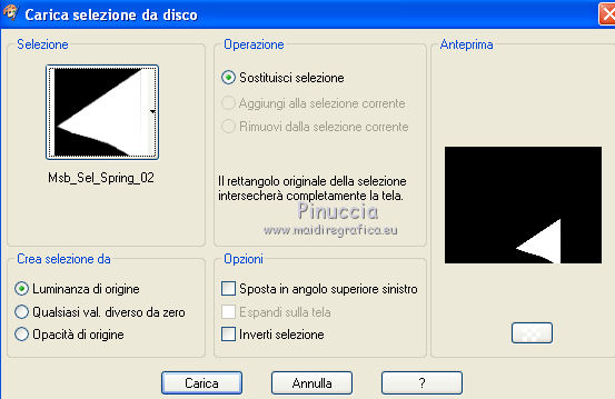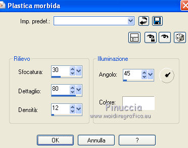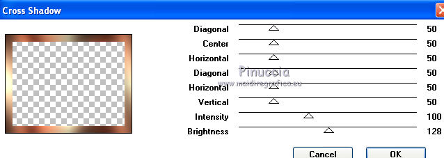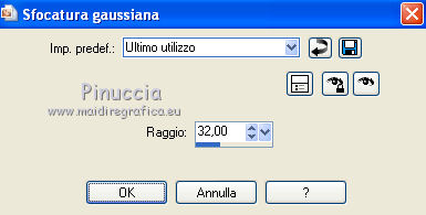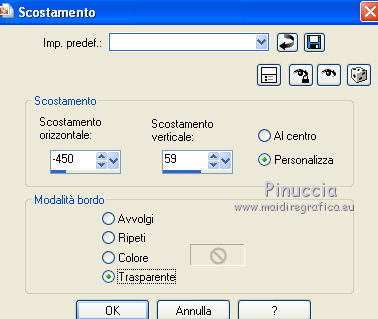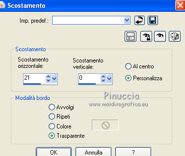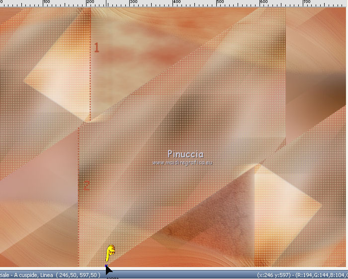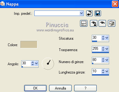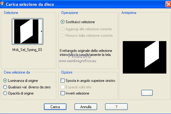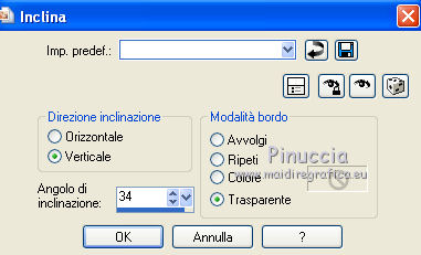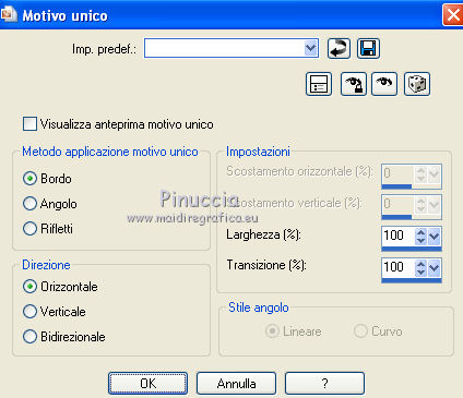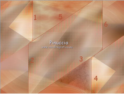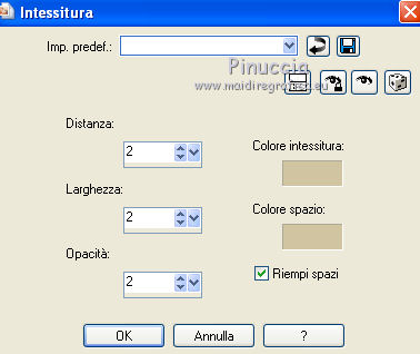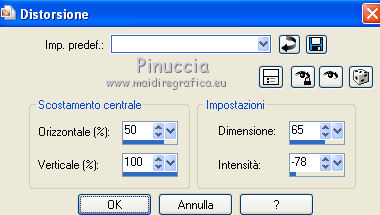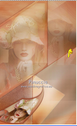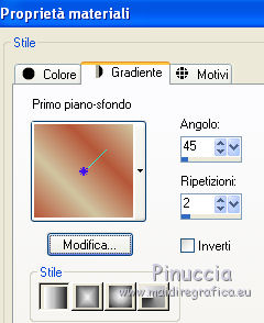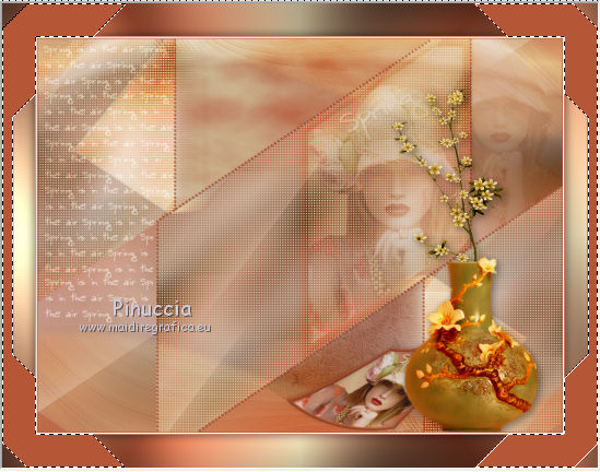 qui puoi trovare qualche risposta ai tuoi dubbi. Se l'argomento che ti interessa non è presente, ti prego di segnalarmelo. Per tradurre questo tutorial ho usato PSP X. Questo tutorial è una creazione ©Meetjesplekje e non può essere copiato su altri siti nè essere offerto per il download. Lo stesso vale per la mia traduzione. Il materiale viene da vari gruppi di condivisione. Il copyright appartiene ai rispettivi autori. Grazie ai creatori dei tubes che mettono a disposizione il loro lavoro in vari gruppi di condivisione. Occorrente: Materiale qui Il tube della donna è di Guismo Il tube dei fiori è di Crealine Grazie a tutti gli autori per i loro bellissimi tubes. Filtri: consulta, se necessario, la mia sezione filtri qui Simple - Blintz qui Graphics Plus - Cross Shadow qui Filters Unlimited 2.0 qui Photo Aging Kit qui Flaming Pear - Flexify 2 qui ![]() Apri il font e minimizzalo. Lo troverai nella lista dei font disponibili quando ti servirà. Metti il pennello nella cartella Pennelli. Attenzione, il pennello è composto da due files che non devono essere separati. Vedi gli appunti sui pennelli qui Metti le selezioni nella cartella Selezioni. 1. Imposta il colore di primo piano con #b55638, e il colore di sfondo con #d1c5a1. Passa il colore di primo piano a Gradiente, stile Lineare, con i seguenti settaggi. ![]() Apri una nuova immagine trasparente 800 x 600 pixels, e riempila con il gradiente.Selezione>Seleziona tutto. Apri il tube calguiportraitspring2331 e vai a Modifica>Copia. non chiuderlo perchè ti servirà ancora. Torna al tuo lavoro e vai a Modifica>Incolla nella selezione. Selezione>Deseleziona. Effetti>Effetti di immagine>Motivo unico, con i settaggi standard. ![]() Regola>Sfocatura>Sfocatura gaussiana - raggio 32. ![]() 2. Livelli>Duplica. Effetti>Plugins>Simple - Blintz. Effetti>Effetti di immagine>Motivo unico, con i settaggi standard. Ripeti Effetti>Effetti di immagine>Motivo unico, con i seguenti settaggi. ![]() Livelli>Duplica. Immagine>Rifletti. Abbassa l'opacità di questo livello al 40%. 3. Livelli>Unisci>Unisci giù. Livelli>Duplica. Immagine>Ridimensiona, al 60%, tutti i livelli non selezionato. Effetti>Effetti geometrici>Inclina. ![]() Effetti>Effetti di trama>Intessitura - colore #d1c5a1. ![]() Effetti>Effetti di immagine>Scostamento. ![]() Livelli>Duplica. Effetti>Effetti di immagine>Scostamento. ![]() Livelli>Duplica. Immagine>Rifletti. Immagine>Capovolgi. Effetti>Effetti di immagine>Scostamento. ![]() Livelli>Unisci>Unisci giù - 2 volte. 4. Attiva il livello sottostante. Selezione>Carica/Salva selezione>Carica Selezione da disco. Cerca e carica la selezione Msb_Sel_Spring_01. ![]() Selezione>Innalza selezione a livello. Effetti>Plugins>Filters Unlimited 2.0 - Render Clouds (fore/backgroud color), con i settaggi standard. ![]() Attiva il livello superiore. Selezione>Innalza selezione a livello. Selezione>Deseleziona. Effetti>Effetti di distorsione>Vento - da sinistra, intensità 80. ![]() Livelli>Duplica. Immagine>Rifletti. Immagine>Capovolgi. Effetti>Effetti di immagine>Scostamento. ![]() Livelli>Unisci>Unisci giù. Cambia la modalità di miscelatura di questo livello in Sovrapponi. Livelli>Duplica. Cambia la modalità di miscelatura di questo livello in Filtra, e abbassa l'opacità al 55%. Livelli>Unisci>Unisci giù. Lascia la modalità di miscelatura di questo livello in Sovrapponi, ma porta l'opacità all'86%. Livelli>Unisci>Unisci giù - 2 volte. 5. La tua paletta dei colori è sempre impostata così: Colore di primo piano #b55638 colore di sfondo #d1c5a1. Primo piano impostato con il Gradiente Lineare. ![]() Livelli>Nuovo livello raster. Attiva lo strumento Selezione ,clicca sull'icona Selezione personalizzata ![]() e imposta i seguenti settaggi: ![]() Riempi la selezione con il gradiente.Selezione>Deseleziona. Effetti>Effetti di distorsione>Distorsione. ![]() Effetti>Effetti di trama>Plastica morbida. ![]() Effetti>Effetti 3D>Sfalsa ombra, con il colore #2f1e0e. ![]() Effetti>Effetti di bordo>Aumenta. Livelli>Duplica. Immagine>Rifletti. Immagine>Capovolgi. Livelli>Unisci>Unisci giù. Cambia la modalità di miscelatura di questo livello in Luce diffusa, e abbassa l'opacità al 92%. 6. Attiva il secondo livello dal basso. Selezione>Carica/Salva selezione>Carica Selezione da disco. Cerca e carica la selezione Msb_Sel_Spring_02. ![]() Selezione>Innalza selezione a livello. Effetti>Effetti di trama>Nappa - colore #d1c5a1. ![]() Effetti>Plugins>Filters Unlimited 2.0 – Photo Aging Kit – Dirt & Dust. ![]() Selezione>Deseleziona. Cambia la modalità di miscelatura di questo livello in Luce diffusa. Attiva nuovamente il livello superiore. 7. Imposta il colore di primo piano con #b55638. colore di sfondo #d1c5a1. Attiva lo strumento Penna ![]() linea di stile Punto - larghezza 3 ![]() Traccia 6 linee come nell'esempio, ognuna su un proprio livello (dopo aver tracciato la linea: Livelli>Converti in livello raster) ![]() Per le linee orizzontali tieni premuto il tasto della maiuscola per ottenere una linea diritta. Per le linee oblique, clicca nel punto di partenza ![]() Clicca quindi sul punto di arrivo e la linea si traccerà da sola ![]() Quando hai tracciato tutte le linee, attiva il livello superiore delle linee, e vai a Livelli>Unisci>Unisci giù e ripeti 4 volte, per avere le linee su un unico livello. Effetti>Effetti 3D>Sfalsa ombra, con il colore nero. ![]() 8. Livelli>Nuovo livello raster. Selezione>Carica/Salva selezione>Carica Selezione da disco. Cerca e carica la selezione Msb_Sel_Spring_03. ![]() Riempi la selezione con il colore di primo piano.Selezione>Modifica>Contrai - 12 pixels. Riporta il colore di primo piano a Gradiente. ![]() Riempi la selezione con il gradiente.Apri il tube calguisportraitspring23311. Attiva lo strumento Selezione , rettangolo,e seleziona la parte superiore del tube. Modifica>Copia, e minimizza il tube che ti servirà ancora. Torna al tuo lavoro e vai a Modifica>Incolla come nuovo livello. Immagine>Ridimensiona, all