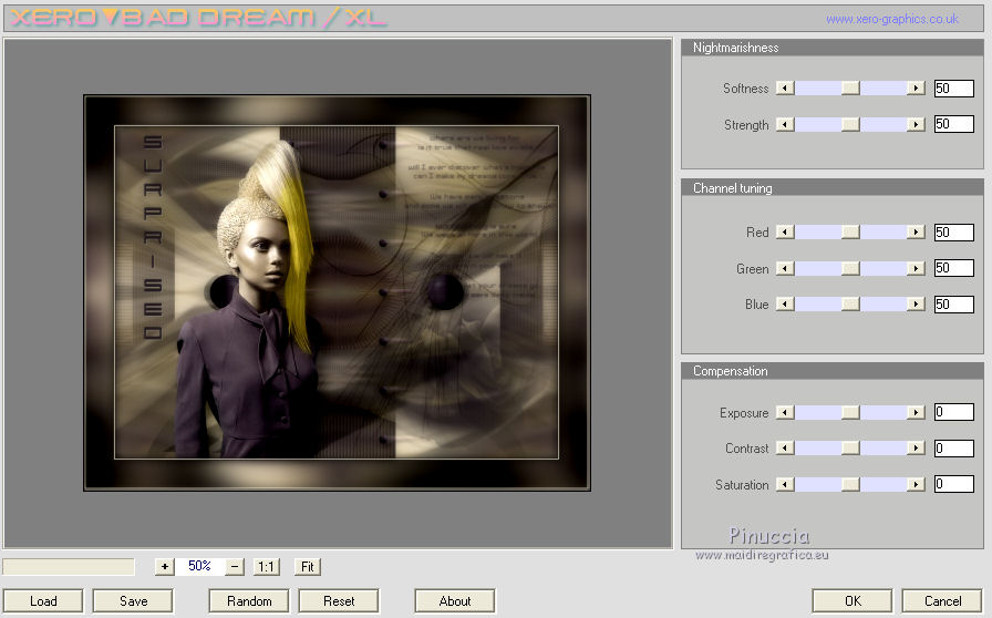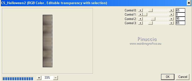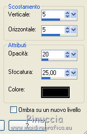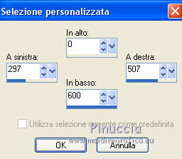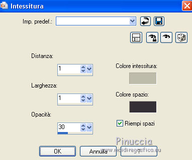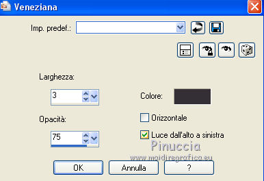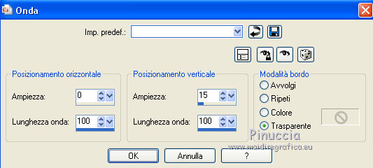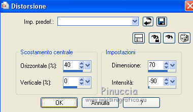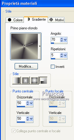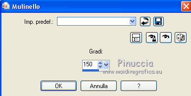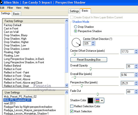qui puoi trovare qualche risposta ai tuoi dubbi. Se l'argomento che ti interessa non è presente, ti prego di segnalarmelo. Questo tutorial è una creazione ©Meetjesplekje e non può essere copiato su altri siti nè essere offerto per il download. Lo stesso vale per la mia traduzione. Il materiale viene da vari gruppi di condivisione. Il copyright appartiene ai rispettivi autori. Grazie ai creatori dei tubes che mettono a disposizione il loro lavoro in vari gruppi di condivisione. Per tradurre questo tutorial ho usato PSP X3 per l'immagine in alto e PSP X per l'immagine in fondo al tutorial. Occorrente: Materiale qui Per il tube della donna grazie Annelies Per il tube della pianta grazie Filtri: consulta, se necessario, la mia sezione filtri qui Filters Unlimited 2.0 qui &<Bkg Designer sf10III> - Diagonal Mirror (da importare in Unlimited) qui Transparency - Eliminate White qui Mura's Meister - Copies qui Carolaine and Sensibility - CS_Halloween 2 qui Graphics Plus - Cross Shadow qui Xero XL - Bad Dream qui Alien Skin Eye Candy 5 Impact - Perspective Shadow qui ![]() Se stai usando altri colori puoi sperimentare le modalità di miscelatura e le opacità più adatte ai tuoi colori. Metti il preset Cliccando sul file una o due volte (a seconda delle tue impostazioni), automaticamente il preset si installerà nella cartella corretta. perchè uno o due clic vedi qui Metti i pennelli nella cartella Pennelli. Attenzione, ogni pennello è composto da due files che non devono essere separati. Vedi gli appunti sui pennelli qui La trama Corel_15_005 è standard nelle versioni più recenti di PSP e corrisponde alla trama standard delle versioni precedenti Tela fine. Se non la trovi nel tuo PSP, metti quella fornita nella cartella Trame. Sulle nuove denominazioni delle cartelle in PSP vedi qui Metti le selezioni nella cartella Selezioni. Imposta il colore di primo piano con #342f35, e il colore di sfondo con #bdbcaa. Passa il colore di primo piano a Gradiente di primo piano/sfondo, stile Radiale: ![]() 1. Apri una nuova immagine trasparente 800 x 600 pixels, e riempila con il gradiente.Selezione>Seleziona tutto. Apri il tube Alies 714-woman-purple-yellow-10122011 e vai a Modifica>Copia. non chiuderlo, perchè ti servirà ancora Torna al tuo lavoro e vai a Modifica>Incolla nella selezione. Selezione>Deseleziona. Effetti>Effetti di immagine>Motivo unico. ![]() 2. Effetti>Effetti di immagine>Motivo unico, con i settaggi standard. ![]() Regola>Sfocatura>Sfocatura radiale. ![]() Effetti>Effetti di distorsione>Mulinello. ![]() Effetti>Effetti di riflesso>Caleidoscopio. ![]() Effetti>Effetti di immagine>Motivo unico. ![]() 3. Selezione>Deseleziona. Selezione>Carica/Salva selezione>Carica selezione da disco. Cerca e carica la selezione Msb_Surprised_1. ![]() Selezione>Innalza selezione a livello. Selezione>Deseleziona. Effetti>Effetti 3D>Sfalsa ombra, colore nero. ![]() Ripeti l'Effetto Sfalsa ombra, cambiando verticale e orizzontale con -5. Livelli>Duplica. Effetti>Effetti di immagine>Motivo unico, con i settaggi standard. ![]() Chiudi questo livello a ttiva il livello inferiore. ![]() Modifica>Copia. Modifica>Incolla come nuova immagine. Salva l'immagine in formato Psp, e minimizzala. La userai più tardi. 4. Rimani posizionato sul livello inferiore. Attiva lo strumento Selezione ![]() clicca sull'icona Selezione personalizzata ![]() e imposta i seguenti settaggi. ![]() Selezione>Innalza selezione a livello. Effetti>Plugins>Carolaine and Sensibility - CS_Halloween 2, con i settaggi standard. ![]() Selezione>Deseleziona. Livelli>Duplica. Immagine>Rifletti. Livelli>Unisci>Unisci giù - 2 volte. 5. Selezione>Deseleziona. Selezione>Carica/Salva selezione>Carica selezione da disco. Cerca e carica la selezione Msb_Surprised_02. ![]() Selezione>Innalza selezione a livello. Livelli>Disponi>Porta in alto. Effetti>Effetti di distorsione>Distorsione. ![]() Effetti>Effetti geometrici>Cilindro verticale. ![]() Selezione>Deseleziona. Livelli>Duplica. Immagine>Capovolgi. Livelli>Unisci>Unisci giù. Effetti>Effetti di trama Intessitura. Colore intessitura: colore di sfondo #bdbcaa, colore spazio: colore di primo piano #342f35. ![]() 6. Livelli>Duplica. Effetti>Effetti di distorsione>Onda. ![]() Livelli>Unisci>Unisci giù. 7. Riapri e attiva il secondo livello dall'alto. ![]() Selezione>Carica/Salva selezione>Carica selezione da disco. Cerca e carica la selezione Msb_Surprised_03. ![]() Selezione>Innalza selezione a livello. Selezione>Deseleziona. Effetti>Effetti geometrici>Sfera. ![]() Effetti>Plugins>Filters Unlimited 2.0 - &<Bkg Designer sf10III> - Radial Reflections 03, con i settaggi standard. ![]() Effetti>Plugins>Transparency - Eliminate White. Effetti>Effetti di bordo>Aumenta. Cambia la modalità di miscelatura di questo livello in Luce diffusa, e abbassa l'opacità al 73%. ![]() 8. Attiva il livello inferiore. Selezione personalizzata ![]() ![]() Selezione>Innalza selezione a livello. Selezione>Deseleziona. Effetti>Effetti di trama>Veneziana - colore di primo piano #342f35. ![]() Effetti>Plugins>MuRa’s Meister – Copies. ![]() Regola>Messa a fuoco>Metti a fuoco. 9. Attiva nuovamente il livello inferiore. Selezione>Carica/Salva selezione>Carica selezione da disco. Cerca e carica la selezione Msb_Surprised_04. ![]() Selezione>Innalza selezione a livello. Selezione>Deseleziona. Livelli>Disponi>Porta in alto. Effetti>Effetti di distorsione>Distorsione. ![]() Effetti>Effetti di immagine>Scostamento. ![]() Regola>Messa a fuoco>Metti a fuoco. Abbassa l'opacità di questo livello al 47%. Effetti>Effetti 3D>Sfalsa ombra, colore #202020. ![]() Livelli>Duplica. Immagine>Rifletti. Livelli>Unisci>Unisci giù. 10. Livelli>Nuovo livello raster. Attiva lo strumento Pennello ![]() Cerca e seleziona il pennello Msb_Bloem_02 ![]() Riporta il colore di primo piano al colore #342f35, e applica il pennello nell'angolo in basso a destra cliccando con il tasto sinistro del mouse per usare il colore di primo piano. ![]() Regola>Messa