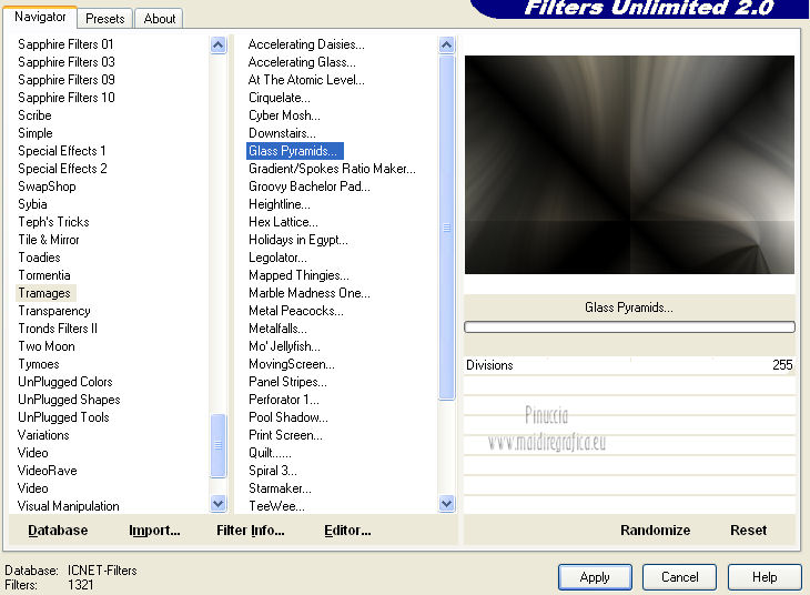 Effetti>Plugins>Filters Unlimited 2.0 – Tramage – Glass Pyramids.