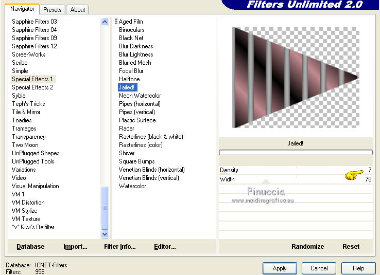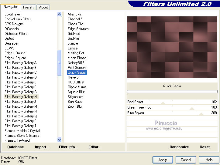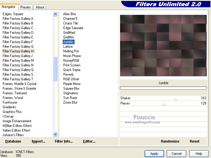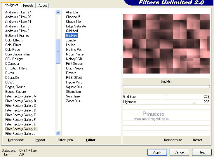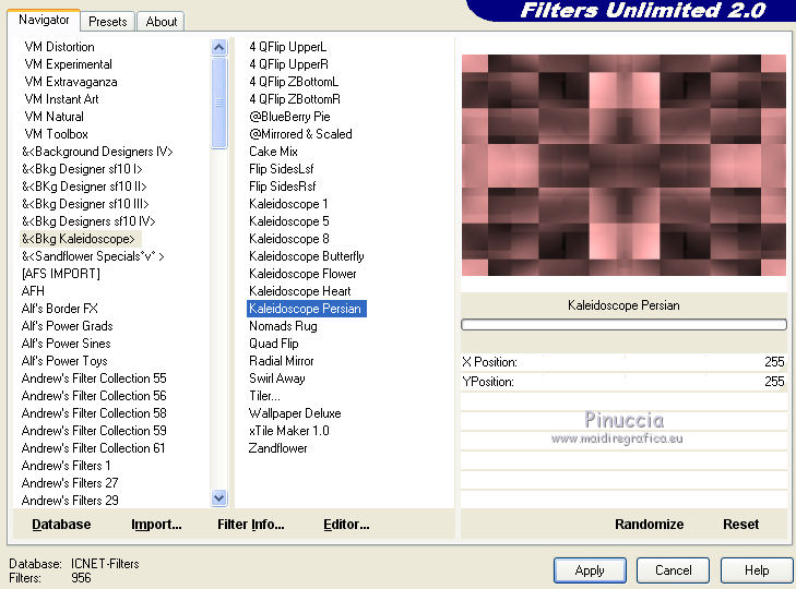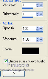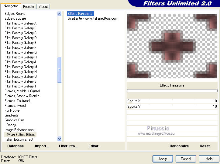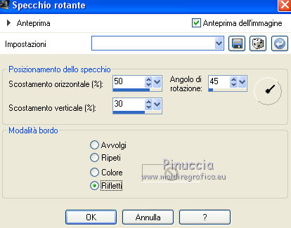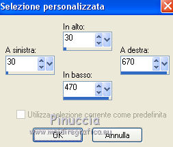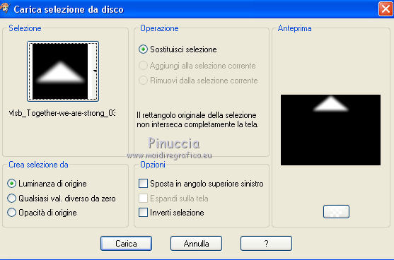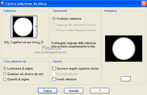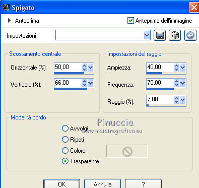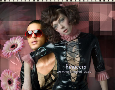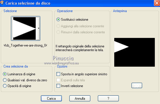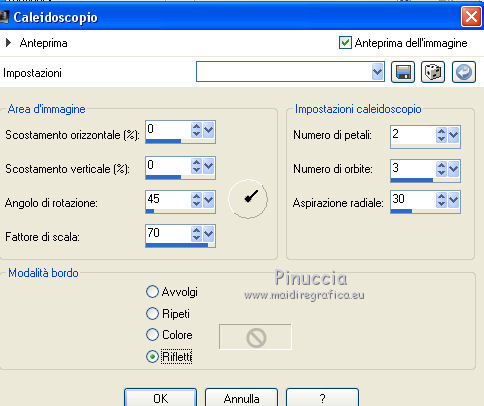 qui puoi trovare qualche risposta ai tuoi dubbi. Se l'argomento che ti interessa non è presente, ti prego di segnalarmelo. Questo tutorial è una creazione ©Meetjesplekje e non può essere copiato su altri siti nè essere offerto per il download. Lo stesso vale per la mia traduzione. Il materiale viene da vari gruppi di condivisione. Il copyright appartiene ai rispettivi autori. Grazie ai creatori dei tubes che mettono a disposizione il loro lavoro in vari gruppi di condivisione. Per tradurre questo tutorial ho usato CorelX, ma può essere realizzato anche con le altre versioni di PSP. Dalla versione X4, il comando Immagine>Rifletti è stato sostituito con Immagine>Capovolgi in orizzontale, e il comando Immagine>Capovolgi con Immagine>Capovolgi in verticale. Nelle versioni X5 e X6, le funzioni sono state migliorate rendendo disponibile il menu Oggetti. Vedi la scheda sull'argomento qui traduzione francese/traduction française qui/ici le vostre versioni /vos versions qui/iciOccorrente: Materiale qui Grazie: per i tubes Kitty, Annelies e Liza; per il testo Tiny. (in questa pagina trovi i links ai siti dei creatori di tubes) Filtri: consulta, se necessario, la mia sezione filtri qui Filters Unlimited 2.0 qui &<Bkg Kaleidoscope> - Kaleidoscope Persian (da importare in Unlimited) qui Italian Editors Effects - Effetto Fantasma qui Filter Factory Gallery H qui I filtri Factory Gallery e Italian Editors si possono usare da soli o importati in Filters Unlimited (come fare vedi qui) Se un filtro fornito appare con questa icona ![]() Se stai usando altri colori puoi sperimentare le modalità di miscelatura e le opacità più adatte ai tuoi colori. Apri il font e minimizzalo. Lo troverai nella lista dei font disponibili quando ti servirà. Con i nuovi sistemi operativi questo non è più possibile. Per usare un font, occorre copiarlo nella cartella Font di Windows. Metti il pennello nella cartella Pennelli. Attenzione, il pennello è composto da due files che non devono essere separati. In caso di problemi, puoi aprire in PSP il file del pennello in formato jpg, ed esportarlo come pennello personalizzato. Vedi gli appunti sui pennelli qui Metti le selezioni nella cartella Selezioni. Imposta il colore di primo piano con il colore nero #000000, e il colore di sfondo con #c18b90. ![]() Passa il colore di primo piano a Gradiente di primo piano/sfondo, stile Lineare. ![]() 1. Apri una nuova immagine trasparente 700 x 500 pixels, e riempila con il gradiente.Selezione>Seleziona tutto. Apri il tube BabyLove's Latex e vai a Modifica>Copia. non chiuderlo perchè ti servirà ancora Torna al tuo lavoro e vai a Modifica>Incolla nella selezione. Selezione>Deseleziona. Effetti>Effetti di immagine>Motivo unico, con i settaggi standard. ![]() Regola>Sfocatura>Sfocatura radiale. ![]() Regola>Sfocatura>Sfocatura gaussiana, raggio 25. ![]() Livelli>Duplica. 2. Effetti>Plugins>Filters Unlimited 2.0 – Filter Factory H – Jumble, con i settaggi standard. ![]() Attiva lo strumento Selezione ![]() clicca sull'icona selezione personalizzata ![]() e imposta i seguenti settaggi. ![]() Selezione>Innalza selezione a livello. Effetti>Plugins>Filters Unlimited 2.0 – Filter Factory H – Quick Sepia, con i settaggi standard. ![]() Effetti>Plugins>Filters Unlimited 2.0 – Filter Factory H – GridMin, con i settaggi standard. ![]() Effetti>Plugins>Filters Unlimited 2.0 - &<Bkg Kaleidoscope> Kaleidoscope Persian, con i settaggi standard. ![]() Effetti>Effetti 3D>Sfalsa ombra, colore nero. ![]() Ripeti l'Effetto Sfalsa ombra, cambiando verticale e orizzontale con -1. Selezione>Deselezione. Effetti>Effetti 3D>Sfalsa ombra, colore nero. ![]() Ripeti l'Effetto Sfalsa ombra, cambiando verticale e orizzontale con -5. 3. Selezione>Carica/Salva selezione>Carica selezione da disco. Cerca e carica la selezione Msb_ together-we-are-strong_01. ![]() Selezione>Innalza selezione a livello. Selezione>Deseleziona. Effetti>Effetti di immagine>Motivo unico, con i settaggi standard. ![]() Selezione>Seleziona tutto. Selezione>Mobile. Selezione>Immobilizza. Effetti>Effetti 3D>Sfalsa ombra, colore nero, ombra su nuovo livello selezionato. ![]() Attiva il livello superiore. Ripeti l'Effetto Sfalsa ombra, cambiando verticale e orizzontale con -1, ombra su nuovo livello sempre selezionato. Livelli>Unisci>Unisci giù (per unire i due livelli ombra). Abbassa l'opacità di questo livello al 40%. Attiva il livello superiore. Livelli>Unisci>Unisci giù. Selezione>Deseleziona. Inverti i colori della paletta in modo che il nero passi a colore di sfondo. Effetti>Plugins>Filters Unlimited 2.0 - It@lian Editors Effect - Effetto Fantasma. ![]() Effetti>Effetti di bordo>Aumenta. Cambia la modalità di miscelatura di questo livello in Filtra, e abbassa l'opacità al 60%. Effetti>Effetti 3D>Sfalsa ombra, colore nero, attenzione, ombra su nuovo livello non selezionato. ![]() Ripeti l'Effetto Sfalsa ombra, cambiando verticale e orizzontale con -5. 4. Attiva il livello sottostante. Effetti>Effetti di riflesso>Caleidoscopio. ![]() Cambia la modalità di miscelatura di questo livello in Luce diffusa. 5. Inverti nuovamente i colori, riportando il colore nero a colore di primo piano. Livelli>Nuovo livello. Selezione>Carica/Salva selezione>Carica selezione da disco. Cerca e carica la selezione Msb_ together-we-are-strong_02. ![]() Riempi la selezione con il colore di sfondo.Selezione>Deseleziona. Cambia la modalità di miscelatura di questo livello in Indebolisci, e abbassa l'opacità al 50%. Livelli>Duplica. Attiva il livello sottostante dell'originale. Effetti>Effetti di riflesso>Specchio rotante. ![]() Cambia la modalità di miscelatura di questo livello in Indebolisci, e abbassa l'opacità al 30%. Attiva il livello soprastante. Livelli>Duplica. Effetti>Effetti di distorsione>Spigato. ![]() Effetti>Effetti di immagine>Scostamento. ![]() Lascia la modalità di miscelatura di questo livello in Indebolisci, e abbassa l'opacità al 30%. Livelli>Duplica. Immagine>Rifletti.