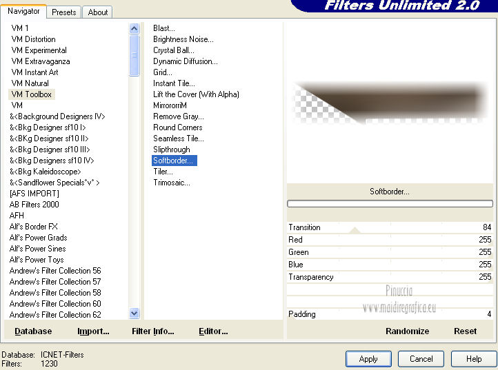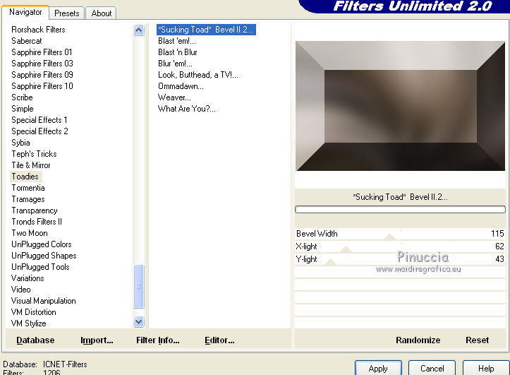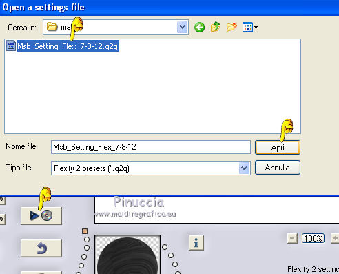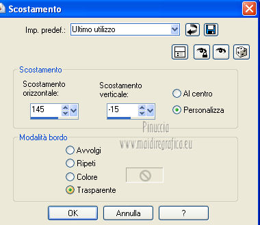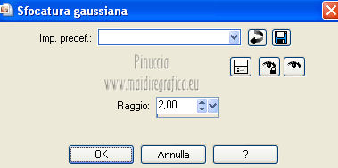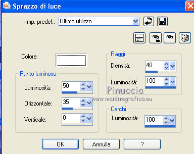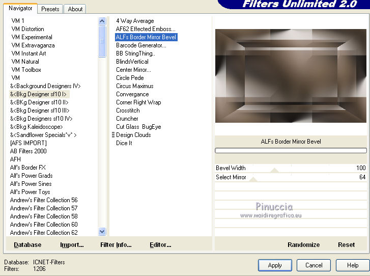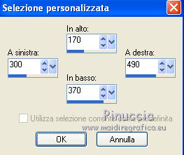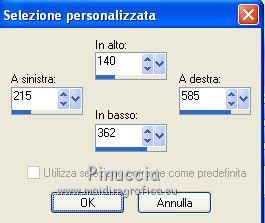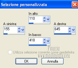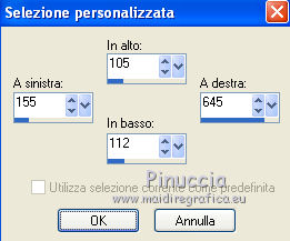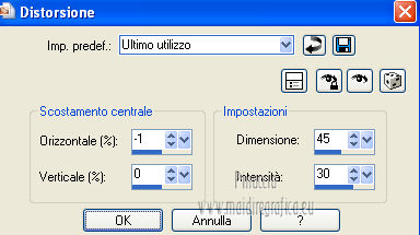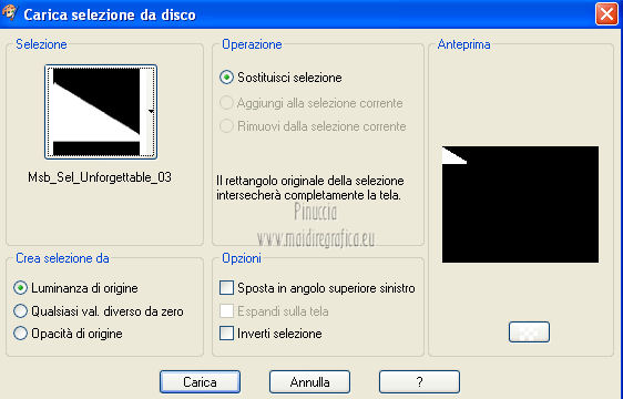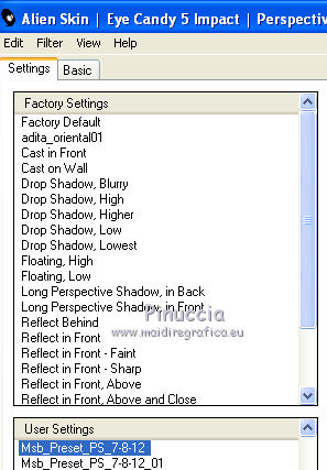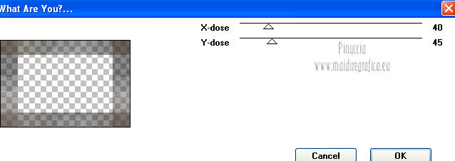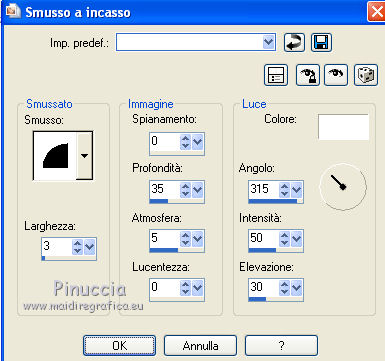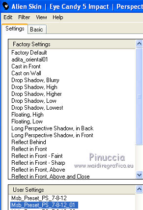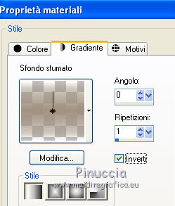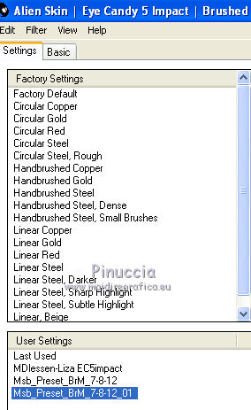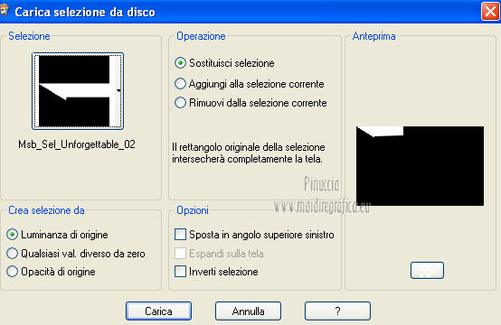 qui puoi trovare qualche risposta ai tuoi dubbi. Se l'argomento che ti interessa non è presente, ti prego di segnalarmelo. Questo tutorial è una creazione ©Meetjesplekje e non può essere copiato su altri siti nè essere offerto per il download. Lo stesso vale per la mia traduzione. Il materiale viene da vari gruppi di condivisione. Il copyright appartiene ai rispettivi autori. Grazie ai creatori dei tubes che mettono a disposizione il loro lavoro in vari gruppi di condivisione. Questo tutorial è stato creato con PSP X3. Per tradurlo usato PSP X. Occorrente: Materiale qui Per i tubes grazie Annelies Filtri: consulta, se necessario, la mia sezione filtri qui Filters Unlimited 2.0 qui &<Bkg Designer sf10I - Alf's Border Mirror Bevel (da importare in Unlimited) qui Alien Skin Eye Candy 5 Impact - Brushed Metal, Perspective Shadow qui Flaming Pear - Flexify 2.0 qui Toadies - Ommadawn qui VM Toolbox - Blast, Softborder qui i filtri Toadies e VM Toolbox si possono usare da soli o importati in Filters Unlimited. A volte si riscontrano differenze nel risultato tra i diversi usi, ma non ci sono regole codificate. Per questo si possono notare soltanto al momento di usarli. ![]() Se non vuoi sentire la musica premi il tasto ESC Se stai usando altri colori puoi sperimentare le modalità di miscelatura e le opacità più adatte ai tuoi colori. Apri il font e minimizzalo. Lo troverai nella lista dei font disponibili quando ti servirà. Salva i preset per Flexify 2 in una cartella tua scelta. Li importerai da questa cartella quando ti serviranno. Metti i preset per Eye Candy nelle rispettive cartelle del filtro: Alien Skin Eye Candy 5 Impact>Settings>Shadow/Brushed metal. Cliccando sul file una o due volte (a seconda delle tue impostazioni), automaticamente il preset si installerà nella cartella corretta. Metti le selezioni nella cartella Selezioni. Imposta il colore di primo piano con #030303, e il colore di sfondo con #a19181. Passa il colore di primo piano a Gradiente, stile Radiale, con i seguenti settaggi. ![]() 1. Apri una nuova immagine trasparente 800 x 500 pixels, e riempila con il gradiente.Selezione>Seleziona tutto. Apri il tube Alies 9VR28-woman-04072012 e vai a Modifica>Copia. non chiuderlo perchè ti servirà ancora Torna al tuo lavoro e vai a Modifica>Incolla nella selezione. Selezione>Deseleziona. Effetti>Effetti di immagine>Motivo unico, con i settaggi standard. ![]() Regola>Sfocatura>Sfocatura radiale. ![]() Regola>Sfocatura>Sfocatura gaussiana - raggio 25. ![]() 2. Livelli>Duplica. Effetti>Plugins>Filters Unlimited 2.0 - Toadies - Sucking Toad Bevel II.2, con i settaggi standard. ![]() Effetti>Effetti di immagine>Motivo unico, con i settaggi standard. Livelli>Unisci>Unisci giù. Fai una copia del lavoro usando la combinazione di tasti maiuscola+D. Minimizza la copia e torna al tuo lavoro. Livelli>Duplica. Effetti>Plugins>Filters Unlimited 2.0 - &<Bkg Designer sf10I - Alf's Border Mirror Bevel. ![]() 3. Attiva lo strumento Selezione ,clicca sull'icona Selezione personalizzata ![]() e imposta i seguenti settaggi: ![]() Selezione>Innalza selezione a livello. Effetti>Effetti 3D>Smusso a incasso. ![]() Selezione>Deseleziona. Livelli>Duplica. Immagine>Capovolgi. Livelli>Unisci>Unisci giù. 4. Livelli>Nuovo livello raster. Selezione personalizzata ![]() ![]() Riempi la selezione con il colore di primo piano.Selezione>Modifica>Contrai - 1 pixel. Livelli>Nuovo livello raster. Apri l'immagine "268034" e vai a Modifica>Copia. Torna al tuo lavoro e vai a Modifica>Incolla nella selezione. Selezione>Deseleziona. Livelli>Unisci>Unisci giù. Effetti>Plugins>Alien Skin Eye Candy 5 Impact - Perspective Shadow. Seleziona il preset Msb_Preset_PS_7-8-12 e ok. ![]() Di nuovo Effetti>Plugins>Alien Skin Eye Candy 5 Impact - Perspective Shadow. Seleziona il preset Msb_Preset_PS_7-8-12_01 e ok. ![]() 5. Passa il colore di primo piano a Gradiente Sfondo sfumato, con i seguenti settaggi. ![]() Livelli>Nuovo livello raster. Selezione>Carica/Salva selezione>Carica selezione da disco. Cerca e carica la selezione Msb_Sel_Unforgettable_01. ![]() Effetti>Plugins>Alien Skin Eye Candy 5 Impact - Brushed Metal. Seleziona il preset Msb_Preset_BrM_7-8-12 e ok. ![]() Selezione>Modifica>Contrai - 5 pixels. Livelli>Nuovo livello raster. Riempi con il gradiente.Regola>Tonalità e saturazione>Vivacità. ![]() Nelle versioni meno recenti di PSP questo effetto non si trova. Puoi sostituirlo con il Regola>Tonalità e saturazione>Viraggio o con Regola>Luminosità e contrasto>Nitidezza. Selezione>Deseleziona. Livelli>Unisci>Unisci giù. Attiva lo strumento Puntatore (tasto K)deformazione se stai usando PSP 9,oppure premi sulla tastiera il tasto D, valido per tutte le versioni e spingi i nodi in alto e in basso leggermente verso l'interno per creare una forma ovale. ![]() Posiziona correttamente la forma al centro della striscia.6. Livelli>Nuovo livello raster. Attiva lo strumento Selezione a mano libera , con i seguenti settaggi:![]() Traccia una selezione intorno alla forma, una volta rilasciato il tasto del mouse la selezione si allargherà per effetto della sfumatura. ![]() Riempi la selezione con il gradiente.Effetti>Effetti di illuminazione>Sprazzo di luce. ![]() Regola>Tonalità e saturazione>Vivacità, con i settaggi precedenti. ![]() Di nuovo Regola>Tonalità e saturazione>Vivacità. ![]() Abbassa l'opacità di questo livello al 36%. Regola>Sfocatura>Sfocatura gaussiana - raggio 2. ![]() Ancora Regola>Tonalità e saturazione>Vivacità. ![]() Livelli>Unisci>Unisci giù. Selezione>Deseleziona. Livelli>Duplica. Immagine>Rifletti. Ancora Livelli>Duplica, e sposta questa lampada al centro.Livelli>Unisci>Unisci giù - 2 volte. Effetti>Effetti 3D>Sfalsa ombra, con il colore nero. ![]() ![]() 7. Livelli>Nuovo livello raster. Selezione personalizzata ![]() ![]() Effetti>Plugins>Alien Skin Eye Candy 5 Impact - Brushed Metal. Seleziona il preset Msb_Preset_BrM_7-8-12_01 e ok. ![]() Effetti>Plugins>Flaming Pear - Flexify 2.0. Clic