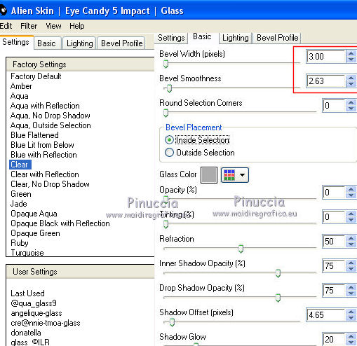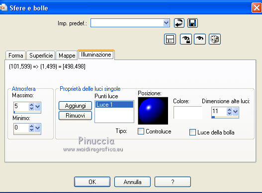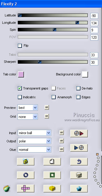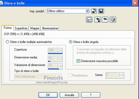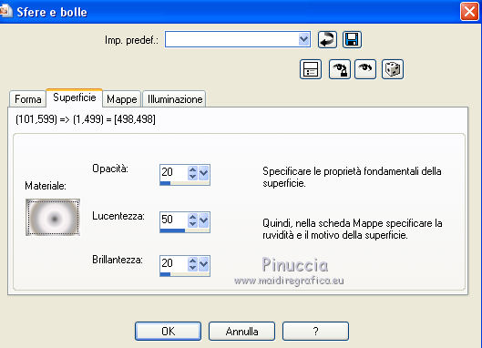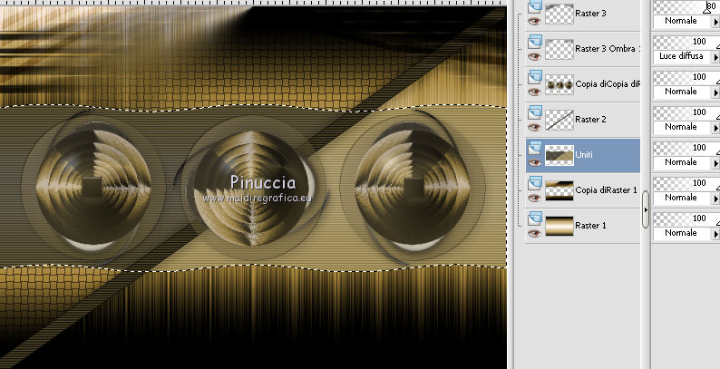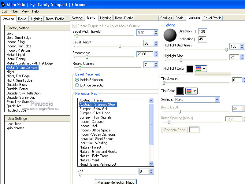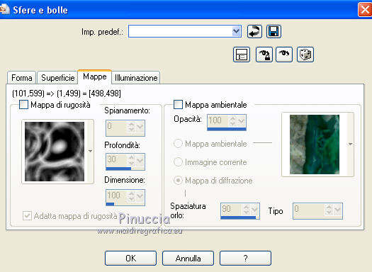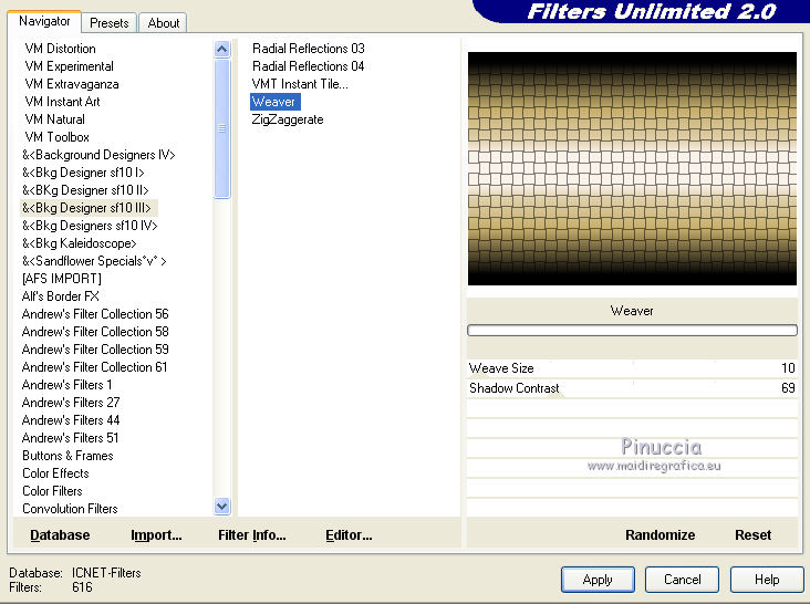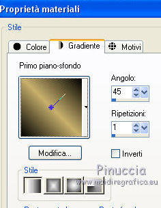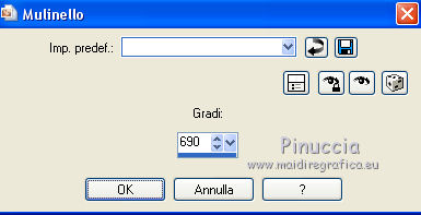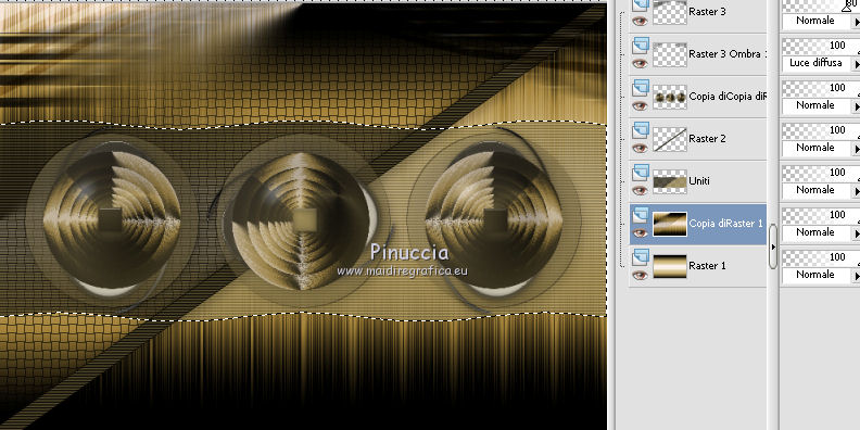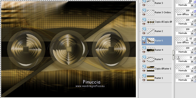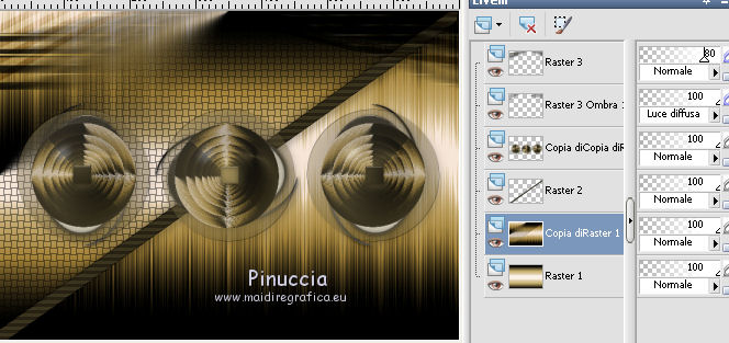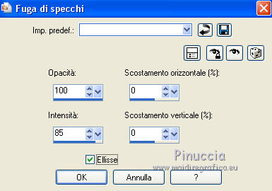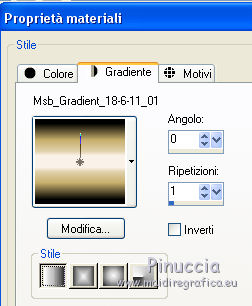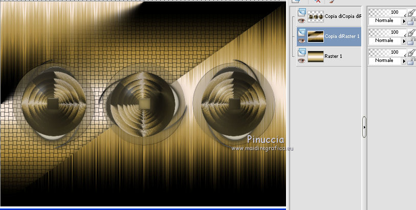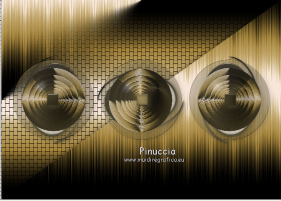 qui puoi trovare qualche risposta ai tuoi dubbi. Se l'argomento che ti interessa non è presente, ti prego di segnalarmelo. Questo tutorial è una creazione ©Meetjesplekje e non può essere copiato su altri siti nè essere offerto per il download. Lo stesso vale per la mia traduzione. Per tradurre questo tutorial ho usato PSP X, ma può essere eseguito anche con le altre versioni di PSP. Dalla versione X4, il comando Immagine>Rifletti è stato sostituito con Immagine>Capovolgi in orizzontale, e il comando Immagine>Capovolgi con Immagine>Capovolgi in verticale. Nelle versioni X5 e X6, le funzioni sono state migliorate rendendo disponibile il menu Oggetti. Con la nuova versione X7, sono tornati Rifletti>Capovolgi, ma con nuove varianti. Vedi la scheda sull'argomento qui traduction italienne ici vos versions iciOccorrente: Materiale qui Per il tube grazie Annelies Per il deco grazie Vero Filtri: consulta, se necessario, la mia sezione filtri qui Filters Unlimited 2.0 qui &<Bkg Designer sf10III> - ZigZaggerate, Weaver (da importare in Unlimited) qui Filter Factory Gallery E - Groovy Bachelor Pad qui Alien Skin Eye Candy 5 Impact - Chrome, Glass qui Flaming Pear - Flexify 2 qui I filtri Factory Gallery si possono usare da soli o importati in Filters Unlimited. (come fare vedi qui). Se un filtro fornito appare con questa icona ![]() Se stai usando altri colori puoi sperimentare le modalità di miscelatura e le opacità più adatte ai tuoi colori. Nelle ultime versioni di PSP non c'è il gradiente di primo piano/sfondo (Corel_06_029) Puoi usare i gradienti delle versioni precedenti. Trovi qui i gradienti Corel X. Apri il font e minimizzalo. Lo troverai nella lista dei font disponibili quando ti servirà. Metti il gradiente nella cartella Gradienti. Metti le selezioni nella cartella Selezioni. Imposta il colore di primo piano con il colore nero #000000, e il colore di sfondo con #c7af6c. ![]() Passa il colore di primo piano a Gradiente, e seleziona Msb_Gradient_18-6-11_01. ![]() 1. Apri una nuova immagine trasparente 700 x 500 pixels, e riempila con il gradiente.Livelli>Duplica. Selezione>Carica/Salva selezione>Carica selezione da disco. Cerca e carica la selezione Msb_Varna_01. ![]() Selezione>Innalza selezione a livello. Effetti>Plugins>Filters Unlimited 2.0 - &<Bkg Designer sf10III> – ZigZaggerate, con i settaggi standard. ![]() Effetti>Effetti di immagine>Motivo unico, con i settaggi standard. ![]() Selezione>Inverti. Attiva il livello sottostante. Effetti>Plugins>Filters Unlimited 2.0 - &<Bkg Designer sf10III> – Weaver. ![]() Selezione>Deseleziona. Attiva il livello superiore. Effetti>Effetti 3D>Sfalsa ombra, con il colore nero. ![]() Livelli>Unisci>Unisci giù. Abbassa l'opacità di questo livello all'82%. Livelli>Duplica. Cambia la modalità di miscelatura di questo livello in Moltiplica. Livelli>Unisci>Unisci giù. attenzione, con le versioni meno recenti di PSP, quando il livello sottostante ha modalità di miscelatura e opacità differenti, PSP mantiene le proprietà del livello sottostante. Se è il tuo caso, dovrai riportare l'opacità a 100. Regolati di conseguenza in casi come questo, in base alla versione di PSP che stai usando. ![]() 2. Livelli>Duplica. Effetti>Effetti geometrici>Cerchio. ![]() Effetti>Effetti di riflesso>Fuga di specchi. ![]() Immagine>Ridimensiona, al 32%, tutti i livelli non selezionato. Livelli>Duplica. Attiva il livello sottostante dell'originale. Effetti>Effetti di distorsione>Mulinello. ![]() Ripeti l'Effetto ancora due volte con gli stessi settaggi. Immagine>Ruota per gradi - 90 gradi a sinistra. ![]() Effetti>Plugins>Eyecandy 5 – Impact – Chrome. Settings: Metal,Sharp Corners - Basic Abstract- Stainless Steel. ![]() Effetti>Plugins>Alien Skin Eye candy 5 Impact – Glass. Settings: Clear - sotto Basic cambia Basic Bevel a 3 e Bevel Smoothness a 2.63 e ok. ![]() Attiva il livello superiore. Livelli>Unisci>Unisci giù. 3. Livelli>Duplica. Effetti>Effetti di immagine>Scostamento. ![]() Livelli>Duplica. Immagine>Rifletti. Attiva il livello originale Immagine>Ruota per gradi - 90 gradi a sinistra. ![]() Attiva il livello superiore. Livelli>Unisci>Unisci giù - 2 volte. Livelli>Nuovo livello raster. Selezione>Carica/Salva selezione>Carica selezione da disco. Cerca e carica la selezione Msb_Varna_02. ![]() I colori sono sempre: primo piano nero; sfondo #c7af6c. ![]() Passa il colore di primo piano a Gradiente di primo piano/sfondo, stile Lineare. ![]() Riempi la selezione con il gradiente.Effetti>Plugins>Alien Skin Eye candy 5 Impact – Glass, con i settaggi precedenti. Selezione>Deseleziona. Effetti>Effetti 3D>Sfalsa ombra, con il colore di sfondo. ![]() Ripeti l'Effetto Sfalsa ombra, cambiando verticale e orizzontale con -5. Livelli>Unisci>Unisci giù. Effetti>Effetti 3D>Sfalsa ombra, con il colore nero. ![]() Abbassa l'opacità di questo livello al 95%. 4.Livelli>Nuovo livello raster. Riempi con il gradiente.Effetti>Plugins>Flaming Pear – Flexify 2. ![]() Effetti>Effetti artistici>Sfere e bolle forma ![]() superficie ![]() mappe ![]() illuminazione ![]() Immagine>Ridimensiona, al 40%, tutti i livelli non selezionato. Abbassa l'opacità di questo livello al 40%. Effetti>Effetti 3D>Sfalsa ombra, con il colore nero. ![]() Ripeti l'Effetto Sfalsa ombra, cambiando verticale e orizzontale con -1. Livelli>Duplica - 2 volte. Sposta il livello superiore a sinistra