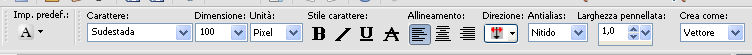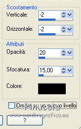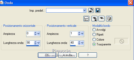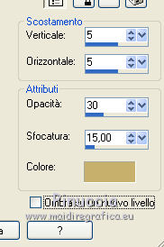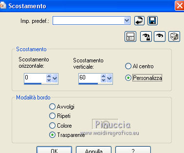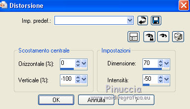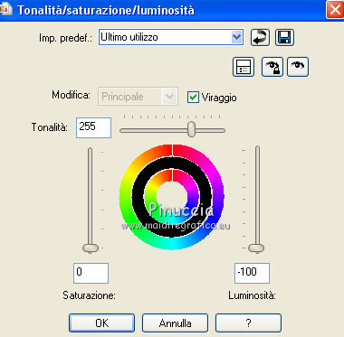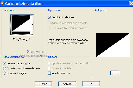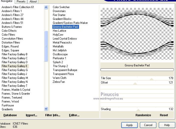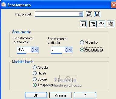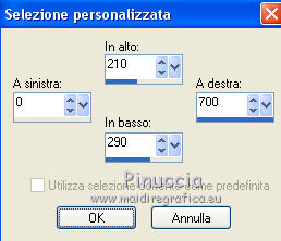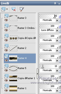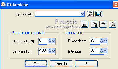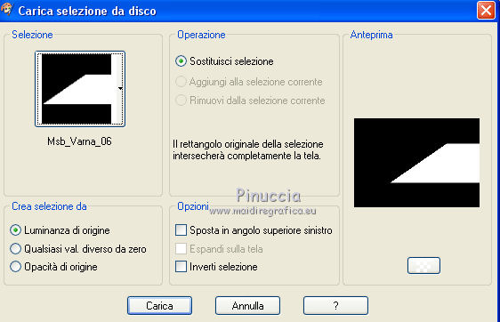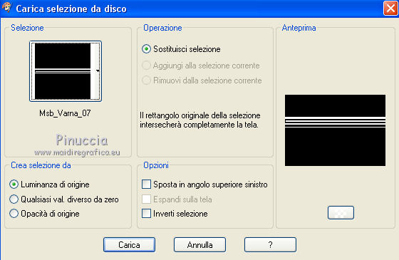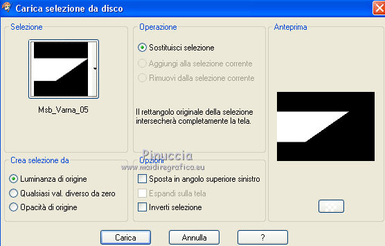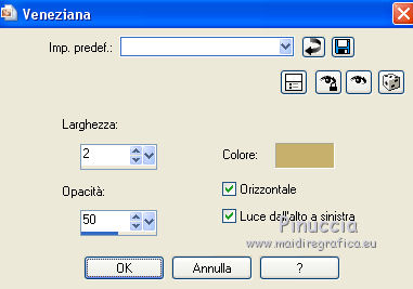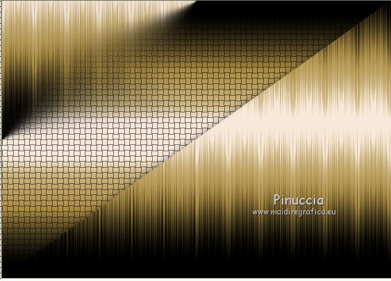 e il livello della prima copia a destra.![]() Quando le forme sono correttamente posizionate, attiva il livello superiore. Livelli>Unisci>Unisci giù - 2 volte. Effetti>Effetti 3D>Sfalsa ombra, con il colore nero. ![]() Di nuovo Livelli>Unisci>Unisci giù. 5. Attiva il secondo livello dal basso. ![]() Selezione>Carica/Salva selezione>Carica selezione da disco. Cerca e carica la selezione Msb_Varna_03. ![]() Livelli>Nuovo livello raster. Passa il colore di primo piano a Colore. Riempi la selezione con il colore nero.Effetti>Effetti di trama>Veneziana - colore di sfondo #c7af6c. ![]() Livelli>Nuovo livello raster. Riempi la selezione con il colore nero.Selezione>Modifica>Contrai - 1 pixels. Premi sulla tastiera il tasto CANC ![]() Selezione>Deseleziona. Livelli>Unisci>Unisci giù. Effetti>Effetti 3D>Sfalsa ombra, con il colore nero. ![]() Ripeti l'Effetto Sfalsa ombra, cambiando verticale e orizzontale con -5. 6. Attiva il livello superiore. Livelli>Nuovo livello raster. Selezione>Carica/Salva selezione>Carica selezione da disco. Cerca e carica la selezione Msb_Varna_04. ![]() Riempi la selezione con il colore nero.Impostando la modalità di corrispondenza dello strumento Riempimento in Nessuno, ![]() basterà un solo clic per riempire le selezioni. Selezione>Deseleziona. Effetti>Effetti di distorsione>Distorsione. ![]() Livelli>Duplica. Immagine>Rifletti. Livelli>Unisci>Unisci giù. Effetti>Effetti di immagine>Scostamento. ![]() Effetti>Effetti 3D>Sfalsa ombra, con il colore nero. Ombra su nuovo livello selezionato. ![]() Rimani posizionato sul livello dell'ombra. Effetti>Effetti di distorsione>Onda. ![]() Cambia la modalità di miscelatura di questo livello in Luce diffusa. Immagine>Ridimensiona, al 101%, tutti i livelli non selezionato. Attiva il livello superiore. Effetti>Effetti di trama>Intessitura. Colore intessitura #c7af6c - colore spazio nero. ![]() Abbassa l'opacità di questo livello all'80%. Effetti>Effetti di distorsione>Vento, da sinistra, intensità 100. ![]() Modifica>Ripeti Vento. 7. Attiva il secondo livello dal basso. ![]() Livelli>Nuovo livello raster. Selezione>Carica/Salva selezione>Carica selezione da disco. Cerca e carica la selezione Msb_Varna_05. ![]() Riempi la selezione con il colore nero.Selezione>Deseleziona. Effetti>Effetti di distorsione>Onda. ![]() Effetti>Effetti di trama>Veneziana - colore #c7af6c. ![]() Abbassa l'opacità di questo livello al 56%. 8. Livelli>Nuovo livello raster. Selezione>Carica/Salva selezione>Carica selezione da disco. Cerca e carica la selezione Msb_Varna_06. ![]() Riempi la selezione con il colore #c7af6c.Selezione>Deseleziona. Effetti>Effetti di distorsione>Golf, con i settaggi precedenti. Effetti>Effetti di trama>Veneziana - colore nero. ![]() Abbassa l'opacità di questo livello al 60%. Livelli>Unisci>Unisci giù. Selezione>Seleziona tutto. Selezione>Mobile. Selezione>Immobilizza. Attiva il secondo livello dal basso. ![]() Premi alcune volte sulla tastiera il tasto CANC. Io ho cliccato 6 volte. Attiva nuovamente il livello soprastante con l'effetto Onda. ![]() Effetti>Effetti 3D>Sfalsa ombra, con il colore nero. (non dimenticare di togliere la selezione da Ombra su nuovo livello). ![]() Ripeti l'Effetto Sfalsa ombra, cambiando verticale e orizzontale con -5. Selezione>Deseleziona. 9. Attiva lo strumento Selezione ,clicca sull'icona Selezione personalizzata ![]() e imposta i seguenti settaggi: ![]() Livelli>Nuovo livello raster. Riempi la selezione con il colore nero.Selezione>Deseleziona. Abbassa l'opacità di questo livello al 78%. Livelli>Unisci>Unisci giù. 10. Attiva il secondo livello dal basso. Livelli>Nuovo livello raster. Selezione>Carica/Salva selezione>Carica selezione da disco. Cerca e carica la selezione Msb_Varna_07. ![]() Riempi la selezione con il colore nero.Selezione>Deseleziona. Effetti>Effetti di distorsione>Distorsione. ![]() Effetti>Effetti di immagine>Scostamento. ![]() Livelli>Duplica. Immagine>Capovolgi. Livelli>Unisci>Unisci giù. Effetti>Plugins>Filters Unlimited 2.0 - Filter Factory Gallery E – Groovy Bachelor Pad, con i settaggi standard. ![]() Regola>Tonalità e saturazione>Viraggio. ![]() Abbassa l'opacità di questo livello al 18%. Effetti>Effetti 3D>Sfalsa ombra, con il colore nero. ![]() Ripeti l'Effetto Sfalsa ombra, cambiando verticale e orizzontale con -1. 11. Attiva il quarto livello dal basso. ![]() Livelli>Nuovo livello raster. Selezione>Seleziona tutto. Apri il tube deco1-04-10-verocreation e vai a Modifica>Copia. Torna al tuo lavoro e vai a Modifica>Incolla nella selezione. Selezione>Deseleziona. Cambia la modalità di miscelatura di questo livello in Luce diffusa, e abbassa l'opacità al 65%. ![]() Attiva il livello superiore. 12. Apri il tube Alies 502-vrouw-18052011 e vai a Modifica>Copia. Torna al tuo lavoro e vai a Modifica>Incolla come nuovo livello. Immagine>Ridimensiona, al 73%, tutti i livelli non selezionato. Effetti>Effetti di immagine>Scostamento. ![]() Regola>Messa a fuoco>Metti a fuoco. Livelli>Duplica. Attiva il livello sottostante dell'originale. Regola>Tonalità e saturazione>Tonalità/Saturazione/Luminosità. ![]() Regola>Sfocatura>Sfocatura gaussiana - raggio 25. ![]() Attiva il livello superiore. 13. I colori della paletta sono sempre: primo piano nero; sfondo #c7af6c. ![]() Attiva lo strumento Testo , font Sudestada![]() Scrivi il tuo testo e posizionalo. Livelli>Converti in livello raster. Effetti>Effetti 3D>Sfalsa ombra, con il colore nero. ![]() 14. Aggiungi il tuo nome e/o il tuo watermark su un nuovo livello. Controlla che tutto sia a posto. Livelli>Unisci>Unisci tutto. 15. Immagine>Aggiungi bordatura, 1 pixel, simmetriche, con il colore di primo piano. Immagine>Aggiungi bordatura, 2 pixels, simmetriche, con il colore di sfondo. Immagine>Aggiungi bordatura, 1 pixel, simmetriche, con il colore di primo piano. Selezione>Seleziona tutto. Immagine>Aggiungi bordatura, 50 pixels, simmetriche, con il colore di primo piano. Effetti>Effetti 3D>Sfalsa ombra, con il color