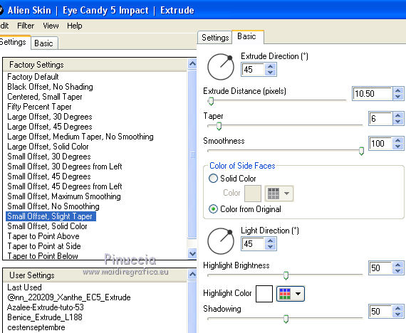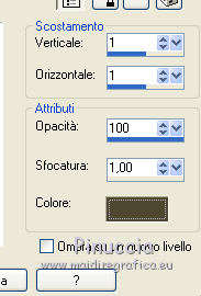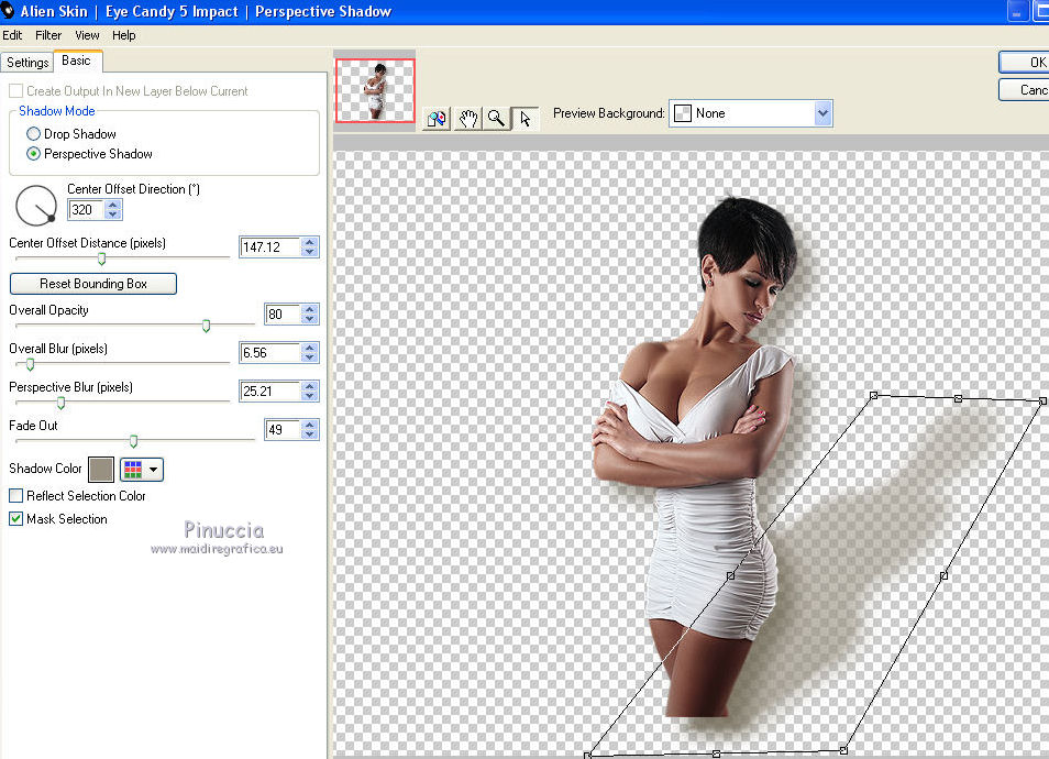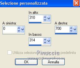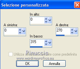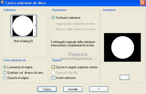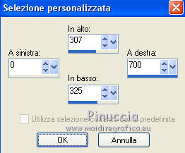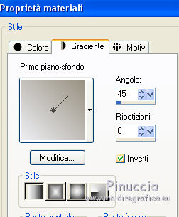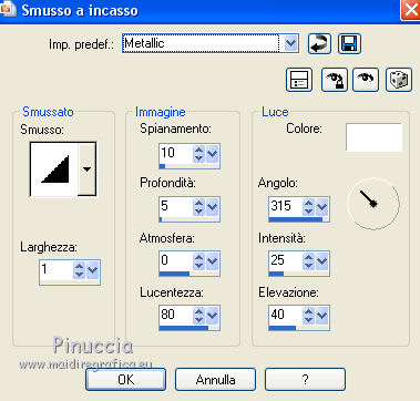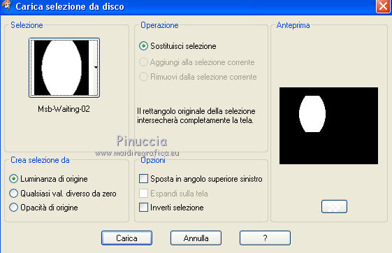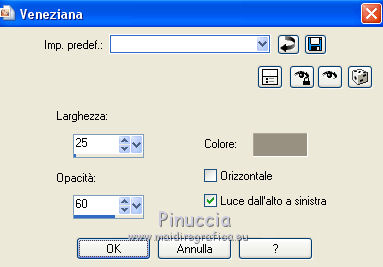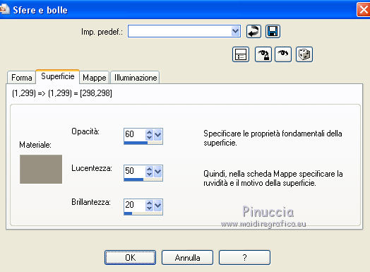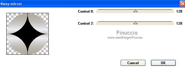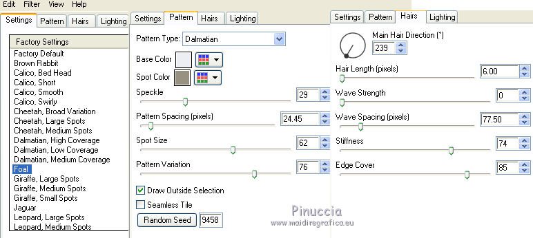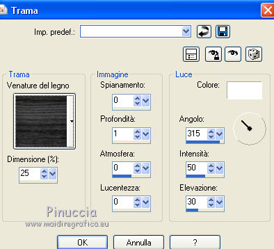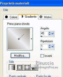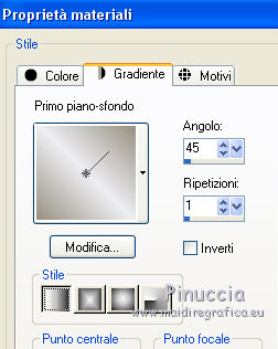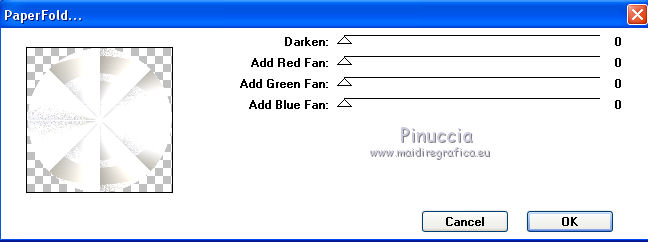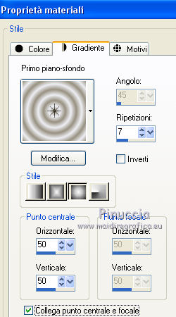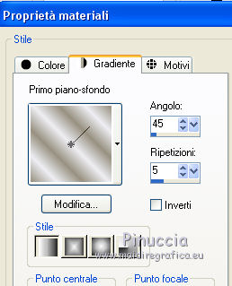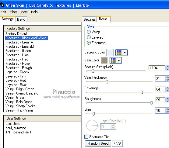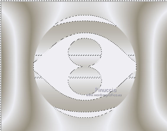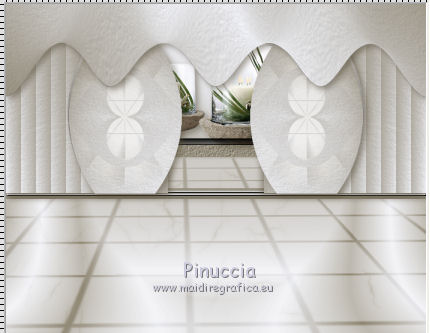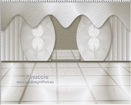 qui puoi trovare qualche risposta ai tuoi dubbi. Se l'argomento che ti interessa non è presente, ti prego di segnalarmelo. Questo tutorial è una creazione ©Meetjesplekje e non può essere copiato su altri siti nè essere offerto per il download. Lo stesso vale per la mia traduzione. Il materiale viene da vari gruppi di condivisione. Il copyright appartiene ai rispettivi autori. Grazie ai creatori dei tubes che mettono a disposizione il loro lavoro in vari gruppi di condivisione. Per tradurre questo tutorial ho usato CorelX, ma può essere realizzato anche con le altre versioni di PSP. Dalla versione X4, il comando Immagine>Rifletti è stato sostituito con Immagine>Capovolgi in orizzontale, e il comando Immagine>Capovolgi con Immagine>Capovolgi in verticale. Nelle versioni X5 e X6, le funzioni sono state migliorate rendendo disponibile il menu Oggetti. Vedi la scheda sull'argomento qui Occorrente: Materiale qui Per i tubes utilizzati grazie Maxyran. Filtri: consulta, se necessario, la mia sezione filtri qui Filters Unlimited 2.0 qui RCS Filterpak 1.0 - RCS Digi-lens Atomic Split qui Scribe- 3way mirror, Doghnuts, Partical qui Two Moon - Paper Fold qui Alien Skin Eye Candy 5 Impact - Extrude, Perspective Shadow qui Alien Skin Eye Candy 5 Texture - Marble, Animal Fur qui AAA Frames - Foto Frame qui Graphics Plus - Cross Shadow qui I filtri RCS, Scribe, Graphics Plus e Two Moon, si possono usare da soli o importati in Filters Unlimited (come fare vedi qui) Se un filtro fornito appare con questa icona ![]() Se stai usando altri colori puoi sperimentare le modalità di miscelatura e le opacità più adatte ai tuoi colori. Apri i font e minimizzali. Li troverai nella lista dei font disponibili quando ti serviranno. Con i nuovi sistemi operativi questo non è più possibile. Per usare un font, occorre copiarlo nella cartella Font di Windows. Metti il preset Cliccando sul file una o due volte (a seconda delle tue impostazioni), automaticamente il preset si installerà nella cartella corretta. perchè uno o due clic vedi qui Le trame Houtnerf, Kleine stenen e Forrel fijn bewolkt corrispondono alle trame standard di PSP Venature del legno, Pietruzze e Grana fine nuvoloso. Se non le trovi nel tuo PSP, metti quelle fornite nella cartella Trame. Metti la maschera 20.20 nella cartella Maschere. Metti il preset Preset_InnerBevel_Metallic nella cartella Impostazioni predefinite. Metti le selezioni nella cartella Selezioni. Apri la maschera sg_perspective-flooring in PSP e minimizzala con il resto del materiale. 1. Imposta il colore di primo piano con #989181, e il colore di sfondo con #edeef3. ![]() Passa il colore di primo piano a Gradiente di primo piano/sfondo, stile Lineare. ![]() 2. Apri una nuova immagine trasparente 700 x 550 pixels, e riempila con il gradiente.Regola>Sfocatura>Sfocatura gaussiana - raggio 25. ![]() Cambia i settaggi del gradiente in stile Sprazzo di luce. ![]() 3. Livelli>Nuovo livello raster. Riempi con il gradiente.Effetti>Plugins>RCS Filterpak 1.0 - RCS Digi-lens Atomic Split. ![]() Selezione>Carica/salva selezione>Carica selezione da disco. Cerca e carica la selezione Msb-Waiting-01. ![]() Modifica>Copia. 4. Livelli>Nuovo livello raster. Modifica>Incolla nella selezione. Effetti>Plugins>Scribe - 4way mirror, con i settaggi standard. ![]() Effetti>Plugins>Scribe - Doughnutz. ![]() Selezione>Deseleziona. Attiva lo strumento Bacchetta magica ![]() ![]() e clicca nelle parti bianche per selezionarle. ![]() Effetti>Plugins>Scribe - Partical. ![]() Selezione>Inverti. Selezione>Mobile. Selezione>Immobilizza. Effetti>Plugins>Two Moon - Paper Fold. ![]() Selezione>Deseleziona. Modifica>Copia. Modifica>Incolla come nuova immagine, salva l'immagine in PSP per precauzione, e minimizzala. La userai più tardi. Torna al tuo lavoro, ed elimina il livello. 5. Livelli>Nuovo livello raster. Cambia nuovamente i settaggi del gradiente, in stile Lineare. ![]() Selezione>Carica/salva selezione>Carica selezione da disco. Cerca e carica la selezione Msb-Waiting-02. ![]() Riempi con il gradiente.Effetti>Effetti di trama>Trama - seleziona la trama Grana fine nuvoloso, con i seguenti settaggi. ![]() Livelli>Nuovo livello raster. Apri l'immagine che hai minimizzato al punto precedente. ![]() Duplicala usando la combinazione di tasti maiuscola+D, minimizza l'originale che userai più tardi e lavora sulla copia. Livelli>Carica/Salva maschera>Carica maschera da disco. Cerca e carica la maschera 20-20. ![]() Livelli>Unisci>Unisci gruppo. Modifica>Copia. Torna al tuo lavoro e vai a Modifica>Incolla nella selezione. Abbassa l'opacità di questo livello al 70%. Selezione>Deseleziona. Livelli>Unisci>Unisci giù. Effetti>Plugins>Alien Skin Eye Candy 5 Impact - Extrude. Settings: Small Offset Slight Taper. Basic: ![]() Effetti>Effetti di immagine>Scostamento. ![]() Livelli>Duplica. Immagine>Rifletti. Livelli>Unisci>Unisci giù. Effetti>Effetti 3D>Sfalsa ombra, colore #504732. ![]() 6. Livelli>Nuovo livello raster. Attiva lo strumento Selezione , rettangolo, sfumatura 10,e traccia una selezione come nell'esempio. ![]() Effetti>Plugins>Alien Skin Eye Candy 5 Texture - Marble. Settings: Fractured Black and White Basic: bedrock color colore di sfondo; vein color colore di primo piano. ![]() Selezione>Deseleziona. Livelli>Nuovo livello maschera>Da immagine. Apri il menu sotto la finestra di origine e vedrai la lista dei files aperti. Seleziona la maschera sg_perspective-flooring, con i seguenti settaggi. ![]() Livelli>Unisci>Unisci gruppo. Livelli>Disponi>Sposta giù. Effetti>Effetti 3D>Sfalsa ombra, colore #504732. ![]() Cambia la modalità di miscelatura di questo livello in Luce diffusa. Attiva nuovamente il livello superiore. 7. Livelli>Nuovo livello raster. Attiva nuovamente lo strumento Selezione , rettangolo, sfumatura 0,e traccia una selezione come nell'esempio. ![]() Riporta il colore di primo piano a Colore, e riempi la selezione con il colore di primo piano.Effetti>Effetti di trama>Trama - seleziona la t