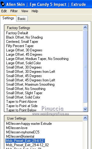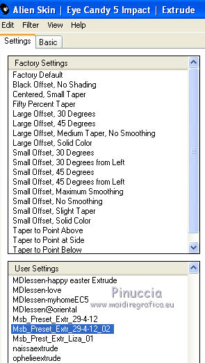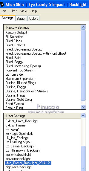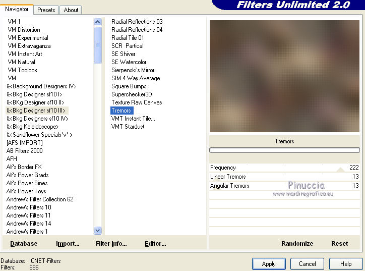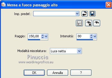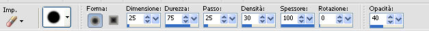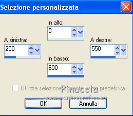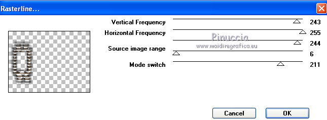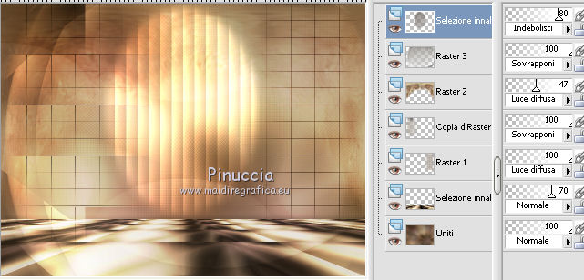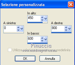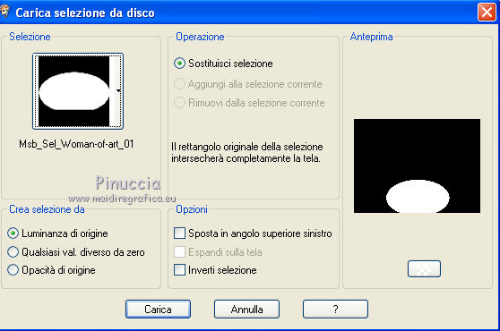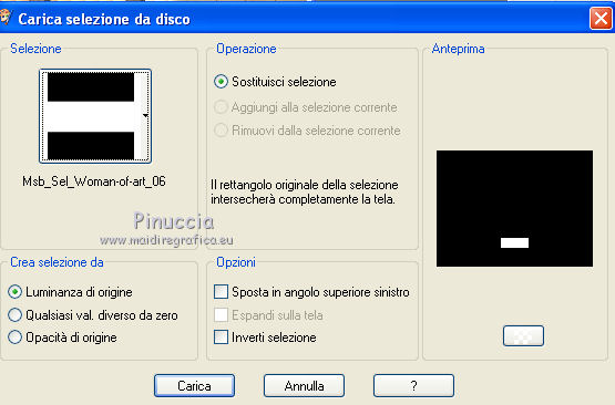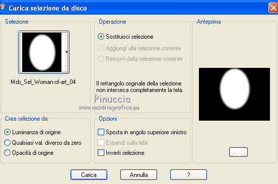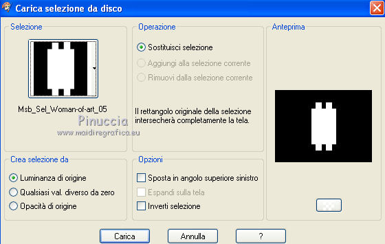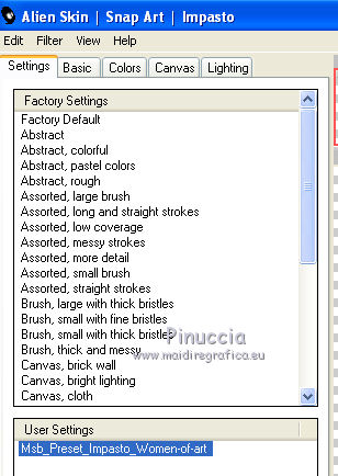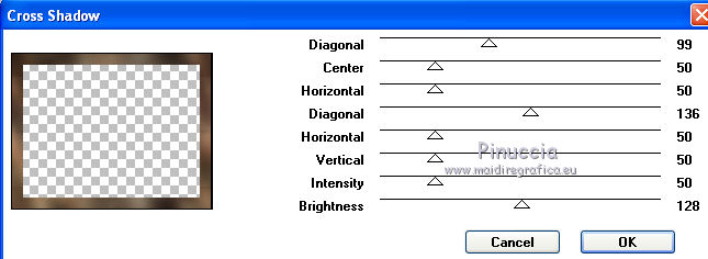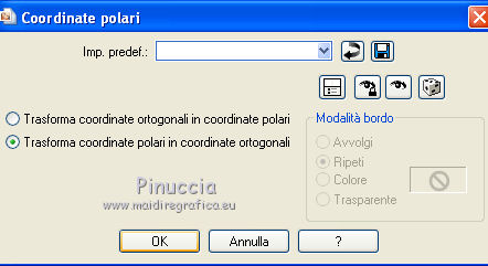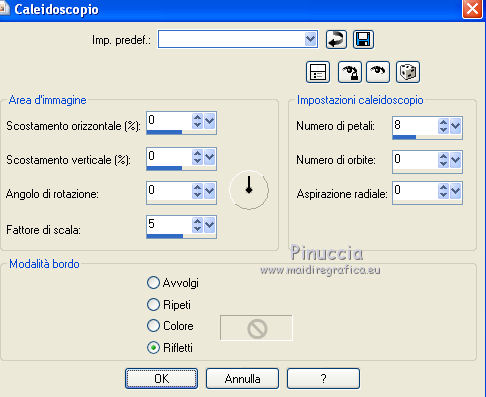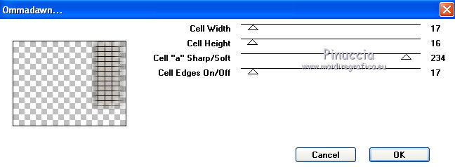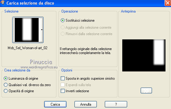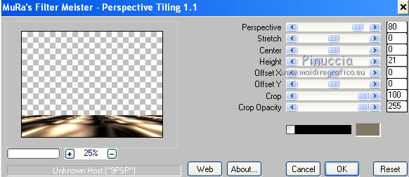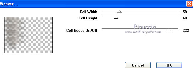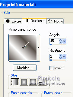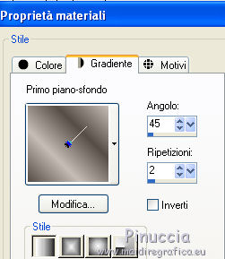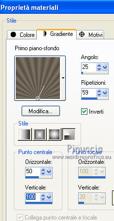 qui puoi trovare qualche risposta ai tuoi dubbi. Se l'argomento che ti interessa non è presente, ti prego di segnalarmelo. Per tradurre questo tutorial ho usato PSP X. Questo tutorial è una creazione ©Meetjesplekje e non può essere copiato su altri siti nè essere offerto per il download. Lo stesso vale per la mia traduzione. Il materiale viene da vari gruppi di condivisione. Il copyright appartiene ai rispettivi autori. Grazie ai creatori dei tubes che mettono a disposizione il loro lavoro in vari gruppi di condivisione. Occorrente: Materiale qui Per i bei tube grazie Athenais e Gina Filtri: consulta, se necessario, la mia sezione filtri qui Alien Skin Eye Candy 5 Impact qui Alien Skin Eye Candy Snap qui Filters Unlimited 2.0 qui &<BKG Designer sf10III> - Tremors qui Mura's Meister - Perspective Tiling qui Toadies - Ommadawn/Weaver/Rasterline qui Graphics Plus - Cross Shadow qui ![]() Apri il font e minimizzalo. Lo troverai nella lista dei font disponibili, quando ti servirà. Metti le selezioni nella cartella Selezioni. 1. Imposta il colore di primo piano #564d46, e il colore di sfondo con #817765. Passa il colore di primo piano a Gradiente, stile Radiale, con i seguenti settaggi. ![]() Apri una nuova immagine trasparente 800 x 600 pixels, e riempila con il gradiente.Selezione>Seleziona tutto. Apri il tube Athe-FM152 e vai a Modifica>Copia. non chiuderlo perchè ti servirà ancora. Torna al tuo lavoro e vai a Modifica>Incolla nella selezione. Selezione>Deseleziona. Effetti>Effetti di immagine>Motivo unico, con i settaggi standard. ![]() Regola>Sfocatura>Sfocatura gaussiana - raggio 50. ![]() 2. Livelli>Duplica. Effetti>Plugins>Filters Unlimited 2.0 - &<Bkg Designer sf10III> - Tremors, con i settaggi standard. ![]() Regola>Messa a fuoco>Messa a fuoco passaggio alto. ![]() Se il tuo PSP non ha questo effetto, copia e incolla come nuovo livello "Msb Background Highpass" che trovi nel materiale. Se non visualizzi i righelli, vai a Visualizza>Righelli. Sposta il livello in basso a destra,a 370 pixels di larghezza e 300 pixels di altezza. ![]() Effetti>Effetti di riflesso>Caleidoscopio. ![]() Cambia la modalità di miscelatura di questo livello in Luce diffusa. 3. Livelli>Nuovo livello raster. Selezione>Carica/Salva selezione>Carica selezione da disco. Cerca e carica la selezione Msb_Sel_Women_of_art_01. ![]() Riempi con il gradiente.Regola>Sfocatura>Sfocatura gaussiana - raggio 8. ![]() Selezione>Deseleziona. Livelli>Duplica. Immagine>Capovolgi. Livelli>Unisci>Unisci giù. Effetti>Effetti di immagine>Motivo unico. ![]() Cambia la modalità di miscelatura di questo livello in Filtra, e abbassa l'opacità al 20%. Livelli>Unisci>Unisci visibile. Fai una copia del lavoro usando la combinazione di tasti maiuscola+D, e minimizzala (ti servirà per i bordi). Continua sull'originale. 4. Attiva lo strumento Selezione ,clicca sull'icona Selezione personalizzata ![]() e imposta i seguenti settaggi: ![]() Selezione>Innalza selezione a livello. Selezione>Deseleziona. Effetti>Effetti di trama>Arenaria. ![]() Effetti>Plugins>Mura's Meister - Perspective Tiling. ![]() Effetti>Effetti 3D>Sfalsa ombra, con il colore nero. ![]() Abbassa l'opacità di questo livello al 70%. 5. Livelli>Nuovo livello raster. Selezione>Carica/Salva selezione>Carica selezione da disco. Cerca e carica la selezione Msb_Sel_Women_of_art_02. ![]() Imposta il colore di primo piano con #c5bdb5. Riempi la selezione con il colore di primo piano #c5bdb5.Selezione>Deseleziona. Effetti>Plugins>Toadies - Ommadawn, con i settaggi standard. ![]() Cambia la modalità di miscelatura di questo livello in Luce diffusa. Livelli>Duplica. Immagine>Rifletti. Effetti>Plugins>Toadies - Weaver, con i settaggi standard. ![]() Cambia la modalità di miscelatura di questo livello in Sovrapponi. 6. Apri il motivo Msb_Pattern_29-4-12 e minimizzalo. Passa il colore di primo piano a Motivi, cercalo nella categoria Immagini aperte e imposta i seguenti settaggi. ![]() Livelli>Nuovo livello raster. Selezione>Carica/Salva selezione>Carica selezione da disco. Cerca e carica la selezione Msb_Sel_Women_of_art_03. ![]() Riempi con il motivo di primo piano.Selezione>Deseleziona. Effetti>Effetti di distorsione>Coordinate polari. ![]() Cambia la modalità di miscelatura di questo livello in Luce diffusa, e abbassa l'opacità al 47%. 7. Imposta il colore di primo piano con #564d46, e il colore di sfondo con il colore bianco #ffffff. Passa il colore di primo piano a Gradiente, stile Lineare, con i seguenti settaggi. ![]() Livelli>Nuovo livello raster. Selezione personalizzata ![]() ![]() Riempi la selezione con il gradiente.Selezione>Modifica>Sfuma - 25 pixels. Selezione>Inverti. Premi un paio di volte la tastiera sul tasto CANC. Selezione>Deseleziona. Effetti>Plugins>Toadies - Weaver, con i settaggi standard. Effetti>Effetti di distorsione>Distorsione. ![]() Cambia la modalità di miscelatura di questo livello in Sovrapponi. ![]() ![]() 8. Livelli>Nuovo livello raster. Selezione>Carica/Salva selezione>Carica selezione da disco. Cerca e carica la selezione Msb_Sel_Women_of_art_04. ![]() Selezione>Innalza selezione a livello. Selezione>Deseleziona. Effetti>Effetti di trama>Veneziana - colore #564d46. ![]() Cambia la modalità di miscelatura di questo livello in Indebolisci, e abbassa l'opacità all'80%. ![]() 9. Livelli>Nuovo livello raster. Selezione>Carica/Salva selezione>Carica selezione da disco. Cerca e carica la selezione Msb_Sel_Women_of_art_05. ![]() Riporta il colore di primo piano a Colore: apri il menu della paletta e clicca su Colore per impostarlo. ![]() Riempi con il colore di primo piano.Selezione>Modifica>Contrai - 2 pixels. Di nuovo apri il menu della palettina e seleziona Motivi ![]() Riempi la selezione con il motivo.Modifica>Contrai - 25 pixels. Imposta di nuovo il colore di primo piano, e riempi la selezione con il colore di primo piano.Selezione>Modifica>Contrai - 2 pixels. Premi sulla tastiera il tasto CANC. Selezione>Deseleziona. Effetti>Plugins>Al