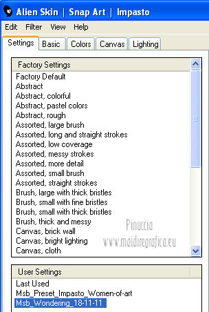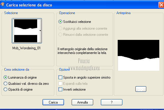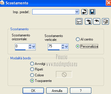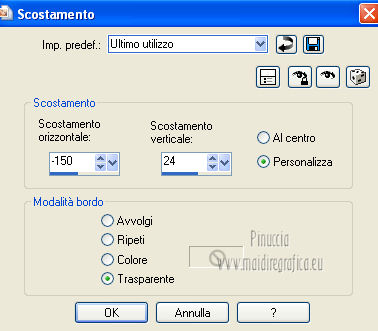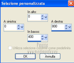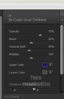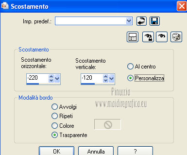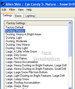 qui puoi trovare qualche risposta ai tuoi dubbi. Se l'argomento che ti interessa non è presente, ti prego di segnalarmelo. Questo tutorial è una creazione ©Meetjesplekje e non può essere copiato su altri siti nè essere offerto per il download. Lo stesso vale per la mia traduzione. Il materiale viene da vari gruppi di condivisione. Il copyright appartiene ai rispettivi autori. Grazie ai creatori dei tubes che mettono a disposizione il loro lavoro in vari gruppi di condivisione. Il tutorial è stato creato con PSP X3, ma può essere eseguito anche con le altre versioni di PSP. Per tradurre questo tutorial ho usato PSP X. Occorrente: Materiale qui I tubes sono di Kikirou, Sissy e Angie. Gli elementi scrap sono di Bluedreamdesigns e Romiposer Filtri: consulta, se necessario, la mia sezione filtri qui Filters Unlimited 2.0 qui Alien Skin Snap Art - Impasto qui Alien Skin Eye Candy 5 Nature - Snow Drift qui Nik Software - Color Efex Pro qui Graphics Plus - Cross Shadow qui ![]() Apri il font e minimizzalo. Lo troverai nella lista dei font disponibili quando ti servirà. Metti il preset nella cartella del filtro Alien Skin Snap Art. Cliccando sul file una o due volte (a seconda delle tue impostazioni), automaticamente il preset si installerà nella cartella corretta. Ti servirà anche la maschera 20-20 Metti la maschera nella cartella Maschere. Imposta il colore di primo piano con #4e4439, e il colore di sfondo con #f9fbfc. 1. Apri una nuova immagine trasparente 800 x 600 pixels, e riempila con il colore di primo piano.Attiva lo strumento Selezione ,clicca sull'icona Selezione personalizzata ![]() e imposta i seguenti settaggi: ![]() Selezione>Innalza selezione a livello. Effetti>Plugins>Render - Clouds(fore-/background color), con i settaggi standard. ![]() Selezione>Deseleziona. 2. Livelli>Nuovo livello raster. Selezione>Seleziona tutto. Apri l'immagine di sfondo background-santasleigh. Livelli>Carica/Salva maschera>Carica maschera da disco. Cerca e carica la maschera 20-20, con i seguenti settaggi. ![]() Livelli>Unisci>Unisci gruppo. Modifica>Copia, e chiudi l'immagine senza salvare le modifiche. Torna al tuo lavoro e vai a Modifica>Incolla nella selezione. Selezione>Deseleziona. Effetti>Effetti di immagine>Scostamento. ![]() Regola>Tonalità e Saturazione>Viraggio. ![]() Livelli>Duplica. Immagine>Rifletti. Abbassa l'opacità di questo livello al 60%. Livelli>Unisci>Unisci giù. 3. Selezione>Carica/Salva selezione>Carica selezione da disco. Cerca e carica la selezione Msb_Wondering_01. ![]() Apri lo sfondo BD-SnowBlue-Paper11 e vai a Modifica>Copia. Torna al tuo lavoro e vai a Modifica>Incolla nella selezione. Selezione>Deseleziona. Effetti>Plugins>Alien Skin Snap Art - Impasto, seleziona il preset Msb_Wondering_18-11-11 e ok. ![]() Effetti>Effetti 3D>Sfalsa ombra, con il colore #2b2723. ![]() 4. Apri il tube BD-SnowBlue-Fence1 e vai a Modifica>Copia. Torna al tuo lavoro e vai a Modifica>Incolla come nuovo livello. Immagine>Ridimensiona, 2 volte al 65%, tutti i livelli non selezionato. Effetti>Effetti di immagine>Scostamento. ![]() Regola>Tonalità e Saturazione>Viraggio, con i settaggi precedenti. ![]() Effetti>Plugins>Nik Software - Color Efex 3.0 - Bi-Color User Defined. Cambia Lower Color con #4e4439 e imposta Opacity a 70. ![]() Effetti>Effetti 3D>Sfalsa ombra, con il colore #2b2723. ![]() Effetti>Plugins>Alien Skin Eye Candy 5 Nature - Snow Drift. Seleziona il preset Dusting,Heavy e ok. ![]() Livelli>Disponi>Sposta giù. 5. Apri il tube Ani-J2008-002 e vai a Modifica>Copia. Torna al tuo lavoro e vai a Modifica>Incolla come nuovo livello. Immagine>Ridimensiona, al 45%, tutti i livelli non selezionato. Effetti>Effetti di immagine>Scostamento. ![]() Regola>Tonalità e Saturazione>Viraggio, con i settaggi precedenti. ![]() Effetti>Effetti 3D>Sfalsa ombra, con il colore #2b2723. ![]() Abbassa l'opacità di questo livello all'80%. Regola>Messa a fuoco>Metti a fuoco. Livelli>Disponi>Sposta giù. Attiva il livello superiore. 6. Apri il tube R11 – Winter Time 3 – 042 e vai a Modifica>Copia. Torna al tuo lavoro e vai a Modifica>Incolla come nuovo livello. Effetti>Effetti di immagine>Scostamento. ![]() Regola>Tonalità e Saturazione>Viraggio, con i settaggi precedenti. Livelli>Duplica. Immagine>Rifletti. Effetti>Effetti di immagine>Scostamento. ![]() Livelli>Duplica. Immagine>Ridimensiona, al 50%, tutti i livelli non selezionato. Effetti>Effetti di immagine>Scostamento. ![]() Livelli>Disponi>Sposta giù - 2 volte. Attiva il livello superiore. Livelli>Unisci>Unisci giù - 2 volte. Effetti>Effetti 3D>Sfalsa ombra, con il colore #2b2723. ![]() 7. Apri il tube tree e vai a Modifica>Copia. Torna al tuo lavoro e vai a Modifica>Incolla come nuovo livello. Immagine>Ridimensiona, al 90%, tutti i livelli non selezionato. Effetti>Effetti di immagine>Scostamento. ![]() Regola>Tonalità e Saturazione>Viraggio, con i settaggi precedenti. Effetti>Effetti 3D>Sfalsa ombra, con il colore #2b2723. ![]() Livelli>Duplica. Immagine>Ridimensiona, al 65%, tutti i livelli non selezionato. Effetti>Effetti di immagine>Scostamento. ![]() Effetti>Effetti 3D>Sfalsa ombra, con il colore #2b2723. ![]() 8. Apri il tube snowman e vai a Modifica>Copia. Torna al tuo lavoro e vai a Modifica>Incolla come nuovo livello. Effetti>Effetti di immagine>Scostamento. ![]() Regola>Tonalità e Saturazione>Viraggio, con i settaggi precedenti. Effetti>Effetti 3D>Sfalsa ombra, con il colore #2b2723. ![]() Effetti>Plugins>Nik Software - Color Efex Pro, con i settaggi precedenti. 9. Apri il tube Sissy_hertjes e vai a Modifica>Copia. Torna al tuo lavoro e vai a Modifica>Incolla come nuovo livello. Immagine>Ridimensiona, al 65%, tutti i livelli non selezionato. Effetti>Effetti di immagine>Scostamento. ![]() Regola>Tonalità e Saturazione>Viraggio, con i settaggi precedenti. Effetti>Effetti 3D>Sfalsa ombra, con il colore #2b2723. ![]() Effetti>Plugins>Nik Software - Color Efex Pro, Bi-Color User Defined. Mantieni Lower Color #4e4439 e abbassa
