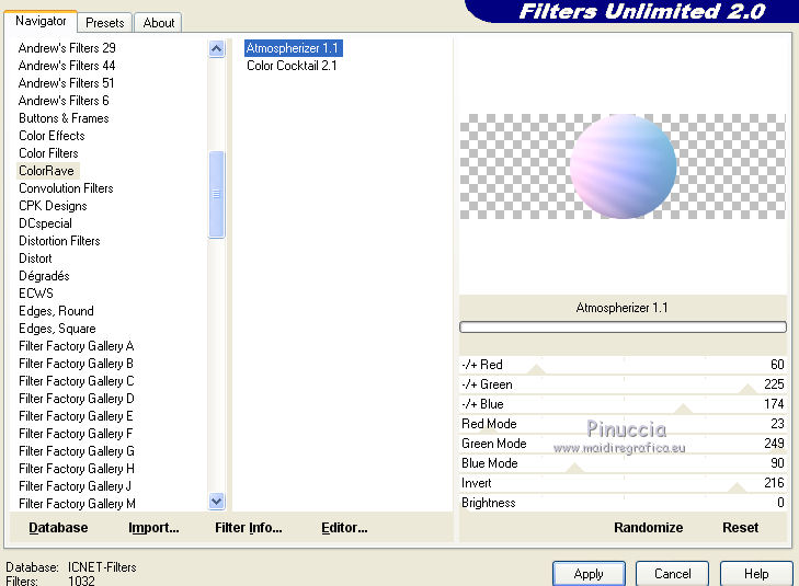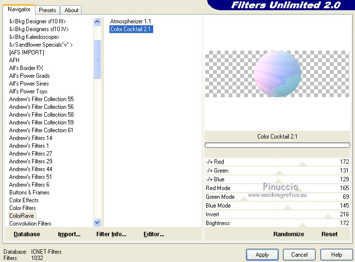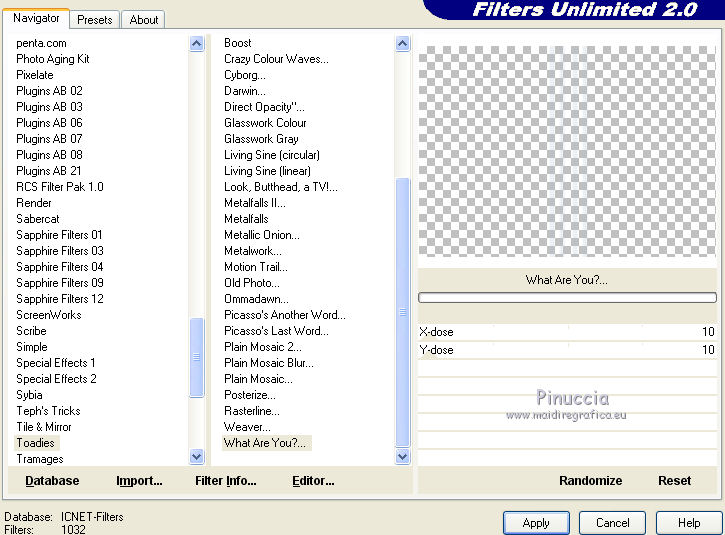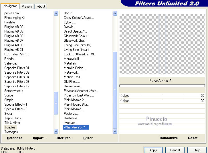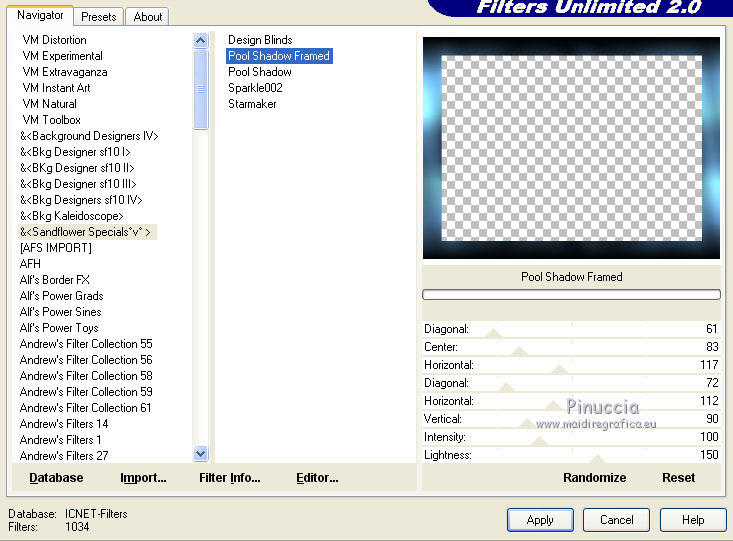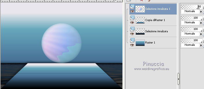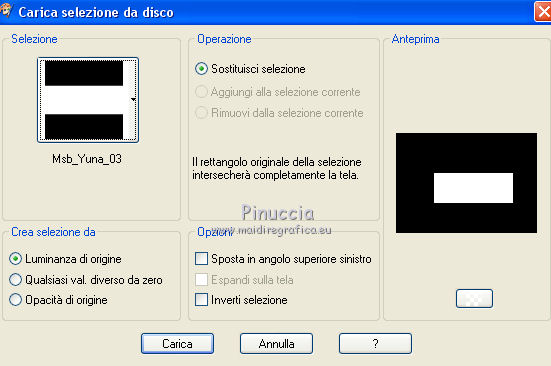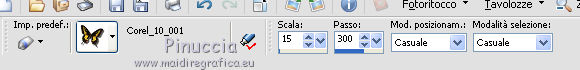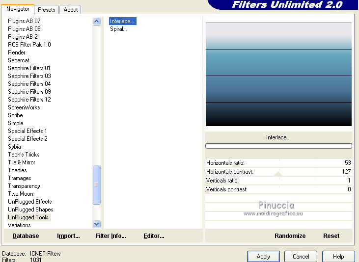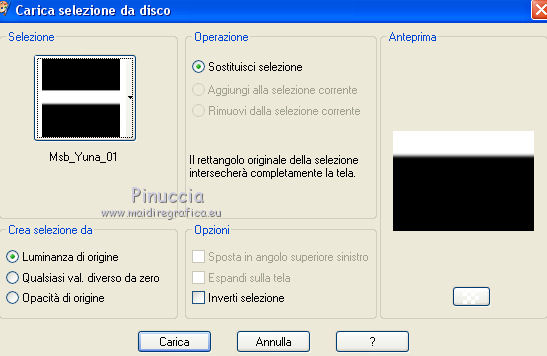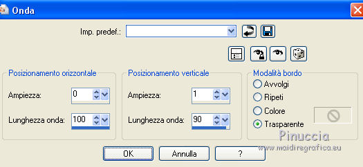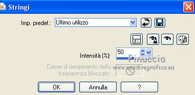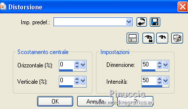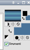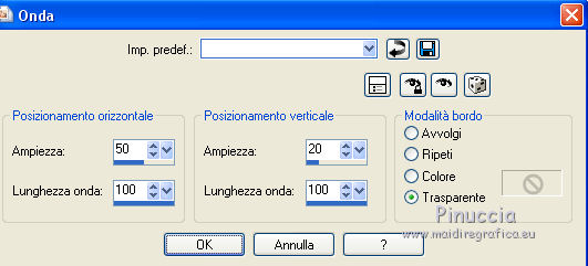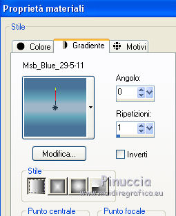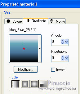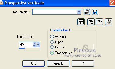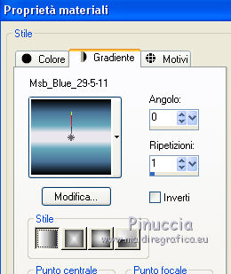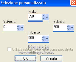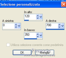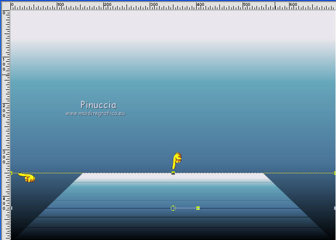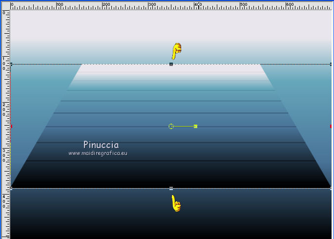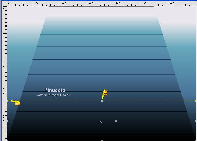 qui puoi trovare qualche risposta ai tuoi dubbi. Se l'argomento che ti interessa non è presente, ti prego di segnalarmelo. Questo tutorial è una creazione ©Meetjesplekje e non può essere copiato su altri siti nè essere offerto per il download. Lo stesso vale per la mia traduzione. Il materiale viene da vari gruppi di condivisione. Il copyright appartiene ai rispettivi autori. Grazie ai creatori dei tubes che mettono a disposizione il loro lavoro in vari gruppi di condivisione. Per tradurre questo tutorial ho usato CorelX, ma può essere realizzato anche con le altre versioni di PSP. Dalla versione X4, il comando Immagine>Rifletti è stato sostituito con Immagine>Capovolgi in orizzontale, e il comando Immagine>Capovolgi con Immagine>Capovolgi in verticale. Nelle versioni X5 e X6, le funzioni sono state migliorate rendendo disponibile il menu Oggetti. Vedi la scheda sull'argomento qui Occorrente: Materiale qui Per i tubes utilizzati grazie Annelies , Verocreations e Azyzam. Filtri: consulta, se necessario, la mia sezione filtri qui Filters Unlimited 2.0 qui &<Bkg Designer sf10IV> - Starmaker... (da importare in Unlimited) qui Color Rave - Atmospherizer 1.1 qui Color Rave - Color Cocktail qui Sandflowers Special - Pool Shadow Framed qui Flaming Pear - Flexify 2 qui Flaming Pear - Flood qui Toadies - What are you qui Mura's Meister - Copies qui Unplugged Tools - Interlace qui I filtri Toadies, Color Rave, Unplugged Tools, si possono usare da soli o importati in Filters Unlimited (come fare vedi qui) Se un filtro fornito appare con questa icona ![]() Se stai usando altri colori puoi sperimentare le modalità di miscelatura e le opacità più adatte ai tuoi colori. Apri il font e minimizzalo. Lo troverai nella lista dei font disponibili quando ti servirà. Con i nuovi sistemi operativi questo non è più possibile. Per usare un font, occorre copiarlo nella cartella Font di Windows. Metti il gradiente nella cartella Gradienti. Metti la maschera nella cartella Maschere. Metti l'ornamento Corel_10_001 nella cartella Ornamenti. Metti le selezioni nella cartella Selezioni. Imposta il colore di primo piano con il colore nero #000000, e il colore di sfondo con #e9e7ec. ![]() Passa il colore di primo piano a Gradiente, e seleziona il gradiente Msb_Blue_29-5-11, con i seguenti settaggi. ![]() 1. Apri una nuova immagine trasparente 700 x 500 pixels, e riempila con il gradiente.Livelli>Duplica. Effetti>Plugins>Filters Unlimited 2.0 - Unplugged Tools - Interlace. ![]() Effetti>Effetti geometrici>Prospettiva verticale. ![]() Premi il tasto K per attivare lo strumento Puntatore ![]() se stai usando PSP 9 il tasto D per attivare lo strumento Deformazione ![]() in modalità Scala, spingi il nodo superiore centrale verso il basso fino a 350 pixels, (se non visualizzi i Righelli, vai a Visualizza>Righelli) ![]() Come puoi vedere sopra con questa operazione le righe create dal filtro Interlace sono meno visibili. ![]() Per avere le righe meglio definite, puoi procedere così. Prima spingi entrambi i nodi in alto e in basso per ridurre l'immagine in altezza. In questo modo le linee resteranno ben visibili. ![]() Quindi sposta l'immagine sul bordo inferiore, e per finire, spingi il nodo centrale fino a 350 pixels. ![]() per il mio esempio ho apportato questa variante alla fine, per questo nelle prossime schermate vedrai le righe non ben definite Effetti>Effetti 3D>Sfalsa ombra, colore nero. ![]() Ripeti l'Effetto Sfalsa ombra, cambiando verticale e orizzontale con -5. 2. Attiva il livello inferiore. Attiva lo strumento Selezione ![]() clicca sull'icona Selezione personalizzata ![]() e imposta i seguenti settaggi. ![]() Selezione>Innalza selezione a livello. Effetti>Plugins>Filters Unlimited 2.0 - Unplugged Tools - Interlace, con i settaggi standard. ![]() Effetti>Plugins>Flaming Pear - Flood. ![]() Effetti>Effetti 3D>Sfalsa ombra, colore nero. ![]() Selezione>Deseleziona. 3. Attiva nuovamente il livello inferiore. Selezione personalizzata ![]() ![]() Selezione>Innalza selezione a livello. Livelli>Disponi>Porta in alto. Effetti>Plugins>Flaming Pear – Flexify 2. ![]() Effetti>Plugins>Filters Unlimited 2.0 - &<Bkg Designers sf10IV> - <Starmaker…>, con i settaggi standard. ![]() Effetti>Plugins>Filters Unlimited 2.0 – Color Rave – Atmospherizer 1.1, con i settaggi standard. ![]() Effetti>Plugins>Filters Unlimited 2.0 – Color Rave – Color Cocktail 2.1, con i settaggi standard. ![]() Selezione>Deseleziona. Selezione>Seleziona tutto. Selezione>Mobile. Selezione>Immobilizza. Selezione>Modifica>Sfuma - 20 pixels. Selezione>Inverti. Premi sulla tastiera il tasto CANC ![]() Selezione>Deseleziona. Abbassa l'opacità di questo livello all'80%. ![]() 4. Attiva nuovamente il livello inferiore. Selezione personalizzata , con i settaggi precedenti.![]() Selezione>Innalza selezione a livello. Livelli>Disponi>Porta in alto. Livelli>Disponi>Sposta giù. Effetti>Plugins>Flaming Pear - Flexify 2. ![]() Effetti>Effetti di illuminazione>Sprazzo di luce. ![]() Effetti>Plugins>Filters Unlimited 2.0 – Color Rave – Atmospherizer 1.1, con i settaggi standard. Effetti>Plugins>Filters Unlimited 2.0 – Color Rave – Color Cocktail 2.1, con i settaggi standard. Cambia la modalità di miscelatura di questo livello in Luce diffusa, e abbassa l'opacità all'85%. ![]() Selezione>Deseleziona. Livelli>Duplica. Effetti>Effetti di distorsione>Stringi (nelle versioni più recenti di PSP "Compressione"). ![]() Attiva il livello sottostante dell'originale. Effetti>Effetti di distorsione>Vento - da sinistra, intensità 100. ![]() Ripeti l'Effetto Vento, questa volta da destra. ![]() Attiva il livello soprastante della copia. Selezione>Seleziona tutto. Selezione>Mobile. Selezione>Immobilizza. Selezione>Modifica>Sfuma - 20 pixels. Selezione>Inverti. Premi sulla tastiera il tasto CANC ![]() Selezione>Deseleziona. Livelli>Unisci>Unisci giù. 5. Attiva il livello superiore. Livelli>Nuovo livello raster. Selezione personalizzata , con i sett