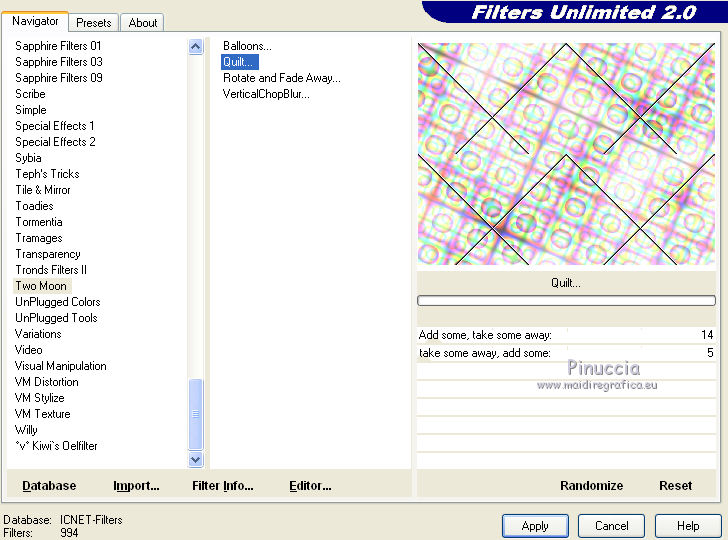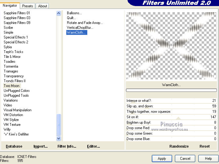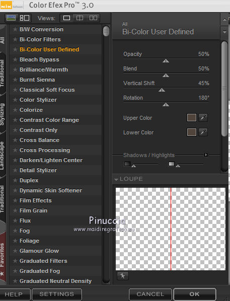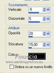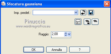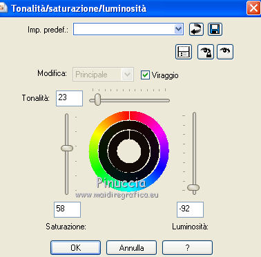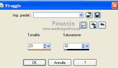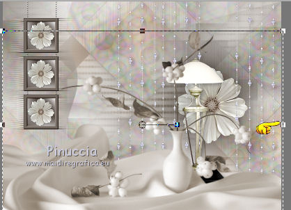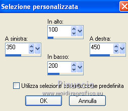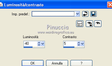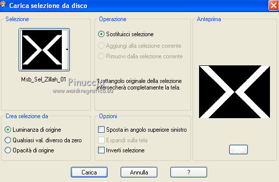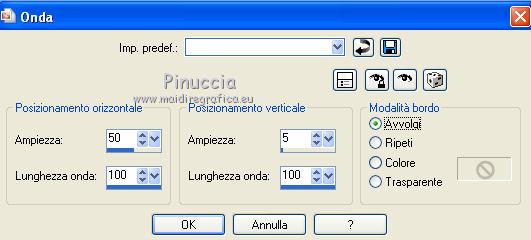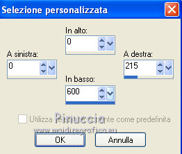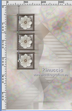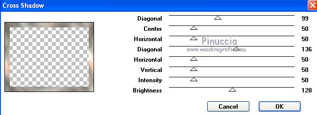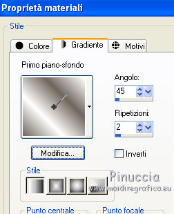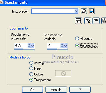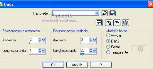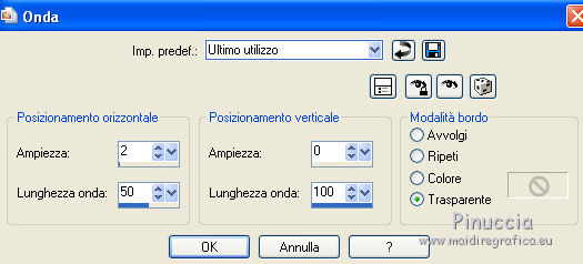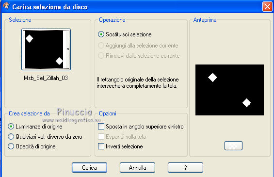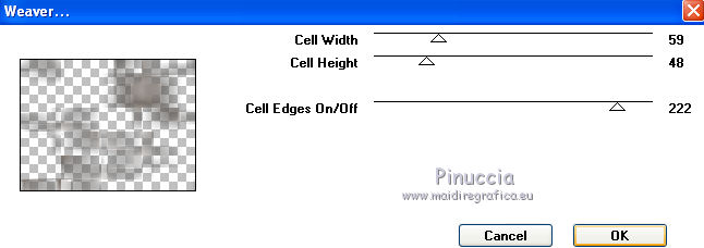 qui puoi trovare qualche risposta ai tuoi dubbi. Se l'argomento che ti interessa non è presente, ti prego di segnalarmelo. Per tradurre questo tutorial ho usato PSP X. Questo tutorial è una creazione ©Meetjesplekje e non può essere copiato su altri siti nè essere offerto per il download. Lo stesso vale per la mia traduzione. Il materiale viene da vari gruppi di condivisione. Il copyright appartiene ai rispettivi autori. Grazie ai creatori dei tubes che mettono a disposizione il loro lavoro in vari gruppi di condivisione. Occorrente: Materiale qui Il tube della donna è di Mary. Il tube del fiore è di Patries. Il secondo tube del fiore è di kTs. Il tube della lampada è di Claudia Viza. Grazie a tutti gli autori per i loro bellissimi tubes. Filtri: consulta, se necessario, la mia sezione filtri qui Bordermania - Frame#2 qui Graphics Plus - Cross Shadow qui Filters Unlimited 2.0 qui Two Moon qui Toadies - Weaver qui Nik Software - Color Efex Pro qui I filtri Toadies e Two Moon si possono usare da soli e anche importati in Unlimited. A volte si ottengono risultati differenti, ma è possibile riscontrarli soltanto "sul campo" ![]() Apri il font e minimizzalo. Lo troverai nella lista dei font disponibili quando ti servirà. Metti le selezioni nella cartella Selezioni. 1. Imposta il colore di primo piano con #a6a097, e il colore di sfondo con il bianco #ffffff. Passa il colore di primo piano a Gradiente, stile Sprazzo di luce, con i seguenti settaggi. ![]() Apri una nuova immagine trasparente 800 x 600 pixels, e riempila con il gradiente.Selezione>Seleziona tutto. Apri il tube Mary0412-12 e vai a Modifica>Copia. non chiuderlo perchè ti servirà ancora. Torna al tuo lavoro e vai a Modifica>Incolla nella selezione. Selezione>Deseleziona. Effetti>Effetti di immagine>Motivo unico, con i settaggi standard. ![]() Regola>Sfocatura>Sfocatura gaussiana - raggio 35. ![]() 2. Livelli>Duplica. Effetti>Plugins>Filters Unlimited 2.0 - Two Moon - Balloons. ![]() Cambia la modalità di miscelatura di questo livello in Luminanza (esistente), e abbassa l'opacità al 20%. Effetti>Plugins>Filters Unlimited 2.0 - Two Moon - Quilt. ![]() Fai una copia usando la combinazione di tasti maiuscola+D e mettila da parte (ti servirà per i bordi). Continua sull'originale. Livelli>Duplica. Immagine>Capovolgi. Livelli>Unisci>Unisci giù. se ti sembra che con questo comando il risultato "sbiadisca", chiudi il livello di sfondo e vai a Livelli>Unisci>Unisci visibile. 3. Livelli>Nuovo livello raster. Selezione>Carica/Salva selezione>Carica selezione da disco. Cerca e carica la selezione Msb_Sel_zillah01. ![]() Riempi la selezione con il gradiente.Regola>Sfocatura>Sfocatura gaussiana - raggio 10. ![]() Effetti>Plugins>Filters Unlimited 2.0 - Two Moon - Warm Cloth, con i settaggi standard. ![]() Cambia la modalità di miscelatura di questo livello in Luce diffusa. Attiva il livello sottostante e premi sulla tastiera il tasto CANC. Selezione>Deseleziona. 4. Livelli>Nuovo livello raster. Selezione>Carica/Salva selezione>Carica selezione da disco. Cerca e carica la selezione Msb_Sel_zillah02. ![]() Riempi la selezione con il gradiente.Regola>Sfocatura>Sfocatura gaussiana - raggio 10. ![]() Effetti>Effetti di trama>Veneziana - colore #413629. ![]() Effetti>Effetti di bordo>Aumenta. Selezione>Deseleziona. Selezione>Carica/Salva selezione>Carica selezione da disco. Cerca e carica la selezione Msb_Sel_zillah03. ![]() Premi sulla tastiera il tasto CANC. Selezione>Deseleziona. 5. Imposta il colore di primo piano con #70665e, e il colore di sfondo con il colore bianco #ffffff. Passa il colore di primo piano a Gradiente, stile Lineare. ![]() Livelli>Nuovo livello raster. Attiva lo strumento Selezione ,clicca sull'icona Selezione personalizzata ![]() e imposta i seguenti settaggi: ![]() Riempi la selezione con il colore di primo piano.Selezione>Deseleziona. Abbassa l'opacità di questo livello al 44%. Livelli>Duplica. Effetti>Effetti di distorsione>Onda. ![]() Attiva il livello sottostante dell'originale. Effetti>Effetti di distorsione>Onda. ![]() Abbassa l'opacità di questo livello al 22%. Livelli>Duplica. Effetti>Plugins>Toadies - Weaver, con i settaggi standard. ![]() Abbassa l'opacità di questo livello al 60%. Attiva nuovamente il livello superiore. Effetti>Effetti di immagine>Scostamento. ![]() 6. Apri il tube bloemen-2 e vai a Modifica>Copia. Torna al tuo lavoro e vai a Modifica>Incolla come nuovo livello. Immagine>Ridimensiona, al 45%, tutti i livelli non selezionato. Effetti>Effetti di immagine>Scostamento. ![]() Livelli>Duplica. Attiva il livello sottostante dell'originale. Regola>Tonalità e saturazione>Tonalità/Saturazione/Luminosità. ![]() Regola>Sfocatura>Sfocatura gaussiana - raggio 50. ![]() Attiva il livello superiore. Effetti>Plugins>Nik Software - Color Efex Pro Bi-Color User Defined - imposta entrambi i colori con #51453b. ![]() Regola>Messa a fuoco>Metti a fuoco. Livelli>Unisci>Unisci giù. Modifica>Copia. 7. Livelli>Nuovo livello raster. Selezione personalizzata ![]() ![]() Riempi la selezione con il colore di primo piano.Selezione>Modifica>Contrai - 10 pixels. Riporta il colore di primo piano a Gradiente, e riempi la selezione con il gradiente.Modifica>Incolla come nuovo livello. Immagine>Ridimensiona, al 37%, tutti i livelli non selezionato. Sposta il fiore nell'area selezionata.![]() Regola>Messa a fuoco>Metti a fuoco. Selezione>Inverti. Premi sulla tastiera il tasto CANC. Livelli>Unisci>Unisci giù. Selezione>Mobile. Selezione>Immobilizza. Effetti>Plugins>Bordermania - Frame#2. ![]() Selezione>Deseleziona. 8. Livelli>Duplica - 2 volte. Posiziona i tre quadretti uno sotto l'altro. Per uno spostamento correttamente in linea, ti consiglio di usare le frecce della tastiera. sull'uso delle frecce abbinato allo strumento Spostamento vedi qui Attiva il livello più alto dei tre quadretti. Livelli>Unisci>Unisci giù - 2 volte, per avere i tre quadretti su un unico livello. Livelli>Duplica. Effetti>Effetti di dist
