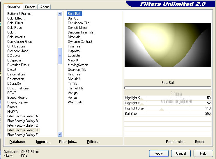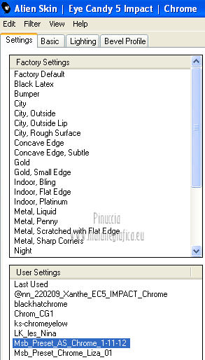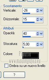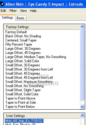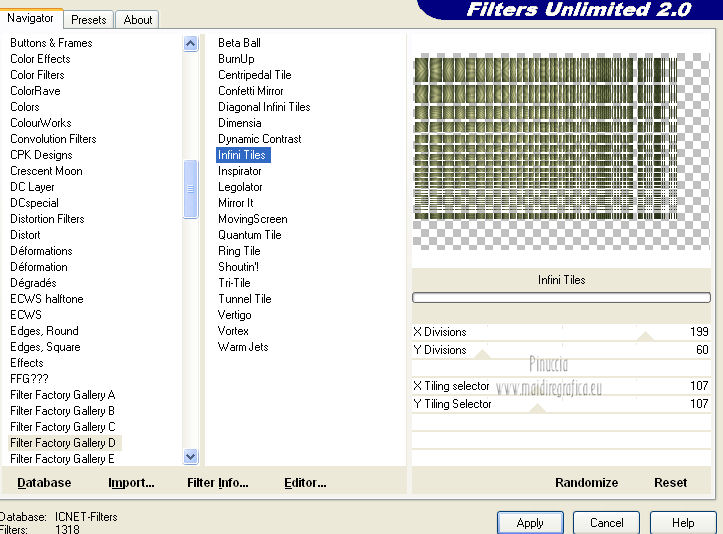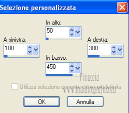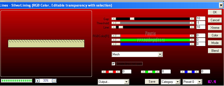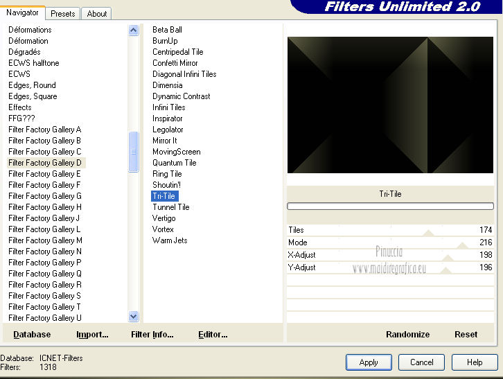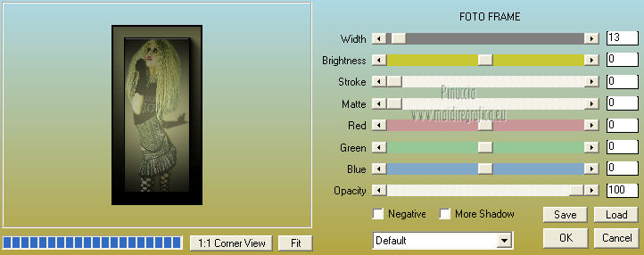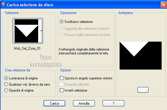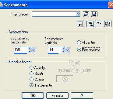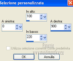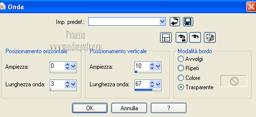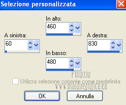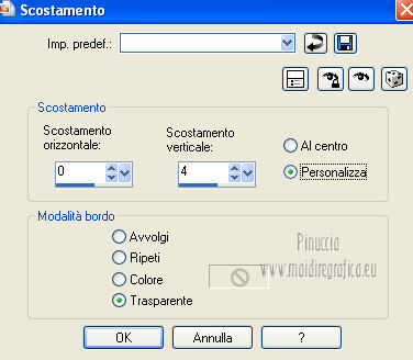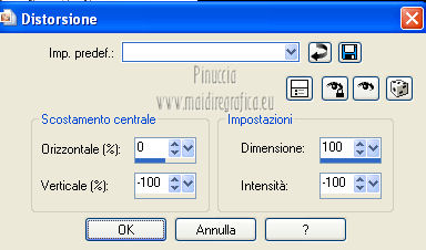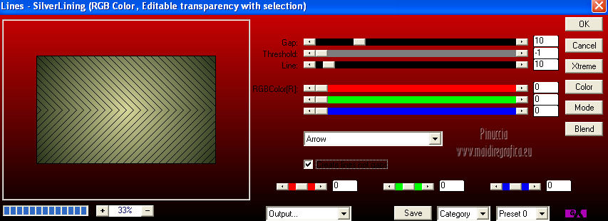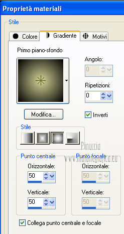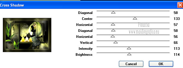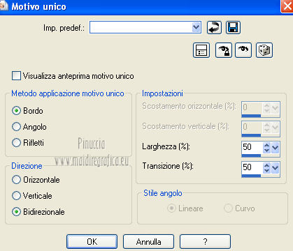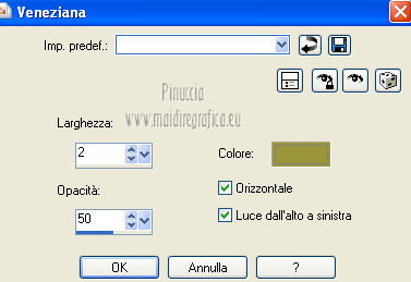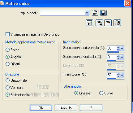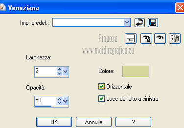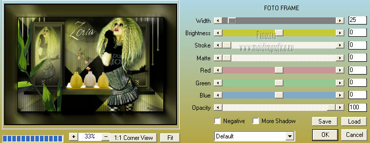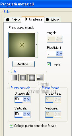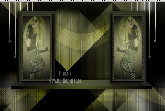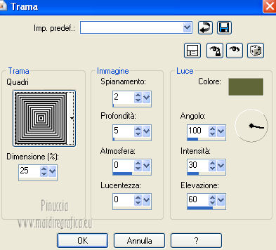 qui puoi trovare qualche risposta ai tuoi dubbi. Se l'argomento che ti interessa non è presente, ti prego di segnalarmelo. Questo tutorial è una creazione ©Meetjesplekje e non può essere copiato su altri siti nè essere offerto per il download. Lo stesso vale per la mia traduzione. Il materiale viene da vari gruppi di condivisione. Il copyright appartiene ai rispettivi autori. Grazie ai creatori dei tubes che mettono a disposizione il loro lavoro in vari gruppi di condivisione. Questo tutorial è stato creato con PSP X3. Per tradurlo ho usato PSP X. Occorrente: Materiale qui Per il tube della donna grazie Nurso53. Per il tube della pianta grazie Guismo Per il tube dei vasi grazie Nicole Filtri: consulta, se necessario, la mia sezione filtri qui Filters Unlimited 2.0 qui Filter Factory Gallery D qui Graphics Plus - Cross Shadow qui AAA Frames - Foto Frame qui Alien Skin Eye Candy 5 Impact qui AP 01 [Innovations] Lines - Lines SilverLining qui ![]() Se stai usando altri colori puoi sperimentare le modalità di miscelatura e le opacità più adatte ai tuoi colori. Metti il preset nella cartella del filtro Alien skin Eye Candy 5 Impact>Settings. Cliccando sul file una o due volte (a seconda delle tue impostazioni), automaticamente il preset si installerà nella cartella corretta. La trama Vierkanten corrisponde alla trama Quadri, standard nelle versioni meno recenti di PSP, e alla trama standard Corel_15_012 delle nuove versioni. Se non la trovi nel tuo PSP metti quella fornita nella cartella Trame. Metti le selezioni nella cartella Selezioni. Imposta il colore di primo piano con #000000 (nero), e il colore di sfondo con #d6d79a. Passa il colore di primo piano a Gradiente, stile Sprazzo di luce, con i seguenti settaggi. ![]() 1. Apri una nuova immagine trasparente 900 x 600 pixels, e riempila con il gradiente.Effetti>Plugins>Filters Unlimited 2.0 - Filter Factory Gallery D - Tri-Tile. ![]() 2. Livelli>Nuovo livello raster. Selezione>Carica/Salva selezione>Carica selezione da disco. Cerca e carica la selezione Msb_Sel_Zoria_01. ![]() Riempi la selezione con il colore di sfondo.Effetti>Plugins>Filters Unlimited 2.0 – Filter Factory D – Beta Ball, con i settaggi standard. ![]() Effetti>Effetti di trama>Veneziana, con il colore di primo piano. ![]() Selezione>Deseleziona. Livelli>Duplica. Immagine>Rifletti. Immagine>Capovolgi. Livelli>Unisci>Unisci giù. Effetti>Effetti di immagine>Motivo unico. ![]() Effetti>Effetti di immagine>Motivo unico. ![]() Cambia la modalità di miscelatura di questo livello in Filtra, e abbassa l'opacità al 65%. Effetti>Plugins>Graphic Plus – Cross Shadow - 2 volte con i settaggi standard. ![]() Livelli>Unisci>Unisci visibile. Fai una copia usando la combinazione di tasti maiuscola+D, e minimizza la copia che ti servirà più tardi. Torna al tuo lavoro originale. 3. Imposta il colore di primo piano con #293419, il colore di sfondo è sempre #d6d79a. Lascia impostato il Gradiente, con i settaggi precedenti, che cambierà tonalità. ![]() Livelli>Nuovo livello raster. Selezione>Seleziona tutto. Selezione>Modifica>Contrai - 75 pixels. Riempi la selezione con il gradiente.Effetti>Plugins>AP 01 [Innovations] - Lines SilverLining. ![]() Selezione>Deseleziona. Effetti>Plugins>Filters Unlimited 2.0 – Filter Factory Gallery D – Diagonal Infini Tiles. ![]() Immagine>Ridimensiona, al 68%, tutti i livelli non selezionato. Immagine>Ruota per gradi - 90 gradi a sinistra. ![]() Effetti>Effetti di immagine>Scostamento. ![]() Livelli>Duplica. Immagine>Rifletti. Livelli>Unisci>Unisci giù. Effetti>Effetti 3D>Sfalsa ombra, con il colore nero. ![]() Cambia la modalità di miscelatura di questo livello in Luce diffusa. Regola>Sfocatura>Sfocatura gaussiana - raggio 5. ![]() 4. Imposta nuovamente il colore di primo piano nero #000000, il colore di sfondo è sempre #d6d79a. Livelli>Nuovo livello raster. Attiva lo strumento Selezione ,clicca sull'icona Selezione personalizzata ![]() e imposta i seguenti settaggi: ![]() Riempi la selezione con il colore di primo piano.Selezione>Modifica>Contrai - 25 pixels. Passa il colore di primo piano a Gradiente, stile Sprazzo di luce. ![]() Riempi la selezione con il gradiente.Regola>Sfocatura>Sfocatura gaussiana - raggio 25. ![]() Livelli>Nuovo livello raster. Apri il tube NS_60_0909 e vai a Modifica>Copia. Torna al tuo lavoro e vai a Modifica>Incolla nella selezione. Abbassa l'opacità di questo livello al 40%. Mantieni selezionato. 5. Livelli>Nuovo livello raster. Effetti>Plugins>Alien Skin Eyecandy 5 Impact – Glass. Seleziona il preset Clear e ok. ![]() Livelli>Unisci>Unisci giù - 2 volte. Selezione>Inverti. Selezione>Mobile. Selezione>Immobilizza. Effetti>Effetti di trama>Veneziana - con il colore di sfondo. ![]() Effetti>Plugins>AAA Frames - Foto Frame. ![]() Selezione>Deseleziona. Livelli>Duplica. Immagine>Rifletti. Livelli>Unisci>Unisci giù. Effetti>Effetti 3D>Sfalsa ombra, con il colore nero. ![]() 6. Livelli>Nuovo livello raster. Selezione personalizzata ![]() ![]() Riempi la selezione con il gradiente.Effetti>Effetti di trama>Trama - seleziona la trama Quadri o Corel_15_012 colore #606639. ![]() Effetti>Plugins>Alien Skin Eye Candy 5 Impact – Extrude. Seleziona il preset Msb_Preset_AS_Extr_10-11-12 e ok. ![]() Selezione>Deseleziona. Livelli>Disponi>Sposta giù. Effetti>Effetti 3D>Sfalsa ombra, con il colore nero. ![]() 7. Colore di primo piano #293419 colore di sfondo #d6d79a. Livelli>Nuovo livello raster. Selezione personalizzata ![]() ![]() Imposta l'opacità dello strumento Riempimento a 25, e riempi la selezione la selezione con il colore di primo.Selezione>Modifica>Contrai - 15 pixels. Riporta l'opacità dello strumento Riempimento a 100, e riempi la selezione con il colore di sfondo.Effetti>Plugins>AP 01 [Innovations] - Lines SilverLining. ![]() Selezione>Deseleziona. Effetti>Effetti di distorsione>Onda. ![]() Effetti>Effetti di immagine>Motivo unico, con i settaggi standard. ![]() Cambia la modalità di miscelatura di
