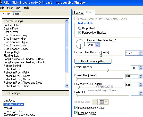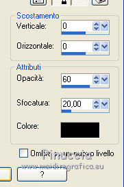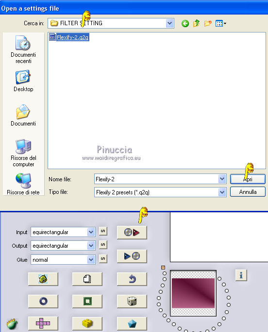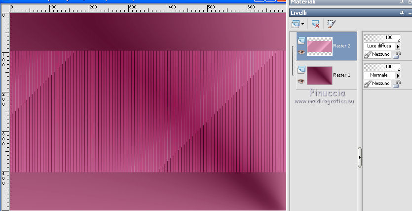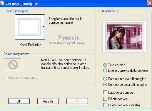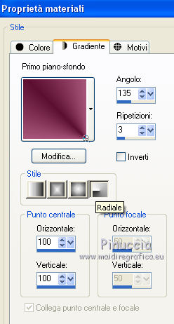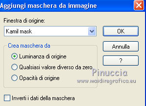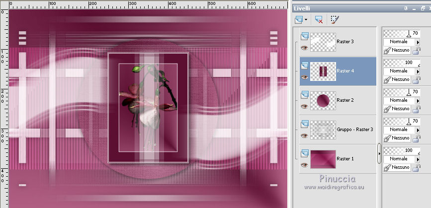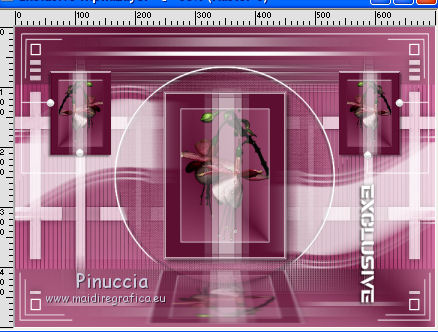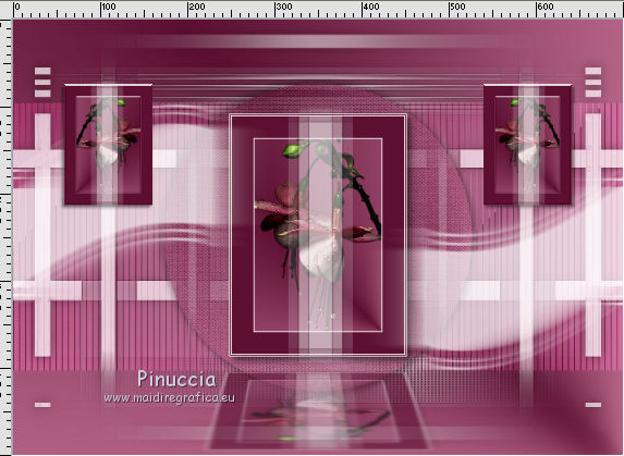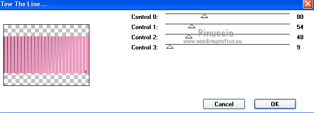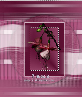 qui puoi trovare qualche risposta ai tuoi dubbi. Se l'argomento che ti interessa non è presente, ti prego di segnalarmelo. Questo tutorial è stato realizzato con Corel19 e tradotto con CorelX7, CorelX2 e CorelX3, ma può essere realizzato anche con le altre versioni di PSP. Dalla versione X4, il comando Immagine>Rifletti è stato sostituito con Immagine>Capovolgi in orizzontale, e il comando Immagine>Capovolgi con Immagine>Capovolgi in verticale. Nelle versioni X5 e X6, le funzioni sono state migliorate rendendo disponibile il menu Oggetti. Con la nuova versione X7, sono tornati Rifletti>Capovolgi, ma con nuove varianti. Vedi la scheda sull'argomento qui Occorrente: Materiale qui Per i tube e la maschera grazie Gabry e Kamil. Il resto del materiale è di Melodi. (in questa pagina trovi i links ai siti dei creatori di tubes) Filtri: se hai problemi con i filtri, consulta la mia sezione filtri qui Filters Unlimited 2.0 qui Tramages - Tow the Line qui Flaming Pear - Flexify 2 qui Italian Editors Effects qui Alien Skin Eye Candy 5 Impact - Perspective Shadow qui I filtri Tramage e Italian Editors si possono usare da soli o importati in Filters Unlimited (come fare vedi qui) Se un filtro fornito appare con questa icona ![]() non esitare a cambiare modalità di miscelatura e opacità secondo i colori utilizzati. Nelle ultime versioni di PSP non c'è il gradiente di primo piano/sfondo (Corel_06_029) Puoi usare i gradienti delle versioni precedenti. Trovi qui i gradienti Corel X. Metti il preset Cliccando sul file una o due volte (a seconda delle tue impostazioni), automaticamente il preset si installerà nella cartella corretta. perchè uno o due clic vedi qui Metti il preset per Flexify in una cartella a scelta. Lo importerai da questa cartella quando ti servirà. Metti la cornice Kamil-exclusive nella cartella Cornici-immagine. Apri la maschera in PSP e minimizzala con il resto del materiale. ![]() Imposta il colore di primo piano con #5c1031, e il colore di sfondo con #ed99bf. ![]() (obbligatoriamente, se usi altre immagini, il colore di sfondo dovrà essere bianco o un colore vicino al bianco). Passa il colore di primo piano a Gradiente di primo piano/sfondo, stile Radiale. ![]() 1. Apri Alpha Channels.psp. Finestra>Duplica o sulla tastiera maiuscola+D per fare una copia. ![]() Chiudi l'originale. La copia, che sarà la base del tuo lavoro, non è vuota, ma contiene le selezioni salvate sul canale alfa. Riempi l'immagine trasparente con il gradiente.Regola>Sfocatura>Sfocatura da movimento. ![]() 2. Livelli>Nuovo livello raster, Raster 2. Selezione>Carica/Salva selezione>Carica selezione da canale alfa. La selezione #1 è subito disponibile. Devi soltanto cliccare Carica. ![]() Riempi la selezione con il colore di sfondo.Selezione>Deseleziona. 3. Effetti>Plugins>Tramages - Tow the Line. ![]() Cambia la modalità di miscelatura di questo livello in Luca diffusa. ![]() Livelli>Unisci>Unisci giù. 4. Livelli>Nuovo livello raster, Raster 2. Riempi la selezione con il gradiente.Effetti>Plugins>Flaming Pear - Flexify 2. Clicca sul bottone rosso e cerca il preset, nella cartella in cui lo hai salvato. ![]() Questi i settaggi in caso di problemi con il preset. ![]() Effects> Plugins>Filters Unlimited 2.0 - Paper Textures - Canvas, Fine, con i settaggi standard. ![]() Abbassa l'opacità di questo livello al 70%. ![]() Effetti>Effetti 3D>Sfalsa ombra, colore nero. ![]() Ripeti l'Effetto Sfalsa ombra, orizzontale e verticale -4. ![]() Risultato ![]() 5. Livelli>Nuovo livello raster, Raster 3. Imposta il colore di sfondo con il colore bianco #ffffff. Riempi il livello con il colore bianco.Livelli>Nuovo livello maschera>Da immagine. Apri il menu sotto la finestra di origine e vedrai la lista dei files aperti. Seleziona la maschera Kamil mask. ![]() Livelli>Duplica. Livelli>Unisci>Unisci gruppo (gruppo Raster 3). Effetti>Effetti di bordo>Aumenta. Effetti>Effetti 3D>Sfalsa ombra, colore nero. ![]() Abbassa l'opacità di questo livello al 70%, o secondo il tuo mist. Livelli>Disponi>Sposta giù. ![]() 6. Attiva il livello superiore, Raster 2. Livelli>Nuovo livello raster, Raster 3. Selezione>Carica/Salva selezione>Carica selezione da canale alfa. Apri il menu delle selezioni e carica la selezione #2. Modalità di corrispondenza dello strumento Riempimento su Nessuno ![]() Riempi la selezione con il colore #ffffff.Selezione>Deseleziona. Effetti>Effetti di distorsione>Onda. ![]() Effetti>Effetti di distorsione>Vento - da sinistra, intensità 90. ![]() Livelli>Duplica. Immagine>Rifletti. Immagine>Capovolgi. Livelli>Unisci>Unisci giù. Abbassa l'opacità di questo livello al 70%. ![]() 7. Attiva il livello Raster 2. Livelli>Nuovo livello raster, Raster 4. Selezione>Carica/Salva selezione>Carica selezione da canale alfa. Apri il menu delle selezioni e carica la selezione #3. ![]() Riempi la selezione con il colore #ffffff.Selezione>Modifica>Contrai - 1 pixel. Passa il colore di primo piano a Colore. Riempi la selezione con il colore di primo piano #5c1031.Selezione>Modifica>Contrai - 1 pixel. Riempi la selezione con il colore #ffffff.Selezione>Modifica>Contrai - 1 pixel. Riempi la selezione con il colore di primo piano #5c1031.Selezione>Modifica>Contrai - 25 pixels. Riempi la selezione con il colore #ffffff.Selezione>Modifica>Contrai - 1 pixel. Imposta nuovamente il gradiente con il colore di sfondo iniziale #ed99bf. ![]() Riempi la selezione con il gradiente.Selezione>Deseleziona. ![]() 8. Apri il tube Melodi-Exclusive-flower e vai a Modifica>Copia. Torna al tuo lavoro e vai a Modifica>Incolla come nuovo livello. Immagine>Ridimensiona, al 45%, tutti i livelli non selezionato. Posiziona il tube sulla selezione.![]() Selezione>Inverti. Premi sulla tastiera il tasto CANC. Selezione>Deseleziona. Regola>Messa a fuoco>Metti a fuoco. Livelli>Unisci>Unisci giù. Effetti>Effetti 3D>Sfalsa ombra, colore nero. ![]() ![]() 9. Liveli>Nuovo livello raster - Raster 5. Selezione>Carica/Salva selezione>Carica selezione da cana