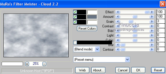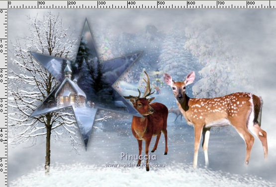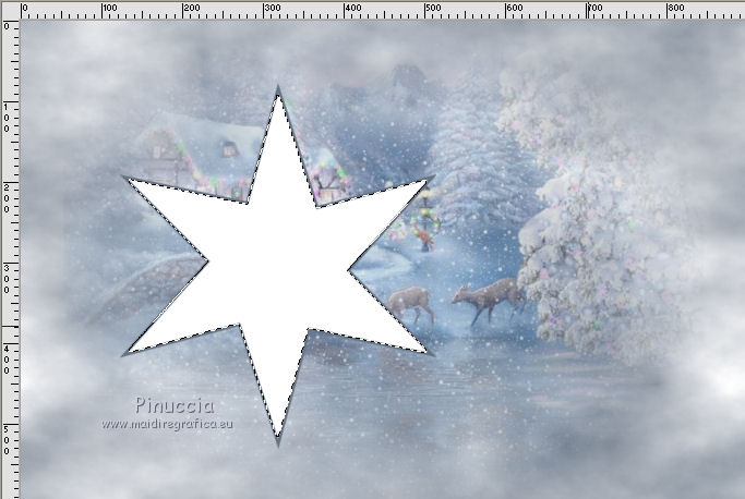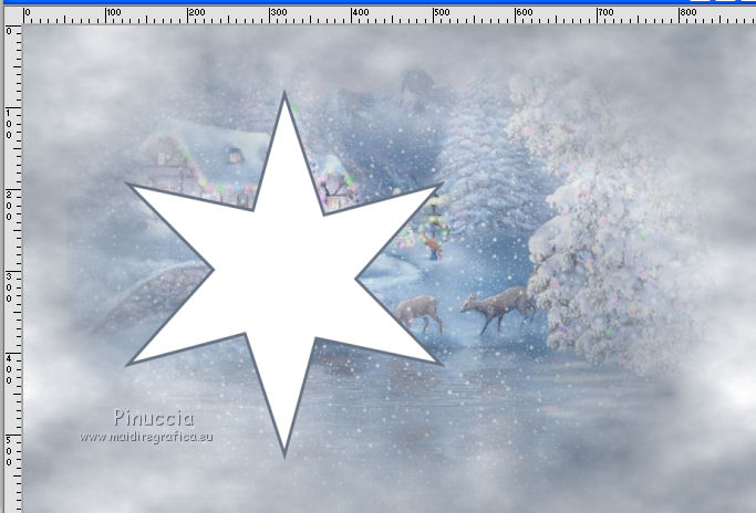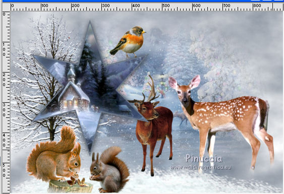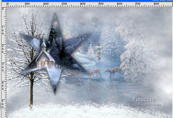 qui puoi trovare qualche risposta ai tuoi dubbi. Se l'argomento che ti interessa non è presente, ti prego di segnalarmelo. Per tradurre il tutorial ho usato Corel X, ma può essere eseguito con ogni versione di PSP. Dalla versione X4, il comando Immagine>Rifletti è stato sostituito con Immagine>Capovolgi in orizzontale, e il comando Immagine>Capovolgi con Immagine>Capovolgi in verticale. Nelle versioni X5 e X6, le funzioni sono state migliorate rendendo disponibile il menu Oggetti. Con la nuova versione X7, sono tornati Rifletti/Capovolgi, ma con nuove differenze Vedi la scheda sull'argomento qui ![]() traduzione in francese qui Le vostre versioni qui Occorrente: Materiale qui Filtri in caso di dubbi, ricorda di consultare la mia sezione filtri qui Mura's Meister - Cloud qui ![]() se stai usando altri colori, sperimenta le modalità di miscelatura e opacità più adatte ai tuoi colori 1. Imposta il colore di primo piano con #677383, e il colore di sfondo con #ffffff. ![]() 2. Apri una nuova immagine trasparente 900 x 600 pixels, ![]() 3. Effetti>Plugins>Mura's Meister - Cloud, con i settaggi standard. ![]() 4. Apri il tube k@rine_ dreams _Misted_Christmas_2682_Decembre_2013.psp e vai a Modifica>Copia. Torna al tuo lavoro e vai a Modifica>Incolla come nuovo livello. Abbassa l'opacità di questo livello al 60%. 5. Attiva lo strumento Forma simmetrica ![]() Seleziona la forma Stella, numero dei lati 6, larghezza 4 pixels. ![]() 6. Traccia una stella pressappoco come nell'esempio ![]() se hai problemi, puoi usare il tube ster che trovi nel materiale: Copia e incolla come nuovo livello questo tube e posizionalo in alto a sinistra7. Se hai realizzato la tua stella: Livelli>Converti in livello raster. 8. Attiva lo strumento Bacchetta magica , sfumatura e tolleranza 0,e clicca al centro della stella per selezionarla. ![]() 9. Premi sulla tastiera il tasto CANC ![]() 10. Livelli>Nuovo livello raster. Selezione>Modifica>Espandi - 2 pixels. 11. Apri l'immagine Kerkje.jpg e vai a Modifica>Copia. Torna al tuo lavoro e vai a Modifica>Incolla nella selezione. Selezione>Deseleziona. 12. Livelli>Disponi>Sposta giù. 13. Attiva il livello superiore. Livelli>Unisci>Unisci giù. 13. Effetti>Effetti 3D>Sfalsa ombra, colore nero. ![]() 14. Apri il tube boom.png e vai a Modifica>Copia. Torna al tuo lavoro e vai a Modifica>Incolla come nuovo livello. Spostalo a sinistra, vedi il mio esempio.Livelli>Disponi>Sposta giù, sotto il livello della stella. Rimani posizionato su questo livello. 15. Apri il tube sneeuw.png e vai a Modifica>Copia. Torna al tuo lavoro e vai a Modifica>Incolla come nuovo livello. Spostalo in basso, vedi il mio esempio.![]() 16. Apri il tube hert.png e vai a Modifica>Copia. Torna al tuo lavoro e vai a Modifica>Incolla come nuovo livello. Spostalo al centro, vedi il mio esempio.17. Apri il tube hert2.png e vai a Modifica>Copia. Torna al tuo lavoro e vai a Modifica>Incolla come nuovo livello. Spostalo in basso a destra.![]() 18. Apri il tube eekhoorntjes.png e vai a Modifica>Copia. Torna al tuo lavoro e vai a Modifica>Incolla come nuovo livello. Spostalo in basso a sinistra, vedi il mio esempio.19. Apri il tube vogeltje.png e vai a Modifica>Copia. Torna al tuo lavoro e vai a Modifica>Incolla come nuovo livello. Spostalo sulla stella.![]() 20. Immagine>Aggiungi bordatura, 2 pixels, simmetriche, colore scuro. Selezione>Seleziona tutto. Immagine>Aggiungi bordatura, 50 pixels, simmetriche, colore bianco. 21. Effetti>Effetti 3D>Sfalsa ombra, colore nero. ![]() Selezione>Deseleziona. 22. Apri il tube strik.png e vai a Modifica>Copia. Torna al tuo lavoro e vai a Modifica>Incolla come nuovo livello. Spostalo in alto a destra, vedi il mio esempio.23. Effetti>Effetti 3D>Sfalsa ombra, con i settaggi precedenti. ![]() 24. Immagine>Aggiungi bordatura, 2 pixels, simmetriche, colore scuro. Firma il tuo lavoro su un nuovo livello. Immagine>Ridimensiona, 900 pixels di larghezza, tutti i livelli selezionato. Salva in formato jpg. ![]() Se hai problemi o dubbi, o trovi un link non funzionante, o anche soltanto per un saluto, scrivimi. 20 Novembre 2016 |