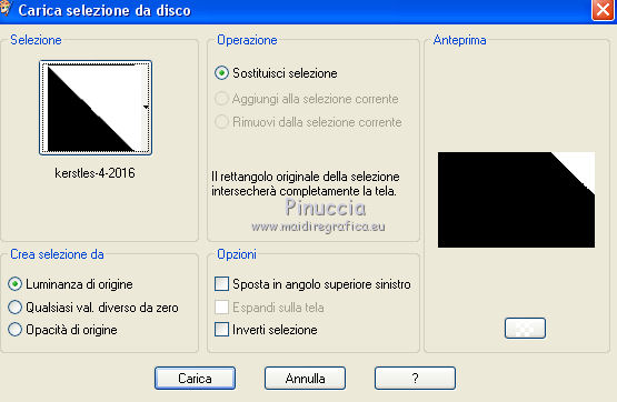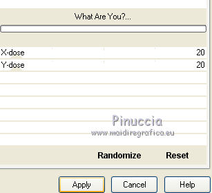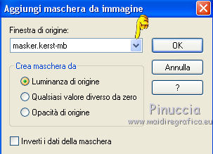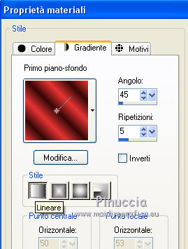 qui puoi trovare qualche risposta ai tuoi dubbi. Se l'argomento che ti interessa non è presente, ti prego di segnalarmelo. Per tradurre il tutorial ho usato Corel X, ma può essere eseguito con ogni versione di PSP. Dalla versione X4, il comando Immagine>Rifletti è stato sostituito con Immagine>Capovolgi in orizzontale, e il comando Immagine>Capovolgi con Immagine>Capovolgi in verticale. Nelle versioni X5 e X6, le funzioni sono state migliorate rendendo disponibile il menu Oggetti. Con la nuova versione X7, sono tornati Rifletti/Capovolgi, ma con nuove differenze Vedi la scheda sull'argomento qui traduzione in francese qui Le vostre versioni qui Occorrente: Materiale qui Filtri in caso di dubbi, ricorda di consultare la mia sezione filtri qui Filters Unlimited 2.0 qui Toadies- What are you qui Simple - Top Left Mirror qui AP 01 [Innovations] - Lines SilverLining qui Mehdi - Sorting Tiles qui I filtri Toadies e Simple si possono usare da soli o importati in Filters Unlimited (come fare vedi qui) Se un filtro fornito appare con questa icona ![]() se stai usando altri colori, sperimenta le modalità di miscelatura e opacità più adatte ai tuoi colori Nelle ultime versioni di PSP non c'è il gradiente di primo piano/sfondo (Corel_06_029) Puoi usare i gradienti delle versioni precedenti. Trovi qui i gradienti Corel X. Metti la selezione nella cartella Selezioni. Apri la maschera in PSP e minimizzala con il resto del materiale. 1. Imposta il colore di primo piano con #e83433, e il colore di sfondo con #340908. ![]() Passa il colore di primo piano a Gradiente di primo piano/sfondo, stile Lineare. ![]() 2. Apri una nuova immagine trasparente 900 x 550 pixels, ![]() Riempi l'immagine trasparente con il gradiente.3. Effetti>Effetti di bordo>Aumenta di più. 4. Livelli>Duplica. Immagine>Rifletti. 5. Effetti>Effetti di bordo>Aumenta di più. 6. Abbassa l'opacità di questo livello al 30%. 7. Livelli>Unisci>Unisci giù. 8. Livelli>Duplica. Immagine>Ridimensiona, al 70%, tutti i livelli non selezionato. 9. Effetti>Plugins>Filters Unlimited 2.0 - Toadies - What are you. attenzione, questo effetto dà risultati differenti se utilizzato da solo o in Unlimited, e secondo la versione di Unlimited utilizzata. Nell'esempio finale in alto ho utilizzato la versione di Unlimited in formato software; nella versione finale in basso ho utilizzato la versione di Unlimited che non si installa ed è formata da files in formato .8bf ![]() qui sotto la finestra con la versione di Unlimited che non si installa ![]() 10. Effetti>Effetti 3D>Sfalsa ombra, colore nero. ![]() 11. Livelli>Duplica. Immagine>Ridimensiona, all'80%, tutti i livelli non selezionato. 12. Effetti>Effetti 3D>Sfalsa ombra, con i settaggi precedenti. ![]() 13. Effetti>Plugins>Mehdi - Sorting Tiles. ![]() 14. Effetti>Plugins>AP 01 [Innovations] - Lines SilverLining. ![]() 15. Livelli>Nuovo livello raster. Imposta il colore di sfondo con il colore bianco e riempi il livello con questo colore.16. Livelli>Nuovo livello maschera>Da immagine. Apri il menu sotto la finestra di origine e vedrai la lista dei files aperti. Seleziona la maschera masker.kerst-mb.jpg ![]() Livelli>Unisci>Unisci gruppo. Effetti>Effetti di bordo>Aumenta. 17. Selezione>Carica/Salva selezione>Carica selezione da disco. Cerca e carica la selezione kerstles-4-2016.PspSelection. ![]() 18. Livelli>Nuovo livello raster. Abbassa l'opacità dello strumento Riempimento a 10, e riempi la selezione con il colore bianco.Riporta l'opacità dello strumento Riempimento a 100. Selezione>Deseleziona. 19. Effetti>Plugins>Filters Unlimited 2.0 - Toadies - What are you, con i settaggi precedenti. ![]() 20. Immagine>Rifletti. 21. Effetti>Effetti di trama>Veneziana, colore scuro #340908. ![]() 22. Livelli>Duplica. Livelli>Unisci>Unisci giù. 23. Effetti>Plugins>Simple - Top Left Mirror. ![]() 24. Apri il tube kerst-deo-12.png e vai a Modifica>Copia. Torna al tuo lavoro e vai a Modifica>Incolla come nuovo livello. Spostalo un po' più in basso a sinistra![]() 25. Apri il tube kerstdeco-15.png e vai a Modifica>Copia. Torna al tuo lavoro e vai a Modifica>Incolla come nuovo livello. Spostalo in alto a destra.![]() 26. Immagine>Aggiungi bordatura, 2 pixels, simmetriche, colore nero. 27. Selezione>Seleziona tutto. Immagine>Aggiungi bordatura, 50 pixels, simmetriche, colore bianco. 28. Selezione>Inverti. 29. Riporta il colore di sfondo al colore scuro #340908. Riempi la selezione con il gradiente.30. Regola>Aggiungi/Rimuovi disturbo>Aggiungi disturbo. ![]() 31. Selezione>Inverti. 32. Effetti>Effetti 3D>Sfalsa ombra, con i settaggi precedenti. ![]() Modifica>Ripeti Sfalsa ombra. Selezione>Deseleziona. 33. Immagine>Aggiungi bordatura, 2 pixels, simmetriche, colore nero. 34. Firma il tuo lavoro su un nuovo livello. 35. Immagine>Ridimensiona, 900 pixels di larghezza, tutti i livelli selezionato. 36. Salva in formato jpg. Risultato, utilizzando la versione di Unlimited che non si installa. ![]() ![]() Se hai problemi o dubbi, o trovi un link non funzionante, o anche soltanto per un saluto, scrivimi. 20 Novembre 2016 |