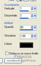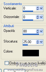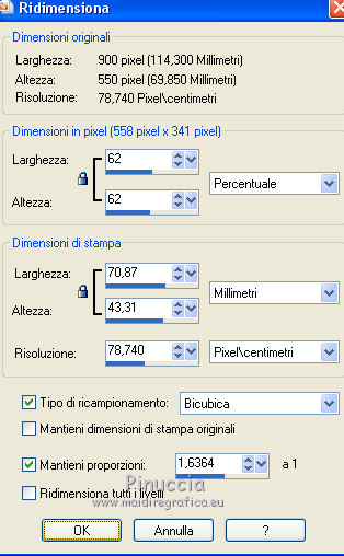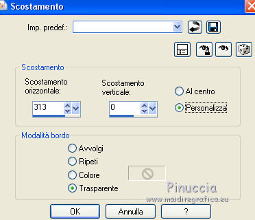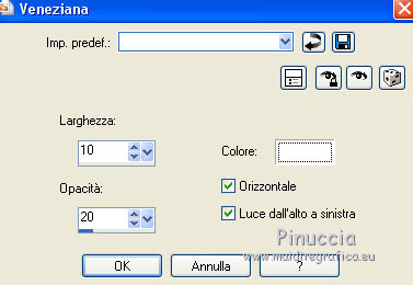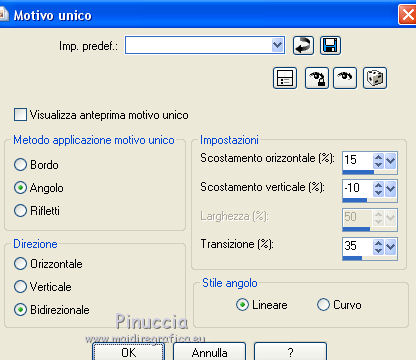 qui puoi trovare qualche risposta ai tuoi dubbi. Se l'argomento che ti interessa non è presente, ti prego di segnalarmelo. Per tradurre il tutorial ho usato Corel X, ma può essere eseguito con ogni versione di PSP. Dalla versione X4, il comando Immagine>Rifletti è stato sostituito con Immagine>Capovolgi in orizzontale, e il comando Immagine>Capovolgi con Immagine>Capovolgi in verticale. Nelle versioni X5 e X6, le funzioni sono state migliorate rendendo disponibile il menu Oggetti. Con la nuova versione X7, sono tornati Rifletti/Capovolgi, ma con nuove differenze Vedi la scheda sull'argomento qui traduzione in francese qui Le vostre versioni qui ![]() Occorrente: Materiale qui (in questa pagina trovi i links ai loro siti). Filtri in caso di dubbi, ricorda di consultare la mia sezione filtri qui Filters Unlimited 2.0 qui Toadies - Rasterline qui Mehdi - Sorting Tiles qui &<Bkg Designer sf10II> - Gregs F0 Wrap (da importare in Unlimited) qui Simple - Pizza Slice Mirror qui Ap 01 [Innovations] - Lines SilverLining qui Mura's Meister - Perspective Tiling qui I filtri Toadies e Simple si possono usare da soli o importati in Filters Unlimited (come fare vedi qui) Se un filtro fornito appare con questa icona ![]() se stai usando altri colori, sperimenta le modalità di miscelatura e opacità più adatte ai tuoi colori 1. Imposta il colore di primo piano con #8ccd86, e il colore di sfondo con #174717. ![]() 2. Apri una nuova immagine trasparente 900 x 550 pixels. ![]() Riempi l'immagine trasparente con il colore scuro.3. Livelli>Nuovo livello raster. Selezione>Seleziona tutto. 4. Apri 5cd5b5e024.png e vai a Modifica>Copia. Torna al tuo lavoro e vai a Modifica>Incolla nella selezione. Selezione>Deseleziona. 5. Regola>Sfocatura>Sfocatura radiale. ![]() 6. Effetti>Effetti di immagine>Motivo unico. ![]() 7. Effetti>Plugins>Mehdi - Sorting Tiles. ![]() 8. Effetti>Effetti di bordo>Aumenta di più. Livelli>Unisci>Unisci giù. 9. Livelli>Duplica. 10. Immagine>Ruota per gradi - 90 gradi a sinistra. ![]() 11. Immagine>Ridimensiona, al 62%, tutti i livelli non selezionato. ![]() 12. Effetti>Plugins>Filters Unlimited 2.0 - &[Bkg Designer sf10II> - Gregs F0 Wrap. ![]() 13. Effetti>Effetti 3D>Sfalsa ombra, colore nero. ![]() 14. Attiva il livello inferiore, Raster 1. 15. Attiva lo strumento Selezione ![]() (non importa il tipo di selezione impostato, perchè con la selezione personalizzata si ottiene sempre un rettangolo) clicca sull'icona Selezione personalizzata ![]() e imposta i seguenti settaggi. ![]() Selezione>Innalza selezione a livello. Selezione>Deseleziona. 16. Effetti>Effetti 3D>Sfalsa ombra, con i settaggi precedenti. ![]() 17. Effetti>Effetti di trama>Veneziana, colore bianco. ![]() 18. Livelli>Duplica. Immagine>Rifletti. Livelli>Unisci>Unisci giù. 19. Effetti>Plugins>Filters Unlimited 2.0 - Simple - Pizza Slice Mirror. ![]() 20. Apri deco-1-2017.png e vai a Modifica>Copia. Torna al tuo lavoro e vai a Modifica>Incolla come nuovo livello. Livelli>Disponi>Porta in alto. 21. Effetti>Effetti di immagine>Scostamento. ![]() 22. Effetti>Effetti 3D>Sfalsa ombra, con i settaggi precedenti. ![]() 23. Livelli>Duplica. Immagine>Rifletti. 24. Apri deco-2-2017.png e vai a Modifica>Copia. Torna al tuo lavoro e vai a Modifica>Incolla come nuovo livello. 25. Attiva lo strumento Bacchetta magica , sfumatura e tolleranza 0,e clicca al centro del tube per selezionarlo. ![]() 26. Livelli>Nuovo livello raster. Riempi la selezione con il colore chiaro.Selezione>Deseleziona. 27. Effetti>Plugins>Filters Unlimited 2.0 - Toadies - Rasterline. ![]() 28. Effetti>Effetti 3D>Sfalsa ombra, colore nero. ![]() 29. Abbassa l'opacità di questo livello al 55%. 30. Apri 5cd5b5e024.png e vai a Modifica>Copia. Torna al tuo lavoro e vai a Modifica>Incolla come nuovo livello. Immagine>Ridimensiona, al 70%, tutti i livelli non selezionato. 32. Attiva il livello inferiore. Effetti>Plugins>AP 01 [Innovations] - Lines SilverLining - Dotty Grid. ![]() 33. Livelli>Duplica. Livelli>Disponi>Porta in alto. 34. Effetti>Plugins>Mura's Meister - Perspective Tiling. ![]() 35. Apri 261a6d9.png e vai a Modifica>Copia. Torna al tuo lavoro e vai a Modifica>Incolla come nuovo livello. Spostalo in basso a destra.36. Effetti>Effetti 3D>Sfalsa ombra, colore nero. ![]() 37. Immagine>Aggiungi bordatura, 1 pixel, simmetriche, colore scuro. Immagine>Aggiungi bordatura, 2 pixels, simmetriche, colore chiaro. Immagine>Aggiungi bordatura, 1 pixel, simmetriche, colore scuro. 38. Selezione>Seleziona tutto. Modifica>Copia. 39. Immagine>Aggiungi bordatura, 45 pixels, simmetriche, colore chiaro. Selezione>Inverti. Modifica>Incolla nella selezione. 40. Regola>Sfocatura>sfocatura gaussiana - raggio 30. ![]() 41. Selezione>Inverti. Effetti>Effetti 3D>Sfalsa ombra, con i settaggi precedenti. ![]() Selezione>Deseleziona. 42. Immagine>Aggiungi bordatura, 1 pixel, simmetriche, colore scuro. 43. Apri rand-3.png e vai a Modifica>Copia. Torna al tuo lavoro e vai a Modifica>Incolla come nuovo livello. 44. Firma il tuo lavoro e salva in formato jpg. ![]() Se hai problemi o dubbi, o trovi un link non funzionante, o anche soltanto per un saluto, scrivimi. 9 Dicembre 2017 |