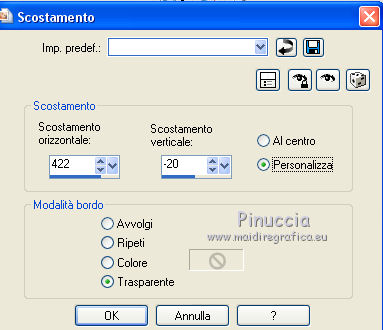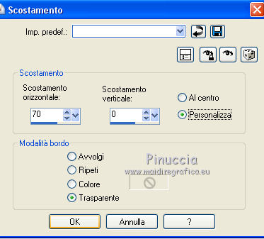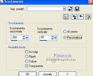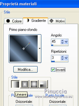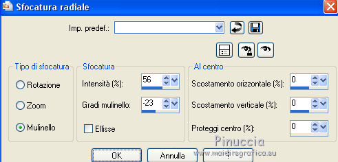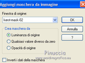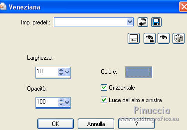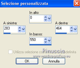 qui puoi trovare qualche risposta ai tuoi dubbi. Se l'argomento che ti interessa non è presente, ti prego di segnalarmelo. Per tradurre il tutorial ho usato Corel X, ma può essere eseguito con ogni versione di PSP. Dalla versione X4, il comando Immagine>Rifletti è stato sostituito con Immagine>Capovolgi in orizzontale, e il comando Immagine>Capovolgi con Immagine>Capovolgi in verticale. Nelle versioni X5 e X6, le funzioni sono state migliorate rendendo disponibile il menu Oggetti. Con la nuova versione X7, sono tornati Rifletti/Capovolgi, ma con nuove differenze Vedi la scheda sull'argomento qui traduzione in francese qui Le vostre versioni qui ![]() Occorrente: Materiale qui Per il tube grazie Beatriz. (in questa pagina trovi i links ai loro siti). Filtri in caso di dubbi, ricorda di consultare la mia sezione filtri qui Filters Unlimited 2.0 qui Toadies - What are you qui Mehdi - Sorting Tiles qui AAA Frames - Foto Frame qui L&K's landsiteofwonders - L&K's Zitah qui I filtri Toadies si possono usare da soli o importati in Filters Unlimited (come fare vedi qui) Se un filtro fornito appare con questa icona ![]() se stai usando altri colori, sperimenta le modalità di miscelatura e opacità più adatte ai tuoi colori Nelle ultime versioni di PSP non c'è il gradiente di primo piano/sfondo (Corel_06_029) Puoi usare i gradienti delle versioni precedenti. Trovi qui i gradienti Corel X. Apri la maschera in PSP e minimizzala con il resto del materiale. 1. Imposta il colore di primo piano con #7d96b3, e il colore di sfondo con #171e25. ![]() Passa il colore di primo piano a Gradiente di primo piano/sfondo, stile Lineare. ![]() 2. Apri una nuova immagine trasparente 900 x 550 pixels. ![]() Riempi l'immagine trasparente con il gradiente.3. Selezione>Seleziona tutto. Apri deco-2017-4.png e vai a Modifica>Copia. Torna al tuo lavoro e vai a Modifica>Incolla nella selezione. Selezione>Deseleziona. 4. Effetti>Effetti di immagine>Motivo unico, con i settaggi standard. ![]() 5. Regola>Sfocatura>Sfocatura radiale. ![]() 6. Effetti>Plugins>Mehdi - Sorting Tiles. ![]() 7. Effetti>Plugins>Filters Unlimited 2.0 - Toadies - What are you. ![]() 8. Effetti>Effetti di bordo>Aumenta. 9. Attiva lo strumento Selezione ![]() (non importa il tipo di selezione impostato, perchè con la selezione personalizzata si ottiene sempre un rettangolo) clicca sull'icona Selezione personalizzata ![]() e imposta i seguenti settaggi. ![]() Selezione>Innalza selezione a livello. Selezione>Deseleziona. 10. Effetti>Effetti di trama>Veneziana - colore chiaro. ![]() 11. Effetti>Effetti 3D>Sfalsa ombra, colore nero. ![]() 12. Livelli>Duplica. Effetti>Effetti di immagine>Scostamento. ![]() 13. Cambia la modalità di miscelatura di questo livello in Moltiplica. 14. Attiva il livello inferiore, raster 1. Effetti>Plugins>L&K's - L&K Zitah. ![]() 15. Attiva il livello superiore. Modifica>Incolla come nuovo livello (il tube deco-2017-4.png è sempre in memoria). 16. Effetti>Effetti di immagine>Scostamento. ![]() 17. Livelli>Nuovo livello raster. Imposta il colore di primo piano con il colore bianco #ffffff. Riempi il livello con il colore bianco.18. Livelli>Nuovo livello maschera>Da immagine. Apri il menu sotto la finestra di origine e vedrai la lista dei files aperti. Seleziona la maschera kerst-mask-02.jpg. ![]() Livelli>Unisci>Unisci gruppo. 19. Effetti>Effetti 3D>Sfalsa ombra, colore nero. ![]() 20. Apri il tube 2184-girl-LB TUBES e vai a Modifica>Copia. Modifica>Incolla come nuovo livello. 21. Effetti>Effetti di immagine>Scostamento. ![]() 22. Effetti>Effetti 3D>Sfalsa ombra, colore nero. ![]() 23. Immagine>Aggiungi bordatura, 1 pixel, simmetriche, colore scuro. Immagine>Aggiungi bordatura, 2 pixels, simmetriche, colore bianco. Immagine>Aggiung bordatura, 1 pixel, simmetriche, colore scuro. 24. Selezione>Seleziona tutto. Immagine>Aggiungi bordatura, 45 pixels, simmetriche, colore bianco. 25. Effetti>Effetti 3D>Sfalsa ombra, colore nero. ![]() Selezione>Deseleziona. 26. Effetti>Plugins>AAA Frames - Foto Frame. ![]() 27. Apri Christmas-WT.png e vai a Modifica>Copia. Torna al tuo lavoro e vai a Modifica>Incolla come nuovo livello. 28. Effetti>Effetti di immagine>Scostamento. ![]() 29. Firma il tuo lavoro su un nuovo livello. Livelli>Unisci>Unisci tutto e salva in formato jpg. ![]() Se hai problemi o dubbi, o trovi un link non funzionante, o anche soltanto per un saluto, scrivimi. 9 Dicembre 2017 Le mie traduzioni sono regolarmente registrate |