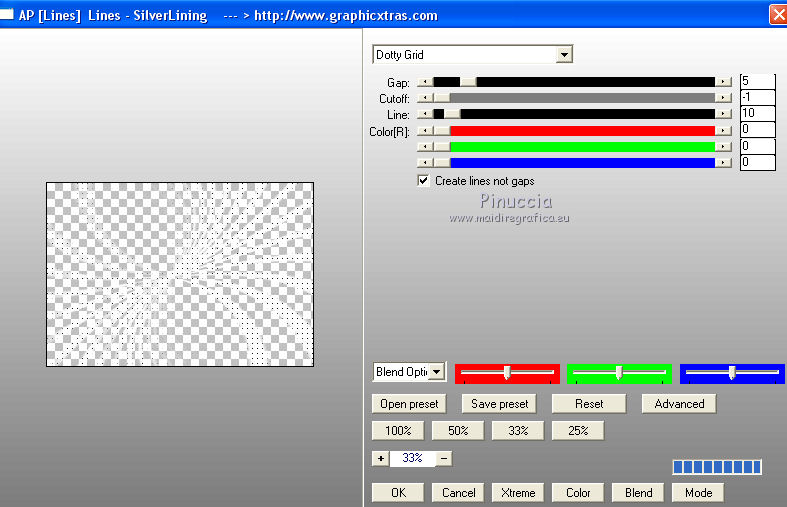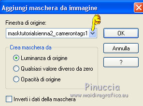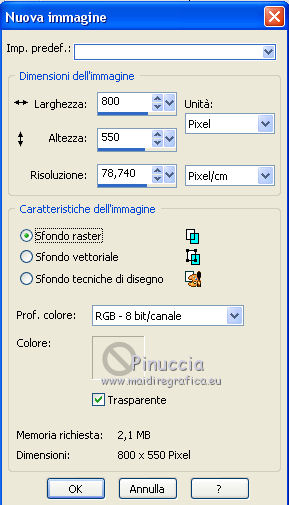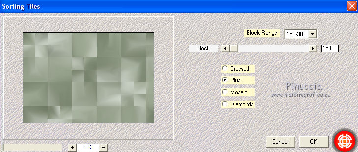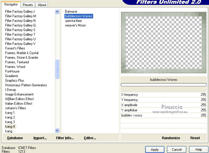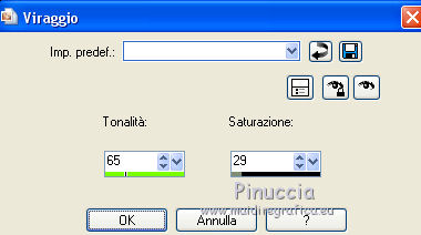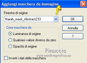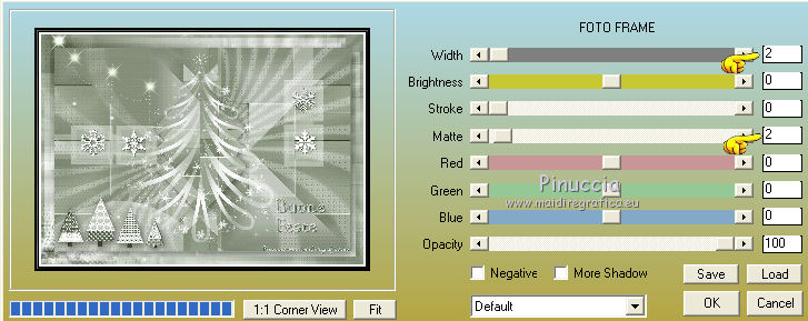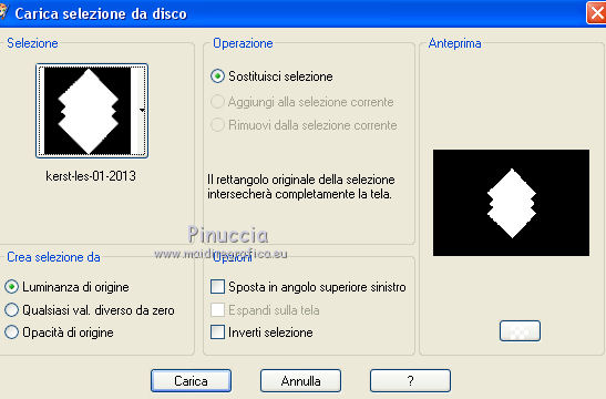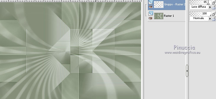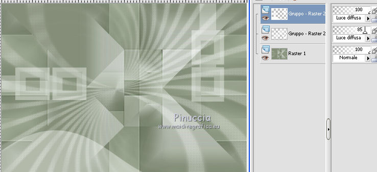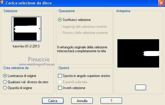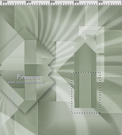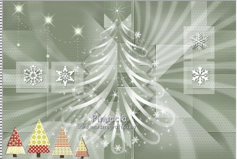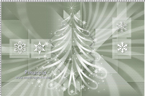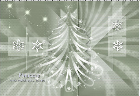 qui puoi trovare qualche risposta ai tuoi dubbi. Se l'argomento che ti interessa non è presente, ti prego di segnalarmelo. Il tutorial può essere eseguito con ogni versione di PSP. Dalla versione X4, il comando Immagine>Rifletti è stato sostituito con Immagine>Capovolgi in orizzontale, e il comando Immagine>Capovolgi con Immagine>Capovolgi in verticale. Nelle versioni X5 e X6, le funzioni sono state migliorate rendendo disponibile il menu Oggetti. Con la nuova versione X7, sono tornati Rifletti/Capovolgi, ma con nuove differenze Vedi la scheda sull'argomento qui Per tradurre questo tutorial ho usato PSP X. traduction en français qui Le vostre versioni qui Occorrente: Materiale qui Filtri in caso di dubbi, ricorda di consultare la mia sezione filtri qui Filters Unlimited 2.0 qui Mehdi - Sorting Tiles qui Simple - Pizza Slice Mirror qui Kang 4 - Bubblecross waves qui AP Lines - Lines SilverLining qui AAA Frames - Foto Frame qui I filtri Simple e Kang si possono usare da soli o importati in Filters Unlimited (come fare vedi qui) Se un filtro fornito appare con questa icona ![]() se stai usando altri colori, sperimenta le modalità di miscelatura e opacità più adatte ai tuoi colori Metti le selezioni nella cartella Selezioni. Apri le maschere in PSP e minimizzale con il resto del materiale. 1. Imposta il colore di primo piano con il colore bianco #ffffff, e il colore di sfondo con #808e74. ![]() Apri una nuova immagine trasparente 800 x 550 pixels. ![]() 2. Selezione>Seleziona tutto. Apri Flornambg_56 e vai a Modifica>Copia. Torna al tuo lavoro e vai a Modifica>Incolla nella selezione. Selezione>Deseleziona. 3. Effetti>Effetti di immagine>Motivo unico, con i settaggi standard. ![]() 4. Regola>Sfocatura>Sfocatura gaussiana - raggio 25. ![]() 5. Effetti>Plugins>Mehdi - Sorting Tiles. ![]() Effetti>Effetti di bordo>Aumenta di più. 6. Effetti>Plugins>Simple - Pizza Slice Mirror. Modifica>Ripeti Pizza Slice Mirror. 7. Livelli>Nuovo livello raster. Riempi con il colore bianco di primo piano.8. Livelli>Nuovo livello maschera>Da immagine. Apri il menu sotto la finestra di origine e vedrai la lista dei files aperti. Seleziona la maschera Narah_mask_Abstract233, con i seguenti settaggi. ![]() Livelli>Unisci>Unisci gruppo. 9. Effetti>Plugins>AP Lines - Lines SilverLining. ![]() 10. Cambia la modalità di miscelatura di questo livello in Luce diffusa, e abbassa l'opacità all'85%. ![]() 11. Livelli>Nuovo livello raster. Riempi con il colore bianco di primo piano.12. Livelli>Nuovo livello maschera>Da immagine. Apri il menu sotto la finestra di origine e seleziona la maschera masktutorialsienna2, con i seguenti settaggi. ![]() Livelli>Unisci>Unisci gruppo. 13. Cambia la modalità di miscelatura di questo livello in Luce diffusa. ![]() 14. Selezione>Seleziona tutto. Livelli>Nuovo livello raster. Apri stipjes.pspimage e vai a Modifica>Copia. Torna al tuo lavoro e vai a Modifica>Incolla nella selezione. Selezione>Deseleziona. Abbassa l'opacità di questo livello al 30% (o secondo i tuoi colori). 15. Attiva il livello inferiore Raster 1. Selezione>Carica/Salva selezione>Carica selezione da disco. Cerca e carica la selezione kerst-les-01-2013. ![]() 16. Selezione>Innalza selezione a livello. Livelli>Disponi>Porta in alto. Selezione>Deseleziona. 17. Effetti>Effetti 3D>Sfalsa ombra, colore nero. ![]() 18. Effetti>Effetti di immagine>Scostamento. ![]() 19. Attiva nuovamente il livello inferiore - Raster 1. Selezione>Carica/Salva selezione>Carica selezione da disco. Cerca e carica la selezione kerst-les-01-2-2013. ![]() 20. Selezione>Innalza selezione a livello. Livelli>Disponi>Porta in alto. Selezione>Deseleziona. 21. Immagine>Ruota per gradi - 90 gradi a destra. ![]() 22. Attiva lo strumento Selezione , rettangolo,e seleziona la parte inferiore della freccia. ![]() Premi sulla tastiera il tasto CANC ![]() Selezione>Deseleziona. 23. Effetti>Effetti di immagine>Scostamento. ![]() 24. Livelli>Duplica. Immagine>Capovolgi. Livelli>Unisci>Unisci giù. Livelli>Disponi>Sposta giù. 25. Attiva il livello superiore. Apri fin-annee16-verocreation, e vai a Modifica>Copia. Torna al tuo lavoro e vai a Modifica>Incolla come nuovo livello. Immagine>Ridimensiona, al 65%, tutti i livelli non selezionato. Spostalo un po' più a sinistra.![]() 26. Apri sneeuw-deco.pspimage, e vai a Modifica>Copia. Torna al tuo lavoro e vai a Modifica>Incolla come nuovo livello. Spostalo sui piccoli quadri della maschera.![]() 27. Apri sterne09_sigrid.pspimage, e vai a Modifica>Copia. Torna al tuo lavoro e vai a Modifica>Incolla come nuovo livello. Immagine>Ridimensiona, al 65%, tutti i livelli non selezionato. Cambia la modalità di miscelatura di questo livello in Luminanza (esistente). Sposta il tube in alto a sinistra.![]() 28. Apri xmasscrap12_joluvsdogs, e vai a Modifica>Copia. Torna al tuo lavoro e vai a Modifica>Incolla come nuovo livello. Sposta l'elemento in basso a sinistra.![]() 29. Regola>Tonalità e saturazione>Viraggio. ![]() 30. Effetti>Effetti 3D>Sfalsa ombra, colore nero. ![]() 31. Apri Tekst, e vai a Modifica>Copia. Torna al tuo lavoro e vai a Modifica>Incolla come nuovo livello. Spostalo in basso a destra.Nel materiale trovi il mio file, "testo-texte", con il testo in italiano 32. Immagine>Aggiungi bordatura, 1 pixel, simmetriche, colore di sfondo. 33. Modifica>Copia. 34. Selezione>Seleziona tutto. Immagine>Aggiungi bordatura, 50 pixels, simmetriche, colore di primo piano #ffffff. 35. Selezione>Inverti. Livelli>Nuovo livello raster. Modifica>Incolla nella selezione. 36. Effetti>Plugins>Filters Unlimited 2.0 - Kang 4 - Bubblecrosse waves. ![]() (se hai problemi con il filtro, copia e incolla nella selezione il bordo che trovi nel materiale - "rand"). 37. Regola>Messa a fuoco>Metti a fuoco. Selezione>Inverti. 38. Effetti>Effetti 3D>Sfalsa ombra, con i settaggi precedenti. ![]() 39. Livelli>Unisci>Unisci tutto. 40. Effetti>Plugins>AAA Frames - Foto Frame. ![]() 41. Firma il tuo lavoro su un nuovo livello. Livelli>Unisci>Unisc