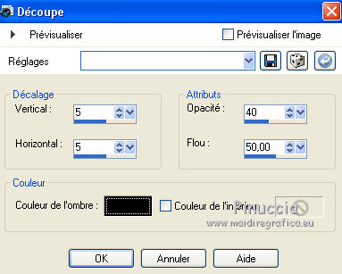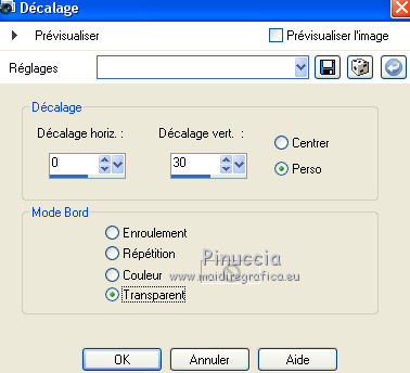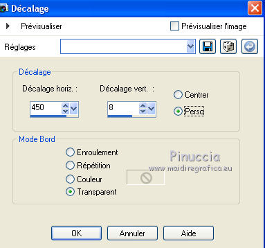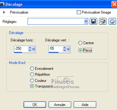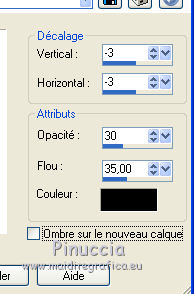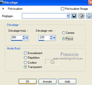 Pour traduire ce tutoriel j'ai utilisé CorelX2, mais il peut également être exécuté avec les autres versions. Suivant la version utilisée, vous pouvez obtenir des résultats différents. Depuis la version X4, la fonction Image>Miroir a été remplacée par Image>Renverser horizontalement, et Image>Renverser avec Image>Renverser verticalement. Dans les versions X5 et X6, les fonctions ont été améliorées par la mise à disposition du menu Objets. Dans la nouvelle version X7, nous avons à nouveau Miroir/Renverser, mais avec autres différences. Voir plus les détails à ce sujet ici Certaines dénominations ont changées entre les versions de PSP. Les plus frequentes dénominations utilisées: ![]() Traduction en italien ici Vos versions ici Nécessaire pour réaliser ce tutoriel: Matériel ici Les éléments scrap viennent du kit Mago74 (le site n'est plus en ligne) Modules Externes consulter, si nécessaire, ma section de filtre ici Richard Rosenman - Scanlines ici Kang 3 - Mi vida loco ici Transparency - Eliminate Black ici Filters Unlimited 2.0 ici Filtres Kang et Transparency peuvent être utilisés seuls ou importés dans Filters Unlimited. voir comment le faire ici). Si un filtre est fourni avec cette icône, ![]() Si vous voulez utiliser vos propres couleurs, n'hésitez pas à changer le mode et l'opacité des calques Placer le masque dans le dossier Masques. 1. Placer en avant plan la couleur #ffffff. Ouvrir une nouvelle image transparente 900 x 600 pixels, et remplir avec la couleur blanche.2. Ouvrir achtergrond1, Édition>Copier. Revenir sur votre travail et Édition>Coller comme nouveau calque. 3. Calques>Nouveau calque raster. Sélections>Sélectionner tout. Sélections>Modifier>Contracter - 75 pixels. Remplir la sélection avec la couleur blanche.4. Effets>Effets 3D>Ombre portée, couleur noire. ![]() Répéter Ombre portée, mais vertical et horizontal -5. Sélections>Désélectionner tout. 5. Calques>Dupliquer. Effets>Modules Externes>Richard Rosenman - Scalines. ![]() 6. Calques>Charger/Enregistrer un masque>Charger à partir du disque. Chercher et charger le masque 20-20. ![]() Calques>Fusionner>Fusionner le groupe. 7. Réduire l'opacité de ce calque à 50%. 8. Ouvrir le tube "immagine paesaggio", Édition>Copier. Revenir sur votre travail et Édition>Coller comme nouveau calque. 9. Effets>Effets d'image>Décalage. ![]() 10. Ouvrir le tube "ramo", Édition>Copier. Revenir sur votre travail et Édition>Coller comme nouveau calque. 11. Effets>Effets d'image>Décalage. ![]() 12. Ouvrir SNEEUW—HOOPJE, Édition>Copier. Revenir sur votre travail et Édition>Coller comme nouveau calque. 13. Effets>Effets d'image>Décalage. ![]() 14. Ouvrir le tube Gerry-Kerst 70-kerstman -19 september 2010, Édition>Copier. Revenir sur votre travail et Édition>Coller comme nouveau calque. Image>Redimensionner, à 90%, redimensionner tous les calques décoché. 15. Effets>Effets d'image>Décalage. ![]() 16. Effets>Effets 3D>Ombre portée, couleur noire. ![]() 17. Ouvrir le tube WINTER MAGIC by_Mago74 closter frame, Édition>Copier. Revenir sur votre travail et Édition>Coller comme nouveau calque. 18. Effets>Effets d'image>Décalage. ![]() 19. Effets>Effets 3D>Ombre portée, couleur noire. ![]() Répéter Ombre portée, mais vertical et horizontal 5. ![]() 20. Ouvrir le tube KLEINE STERRETJES, Édition>Copier. Revenir sur votre travail et Édition>Coller comme nouveau calque. Déplacer en haut.21. Ouvrir le tube gufo, Édition>Copier. Revenir sur votre travail et Édition>Coller comme nouveau calque. Déplacer sur la fenêtre.![]() 22. Effets>Effets 3D>Ombre portée, couleur noire. ![]() 23. Sélections>Sélectionner tout. Image>Ajouter des bordures, 80 pixels, symétrique, couleur blanche. 24. Sélections>Inverser. Sélections>Transformer la sélection en calque. 25. Effets>Modules Externes>Filters Unlimited 2.0 - Kang 3 - Mi vida loco. ![]() 26. Effets>Modules Externes>Transparency - Eliminate Black. Réduire l'opacité de ce calque à 50%. 27. Calques>Nouveau calque raster. Effets>Effets 3D>Découpe, couleur noire. ![]() 28. Calques>Nouveau calque raster. Répéter l'Effet Découpe, mais vertical et horizontal -5. Sélections>Désélectionner tout. 29. Calques>Fusionner>Tous. Image>Redimensionner, à 900 pixels de largeur, redimensionner tous les calques coché. 30. Signer votre travail sur un nouveau calque. Calques>Fusionner>Tous et enregistrer en jpg. Version animée, avec la gif fournie dans le matériel. ![]() ![]() Si vous avez des problèmes, ou des doutes, ou vous trouvez un link modifié, ou seulement pour me dire que ce tutoriel vous a plu, vous pouvez m'écrire. 14 Décember 2015 |