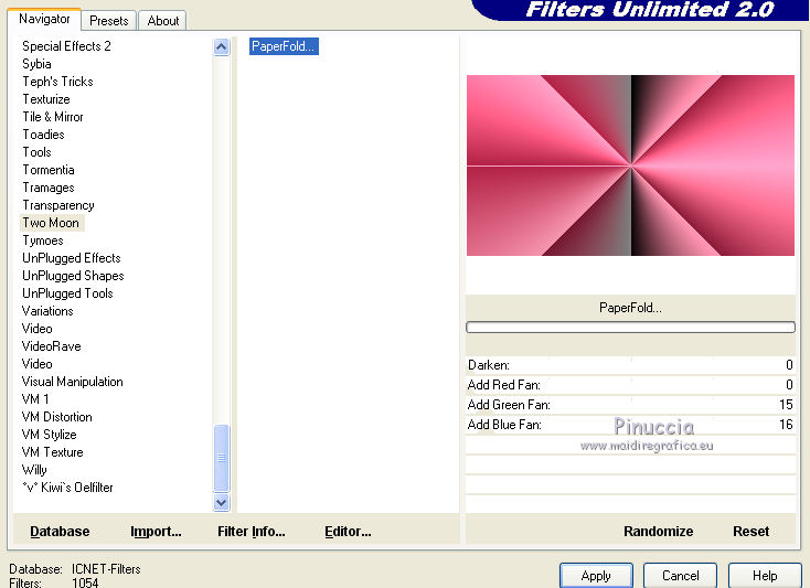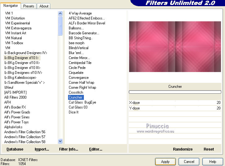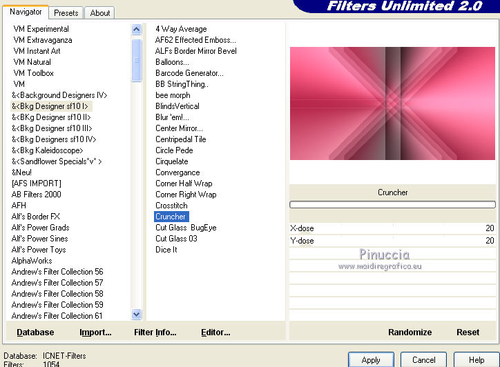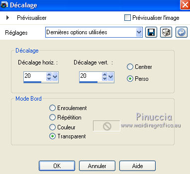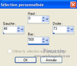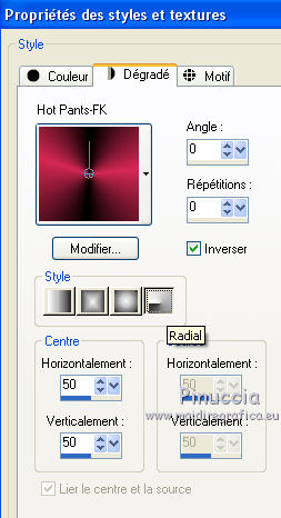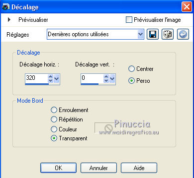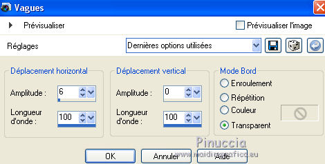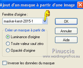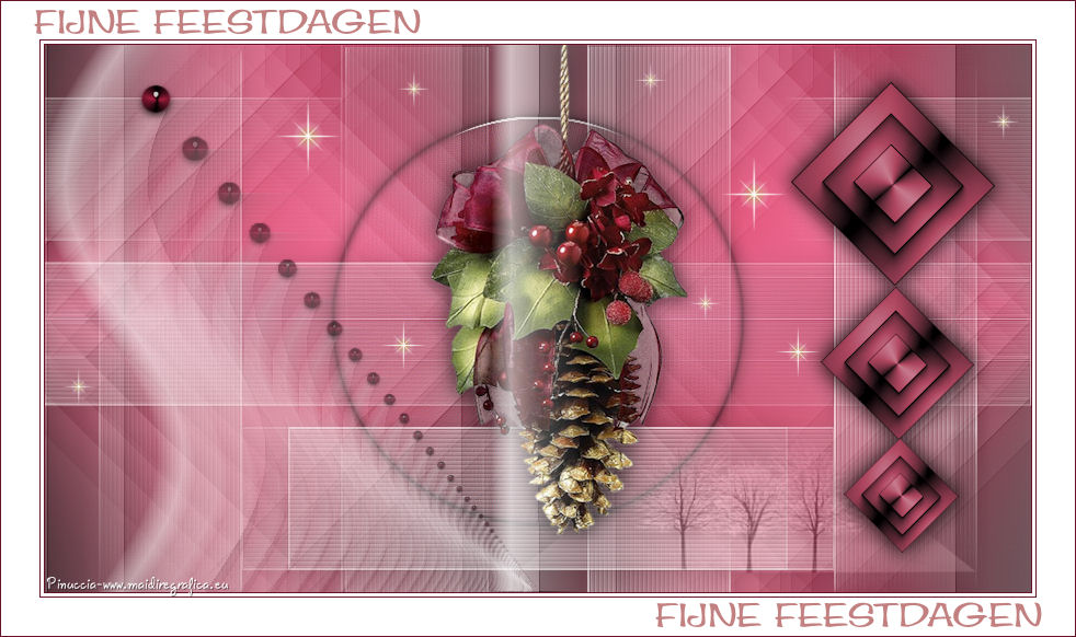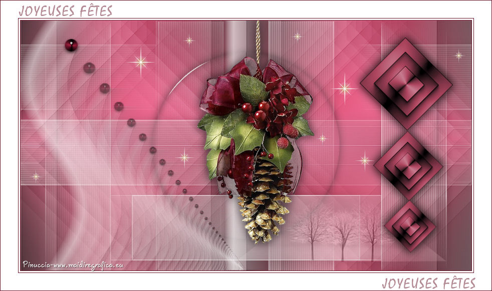 Ce tutoriel a été créé avec CorelX17, mais il peut également être exécuté avec les autres versions. Pour traduire le tutoriel j'ai utilisé CorelX et CorelX2. Suivant la version utilisée, vous pouvez obtenir des résultats différents. Depuis la version X4, la fonction Image>Miroir a été remplacée par Image>Renverser horizontalement, et Image>Renverser avec Image>Renverser verticalement. Dans les versions X5 et X6, les fonctions ont été améliorées par la mise à disposition du menu Objets. Dans la nouvelle version X7, nous avons à nouveau Miroir/Renverser, mais avec autres différences. Voir plus les détails à ce sujet ici Certaines dénominations ont changées entre les versions de PSP. Les plus frequentes dénominations utilisées: ![]() Traduction en italien ici Vos versions ici Nécessaire pour réaliser ce tutoriel: Matériel ici Modules Externes consulter, si nécessaire, ma section de filtre ici Filters Unlimited 2.0 ici &<Bkg Designer sf10I> - Cruncher (à importer dans Unlimited) ici Two Moon - PaperFold ici FM Tile Tools - Blend Emboss ici Alien Skin Eye Candy 5 Impact - Glass ici Filtres Two Moon peuvent être utilisés seuls ou importés dans Filters Unlimited. voir comment le faire ici). Si un filtre est fourni avec cette icône, ![]() Si vous voulez utiliser vos propres couleurs, n'hésitez pas à changer le mode et l'opacité des calques Placer le dégradé Hot Pants-FK dans le dossier Dégradés. Placer ster-1 dans le dossier Tubes à images. Ouvrir le masque dans PSP et le minimiser avec le reste du matériel. 1. Placer en avant plan la couleur #661328, et en arrière plan la couleur #ffffff. ![]() Placer en avant plan Dégradé et sélectionner le dégradé Hot Pants-FK, style Radial. ![]() 2. Ouvrir une nouvelle image transparente 900 x 500 pixels. ![]() Remplir l'image transparente du dégradé.3. Effets>Modules Externes>Filters Unlimited 2.0 - Two Moon - Paperfold, par défaut. ![]() 4. Effets>Modules Externes>Filters Unlimited 2.0 - &<Bkg Designer sfo10I> - Cruncher, par défaut. ![]() 5. Effets>Effets d'image>Mosaïque sans jointures. ![]() 6. À nouveau Effets>Modules Externes>Filters Unlimited 2.0 - &<Bkg Designer sfo10I> - Cruncher, par défaut. ![]() 7. Effets>Modules Externes>FM Tile Tools - Blend Emboss, par défaut. ![]() 8. Activer kerst-deco-1-2015, Édition>Copier. Revenir sur votre travail et Édition>Coller comme nouveau calque. Ne pas déplacer. 9. Effets>Modules Externes>Alien Skin Eye Candy 5 Impact - Glass sélectionner le preset Clear et ok. ![]() 10. Effets>Effets 3D>Ombre portée, couleur noire. ![]() 11. Calques>Nouveau calque raster. Remplir avec la couleur blanche #ffffff.12. Calques>Nouveau calque de masque>A partir d'une image. Ouvrir le menu deroulant sous la fenêtre d'origine et vous verrez la liste des images ouvertes. Sélectionner le masque masker-kerst-2015-1. ![]() Calques>Fusionner>Fusionner le groupe. 13. Effets>Effets 3D>Ombre portée, couleur noire. ![]() Réglage>Netteté>Netteté. 14. Calques>Nouveau calque raster. Activer l'outil Sélection ![]() (peu importe le type de sélection, parce que avec la sélection personnalisée vous obtenez toujours un rectangle), cliquer sur Sélection personnalisée ![]() et setter ces paramètres. ![]() 15. Remplir la sélection avec la couleur blanche #ffffff.Sélections>Désélectionner tout. 16. Effets>Effets de distorsion>Vent - vers la droite, intensité 100. ![]() 17. Effets>Effets de distorsion>Vagues. ![]() 18. Effets>Effets de réflexion>Résonance. ![]() Réglage>Netteté>Davantage de netteté. 19. Activer le tube Kerst-deco-2-2015, Édition>Copier. Revenir sur votre travail et Édition>Coller comme nouveau calque. 20. Effets>Effets d'image>Décalage. ![]() 21. Activer le tube boompjes, Édition>Copier. Revenir sur votre travail et Édition>Coller comme nouveau calque. 22. Effets>Effets d'image>Décalage. ![]() 23. Placer le calque en mode Luminance (héritée) et réduire l'opacité à 65%. 24. Activer le tube kerst-deco-3-2015, Édition>Copier. Revenir sur votre travail et Édition>Coller comme nouveau calque. Ne pas déplacer. 25. Activer le tube kerst-hanger, Édition>Copier. Revenir sur votre travail et Édition>Coller comme nouveau calque. 26. Effets>Effets d'image>Décalage. ![]() 27. Effets>Effets 3D>Ombre portée, couleur noire. ![]() 28. Activer le tube deco-3-2015, Édition>Copier. Revenir sur votre travail et Édition>Coller comme nouveau calque. 29. Effets>Effets d'image>Décalage. ![]() 30. Calques>Nouveau calque raster. Activer l'outil Tubes à images ![]() chercher et sélectionner le tube à images ster-1. ![]() Appliquer deux fois à votre convenance, et après encore avec échelle 35 et échelle 25. 31. Image>Ajouter des bordures, 1 pixel, symétrique, couleur d'avant plan #661328. Image>Ajouter des bordures, 3 pixels, symétrique, couleur d'arrière plan #ffffff. Image>Ajouter des bordures, 1 pixel, symétrique, couleur d'avant plan #661328. Image>Ajouter des bordures, 35 pixels, symétrique, couleur d'arrière plan #ffffff. 32. Activer Tekst, Édition>Copier. Revenir sur votre travail et Édition>Coller comme nouveau calque. Ne pas déplacer. Réduire l'opacité de ce calque à 50%. 33. Signer votre travail sur un nouveau calque. 34. Image>Ajouter des bordures, 1 pixel, symétrique, couleur d'avant plan #661328. Enregistrer en jpg. ![]() ![]() Si vous avez des problèmes, ou des doutes, ou vous trouvez un link modifié, ou seulement pour me dire que ce tutoriel vous a plu, vous pouvez m'écrire. 27 Novembre 2015 |