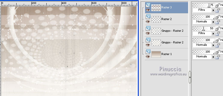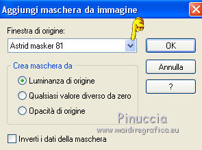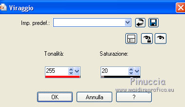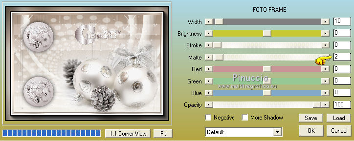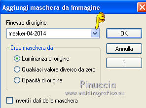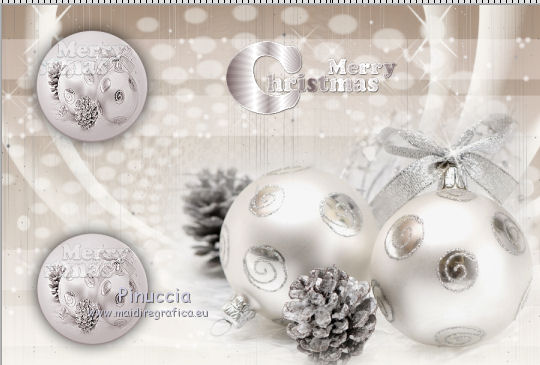 qui puoi trovare qualche risposta ai tuoi dubbi. Se l'argomento che ti interessa non è presente, ti prego di segnalarmelo. Il tutorial può essere eseguito con ogni versione di PSP. Dalla versione X4, il comando Immagine>Rifletti è stato sostituito con Immagine>Capovolgi in orizzontale, e il comando Immagine>Capovolgi con Immagine>Capovolgi in verticale. Nelle versioni X5 e X6, le funzioni sono state migliorate rendendo disponibile il menu Oggetti. Con la nuova versione X7, sono tornati Rifletti/Capovolgi, ma con nuove differenze Vedi la scheda sull'argomento qui Per tradurre questo tutorial ho usato PSP X. traduction en français qui Le vostre versioni qui Occorrente: Materiale qui Filtri in caso di dubbi, ricorda di consultare la mia sezione filtri qui Filters Unlimited 2.0 qui Graphics Plus - Cross Shadow qui AAA Frames - Foto Frame qui I filtri Graphics Plus si possono usare da soli o importati in Filters Unlimited (come fare vedi qui) Se un filtro fornito appare con questa icona ![]() se stai usando altri colori, sperimenta le modalità di miscelatura e opacità più adatte ai tuoi colori Nelle ultime versioni di PSP non c'è il gradiente di primo piano/sfondo. Trovi i gradienti delle versioni precedenti qui Apri le maschere in PSP e minimizzale con il resto del materiale. 1. Imposta il colore di primo piano con #aa9380, e il colore di sfondo con #f5f3ed. ![]() Passa il colore di primo piano a Gradiente di primo piano/sfondo (Corel_06_029), stile Lineare. ![]() 2. Apri una nuova immagine trasparente 900 x 600 pixels, ![]() e riempila con il gradiente.2. Livelli>Nuovo livello raster. Riempi con il colore chiaro di sfondo.3. Livelli>Nuovo livello maschera>Da immagine. Apri il menu sotto la finestra di origine e vedrai la lista dei files aperti. Seleziona la maschera masker-04-2014, con i seguenti settaggi. ![]() Livelli>Unisci>Unisci gruppo. 4. Livelli>Nuovo livello raster. Riempi con il colore chiaro di sfondo.5. Livelli>Nuovo livello maschera>Da immagine. Apri il menu sotto la finestra di origine e selziona la maschera Astrid masker 8.1, con i seguenti settaggi. ![]() Livelli>Unisci>Unisci gruppo. 6. Cambia la modalità di miscelatura di questo livello in Filtra, e abbassa l'opacità al 50%. ![]() 7. Apri deco-2-2014, e vai a Modifica>Copia. Torna al tuo lavoro e vai a Modifica>Incolla come nuovo livello. 8. Apri deco-rand-2014, e vai a Modifica>Copia. Torna al tuo lavoro e vai a Modifica>Incolla come nuovo livello. Cambia la modalità di miscelatura di questo livello in Filtra, e abbassa l'opacità al 75%. ![]() 9. Apri Leny-kerst95, e vai a Modifica>Copia. Torna al tuo lavoro e vai a Modifica>Incolla come nuovo livello. Immagine>Ridimensiona, all'80%, tutti i livelli non selezionato. Sposta il tube in basso a destra.Vedi il mio esempio. 10. Apri kerstballen-2, e vai a Modifica>Copia. Torna al tuo lavoro e vai a Modifica>Incolla come nuovo livello. Sposta il tube un po' più in basso.Vedi il mio esempio. 11. Apri tekst, e vai a Modifica>Copia. Torna al tuo lavoro e vai a Modifica>Incolla come nuovo livello. 12. Regola>Tonalità e saturazione>Viraggio. ![]() Sposta il testo dove preferisci,o vedi il mio esempio. ![]() 13. Immagine>Aggiungi bordatura, 1 pixel, simmetriche, con il colore di primo piano #aa9380. 14. Selezione>Seleziona tutto. 15. Modifica>Copia. 16. Immagine>Aggiungi bordatura, 50 pixels, simmetriche, colore di sfondo #f5f3ed. 17. Effetti>Effetti 3D>Sfalsa ombra, colore nero. ![]() 18. Selezione>Inverti. Modifica>Incolla nella selezione. 19. Regola>Sfocatura>Sfocatura gaussiana - raggio 25. ![]() 20. Effetti>Plugins>Graphics Plus - Cross Shadow. ![]() Selezione>Deseleziona. 21. Effetti>Plugins>AAA Frames - Foto Frame. ![]() 22. Firma il tuo lavoro su un nuovo livello. Livelli>Unisci>Unisci tutto. 23. Immagine>Ridimensiona, a 900 pixels di larghezza, tutti i livelli selezionato. Salva in formato jpg. ![]() Se hai problemi o dubbi, o trovi un link non funzionante, o anche soltanto per un saluto, scrivimi. 22 Dicembre 2014 |