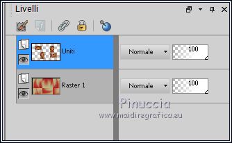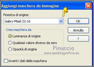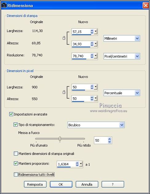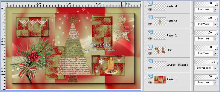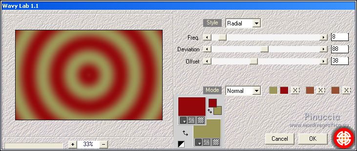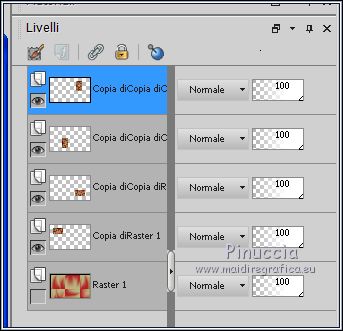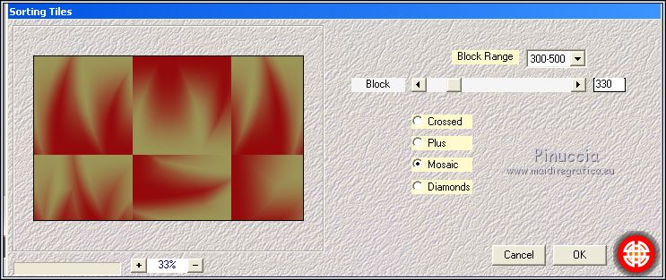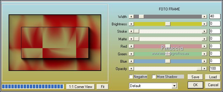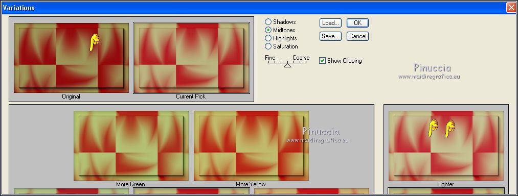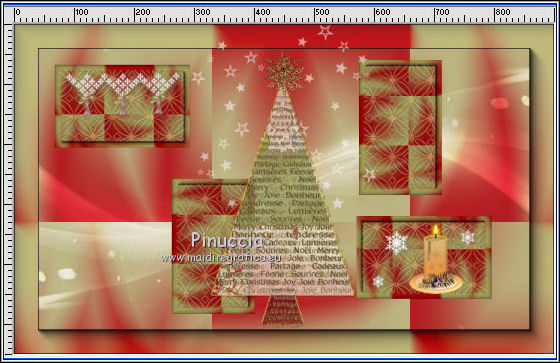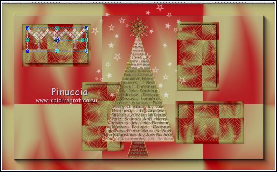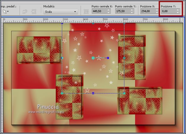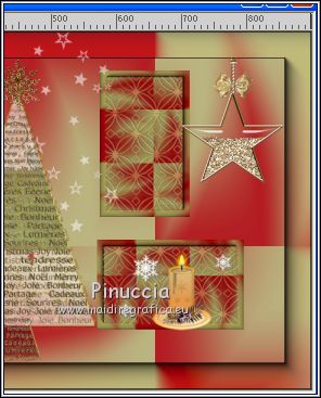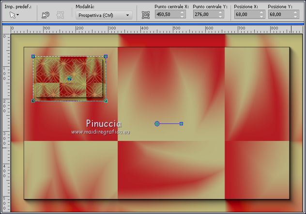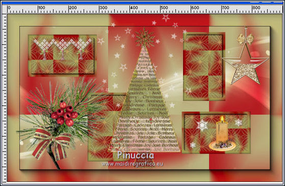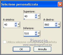 qui puoi trovare qualche risposta ai tuoi dubbi. Se l'argomento che ti interessa non è presente, ti prego di segnalarmelo. Per tradurre il tutorial ho usato Corel X, ma può essere eseguito con ogni versione di PSP. Dalla versione X4, il comando Immagine>Rifletti è stato sostituito con Immagine>Capovolgi in orizzontale, e il comando Immagine>Capovolgi con Immagine>Capovolgi in verticale. Nelle versioni X5 e X6, le funzioni sono state migliorate rendendo disponibile il menu Oggetti. Con la nuova versione X7, sono tornati Rifletti/Capovolgi, ma con nuove differenze Vedi la scheda sull'argomento qui traduzione in francese qui Le vostre versioni qui ![]() Occorrente: Materiale qui Grazie: per la maschera Gabry. (in questa pagina trovi i links ai loro siti). Filtri in caso di dubbi, ricorda di consultare la mia sezione filtri qui Mehdi - Wavy Lab 1.1 qui Mehdi - Sorting Tiles qui AAA Frames - Foto Frame qui Adjust - Variations qui ![]() se stai usando altri colori, sperimenta le modalità di miscelatura e opacità più adatte ai tuoi colori Apri la maschera in PSP e minimizzala con il resto del materiale 1. Imposta il colore di primo piano con il colore #93090c, e il colore di sfondo con #9c9658. ![]() 1. Apri una nuova immagine trasparente 900 x 550 pixels. ![]() 2. Effetti>Plugins>Mehdi - Wavy Lab 1.1 Questo filtro crea gradienti con i colori della paletta: il primo è il colore di sfondo, il secondo quello di primo piano. Mantieni gli ultimi due colori creati dal filtro ![]() 3. Effetti>Plugins>Mehdi - Sorting Tiles. ![]() 4. Effetti>Plugins>AAA Frames - Foto Frame, con i settaggi standard. ![]() 5. Livelli>Duplica. Immagine>Ridimensiona, 2 volte al 50%, tutti i livelli non selezionato. ![]() 6. Apri deco-39 e vai a Modifica>Copia. Torna al tuo lavoro e vai a Modifica>Incolla come nuovo livello. Abbassa l'opacità di questo livello al 40%. 7. Livelli>Unisci>Unisci giù. 8. Attiva il livello Raster 1. Effetti>Plugins>Adjust - Variations un clic su Original per annullare eventuali precedenti settaggi memorizzati dal filtro, 2 clic su Lighter e ok. ![]() 9. Attiva il livello Copia di Raster 1. Tasto K per attivare lo strumento Puntatore ![]() e imposta Posizione X: 68,00 e Posizione Y: 68,00. ![]() 10. Livelli>Duplica. Immagine>Rifletti. Immagine>Capovolgi. Imposta Posizione X: 571,00 e Posizione Y: 320,00. ![]() 11. Livelli>Duplica. Immagine>Ruota per gradi - 90 gradi a destra. ![]() 12. Imposta Posizione X: 263,00 e Posizione Y: 258,00. ![]() 13. Livelli>Duplica. Imposta Posizione X: 575,00 e Posizione Y: 60,00. ![]() Tasto M per deselezionare lo strumento. 14. Chiudi il livello di sfondo (Raster 1). ![]() Livelli>Unisci>Unisci visibile. 15. Riapri il livello Raster 1 e rimani posizionato sul livello superiore. ![]() 16. Apri deco-38 e vai a Modifica>Copia. Torna al tuo lavoro e vai a Modifica>Incolla come nuovo livello. 17. Oggetti>Allinea>Superiore Se stai lavorando con una versione precedente che non rende disponibile il menu Oggetti, attiva lo strumento Puntatore ![]() e imposta Posizione Y a 0,00. ![]() 18. Apri deco-37 e vai a Modifica>Copia. Torna al tuo lavoro e vai a Modifica>Incolla come nuovo livello. Lascialo come sta. 19. Apri deco-41 e vai a Modifica>Copia. Torna al tuo lavoro e vai a Modifica>Incolla come nuovo livello. Sposta / il tube in alto a sinistra.![]() 20. Apri deco-43 e vai a Modifica>Copia. Torna al tuo lavoro e vai a Modifica>Incolla come nuovo livello. Sposta / il tube in basso a destra.![]() 21. Apri hanger-38 e vai a Modifica>Copia. Torna al tuo lavoro e vai a Modifica>Incolla come nuovo livello. Sposta / il tube in alto a destra.![]() 22. Apri deco-40 e vai a Modifica>Copia. Torna al tuo lavoro e vai a Modifica>Incolla come nuovolivello. Sposta / il tube in basso a sinistra.![]() 23. Attiva il livello inferiore, Raster 1. Livelli>Nuovo livello raster. Attiva lo strumento Selezione ![]() (non importa il tipo di selezione impostato, perchè con la selezione personalizzata si ottiene sempre un rettangolo) clicca sull'icona Selezione personalizzata ![]() e imposta i seguenti settaggi. ![]() Imposta il colore di primo piano con il colore bianco #ffffff. Riempi la selezione con il colore bianco #ffffff.24. Livelli>Nuovo livello maschera>Da immagine. Apri il menu sotto la finestra di origine e vedrai la lista dei files aperti. Seleziona la maschera Gabry-Mask 22-17 ![]() Livelli>Duplica. Livelli>Unisci>Unisci gruppo. Selezione>Deseleziona. 25. Cambia la modalità di miscelatura di questo livello in Sovrapponi, e abbassa l'opacità al 75%. ![]() 26. Attiva il livello superiore. Firma il tuo lavoro su un nuovo livello. 27. Immagine>Aggiungi bordatura, 1 pixel, simmetriche, colore nero. Salva in formato jpg. ![]() ![]() Se hai problemi o dubbi, o trovi un link non funzionante, o anche soltanto per un saluto, scrivimi. 9 Novembre 2018 |