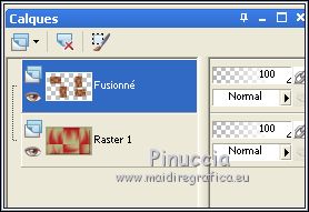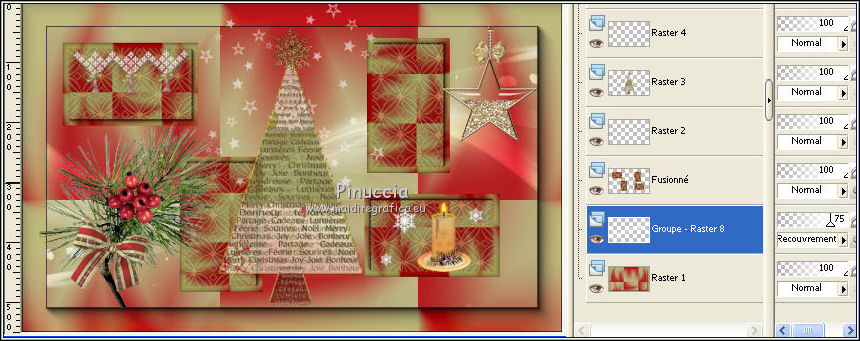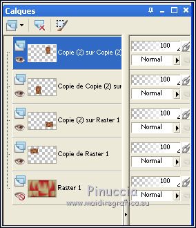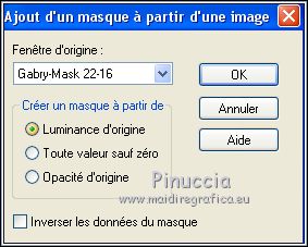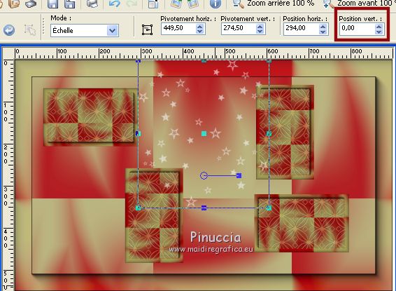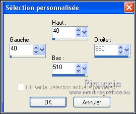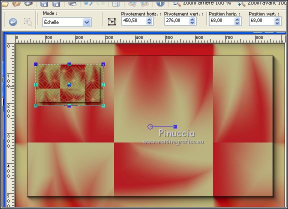 Ce tutoriel a été créé avec CorelX17, mais il peut également être exécuté avec les autres versions. Pour traduire le tutoriel j'ai utilisé CorelX17 pour l'italien et CorelX2 pour le français. Suivant la version utilisée, vous pouvez obtenir des résultats différents. Depuis la version X4, la fonction Image>Miroir a été remplacée par Image>Renverser horizontalement, et Image>Renverser avec Image>Renverser verticalement. Dans les versions X5 et X6, les fonctions ont été améliorées par la mise à disposition du menu Objets. Dans la nouvelle version X7, nous avons à nouveau Miroir/Renverser, mais avec autres différences. Voir plus les détails à ce sujet ici Certaines dénominations ont changées entre les versions de PSP. Les plus frequentes dénominations utilisées: ![]() Traduction en italien ici Vos versions ici ![]() Nécessaire pour réaliser ce tutoriel: Matériel qui Merci Gabry pour le masque. (les liens des sites des tubeuses ici) Modules Externes consulter, si nécessaire, ma section de filtre ici Mehdi - Wavy Lab 1.1. ici Mehdi - Sorting Tiles ici AAA Frames - Foto Frame ici Adjust - Variations ici ![]() Si vous voulez utiliser vos propres couleurs, n'hésitez pas à changer le mode et l'opacité des calques Ouvrir le masque dans PSP et le minimiser avec le reste du matériel. Placer en avant plan la couleur #93090c, et en arrière plan #9c9658. ![]() 1. Ouvrir une nouvelle image transparente 900 x 550 pixels. ![]() 2. Effets>Modules Externes>Mehdi - Wavy lab 1.1 Ce filtre crée des dégradés avec les couleurs de votre palette: la première est la couleur d'arrière plan, la deuxième est la couleur d'avant plan. Garder les autres deux couleurs créées par le filtre ![]() 3. Effets>Modules Externes>Mehdi - Sorting Tiles. ![]() 4. Effets>Modules Externes>AAA Frames - Foto Frame, par défaut. ![]() 5. Calques>Dupliquer. Image>Redimensionner, 2 fois à 50%, redimensionner tous les calques décoché. ![]() 6. Ouvrir deco-39 - Édition>Copier. Revenir sur votre travail et Édition>Coller comme nouveau calque. Réduire l'opacité de ce calque à 40%. 7. Calques>Fusionner>Fusionner le calque de dessous. Effets>Modules Externes>Adjust - Variations. un clic sur Original pour annuler précédents réglages memorisés par le filtre, deux clic sur Lighter et ok. ![]() 9. Vous positionner sur le calque Copie de Raster 1. Touche K pour activer l'outil Sélecteur ![]() et placer Position horiz.: 68,00 et Position vert.: 68,00 ![]() 10. Calques>Dupliquer. Image>Miroir. Image>Renverser. Placer Position horiz.: 571,00 et Position vert.: 320,00. ![]() 11. Calques>Dupliquer. Image>Rotation libre - 90 degrés à droite. ![]() 12. Placer Position horiz.: 263,00 et Position vert.: 258,00. ![]() 13. Calques>Dupliquer. Placer Position horiz.: 575,00 et Position vert.: 60,00. ![]() Touche M pour désélectionner l'outil. 14. Fermer le calque d'arrière plan (Raster 1). ![]() Calques>Fusionner>Calques visibles. 15. Re-ouvrir le calque Raster 1 et rester positionné sur le calque du haut Fusionné ![]() 16. Ouvrir deco-38 - Édition>Copier. Revenir sur votre travail et Édition>Coller comme nouveau calque. 17. Objets>Aligner>Haut Si vous travaillez avec une version précédente qui ne rends pas disponible le menu Objets, activer l'outil Sélecteur ![]() et placer Position vert. à 0,00. ![]() 18. Ouvrir deco-37 - Édition>Copier. Revenir sur votre travail et Édition>Coller comme nouveau calque. Ne pas déplacer. 19. Ouvrir deco-41 - Édition>Copier. Revenir sur votre travail et Édition>Coller comme nouveau calque. Déplacer / le tube en haut à gauche.![]() 20. Ouvrir deco-43 - Édition>Copier. Revenir sur votre travail et Édition>Coller comme nouveau calque. Déplacer / le tube en bas à droite.![]() 21. Ouvrir hanger-38 - Édition>Copier. Revenir sur votre travail et Édition>Coller comme nouveau calque. Déplacer / le tube en haut à droite.![]() 22. Ouvrir deco-40 - Édition>Copier. Revenir sur votre travail et Édition>Coller comme nouveau calque. Déplacer / le tube en bas à gauche.![]() 23. Vous positionner sur le calque du haut de la pile, Raster 1. Calques>Nouveau calque raster. Activer l'outil Sélection ![]() (peu importe le type de sélection, parce que avec la sélection personnalisée vous obtenez toujours un rectangle), cliquer sur Sélection personnalisée ![]() et setter ces paramètres. ![]() Placer en avant plan la couleur blanche #ffffff. Remplir la sélection avec la couleur blanche #ffffff.24. Calques>Nouveau calque de masque>A partir d'une image. Ouvrir le menu deroulant sous la fenêtre d'origine et vous verrez la liste des images ouvertes. Sélectionner le masque Gabry-Mask 22-17. ![]() Calques>Dupliquer. Calques>Fusionner>Fusionner le groupe. Sélections>Désélectionner tout. 25. Placer le calque en mode Recouvrement et réduire l'opacité à 75%. ![]() 26. Vous positionner sur le calque du haut de la pile. Signer votre travail sur un nouveau calque. 27. Image>Ajouter des bordures, 1 pixel, symétrique, couleur noire. Enregistrer en jpg. ![]() ![]() Si vous avez des problèmes, ou des doutes, ou vous trouvez un link modifié, ou seulement pour me dire que ce tutoriel vous a plu, vous pouvez m'écrire. 10 Novembre |