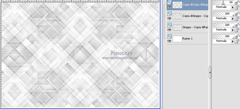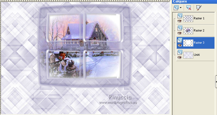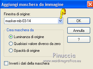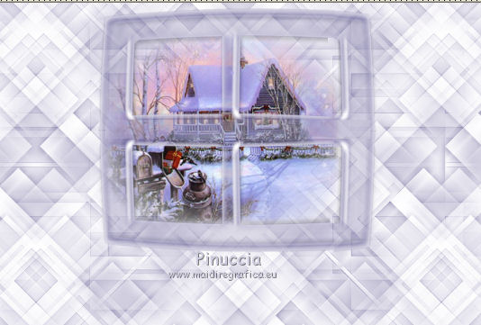 qui puoi trovare qualche risposta ai tuoi dubbi. Se l'argomento che ti interessa non è presente, ti prego di segnalarmelo. Il tutorial può essere eseguito con ogni versione di PSP. Dalla versione X4, il comando Immagine>Rifletti è stato sostituito con Immagine>Capovolgi in orizzontale, e il comando Immagine>Capovolgi con Immagine>Capovolgi in verticale. Nelle versioni X5 e X6, le funzioni sono state migliorate rendendo disponibile il menu Oggetti. Con la nuova versione X7, sono tornati Rifletti/Capovolgi, ma con nuove differenze Vedi la scheda sull'argomento qui Per tradurre questo tutorial ho usato PSP X. traduction en français qui Le vostre versioni qui Occorrente: Materiale qui Filtri in caso di dubbi, ricorda di consultare la mia sezione filtri qui Filters Unlimited 2.0 qui Simple - Diamonds qui I filtri Simple si possono usare da soli o importati in Filters Unlimited (come fare vedi qui) Se un filtro fornito appare con questa icona ![]() se stai usando altri colori, sperimenta le modalità di miscelatura e opacità più adatte ai tuoi colori Apri la maschera in PSP e minimizzala con il resto del materiale. 1. Imposta il colore di primo piano con il colore bianco #ffffff, e il colore di sfondo con #e8e6f0. ![]() Apri una nuova immagine trasparente 900 x 600 pixels, ![]() e riempila con il colore bianco di primo piano.2. Livelli>Duplica. 3. Livelli>Nuovo livello maschera>Da immagine. Apri il menu sotto la finestra di origine e vedrai la lista dei files aperti. Seleziona la maschera masker-mb-03-14, con i seguenti settaggi. ![]() Livelli>Unisci>Unisci gruppo. non preoccuparti se ti sembra di non vedere il risultato della maschera 4. Effetti>Effetti 3D>Sfalsa ombra, colore nero. ![]() 5. Livelli>Duplica. Effetti>Plugins>Simple - Diamonds. 6. Livelli>Duplica. Immagine>Rifletti. Abbassa l'opacità di questo livello al 50%. ![]() 7. Livelli>Unisci>Unisci visibile. 8. Apri raam, e vai a Modifica>Copia. Torna al tuo lavoro e vai a Modifica>Incolla come nuovo livello. Sposta la cornice un po' più in alto.9. Regola>Tonalità e saturazione>Viraggio. ![]() per il mio esempio ho ripetuto il viraggio anche sul livello inferiore 10. Apri winter-misted-3, e vai a Modifica>Copia. Torna al tuo lavoro e vai a Modifica>Incolla come nuovo livello. Sposta l'immagine sulla cornice.Livelli>Disponi>Sposta giù. ![]() 11. Attiva lo strumento Selezione ![]() (non importa il tipo di selezione impostato, perchè con la selezione personalizzata si ottiene sempre un rettangolo) clicca sull'icona Selezione personalizzata ![]() e imposta i seguenti settaggi. ![]() 12. Livelli>Nuovo livello raster. Riempi con il colore bianco.Selezione>Deseleziona. 13. Posiziona il rettangolo bianco sopra la cornice.![]() Livelli>Disponi>Sposta giù (il livello bianco deve fare da sfondo all'immagine). ![]() 14. Attiva il livello superiore. Livelli>Unisci>Unisci giù - 2 volte. Eventualmente, aggiungi un Effetto Sfalsa ombra. Per il mio esempio ho usato i settaggi precedenti. 15. Scegli una delle due decorazioni fornite con il materiale (deco-2-03-2014 o deco-1-3-2014). Modifica>Copia. Torna al tuo lavoro e vai a Modifica>Incolla come nuovo livello. Sposta il tube sotto la cornice.Vedi il mio esempio. 16. Effetti>Effetti 3D>Sfalsa ombra, colore nero. ![]() 17. Immagine>Aggiungi bordatura, 2 pixels, simmetriche, colore #33266d. 18. Selezione>Seleziona tutto. Immagine>Aggiungi bordatura, 75 pixels, simmetriche, colore bianco #ffffff. 19. Effetti>Effetti 3D>Sfalsa ombra, colore nero. ![]() Selezione>Deseleziona. 20. Apri rand-kerst-mb-03-2014, e vai a Modifica>Copia. Torna al tuo lavoro e vai a Modifica>Incolla come nuovo livello. nel materiale trovi la mia cornice con il testo in italiano 21. Immagine>Aggiungi bordatura, 2 pixels, simmetriche, colore #33266d. 22. Aggiungi il tuo nome su un nuovo livello. Livelli>Unisci>Unisci tutto. 23. Immagine>Ridimensiona, a 900 pixels di larghezza, tutti i livelli selezionato. Salva in formato jpg. ![]() Se hai problemi o dubbi, o trovi un link non funzionante, o anche soltanto per un saluto, scrivimi. 22 Dicembre 2014 |