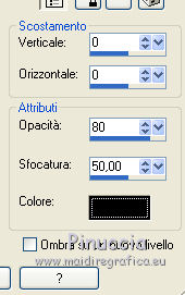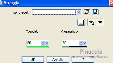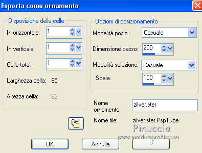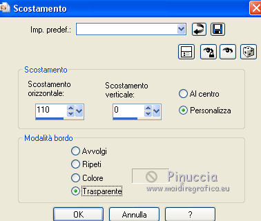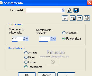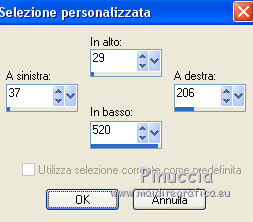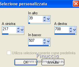 qui puoi trovare qualche risposta ai tuoi dubbi. Se l'argomento che ti interessa non è presente, ti prego di segnalarmelo. Per tradurre questo tutorial ho usato Corel X, ma può essere eseguito con ogni versione di PSP. Dalla versione X4, il comando Immagine>Rifletti è stato sostituito con Immagine>Capovolgi in orizzontale, e il comando Immagine>Capovolgi con Immagine>Capovolgi in verticale. Nelle versioni X5 e X6, le funzioni sono state migliorate rendendo disponibile il menu Oggetti. Con la nuova versione X7, sono tornati Rifletti/Capovolgi, ma con nuove differenze Vedi la scheda sull'argomento qui traduction en français qui Occorrente: Materiale qui Tube di Gerry. Filtri in caso di dubbi, ricorda di consultare la mia sezione filtri qui Filters Unlimited 2.0 qui AAA Frames - Foto Frame qui ![]() se stai usando altri colori, sperimenta le modalità di miscelatura e opacità più adatte ai tuoi colori 1. Imposta il colore di primo piano con #b22427, e il colore di sfondo con #214527. ![]() 2. Apri una nuova immagine trasparente 760 x 550 pixels, e riempila con il colore rosso di primo piano.3. Livelli>Duplica. Immagine>Ridimensiona, al 90%, tutti i livelli non selezionato. 4. Effetti>Plugins>Filters Unlimited 2.0 - Paper Textures - Japanese Paper, con i settaggi standard. ![]() 5. Attiva lo strumento Selezione ![]() (non importa il tipo di selezione impostato, perchè con la selezione personalizzata si ottiene sempre un rettangolo) clicca sull'icona Selezione personalizzata ![]() e imposta i seguenti settaggi. ![]() Selezione>Innalza selezione a livello. Selezione>Deseleziona. 6. Effetti>Effetti 3D>Smusso a incasso. ![]() 7. Attiva il livello copia di raster 1. Selezione personalizzata ![]() ![]() Selezione>Innalza selezione a livello. Selezione>Deseleziona. 8. Effetti>Effetti 3D>Smusso a incasso, con i settaggi precedenti. ![]() 9. Attiva nuovamente il livello copia di Raster 1. Effetti>Effetti 3D>Sfalsa ombra, colore nero. ![]() 10. Attiva il livello superiore. Apri deco-2.pspimage, e vai a Modifica>Copia. Torna al tuo lavoro e vai a Modifica>Incolla come nuovo livello. Effetti>Effetti di immagine>Scostamento. ![]() Regola>Tonalità e saturazione>Viraggio, con i settaggi precedenti. ![]() 11. Apri deco-3.pspimage e vai a Modifica>Copia. Torna al tuo lavoro e vai a Modifica>Incolla come nuovo livello. Regola>Tonalità e saturazione>Viraggio, con i settaggi precedenti. ![]() Effetti>Effetti di immagine>Scostamento. ![]() 12. Apri sneeuwpop-23 e vai a Modifica>Copia. Torna al tuo lavoro e vai a Modifica>Incolla come nuovo livello. Immagine>Ridimensiona, al 30%, tutti i livelli non selezionato. Regola>Messa a fuoco>Metti a fuoco. Spostalo nel primo cerchio in alto a sinistra.13. Apri kerstbal-53.pspimage e vai a Modifica>Copia. Torna al tuo lavoro e vai a Modifica>Incolla come nuovo livello. Immagine>Ridimensiona, al 35%, tutti i livelli non selezionato. Regola>Messa a fuoco>Metti a fuoco. Spostalo nel secondo cerchio.14. Apri deco-4.pspimage e vai a Modifica>Copia. Torna al tuo lavoro e vai a Modifica>Incolla come nuovo livello. Spostalo nel terzo cerchio.15. Apri deco-5.pspimage e vai a Modifica>Copia. Torna al tuo lavoro e vai a Modifica>Incolla come nuovo livello. Spostalo nel primo cerchio in basso a sinistra.16. Apri deco-6.pspimage e vai a Modifica>Copia. Torna al tuo lavoro e vai a Modifica>Incolla come nuovo livello. Spostalo nel secondo cerchio.17. Apri JHanna_626 tube.pspimage e vai a Modifica>Copia. Torna al tuo lavoro e vai a Modifica>Incolla come nuovo livello. Immagine>Ridimensiona, al 20%, tutti i livelli non selezionato. Regola>Messa a fuoco>Metti a fuoco. Spostalo nel terzo cerchio in basso.18. Apri kerstdeco-8.pspimage e vai a Modifica>Copia. Torna al tuo lavoro e vai a Modifica>Incolla come nuovo livello. Spostalo in basso a sinistra.19. Apri zilver-ster.pspimage. File>Esporta>Come Ornamento, assegna un nome all'ornamento e ok. ![]() 20. Livelli>Nuovo livello raster. Attiva lo strumento Ornamento ![]() Cerca e seleziona l'ornamento esportato, e applicalo a sinistra - vedi il mio esempio - con scala 100 e 30. ![]() 21. Cerca e seleziona l'ornamento Metallico - scala 20 (questo ornamento è standard in PSP; nelle versioni più recenti Corel_10_005 o Corel_10_007). ![]() Applicalo sulle palline in alto. ![]() 22. Apri deco-kerst-10 e vai a Modifica>Copia. Torna al tuo lavoro e vai a Modifica>Incolla come nuovo livello. Effetti>Effetti di immagine>Scostamento. ![]() 23. Immagine>Aggiungi bordatura, 2 pixels, simmetriche, colore verde. Selezione>Seleziona tutto. Immagine>Aggiungi bordatura, 50 pixels, simmetriche, colore rosso. Selezione>Inverti. 24. Regola>Aggiungi/Rimuovi disturbo>Aggiungi disturbo. ![]() 25. Selezione>Inverti. Effetti>Plugins>AAA Frames - Foto Frame. ![]() Selezione>Deseleziona. 26. Effetti>Plugins>AAA Frames - Foto Frame. ![]() 27. Livelli>Nuovo livello raster. Attiva lo strumento Ornamento ![]() cerca e seleziona l'ornamento zilver-ster, scala 100, e applicalo sugli angoli del bordo interno. ![]() 27. Firma il tuo lavoro su un nuovo livello. Salva in formato jpg. ![]() Se hai problemi o dubbi, o trovi un link non funzionante, o anche soltanto per un saluto, scrivimi. 14 Dicembre 2015 |