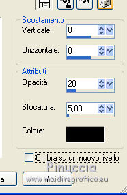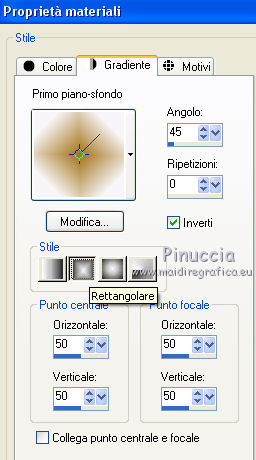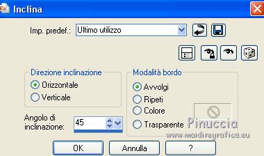 qui puoi trovare qualche risposta ai tuoi dubbi. Se l'argomento che ti interessa non è presente, ti prego di segnalarmelo. Il tutorial è stato creato con CorelX17, ma può essere eseguito con ogni versione di PSP. Dalla versione X4, il comando Immagine>Rifletti è stato sostituito con Immagine>Capovolgi in orizzontale, e il comando Immagine>Capovolgi con Immagine>Capovolgi in verticale. Nelle versioni X5 e X6, le funzioni sono state migliorate rendendo disponibile il menu Oggetti. Con la nuova versione X7, sono tornati Rifletti/Capovolgi, ma con nuove differenze Vedi la scheda sull'argomento qui Per tradurre questo tutorial ho usato PSP X. traduction en français qui Le vostre versioni qui Occorrente: Materiale qui Filtri in caso di dubbi, ricorda di consultare la mia sezione filtri qui Filters Unlimited 2.0 qui Filter Factory Gallery D - Dimensia qui I filtri Factory Gallery si possono usare da soli o importati in Filters Unlimited (come fare vedi qui) Se un filtro fornito appare con questa icona Circola in rete una versione di Unlimited che non si installa ed è formata da files in formato 8bf, che può dare risultati differenti. Non essendoci regole codificate, ci si può accorgere di queste differenze soltanto confrontando i propri con i risultati del tutorial che si sta eseguendo. ![]() se stai usando altri colori, sperimenta le modalità di miscelatura e opacità più adatte ai tuoi colori Nelle ultime versioni di PSP non c'è il gradiente di primo piano/sfondo (Corel_06_029) Trovi i gradienti delle versioni precedenti qui 1. Imposta il colore di primo piano con #f7f6f7, e il colore di sfondo con #a47317. ![]() Passa il colore di primo piano a Gradiente di primo piano/sfondo, stile Rettangolare. ![]() 2. Apri una nuova immagine trasparente 900 x 600 pixels. ![]() Riempi l'immagine trasparente con il gradiente.3. Selezione>Seleziona tutto. Apri il tube jixb89ck_zps9ab4410b, e vai a Modifica>Copia. non chiuderlo perchè ti servirà ancora Torna al tuo lavoro e vai a Modifica>Incolla nella selezione. Selezione>Deseleziona. 4. Effetti>Effetti di immagine>Motivo unico. ![]() Effetti>Effetti di bordo>Aumenta. 5. Effetti>Plugins>Filters Unlimited 2.0 - Filter Factory Gallery D - Dimensia. ![]() Effetti>Effetti di bordo>Aumenta di più. 6. Livelli>Nuovo livello raster. Attiva lo strumento Selezione ![]() (non importa il tipo di selezione impostato, perchè con la selezione personalizzata si ottiene sempre un rettangolo) clicca sull'icona Selezione personalizzata ![]() e imposta i seguenti settaggi. ![]() Riempi con il colore di sfondo #a47317.7. Selezione>Modifica>Contrai - 2 pixels. Premi sulla tastiera il tasto CANC ![]() Selezione>Deseleziona. 8. Livelli>Duplica. Effetti>Effetti geometrici>Inclina. ![]() 9. Livelli>Duplica. Immagine>Rifletti. Livelli>Unisci>Unisci giù - 2 volte. 10. Chiudi il livello Raster 1 e rimani posizionato sul livello superiore. Attiva lo strumento Bacchetta magica , sfumatura e tolleranza 0,e clicca al centro della forma per selezionarla. ![]() 11. Livelli>Nuovo livello raster. Apri il tube misted-tube-landschap, e vai a Modifica>Copia. Torna al tuo lavoro e vai a Modifica>Incolla nella selezione. Cambia la modalità di miscelatura di questo livello in Moltiplica, e abbassa l'opacità al 55%. ![]() Selezione>Deseleziona. 12. Effetti>Effetti 3D>Sfalsa ombra, colore nero. ![]() 13. Riapri il livello inferiore e rimani posizionato sul livello superiore. 14. Apri il tube hertje, e vai a Modifica>Copia. Torna al tuo lavoro e vai a Modifica>Incolla come nuovo livello. Posiziona il tube nel paesaggio.![]() 15. Effetti>Effetti 3D>Sfalsa ombra, colore nero. ![]() 16. Apri il tube tak, e vai a Modifica>Copia. Torna al tuo lavoro e vai a Modifica>Incolla come nuovo livello. Immagine>Rifletti. Spostalo a sinistra, vedi il mio esempio.17. Effetti>Effetti 3D>Sfalsa ombra, colore nero. ![]() 18. Apri il tube eekhoorntje, e vai a Modifica>Copia. Torna al tuo lavoro e vai a Modifica>Incolla come nuovo livello. Spostalo in basso a sinistra.![]() 19. Effetti>Effetti 3D>Sfalsa ombra, colore nero. ![]() 20. Apri il tube denneappel, e vai a Modifica>Copia. Torna al tuo lavoro e vai a Modifica>Incolla come nuovo livello. Spostalo in basso.21. Effetti>Effetti 3D>Sfalsa ombra, colore nero. ![]() 22. Apri il tube vogeltjes, e vai a Modifica>Copia. Torna al tuo lavoro e vai a Modifica>Incolla come nuovo livello. Spostalo in basso, sulle ghiande.![]() Effetti>Effetti 3D>Sfalsa ombra, colore nero. ![]() 23. Livelli>Duplica. Immagine>Ridimensiona, al 75%, tutti i livelli non selezionato. Regola>Messa a fuoco>Metti a fuoco. Spostalo in basso a sinistra, sul tronco.![]() 24. Attiva nuovamente il tube jixb89ck_zps9ab4410b, e vai a Modifica>Copia. Torna al tuo lavoro e vai a Modifica>Incolla come nuovo livello. Immagine>Ridimensiona, al 65%, tutti i livelli non selezionato. Effetti>Effetti 3D>Sfalsa ombra, colore nero. ![]() Effetti>Effetti di bordo>Aumenta. Spostalo in basso a destra.![]() 25. Apri il tube siertakje, e vai a Modifica>Copia. Torna al tuo lavoro e vai a Modifica>Incolla come nuovo livello. Spostalo in alto a sinistra.26. Effetti>Effetti 3D>Sfalsa ombra, colore nero. ![]() Cambia la modalità di miscelatura di questo livello in Luminanza (esistente). 27. Apri il tube Tekst_White Christmas (o scrivi un tuo testo), e vai a Modifica>Copia. Torna al tuo lavoro e vai a Modifica>Incolla come nuovo livello. Spostalo dove preferisci, o vedi il mio esempio.28. Immagine>Aggiungi bordatura, 1 pixel, simmetriche, colore scuro di sfondo. Immagine>Aggiungi bordatura, 10 pixels, simmetriche, colore chiaro di primo piano. Immagine>Aggiungi bordatura, 1 pixel, simmetriche, colore scuro di sfondo. 29. Selezione>Seleziona tutto. 30. Modifica>Copia. 31. Immagine>Aggiungi bordatura, 50 pixels, simmetriche, colore chiaro di primo piano. Selezione>Inverti. 32. Modifica>Incolla nella selezione. 33. Regola>Sfocatura>Sfocatura gaussiana - raggio 50. ![]() 34. Effetti>Plugins>Filters Unlimited 2.0 - Filt