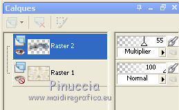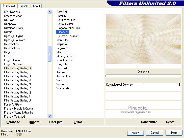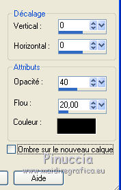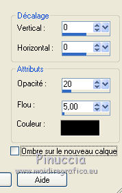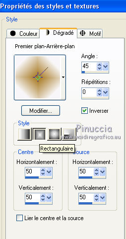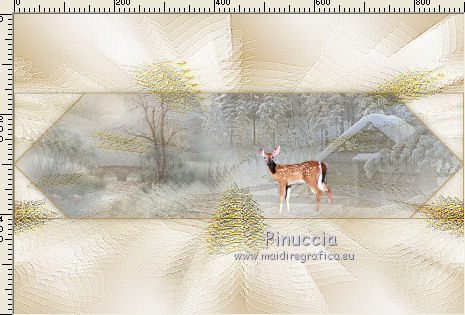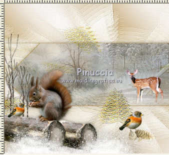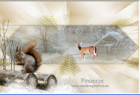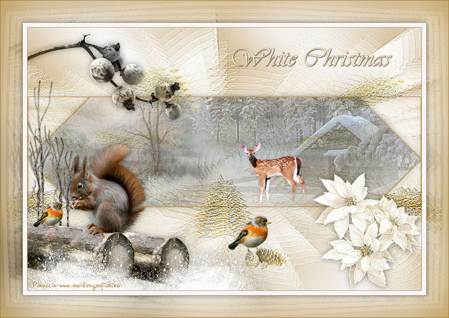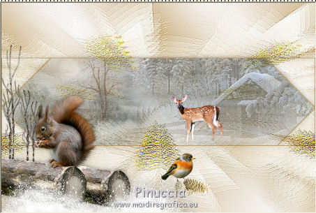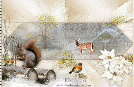 Ce tutoriel a été créé avec CorelX17, mais il peut également être exécuté avec les autres versions. Pour traduire le tutoriel j'ai utilisé CorelX et CorelX2. Suivant la version utilisée, vous pouvez obtenir des résultats différents. Depuis la version X4, la fonction Image>Miroir a été remplacée par Image>Renverser horizontalement, et Image>Renverser avec Image>Renverser verticalement. Dans les versions X5 et X6, les fonctions ont été améliorées par la mise à disposition du menu Objets. Dans la nouvelle version X7, nous avons à nouveau Miroir/Renverser, mais avec autres différences. Voir plus les détails à ce sujet ici Certaines dénominations ont changées entre les versions de PSP. Les plus frequentes dénominations utilisées: ![]() Traduction en italien ici Vos versions ici Nécessaire pour réaliser ce tutoriel: Matériel ici Modules Externes consulter, si nécessaire, ma section de filtre ici Filters Unlimited 2.0 ici Filter Factory Gallery D - Dimensia ici Filtres Two Moon peuvent être utilisés seuls ou importés dans Filters Unlimited. voir comment le faire ici). Si un filtre est fourni avec cette icône, Sur le net il est partagé une version du filtre sans installation, qui se compose de files en format .8bf. Parfois, il arrive que le résultat est différent, mais il n'y a pas de règles codifiées: les causes peuvent être variées. Pour cette raison, ces différences peuvent être trouvées seulement avec l'utilisation et la comparaison avec les captures du tutoriel original. ![]() Si vous voulez utiliser vos propres couleurs, n'hésitez pas à changer le mode et l'opacité des calques Dans les plus récentes versions de PSP, vous ne trouvez pas le dégradé d'avant plan/arrière plan ou Corel_06_029. Vous pouvez utiliser le dégradé des versions antérieures. Ici le dossier Dégradés de CorelX. 1. Placer en avant plan la couleur #f7f6f7, et en arrière plan la couleur #a47317. ![]() Préparer en avant plan un dégradé de premier plan/arrière plan, style Rectangulaire. ![]() 2. Ouvrir une nouvelle image transparente 900 x 600 pixels. ![]() Remplir l'image transparente du dégradé.3. Sélections>Sélectionner tout. Ouvrir le tube jixb89ck_zps9ab4410b, Édition>Copier. ne pas fermer le tube; on va s'en servir plus tard Revenir sur votre travail et Édition>Coller dans la sélection. Sélections>Désélectionner tout. 4. Effets>Effets d'image>Mosaïque sans jointures. ![]() Effets>Effets de bords>Accentuer. 5. Effets>Modules Externes>Filters Unlimited 2.0 - Filter Factory Gallery D - Dimensia. ![]() Effets>Effets de bords>Accentuer davantage. 6. Calques>Nouveau calque raster. Activer l'outil Sélection ![]() (peu importe le type de sélection, parce que avec la sélection personnalisée vous obtenez toujours un rectangle), cliquer sur Sélection personnalisée ![]() et setter ces paramètres. ![]() Remplir avec la couleur d'arrière plan #a47317.7. Sélections>Modifier>Contracter - 2 pixels. Presser CANC sur le clavier ![]() Sélections>Désélectionner tout. 8. Calques>Dupliquer. Effets>Effets géométriques>Inclinaison. ![]() 9. Calques>Dupliquer. Image>Miroir. Calques>Fusionner>Fusionner le calque de dessous - 2 fois. 10. Fermer le calque Raster 1 et rester positionné sur le calque de dessus. Activer l'outil Baguette magique , tolérance et progressivité 0,et cliquer au centre de la figure pour la sélectionner. ![]() 11. Calques>Nouveau calque raster. Ouvrir le tube misted-tube-landschap, Édition>Copier. Revenir sur votre travail et Édition>Coller dans la sélection. Placer le calque en mode Multiplier et réduire l'opacité à 55%. ![]() Sélections>Désélectionner tout. 12. Effets>Effets 3D>Ombre portée, couleur noire. ![]() 13. Re-ouvrir le calque du bas de la pile et rester positionner sur le calque du haut. 14. Ouvrir le tube hertje, Édition>Copier. Revenir sur votre travail et Édition>Coller comme nouveau calque. Positionner le tube dans le paysage.![]() 15. Effets>Effets 3D>Ombre portée, couleur noire. ![]() 16. Ouvrir le tube tak, Édition>Copier. Revenir sur votre travail et Édition>Coller comme nouveau calque. Image>Miroir. Déplacer le tube à gauche, voir mon exemple.17. Effets>Effets 3D>Ombre portée, couleur noire. ![]() 18. Ouvrir le tube eekhoorntje, Édition>Copier. Revenir sur votre travail et Édition>Coller comme nouveau calque. Déplacer le tube en bas à gauche.![]() 19. Effets>Effets 3D>Ombre portée, couleur noire. ![]() 20. Ouvrir le tube denneappel, Édition>Copier. Revenir sur votre travail et Édition>Coller comme nouveau calque. Déplacer le tube en bas.21. Effets>Effets 3D>Ombre portée, couleur noire. ![]() 22. Ouvrir le tube vogeltjes, Édition>Copier. Revenir sur votre travail et Édition>Coller comme nouveau calque. Déplacer le tube en bas.![]() Effets>Effets 3D>Ombre portée, couleur noire. ![]() 23. Calques>Dupliquer. Image>Redimensionner, à 75%, redimensionner tous les calques décoché. Réglage>Netteté>Netteté. Déplacer le tube en bas à gauche.![]() 24. Activer à nouveau le tube jixb89ck_zps9ab4410b, Édition>Copier. Revenir sur votre travail et Édition>Coller comme nouveau calque. Image>Redimensionner, à 65%, redimensionner tous les calques décoché. Effets>Effets 3D>Ombre portée, couleur noire. ![]() Effets>Effets de bords>Accentuer. Déplacer le tube en bas à droite.![]() 25. Ouvrir le tube siertakje, Édition>Copier. Revenir sur votre travail et Édition>Coller comme nouveau calque. Déplacer en haut à gauche.26. Effets>Effets 3D>Ombre portée, couleur noire. ![]() Placer le calque en mode Luminance (héritée). 27. Ouvrir le tube Tekst_White Christmas (ou écrivez votre texte), Édition>Copier. Revenir sur votre travail et Édition>Coller comme nouveau calque. Déplacer à votre convenance, ou voir mon exemple.28. Image>Ajouter des bordures, 1 pixel, symétrique, couleur foncée d'arrière plan. Image>Ajouter des bordures, 10 pixels, symétrique, couleur claire d'avant plan. Ima