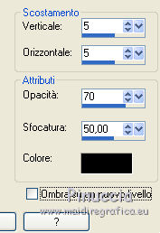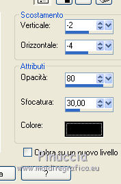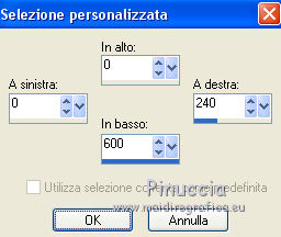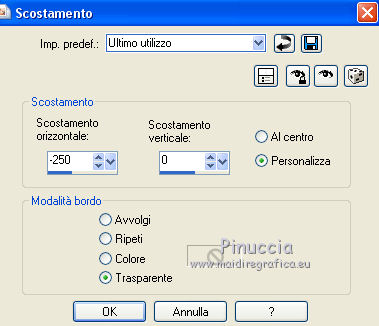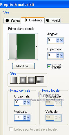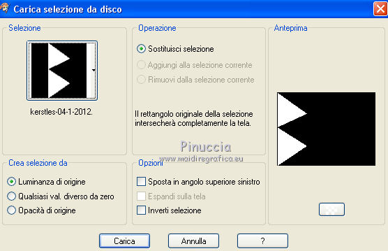 qui puoi trovare qualche risposta ai tuoi dubbi. Se l'argomento che ti interessa non è presente, ti prego di segnalarmelo. Il tutorial è stato creato con CorelX17, ma può essere eseguito con ogni versione di PSP. Dalla versione X4, il comando Immagine>Rifletti è stato sostituito con Immagine>Capovolgi in orizzontale, e il comando Immagine>Capovolgi con Immagine>Capovolgi in verticale. Nelle versioni X5 e X6, le funzioni sono state migliorate rendendo disponibile il menu Oggetti. Con la nuova versione X7, sono tornati Rifletti/Capovolgi, ma con nuove differenze Vedi la scheda sull'argomento qui Per tradurre questo tutorial ho usato PSP X. traduction en français qui Occorrente: Materiale qui Filtri in caso di dubbi, ricorda di consultare la mia sezione filtri qui Alien Skin Eye Candy 5 Impact - Glass qui Alien Skin Eye Candy 5 Texture - Marble qui ![]() se stai usando altri colori, sperimenta le modalità di miscelatura e opacità più adatte ai tuoi colori Nelle ultime versioni di PSP non c'è il gradiente di primo piano/sfondo (Corel_06_029) Trovi i gradienti delle versioni precedenti qui Metti la selezione nella cartella Selezioni. 1. Imposta il colore di primo piano con #e7e3e4, e il colore di sfondo con #1d5126. ![]() Passa il colore di primo piano a Gradiente di primo piano/sfondo, stile Radiale. ![]() 2. Apri una nuova immagine trasparente 800 x 600 pixels, e riempila con il gradiente.3. Attiva lo strumento Selezione ![]() (non importa il tipo di selezione impostato, perchè con la selezione personalizzata si ottiene sempre un rettangolo) clicca sull'icona Selezione personalizzata ![]() e imposta i seguenti settaggi. ![]() 4. Effetti>Plugins>Alien Skin Eye Candy 5 Texture - Marble. ![]() 5. Selezione>Inverti. Livelli>Nuovo livello raster. Riempi con il colore di sfondo #1d5126.6. Regola>Aggiungi/rimuovi disturbo>Aggiungi disturbo. ![]() 7. Livelli>Unisci>Unisci giù. 8. Selezione>Inverti. Effetti>Effetti 3D>Sfalsa ombra, colore nero. ![]() Selezione>Deseleziona. 9. Livelli>Nuovo livello raster. Selezione>Carica/Salva selezione>Carica selezione da disco. Cerca e carica la selezione kerstles-04-1-2012. ![]() 10. Imposta il colore di sfondo con #d61a1e, e mantieni il gradiente che ha cambiato tonalità. ![]() 11. Riempi la selezione con il gradiente.Cambia la modalità di miscelatura di questo livello in Colore (esistente) e abbassa l'opacità al 60%. 12. Livelli>Nuovo livello raster. Riporta il colore di sfondo al colore verde iniziale #1d5126, e ancora una volta il gradiente cambierà tonalità ![]() 13. Selezione>Modifica>Contrai - 20 pixels. Riempi la selezione con il gradiente.Cambia la modalità di miscelatura di questo livello in Sovrapponi, e abbassa l'opacità al 55%. 14. Livelli>Nuovo livello raster. Di nuovo colore di sfondo con il colore rosso #d61a1e. ![]() Selezione>Modifica>Contrai 20 pixels. Riempi la selezione con il gradiente.Cambia la modalità di questo livello in Sovrapponi. 15. Livelli>Nuovo livello raster. Ancora imposta il colore di sfondo con il colore verde #1d5126. ![]() Riempi la selezione con il gradiente.16. Effetti>Plugins>Alien Skin Eye Candy 5 Impact - Glass. Seleziona il preset Clear No DropShadow e ok. ![]() Abbassa l'opacità di questo livello all'80%. ![]() Selezione>Deseleziona. 17. Apri rand-101--2012-mb, e vai a Modifica>Copia. Torna al tuo lavoro e vai a Modifica>Incolla come nuovo livello. Cambia la modalità di miscelatura di questo livello in Luminanza (esistente). 18. Effetti>Effetti di immagine>Scostamento. ![]() 19. Apri tekst-ster-mb-2012. Attiva il livello superiore (bianco) e vai a Modifica>Copia. Torna al tuo lavoro e vai a Modifica>Incolla come nuovo livello. Immagine>Ridimensiona, al 50%, tutti i livelli non selezionato. 20. Regola>Messa a fuoco>Metti a fuoco. Effetti>Effetti di immagine>Scostamento. ![]() 21. Livelli>Duplica. Effetti>Effetti di immagine>Scostamento. ![]() 22. Attiva il livello sottostante dell'originale (raster 7). Livelli>Duplica. Effetti>Effetti di immagine>Scostamento. ![]() 23. Apri Deco-04-2012, e vai a Modifica>Copia. Torna al tuo lavoro e vai a Modifica>Incolla come nuovo livello. Spostalo in alto.24. Apri kerstboom-wit-04-2012, e vai a Modifica>Copia. . Torna al tuo lavoro e vai a Modifica>Incolla come nuovo livello. Effetti>Effetti di immagine>Scostamento. ![]() 25. Effetti>Effetti 3D>Sfalsa ombra, colore nero. ![]() 26. Apri kerstbal-73, e vai a Modifica>Copia. Torna al tuo lavoro e vai a Modifica>Incolla come nuovo livello. Effetti>Effetti di immagine>Scostamento. ![]() 27. Effetti>Effetti 3D>Sfalsa ombra, colore nero. ![]() 28. Apri kerstbal—87 e vai a Modifica>Copia. Torna al tuo lavoro e vai a Modifica>Incolla come nuovo livello. Posiziona la pallina dove preferisci,o vedi il mio esempio. 29. Effetti>Effetti 3D>Sfalsa ombra, colore nero. ![]() 30. Immagine>Aggiungi bordatura, 2 pixels, simmetriche, colore #1d5126. Immagine>Aggiungi bordatura, 40 pixels, simmetriche, colore bianco. Attiva lo strumento Bacchetta magica , sfumatura e tolleranza 0,e clicca nel bordo bianco per selezionarlo. 31. Selezione>Inverti. Effetti>Effetti 3D>Sfalsa ombra, colore nero. ![]() Selezione>Deseleziona. 32. Apri il file di testo, o scrivi un tuo testo. 33. Firma il tuo lavoro su un nuovo livello. Salva in formato jpg. ![]() Le vostre versioni. Grazie ![]() Cookies ![]() Cookies ![]() Se hai problemi o dubbi, o trovi un link non funzionante, o anche soltanto per un saluto, scrivimi. 14 Dicembre 2015 |