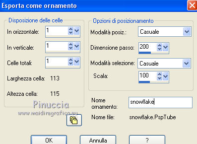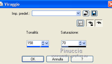 qui puoi trovare qualche risposta ai tuoi dubbi. Se l'argomento che ti interessa non è presente, ti prego di segnalarmelo. Per tradurre questo tutorial ho usato Corel X, ma può essere eseguito con ogni versione di PSP. Dalla versione X4, il comando Immagine>Rifletti è stato sostituito con Immagine>Capovolgi in orizzontale, e il comando Immagine>Capovolgi con Immagine>Capovolgi in verticale. Nelle versioni X5 e X6, le funzioni sono state migliorate rendendo disponibile il menu Oggetti. Con la nuova versione X7, sono tornati Rifletti/Capovolgi, ma con nuove differenze Vedi la scheda sull'argomento qui traduction en français qui Le vostre versioni qui Occorrente: Materiale qui Tube di Gerry ![]() se stai usando altri colori, sperimenta le modalità di miscelatura e opacità più adatte ai tuoi colori 1. Imposta il colore di primo piano con #bebfd8, e il colore di sfondo con #ffffff. ![]() 2. Apri una nuova immagine trasparente 750 x 600 pixels. e riempila con il colore di primo piano #bebfd8.3. Livelli>Nuovo livello raster. Selezione>Seleziona tutto. 4. Apri 38569638_L.pspimage e vai a Modifica>Copia. Torna al tuo lavoro e vai a Modifica>Incolla nella selezione. Selezione>Deseleziona. 4. Regola>Sfocatura>Sfocatura radiale. ![]() 5. Effetti>Effetti di immagine>Motivo unico. ![]() 6.Effetti>Effetti di bordo>Aumenta di più. 7. Apri ag-04-2013.jpg e vai a Modifica>Copia. Torna al tuo lavoro e vai a Modifica>Incolla come nuovo livello. Abbassa l'opacità di questo livello al 65%. 8. Apri deco-4-2013.pspimage e vai a Modifica>Copia. Torna al tuo lavoro e vai a Modifica>Incolla come nuovo livello. Cambia la modalità di miscelatura di questo livello in Sovrapponi, e abbassa l'opacità al 40%. 9. Apri kerstboom-wit.pspimage e vai a Modifica>Copia. Torna al tuo lavoro e vai a Modifica>Incolla come nuovo livello. 10. Apri 38569638_L.pspimage e vai a Modifica>Copia. Torna al tuo lavoro e vai a Modifica>Incolla come nuovo livello. Spostalo in basso a sinistra.![]() 11. Apri 0_bda65_c46d69ef_L.pspimage e vai a Modifica>Copia. Torna al tuo lavoro e vai a Modifica>Incolla come nuovo livello. Immagine>Ridimensiona, all'85%, tutti i livelli non selezionato. Effetti>Effetti 3D>Sfalsa ombra, colore nero. ![]() Spostalo a destra.12. Apri Gerry-Kerst 67 - ballen - 14 december 2009.pspimage e vai a Modifica>Copia. Torna al tuo lavoro e vai a Modifica>Incolla come nuovo livello. Regola>Tonalità e saturazione>Viraggio. ![]() Sposta il tube in alto a sinistra, vedi il mio esempio.13. Apri sneeuw.pspimage e vai a Modifica>Copia. Torna al tuo lavoro e vai a Modifica>Incolla come nuovo livello. Sposta la neve in basso, vedi il mio esempio.Porta il livello sotto quello del tube. ![]() 14. Livelli>Nuovo livello raster. Apri Snowflake_1. File>Esporta>Ornamento, assegna un nome all'ornamento e ok. ![]() Attiva lo strumento Ornamento ![]() cerca e seleziona l'ornamento esportato ![]() e applica un paio di volte con scala 100, e ancora con scala 70 e 40. ![]() Eventualmente, se necessario, abbassa l'opacità intorno all'80%, a tua scelta. 15. Immagine>Aggiungi bordatura, 2 pixels, simmetriche, colore di primo piano. Selezione>Seleziona tutto. Immagine>Aggiungi bordatura, 50 pixels, simmetriche, colore di sfondo. Selezione>Inverti. 16. Apri ag-04-2013 e vai a Modifica>Copia. Torna al tuo lavoro e vai a Modifica>Incolla nella selezione. 17. Selezione>Inverti. Effetti>Effetti 3D>Sfalsa ombra, colore nero. ![]() Selezione>Deseleziona. 18. Firma il tuo lavoro su un nuovo livello. 19. Immagine>Aggiungi bordatura, 2 pixels, simmetriche, colore di primo piano. 20. Immagine>Ridimensiona, a 800 pixels di larghezza, tutti i livelli selezionato. 21. Modifica>Copia. Apri Animation Shop e vai a Modifica>Incolla>Incolla come nuova animazione. Modifica>Duplica, e ripeti finché non avrai 4 fotogrammi. Clicca sul primo fotogramma per selezionarlo e vai a Modifica>Seleziona tutto. 22. Apri la gif candle_light2.gif, anche questa composta da 4 fotogrammi. Modifica>Seleziona tutto. Modifica>Copia. Attiva il tuo lavoro e vai a Modifica>Incolla>Incolla nel fotogramma selezionato, e posiziona la fiammella sulla prima candela. Ripeti Modifica>Incolla>Incolla nel fotogramma selezionato, e posiziona la fiammella sulla seconda candela. Controlla il risultato cliccando su Visualizza ![]() e salva in formato gif. ![]() Se hai problemi o dubbi, o trovi un link non funzionante, o anche soltanto per un saluto, scrivimi. 14 Dicembre 2015 |
