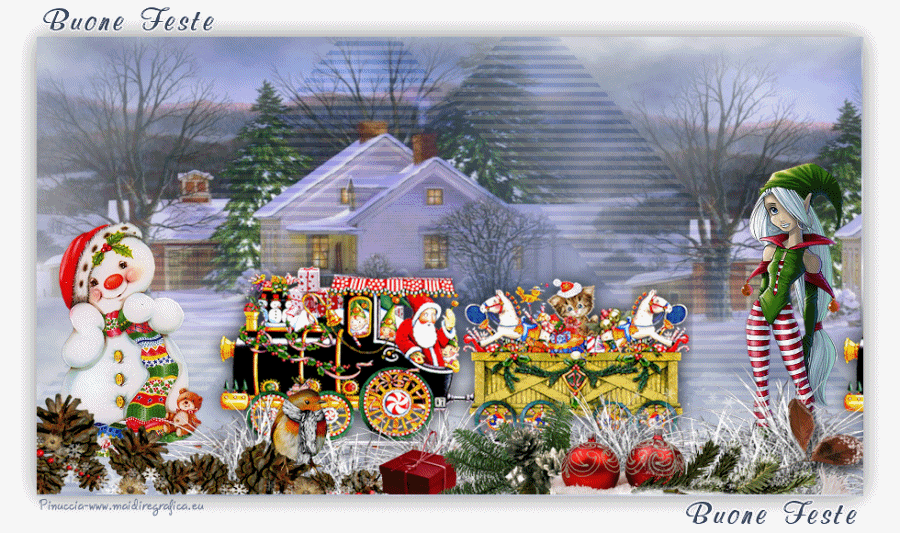 qui puoi trovare qualche risposta ai tuoi dubbi. Se l'argomento che ti interessa non è presente, ti prego di segnalarmelo. Il tutorial è stato creato con CorelX17, ma può essere eseguito con ogni versione di PSP. Dalla versione X4, il comando Immagine>Rifletti è stato sostituito con Immagine>Capovolgi in orizzontale, e il comando Immagine>Capovolgi con Immagine>Capovolgi in verticale. Nelle versioni X5 e X6, le funzioni sono state migliorate rendendo disponibile il menu Oggetti. Con la nuova versione X7, sono tornati Rifletti/Capovolgi, ma con nuove differenze Vedi la scheda sull'argomento qui Per tradurre questo tutorial ho usato PSP X. traduction en français qui Le vostre versioni qui ![]() Occorrente: Materiale qui Filtri in caso di dubbi, ricorda di consultare la mia sezione filtri qui Mura's Meister - Cloud qui Animation Shop qui ![]() se stai usando altri colori, sperimenta le modalità di miscelatura e opacità più adatte ai tuoi colori 1. Imposta il colore di primo piano con #ffffff, e il colore di sfondo con #5f6d88. ![]() 2. Apri una nuova immagine trasparente 900 x 500 pixels. ![]() Riempi l'immagine trasparente con il colore di sfondo #5f6d88.3. Effetti>Plugins>Mura's Meister - Cloud ![]() 4. Apri il tube misted landschap, e vai a Modifica>Copia. Torna al tuo lavoro e vai a Modifica>Incolla come nuovo livello. Spostalo in alto, contro il bordo.5. Apri il tube sneeuw, e vai a Modifica>Copia. Torna al tuo lavoro e vai a Modifica>Incolla come nuovo livello. Spostalo in basso, sul bordo.Abbassa l'opacità di questo livello al 42%. 6. Apri deco-1-4-2015, e vai a Modifica>Copia. Torna al tuo lavoro e vai a Modifica>Incolla come nuovo livello. Cambia la modalità di miscelatura di questo livello in Luce diffusa. ![]() 7. Livelli>Unisci>Unisci visibile. 8. Selezione>Seleziona tutto. 9. Immagine>Aggiungi bordatura, 40 pixels, simmetriche, colore bianco. 10. Effetti>Effetti 3D>Sfalsa ombra, colore nero. ![]() Selezione>Deseleziona. 11. Apri il tube Trein, e vai a Modifica>Copia. Torna al tuo lavoro e vai a Modifica>Incolla come nuovo livello. Spostalo a sinistra, contro il bordo bianco, a 480 pixels di altezza(se non visualizzi i righelli, vai a Visualizza>Righelli). ![]() 12. Attiva lo strumento Spostamento ![]() tieni premuto il tasto della maiuscola e clicca 4 volte sulla freccia a destra della tastiera![]() sull'uso dello strumento Spostamento abbinato alle frecce della tastiera vedi qui) ![]() 13. Chiudi questo livello per il momento. 14. Apri il tube MRC_ANIMEELF, e vai a Modifica>Copia. Torna al tuo lavoro e vai a Modifica>Incolla come nuovo livello. 15. Immagine>Ridimensiona, al 60%, tutti i livelli non selezionato. Spostalo a destra.Regola>Messa a fuoco>Metti a fuoco. 16. Apri il tube 0_a40c1_d2e535d_L, e vai a Modifica>Copia. Torna al tuo lavoro e vai a Modifica>Incolla come nuovo livello. 17. Immagine>Ridimensiona, al 60%, tutti i livelli non selezionato. Spostalo a sinistra.Regola>Messa a fuoco>Metti a fuoco. 18. Apri il tube rand-trein, e vai a Modifica>Copia. Torna al tuo lavoro e vai a Modifica>Incolla come nuovo livello. Spostalo in basso contro il bordo bianco.![]() 19. Firma il tuo lavoro su un nuovo livello. 20. Riapri il livello Raster 2 e controlla che tutto sia a posto. 21. Chiudi i due livelli inferiori e attiva il livello superiore. ![]() Livelli>Unisci>Unisci visibile. 22. Riapri i due livelli inferiori e rimani posizionato sul livello superiore. 23. Apri il file di testo (o scrivi un tuo testo) e vai a Modifica>Copia. Torna al tuo lavoro e vai a Modifica>Incolla come nuovo livello. Se non vuoi realizzare l'animazione: Livelli>Unisci>Unisci tutto e salva in formato jpg. 24. Se vuoi realizzare l'animazione, non unire i livelli. Attiva il livello inferiore. Selezione>Seleziona tutto. Selezione>Modifica>Contrai - 40 pixels. Attiva il livello del trenino. Selezione>Inverti. Premi sulla tastiera il tasto CANC ![]() Selezione>Deseleziona. 27. Modifica>Copia Unione. Apri Animation Shop e vai a Modifica>Incolla>Incolla come nuova animazione. 28. Torna in PSP. Modifica>Annulla azione Deseleziona. Modifica>Annulla azione Annulla selezione. Modifica>Annulla azione Inverti Selezione. E sei nuovamente sul livello del trenino, con la selezione attiva ![]() 29. Attiva lo strumento Spostamento ![]() tenendo premuto il tasto della maiuscola clicca una volta sulla freccia a sinistra. sull'uso delle frecce abbinato allo strumento Spostamento vedi qui ![]() ![]() Selezione>Inverti. Premi sulla tastiera il tasto CANC. Selezione>Deselezione. Modifica>Copia Unione. In Animation Shop: Modifica>Incolla>Incolla dopo il fotogramma corrente. 30. In PSP. Modifica>Annulla azione Deseleziona. Modifica>Annulla azione Annulla selezione. Modifica>Annulla azione Inverti Selezione. E sei nuovamente sul livello del trenino, con la selezione attiva ![]() 31. Attiva lo strumento Spostamento ![]() tenendo premuto il tasto della maiuscola clicca una volta sulla freccia a sinistra. ![]() ![]() Selezione>Inverti. Premi sulla tastiera il tasto CANC. Selezione>Deselezione. Modifica>Copia Unione. In Animation Shop: Modifica>Incolla>Incolla dopo il fotogramma corrente. 32. In PSP. Modifica>Annulla azione Deseleziona. Modifica>Annulla azione Annulla selezione. Modifica>Annulla azione Inverti Selezione. E sei nuovamente sul livello del trenino, con la selezione attiva ![]() Attiva lo strumento Spostamento ![]() tenendo premuto il tasto della maiuscola clicca una volta sulla freccia a sinistra. ![]() ![]() Selezione>Inverti. Premi sulla tastiera il tasto CANC. Selezione>Deselezione. Modifica>Copia Unione. In Animation Shop: Modifica>Incolla>Incolla dopo il fotogramma corrente. 33. Ripeti il punto 32 finché non avrai il treno a metà dell'immagine. ![]() Se tutto è andato bene, dovresti avere un'animazione composta da 13 fotogrammi. 34. Modifica>Seleziona tutto. Animazione>Proprietà fotogramma, e imposta la velocità a 30. ![]() 35. Animazione>Ridimensiona, 80 o 90%, come preferisci. 36. Controlla il r
