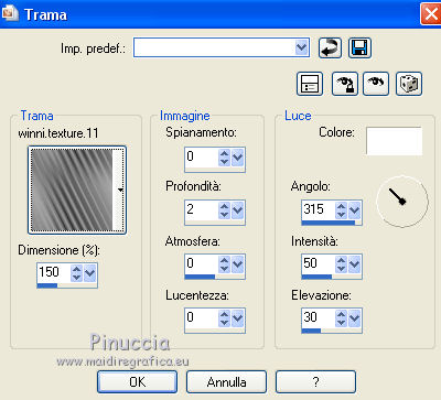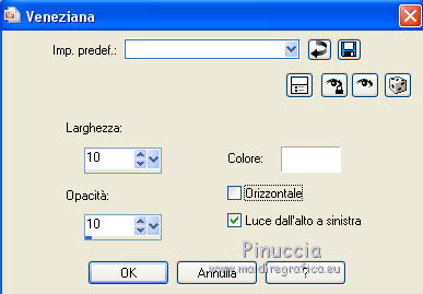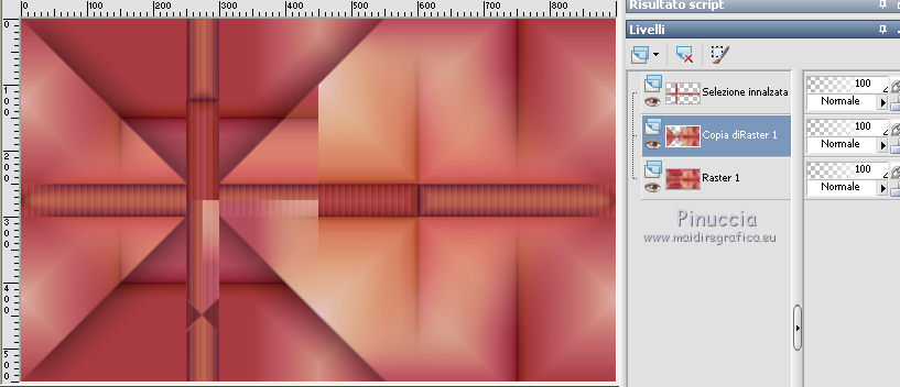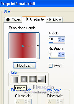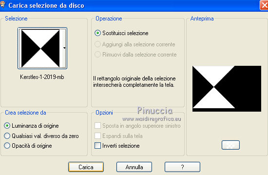 qui puoi trovare qualche risposta ai tuoi dubbi. Se l'argomento che ti interessa non è presente, ti prego di segnalarmelo. Per tradurre il tutorial ho usato Corel X7, ma può essere eseguito con ogni versione di PSP. Dalla versione X4, il comando Immagine>Rifletti è stato sostituito con Immagine>Capovolgi in orizzontale, e il comando Immagine>Capovolgi con Immagine>Capovolgi in verticale. Nelle versioni X5 e X6, le funzioni sono state migliorate rendendo disponibile il menu Oggetti. Con la nuova versione X7, sono tornati Rifletti/Capovolgi, ma con nuove differenze Vedi la scheda sull'argomento qui traduzione in francese quiLe vostre versioni qui Occorrente: Materiale qui ![]() Una pallina-souvenir per il vostro Albero di Natale Une boule-souvenir pour votre Arbre de Noël ![]() Filtri in caso di dubbi, ricorda di consultare la mia sezione filtri qui Filters Unlimited 2.0 qui Mehdi - Sorting Tiles qui AP 01 [Innovations] - Lines SilverLining qui Simple - Pizza Slice Mirror qui I filtri Simple si possono usare da soli o importati in Filters Unlimited (come fare vedi qui) Se un filtro fornito appare con questa icona ![]() se stai usando altri colori, sperimenta le modalità di miscelatura e opacità più adatte ai tuoi colori Nelle ultime versioni di PSP non c'è il gradiente di primo piano/sfondo (Corel_06_029) Puoi usare i gradienti delle versioni precedenti. Trovi qui i gradienti Corel X. Metti la trama nella cartella Trame. Metti la selezione nella cartella Selezioni. 1. Imposta il colore di primo piano con #d3b9bc, e il colore di sfondo con il colore #ac2427. ![]() Passa il colore di primo piano a Gradiente di primo piano/sfondo, stile Lineare. ![]() 2. Apri una nuova immagine trasparente 900 x 550 pixels. ![]() 3. Selezione>Seleziona tutto. Apri plaatje.jpg e vai a Modifica>Copia. Torna al tuo lavoro e vai a Modifica>Incolla nella selezione. Selezione>Deseleziona. 4. Effetti>Plugins>Mehdi - Sorting Tiles. ![]() 5. Effetti>Effetti di immagine>Motivo unico, con i settaggi standard. ![]() 6. Effetti>Plugins>Filters Unlimited 2.0 - Simple - Pizza Slice Mirror. ![]() 7. Livelli>Duplica. 8. Selezione>Carica/Salva selezione>Carica selezione da disco. Cerca e carica la selezione Kerstles-1-2019-mb.PspSelection. ![]() Premi sulla tastiera il tasto CANC ![]() Selezione>Deseleziona. 9. Effetti>Effetti 3D>Sfalsa ombra, colore nero. ![]() Modifica>Ripeti Sfalsa ombra. 10. Attiva lo strumento Selezione ![]() (non importa il tipo di selezione impostato, perchè con la selezione personalizzata si ottiene sempre un rettangolo) clicca sull'icona Selezione personalizzata ![]() e imposta i seguenti settaggi. ![]() Selezione>Innalza selezione a livello. Selezione>Deseleziona. 11. Livelli>Duplica. Immagine>Ruota per gradi - 90 gradi a sinistra. ![]() 12. Tasto K sulla tastiera per attivare lo strumento Puntatore ![]() e imposta Posizione X: 250,00 e Posizione Y: -175,00. ![]() Tasto M per deselezionare lo strumento. 13. Livelli>Unisci>Unisci giù. Effetti>Effetti di trama>Veneziana - colore bianco. ![]() 14. Attiva il livello Copia di Raster 1. ![]() 15. Effetti>Plugins>AP 01 [Innovations] - Lines SilverLining. ![]() 16. Attiva il livello Raster 1. Effetti>Effetti di trama>Trama - seleziona la trama winni.texture.11. ![]() 17. Apri deco-1.png e vai a Modifica>Copia. Torna al tuo lavoro e vai a Modifica>Incolla come nuovo livello. Tasto K per attivare lo strumento Puntatore ![]() e imposta Posizione X: 141,00 e Posizione Y: 42,00. ![]() 18. Apri deco-2.png e vai a Modifica>Copia. Torna al tuo lavoro e vai a Modifica>Incolla come nuovo livello. Livelli>Disponi>Porta in alto. Strumento Puntatore ![]() e imposta Posizione X: 195,00 e Posizione Y: 195,00. ![]() 19. Apri deco-3.png e vai a Modifica>Copia. Torna al tuo lavoro e vai a Modifica>Incolla come nuovo livello. Strumento Puntatore ![]() e imposta Posizione X: 1,00 e Posizione Y: 188,00. ![]() 20. Apri deco-4.png e vai a Modifica>Copia. Torna al tuo lavoro e vai a Modifica>Incolla come nuovo livello. Strumento Puntatore ![]() e imposta Posizione X: 234,00 e Posizione Y: -23,00. ![]() 21. Apri deco-5.png e vai a Modifica>Copia. Torna al tuo lavoro e vai a Modifica>Incolla come nuovo livello. Strumento Puntatore ![]() e imposta Posizione X: 245,00 e Posizione Y: 234,00. ![]() 22. Apri deco-19.png e vai a Modifica>Copia. Torna al tuo lavoro e vai a Modifica>Incolla come nuovo livello. Strumento Puntatore ![]() e imposta Posizione X: 345,00 e Posizione Y: 54,00. ![]() Tasto M per deselezionare lo strumento. 23. Immagine>Aggiungi bordatura, 1 pixel, simmetriche, colore scuro #6e3336. Immagine>Aggiungi bordatura, 3 pixels, simmetriche, colore chiaro #e07c6c. Immagine>Aggiungi bordatura, 1 pixel, simmetriche, colore scuro #6e3336. 24. Selezione>Seleziona tutto. Immagine>Aggiungi bordatura, 40 pixels, simmetriche, colore bianco #ffffff. Selezione>Inverti. Livelli>Nuovo livello raster. Riempi la selezione con il gradiente.Effetti>Effetti di trama>Trama, con i settaggi precedenti. ![]() Livelli>Unisci>Unisci giù. Selezione>Inverti. 26. Effetti>Effetti 3D>Sfalsa ombra, colore nero. ![]() Selezione>Deseleziona. 27. Immagine>Aggiungi bordatura, 1 pixel, simmetriche, colore scuro #6e3336. Se vuoi, aggiungi un testo. Firma il tuo lavoro su un nuovo livello. Livelli>Unisci>Unisci tutto e salva in formato jpg. ![]() ![]() Se hai problemi o dubbi, o trovi un link non funzionante, o anche soltanto per un saluto, scrivimi. 1 Novembre 2019 |