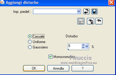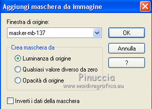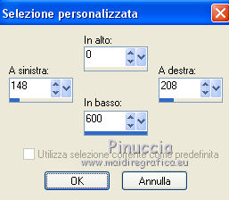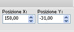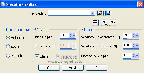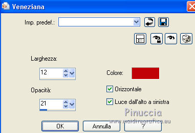 qui puoi trovare qualche risposta ai tuoi dubbi. Se l'argomento che ti interessa non è presente, ti prego di segnalarmelo. Per tradurre il tutorial ho usato Corel X7, ma può essere eseguito con ogni versione di PSP. Dalla versione X4, il comando Immagine>Rifletti è stato sostituito con Immagine>Capovolgi in orizzontale, e il comando Immagine>Capovolgi con Immagine>Capovolgi in verticale. Nelle versioni X5 e X6, le funzioni sono state migliorate rendendo disponibile il menu Oggetti. Con la nuova versione X7, sono tornati Rifletti/Capovolgi, ma con nuove differenze Vedi la scheda sull'argomento qui traduzione in francese quiLe vostre versioni qui ![]() Una pallina-souvenir per il vostro Albero di Natale Une boule-souvenir pour votre Arbre de Noël ![]() Occorrente: Materiale qui Filtri in caso di dubbi, ricorda di consultare la mia sezione filtri qui Filters Unlimited 2.0 qui &<Bkg Designer sf10III> - Xaggerate (da importare in Unlimited) qui Simple - Centre Tile qui AAA Frames - Foto Frame qui I filtri Simple si possono usare da soli o importati in Filters Unlimited (come fare vedi qui) Se un filtro fornito appare con questa icona ![]() se stai usando altri colori, sperimenta le modalità di miscelatura e opacità più adatte ai tuoi colori Apri la maschera in PSP e minimizzala con il resto del materiale. 1. Imposta il colore di primo piano con #c00208, e il colore di sfondo con il colore #ffffff. ![]() 2. Apri una nuova immagine trasparente 900 x 600 pixels. ![]() 3. Selezione>Seleziona tutto. Apri achtergrond-MB-137 e vai a Modifica>Copia. Torna al tuo lavoro e vai a Modifica>Incolla nella selezione. Selezione>Deseleziona. 4. Livelli>Duplica. Immagine>Ruota per gradi - 90 gradi a destra. ![]() 5. Attiva il livello inferiore, Raster 1 Selezione>Seleziona tutto. Immagine>Ritaglia la selezione. 6. Attiva il livello superiore. Apri Deco-1 e vai a Modifica>Copia. Torna al tuo lavoro e vai a Modifica>Incolla come nuovo livello. 7. Attiva nuovamente il livello Raster 1. Attiva lo strumento Selezione ![]() (non importa il tipo di selezione impostato, perchè con la selezione personalizzata si ottiene sempre un rettangolo) clicca sull'icona Selezione personalizzata ![]() e imposta i seguenti settaggi. ![]() Selezione>Innalza selezione a livello. Livelli>Disponi>Porta in alto. 8. Effetti>Effetti di trama>Veneziana - colore di primo piano #c00208. ![]() 9. Selezione>Deseleziona. 10. Livelli>Duplica. Immagine>Rifletti. Livelli>Unisci>Unisci giù. 11. Effetti>Effetti 3D>Sfalsa ombra, colore nero. ![]() 12. Apri deco-137-mb e vai a Modifica>Copia. Torna al tuo lavoro e vai a Modifica>Incolla come nuovo livello. Tasto K per attivare lo strumento Puntatore ![]() e imposta Posizione X: 158,00 e Posizione Y: -31,00. ![]() Tasto M per deselezionare lo strumento. 13. Livelli>Duplica. Immagine>Capovolgi. Livelli>Unisci>Unisci giù. 14. Effetti>Effetti 3D>Sfalsa ombra, con i settaggi precedenti. ![]() 15. Livelli>Nuovo livello raster. Riempi con il colore bianco di sfondo.Livelli>Nuovo livello maschera>Da immagine. Apri il menu sotto la finestra di origine e vedrai la lista dei files aperti. Seleziona la maschera masker-mb-137. ![]() Regola>Messa a fuoco>Accentua messa a fuoco. Livelli>Unisci>Unisci gruppo. 16. Apri deco-137-2 e vai a Modifica>Copia. Torna al tuo lavoro e vai a Modifica>Incolla come nuovo livello. Mantieni modalità di miscelatura in Moltiplica, opacità 85 17. Apri il tube meisje.png e vai a Modifica>Copia. Torna al tuo lavoro e vai a Modifica>Incolla come nuovo livello. Strumento Puntatore ![]() e imposta Posizione X: 468,00 e Posizione Y: 43,00. ![]() Effetti>Effetti 3D>Sfalsa ombra, con i settaggi precedenti. 18. Apri deco-2 e vai a Modifica>Copia. Torna al tuo lavoro e vai a Modifica>Incolla come nuovo livello. Strumento Puntatore ![]() e imposta Posizione X: 220,00 e Posizione Y: 63,00. ![]() 19. Apri il tube Exlusive_Red56.png e vai a Modifica>Copia. Torna al tuo lavoro e vai a Modifica>Incolla come nuovo livello. Strumento Puntatore ![]() e imposta Posizione X: 35,00 e Posizione Y: 22,00. ![]() 20. Apri kerstboom-wit.png e vai a Modifica>Copia. Torna al tuo lavoro e vai a Modifica>Incolla come nuovo livello. Strumento Puntatore ![]() e imposta Posizione X: 20,00 e Posizione Y: 175,00. ![]() Tasto M per deselezionare lo strumento. 21. Immagine>Aggiungi bordatura, 1 pixel, simmetriche, colore scuro. 22. Livelli>Duplica. Immagine>Ridimensiona, all'85%, tutti i livelli non selezionato. Effetti>Effetti 3D>Sfalsa ombra, con i settaggi precedenti. 23. Attiva il livello inferiore. Regola>Sfocatura>Sfocatura radiale. ![]() 24. Effetti>Plugins>Filters Unlimited 2.0 - Simple - Centre Tile. ![]() 25. Regola>Aggiungi/Rimuovi disturbo>Aggiungi disturbo. ![]() 26. Effetti>Plugins>Filters Unlimited 2.0 - &<Bkg Designer sf10III> - Xaggerate. ![]() 27. Effetti>Plugins>AAA Frames - Foto Frame. ![]() 28. Attiva il livello superiore. Firma il tuo lavoro su un nuovo livello. Livelli>Unisci>Unisci tutto e salva in formato jpg. ![]() ![]() Se hai problemi o dubbi, o trovi un link non funzionante, o anche soltanto per un saluto, scrivimi. 1 Novembre 2019 |