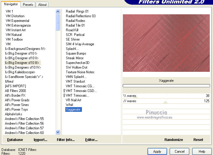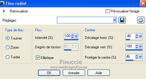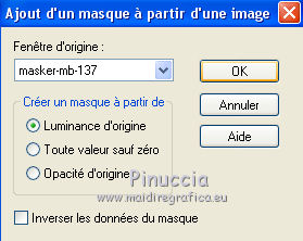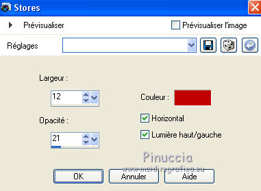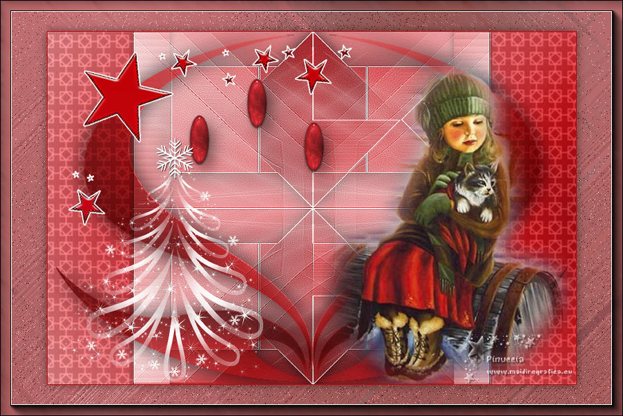 Ce tutoriel a été créé avec CorelX17, mais il peut également être exécuté avec les autres versions. Pour traduire le tutoriel j'ai utilisé CorelX17 pour l'italien et CorelX2 pour le français. Suivant la version utilisée, vous pouvez obtenir des résultats différents. Depuis la version X4, la fonction Image>Miroir a été remplacée par Image>Renverser horizontalement, et Image>Renverser avec Image>Renverser verticalement. Dans les versions X5 et X6, les fonctions ont été améliorées par la mise à disposition du menu Objets. Dans la nouvelle version X7, nous avons à nouveau Miroir/Renverser, mais avec autres différences. Voir plus les détails à ce sujet ici Certaines dénominations ont changées entre les versions de PSP. Les plus frequentes dénominations utilisées: ![]() Traduction en italien iciVos versions ici ![]() Una pallina-souvenir per il vostro Albero di Natale Une boule-souvenir pour votre Arbre de Noël ![]() Nécessaire pour réaliser ce tutoriel: Matériel qui (les liens des sites des tubeuses ici) Modules Externes consulter, si nécessaire, ma section de filtre ici Filters Unlimited 2.0 ici &<Bkg Designer sf10III> - Xaggerate (dà importer dans Unlimited) ici Simple - Centre Tile ici AAA Frames - Foto Frame ici Filtres Simple peuvent être utilisés seuls ou importés dans Filters Unlimited. voir comment le faire ici). Si un filtre est fourni avec cette icône, ![]() Si vous voulez utiliser vos propres couleurs, n'hésitez pas à changer le mode et l'opacité des calques Ouvrir le masque dans PSP et le minimiser avec le reste du matériel. 1. Placer en avant plan la couleur #c00208, et en arrière plan la couleur #ffffff. ![]() 2. Ouvrir une nouvelle image transparente 900 x 600 pixels. ![]() 3. Sélections>Sélectionner tout. Ouvrir achtergrond-MB-137 - Édition>Copier. Revenir sur votre travail et Édition>Coller dans la sélection. Sélections>Désélectionner tout. 4. Calques>Dupliquer. Image>Rotation libre - 90 degrés à droite. ![]() 5. Vous positionner sur le calque du bas de la pile, Raster 1 Sélections>Sélectionner tout. Image>Recadrer sur la sélection. 6. Vous positionner sur le calque du haut de la pile. Ouvrir Deco-1 - Édition>Copier. Revenir sur votre travail et Édition>Coller comme nouveau calque. 7. Vous positionner à nouveau sur le calque Raster 1. Activer l'outil Sélection ![]() (peu importe le type de sélection, parce que avec la sélection personnalisée vous obtenez toujours un rectangle), cliquer sur Sélection personnalisée ![]() et setter ces paramètres. ![]() Sélections>Transformer la sélection en calque. Calques>Agencer>Placer en haut de la pile. 8. Effets>Effets de textures>Stores, couleur d'avant plan #c00208. ![]() 9. Sélections>Désélectionner tout. 10. Calques>Dupliquer. Image>Miroir. Calques>Fusionner>Fusionner le calque de dessous. 11. Effets>Effets 3D>Ombre portée, couleur noire. ![]() 12. Ouvrir deco-137-mb - Édition>Copier. Revenir sur votre travail et Édition>Coller comme nouveau calque. Touche K pour activer l'outil Sélecteur ![]() et placer Position horiz.: 158,00 et Position vert.: -31,00. ![]() Touche M pour désélectionner l'outil. 13. Calques>Dupliquer. Image>Renverser. Calques>Fusionner>Fusionner le calque de dessous. 14. Effets>Effets 3D>Ombre portée, comme précédemment. ![]() 15. Calques>Nouveau calque raster. Remplir avec la couleur blanche d'arrière plan.Calques>Nouveau calque de masque>A partir d'une image. Ouvrir le menu deroulant sous la fenêtre d'origine et vous verrez la liste des images ouvertes. Sélectionner le masque masker-mb-137.jpg. ![]() Réglage>Netteté>Davantage de netteté. Calques>Fusionner>Fusionner le groupe. 16. Ouvrir deco-137-2 - Édition>Copier. Revenir sur votre travail et Édition>Coller comme nouveau calque. Garder le calque en mode Multiplier, opacité 85 17. Ouvrir le tube meisje.png - Édition>Copier. Revenir sur votre travail et Édition>Coller comme nouveau calque. Outil Sélecteur ![]() et placer Position horiz.: 468,00 et Position vert.: 43,00. ![]() Effets>Effets 3D>Ombre portée, comme précédemment. 18. Ouvrir deco-2 - Édition>Copier. Revenir sur votre travail et Édition>Coller comme nouveau calque. Outil Sélecteur ![]() et placer Position horiz.: 220,00 et Position vert.: 63,00. ![]() 19. Ouvrir le tube Exlusive_Red56.png - Édition>Copier. Revenir sur votre travail et Édition>Coller comme nouveau calque. Outil Sélecteur ![]() et placer Position horiz.: 35,00 et Position vert.: 22,00. ![]() 20. Ouvrir kerstboom-wit.png - Édition>Copier. Revenir sur votre travail et Édition>Coller comme nouveau calque. outil Sélecteur ![]() et placer Position horiz.: 20,00 et Position vert.: 175,00. ![]() Touche M pour désélectionner l'outil. 21. Image>Ajouter des bordures, 1 pixel, symétrique, couleur foncée. 22. Calques>Dupliquer. Image>Redimensionner, à 85%, redimensionner tous les calques décoché. Effets>Effets 3D>Ombre portée, comme précédemment. 23. Vous positionner sur le calque du bas de la pile. Réglage>Flou>Flou radial. ![]() 24. Effets>Modules Externes>Filters Unlimited 2.0 - Simple - Centre Tile. ![]() 25. Réglage>Ajouter/Supprimer du bruit>Ajouter du bruit. ![]() 26. Effets>Modules Externes>Filters Unlimited 2.0 - &<Bkg Designer sf10III> - Xaggerate. ![]() 27. Effets>Modules Externes>AAA Frames - Foto Frame. ![]() 28. Vous positionner sur le calque du haut de la pile. Signer votre travail sur un nouveau calque. Calques>Fusionner>tous et enregistrer en jpg. ![]() ![]() Si vous avez des problèmes, ou des doutes, ou vous trouvez un link modifié, ou seulement pour me dire que ce tutoriel vous a plu, vous pouvez m'écrire. 1 November 2019 |