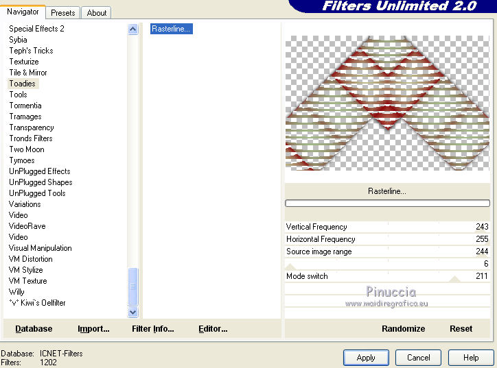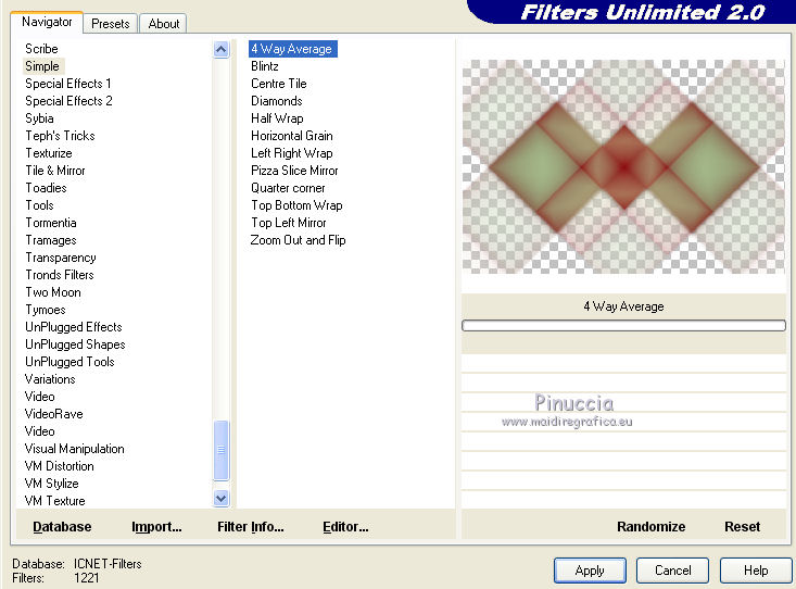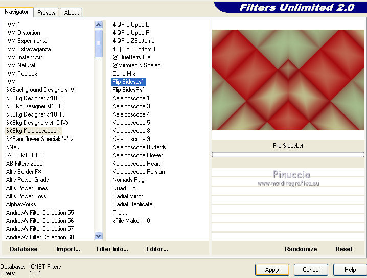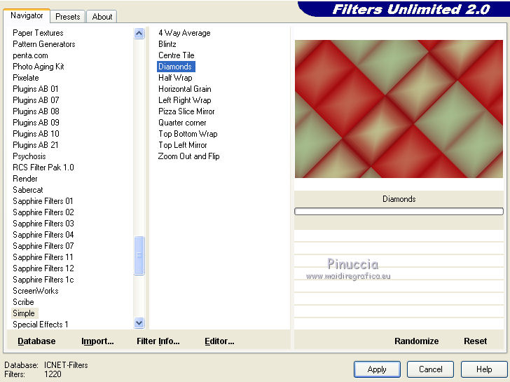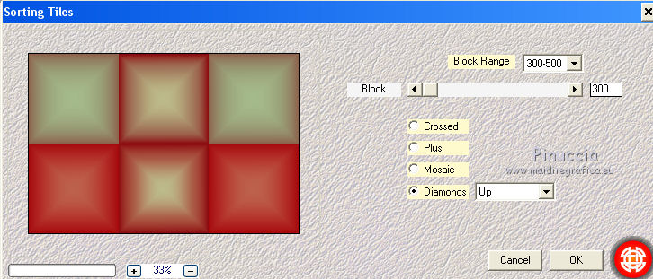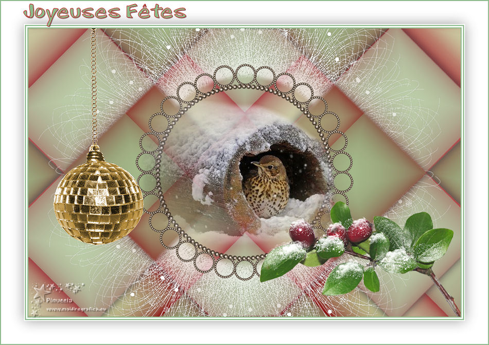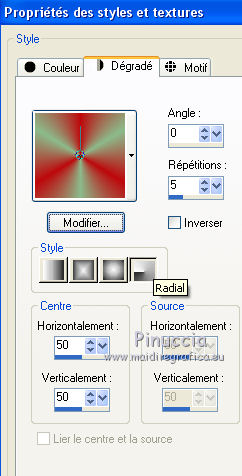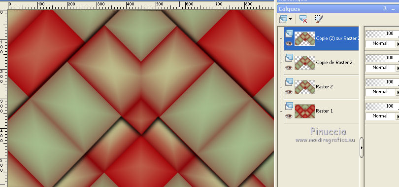 Ce tutoriel a été créé avec CorelX17, mais il peut également être exécuté avec les autres versions. Pour traduire le tutoriel j'ai utilisé CorelX17 pour l'italien et CorelX2 pour le français. Suivant la version utilisée, vous pouvez obtenir des résultats différents. Depuis la version X4, la fonction Image>Miroir a été remplacée par Image>Renverser horizontalement, et Image>Renverser avec Image>Renverser verticalement. Dans les versions X5 et X6, les fonctions ont été améliorées par la mise à disposition du menu Objets. Dans la nouvelle version X7, nous avons à nouveau Miroir/Renverser, mais avec autres différences. Voir plus les détails à ce sujet ici Certaines dénominations ont changées entre les versions de PSP. Les plus frequentes dénominations utilisées: ![]() Traduction en italien iciVos versions ici ![]() Una pallina-souvenir per il vostro Albero di Natale Une boule-souvenir pour votre Arbre de Noël ![]() Nécessaire pour réaliser ce tutoriel: Matériel qui (les liens des sites des tubeuses ici) Modules Externes consulter, si nécessaire, ma section de filtre ici Filters Unlimited 2.0 ici Mehdi - Sorting Tiles ici &<Bkg Kaleidoscope> - Flip SidesLsf (à importer dans Unlimited) ici Toadies - Rasterline ici Simple - Diamonds, 4Way Average ici Filtres Toadies et Simple peuvent être utilisés seuls ou importés dans Filters Unlimited. voir comment le faire ici). Si un filtre est fourni avec cette icône, ![]() Si vous voulez utiliser vos propres couleurs, n'hésitez pas à changer le mode et l'opacité des calques Dans les plus récentes versions de PSP, vous ne trouvez pas le dégradé d'avant plan/arrière plan ou Corel_06_029. Vous pouvez utiliser le dégradé des versions antérieures. Ici le dossier Dégradés de CorelX. 1. Placer en avant plan la couleur #bd090d, et en arrière plan la couleur #8cbb8b. ![]() Préparer en avant plan un dégradé de premier plan/arrière plan, style Radial. ![]() 2. Ouvrir une nouvelle image transparente 900 x 600 pixels. ![]() Remplir l'image transparente du dégradé.3. Effets>Modules Externes>Mehdi - Sorting Tiles. ![]() 4. Effets>Modules Externes>Filters Unlimited 2.0 - Simple - Diamonds. ![]() 5. Effets>Modules Externes>Filters Unlimited 2.0 - &<Bkg Kaleidoscope> - Flip SidesLsf ![]() 6. Ouvrir deco-1.png - Édition>Copier. Revenir sur votre travail et Édition>Coller comme nouveau calque. 7. Calques>Dupliquer - 2 fois et rester positionné sur le calque de la deuxième copie. ![]() 8. Effets>Modules Externes>Filters Unlimited 2.0 - Simple - 4Way Average ![]() 9. Vous positionner sur le calque de dessous, Copie de Raster 2. Effets>Modules Externes>Filters Unlimited 2.0 - Toadies - Rasterline ![]() attention, sur le net on est partagé une version de Toadies manipulée pour être importée dans Unlimited, Si vous utilisez cette version, le résultat peut être différent. Pour obtenir le bon résultat, je conseille d'utiliser la version original de Toadies 10. Image>Renverser. 11. Ouvrir Christmas time by Mago74 el(9) - Édition>Copier. Revenir sur votre travail et Édition>Coller comme nouveau calque. 12. Ouvrir Christmas time by Mago74 frame(3) - Édition>Copier. Revenir sur votre travail et Édition>Coller comme nouveau calque. Calques>Agencer>Placer en haut de la pile. 13. Ouvrir VerlaineC63Novembre - Édition>Copier. Revenir sur votre travail et Édition>Coller comme nouveau calque. 14. Ouvrir Christmas time by Mago74 el(39) - Édition>Copier. Revenir sur votre travail et Édition>Coller comme nouveau calque. Touche K sur le clavier pour activer l'outil Sélecteur ![]() et placer Position horiz.: 52,00 et Position vert.: -7,00. ![]() 15. Ouvrir Christmas time by Mago74 el(65) - Édition>Copier. Revenir sur votre travail et Édition>Coller comme nouveau calque. Outil Sélecteur ![]() et placer Position horiz.: 480,00 et Position vert.: 359,00. ![]() 16. Image>Ajouter des bordures, 2 pixels, symétrique, couleur d'arrière plan. Image>Ajouter des bordures, 3 pixels, symétrique, couleur blanche #ffffff. Image>Ajouter des bordures, 2 pixels, symétrique, couleur d'arrière plan. Image>Ajouter des bordures, 50 pixels, symétrique, couleur blanche #ffffff. Image>Ajouter des bordures, 2 pixels, symétrique, couleur d'arrière plan. 17. Sélections>Sélectionner tout. Sélections>Modifier>Contracter - 50 pixels. 18. Effets>Effets 3D>Ombre portée, couleur noire. ![]() Sélections>Désélectionner tout. 19. Si vous voulez, ajouter un texte à votre goût. 20. Signer votre travail sur un nouveau calque. Calques>Fusionner>Tous et enregistrer en jpg. ![]() ![]() Si vous avez des problèmes, ou des doutes, ou vous trouvez un link modifié, ou seulement pour me dire que ce tutoriel vous a plu, vous pouvez m'écrire. 1 Novembre 2019 |