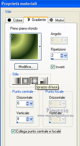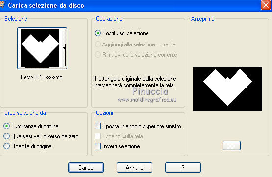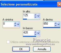 qui puoi trovare qualche risposta ai tuoi dubbi. Se l'argomento che ti interessa non è presente, ti prego di segnalarmelo. Per tradurre il tutorial ho usato Corel X7, ma può essere eseguito con ogni versione di PSP. Dalla versione X4, il comando Immagine>Rifletti è stato sostituito con Immagine>Capovolgi in orizzontale, e il comando Immagine>Capovolgi con Immagine>Capovolgi in verticale. Nelle versioni X5 e X6, le funzioni sono state migliorate rendendo disponibile il menu Oggetti. Con la nuova versione X7, sono tornati Rifletti/Capovolgi, ma con nuove differenze Vedi la scheda sull'argomento qui traduzione in francese quiLe vostre versioni qui ![]() Una pallina-souvenir per il vostro Albero di Natale Une boule-souvenir pour votre Arbre de Noël ![]() Occorrente: Materiale qui Filtri in caso di dubbi, ricorda di consultare la mia sezione filtri qui Filters Unlimited 2.0 qui &<Bkg Designer sf10II&gr; - MURU's Wave (da importare in Unlimited) qui Mehdi - Sorting Tiles qui AAA Frames - Foto Frame qui Simple - Pizza Slice Mirror, 4Way average qui Carolaine and Sensibility - CS-Texture qui AP Lines - Lines SilverLining qui I filtri Simple si possono usare da soli o importati in Filters Unlimited (come fare vedi qui) Se un filtro fornito appare con questa icona ![]() se stai usando altri colori, sperimenta le modalità di miscelatura e opacità più adatte ai tuoi colori Nelle ultime versioni di PSP non c'è il gradiente di primo piano/sfondo (Corel_06_029) Puoi usare i gradienti delle versioni precedenti. Trovi qui i gradienti Corel X. Metti la selezione nella cartella Selezioni. 1. Imposta il colore di primo piano con #c6d56e, e il colore di sfondo con il colore #132a0d. ![]() Passa il colore di primo piano a Gradiente di primo piano/sfondo, stile Sprazzo di luce. ![]() 2. Apri una nuova immagine trasparente 850 x 550 pixels. ![]() Riempi l'immagine trasparente con il gradiente.3. Effetti>Plugins>Mehdi - Sorting Tiles. ![]() 4. Livelli>Duplica. Immagine>Rifletti. Abbassa l'opacità di questo livello al 50% Livelli>Unisci>Unisci giù. 5. Selezione>Carica/Salva selezione>Carica selezione da disco. Cerca e carica la selezione kerst-2019-xxx-mb.PspSelection. ![]() Selezione>Innalza selezione a livello. Selezione>Deseleziona. 6. Effetti>Effetti 3D>Sfalsa ombra, colore nero. ![]() 7. Livelli>Duplica. Effetti>Effetti di immagine>Motivo unico, con i settaggi standard. ![]() Regola>Messa a fuoco>Accentua messa a fuoco. 8. Attiva il livello inferiore, Raster 1. Attiva lo strumento Selezione ![]() (non importa il tipo di selezione impostato, perchè con la selezione personalizzata si ottiene sempre un rettangolo) clicca sull'icona Selezione personalizzata ![]() e imposta i seguenti settaggi. ![]() 9. Selezione>Innalza selezione a livello. Selezione>Deseleziona. Livelli>Disponi>Porta in alto. 10. attenzione, questo è uno dei casi in cui il risultato cambia secondo la versione di Unlimited utilizzata. Con l'effetto Pizza Slice Mirror la differenza non sarà molto evidente, ma al punto 13 con 4Way Average si noterà. Per ottenere lo stesso risultato, dovresti utilizzare la versione di Unlimited in formato sofware Effetti>Plugins>Filters Unlimited 2.0 - Simple - Pizza Slice Mirror ![]() 11. Effetti>Plugins>Carolaine and Sensibility - CS-Texture. ![]() 12. Effetti>Plugins>Filters Unlimited 2.0 - &<Bkg Designer sf10II&gr; - MURU's Wave ![]() 13. Effetti>Plugins>Filters Unlimited 2.0 - Simple - 4way average ![]() come anticipato al punto 10, se stai utilizzato la versione di Unlimited che non si installa, composta da files in formato 8bf, avrai un risultato differente ![]() Regola>Messa a fuoco>Metti a fuoco. 14. Attiva il livello inferiore, Raster 1. Effetti>Plugins>AP Lines - Lines SilverLining ![]() 15. Apri deco-kerst-2019-1.png e vai a Modifica>Copia. Torna al tuo lavoro e vai a Modifica>Incolla come nuovo livello. Livelli>Disponi>Porta in alto. Tasto K sulla tastiera per attivare lo strumento Puntatore ![]() e imposta Posizione X: 0,00 e Posizione Y: 26,00. ![]() 16. Apri deco-christmas12-4-regis e vai a Modifica>Copia. Torna al tuo lavoro e vai a Modifica>Incolla come nuovo livello. Imposta Posizione X: 540,00 e Posizione Y: 44,00. ![]() 17. Apri tekst.png e vai a Modifica>Copia. Torna al tuo lavoro e vai a Modifica>Incolla come nuovo livello. Imposta Posizione X: 204,00 e Posizione Y: 17,00. ![]() 18. Apri 0042.png e vai a Modifica>Copia. Torna al tuo lavoro e vai a Modifica>Incolla come nuovo livello. Imposta Posizione X: 676,00 e Posizione Y: 164,00. ![]() Tasto M per deselezionare lo strumento. 19. Apri deco-2.png e vai a Modifica>Copia. Torna al tuo lavoro e vai a Modifica>Incolla come nuovo livello. E' al suo posto. 20. Immagine>Aggiungi bordatura, 2 pixels, simmetriche, colore chiaro. Immagine>Aggiungi bordatura, 20 pixels, simmetriche, colore bianco. Immagine>Aggiungi bordatura, 2 pixels, simmetriche, colore scuro. Immagine>Aggiungi bordatura, 40 pixels, simmetriche, colore bianco #ffffff. 21. Effetti>Plugins>AAA Frames - Foto Frame. ![]() 22. Firma il tuo lavoro su un nuovo livello. Livelli>Unisci>Unisci tutto e salva in formato jpg. ![]() ![]() Se hai problemi o dubbi, o trovi un link non funzionante, o anche soltanto per un saluto, scrivimi. 1 Novembre 2019 |