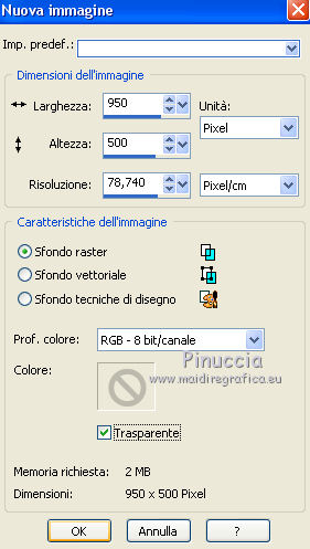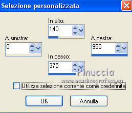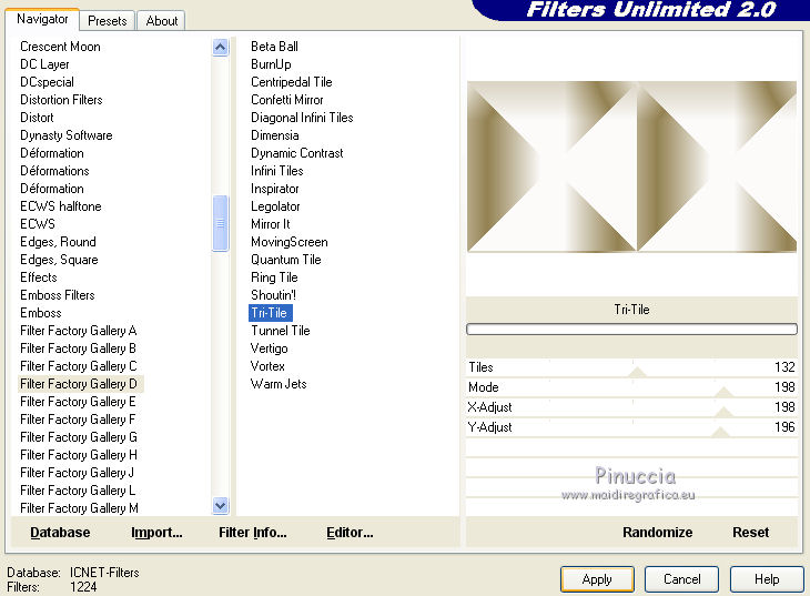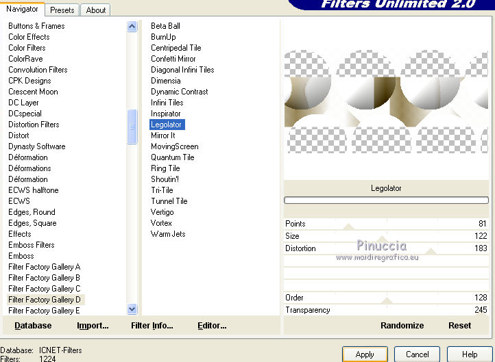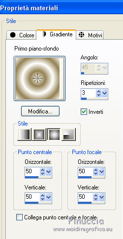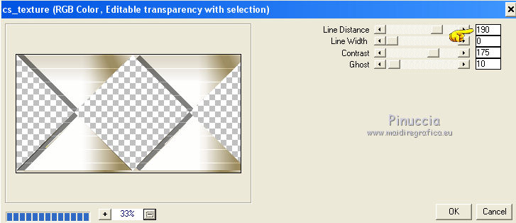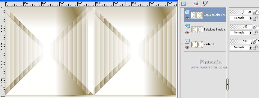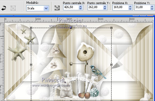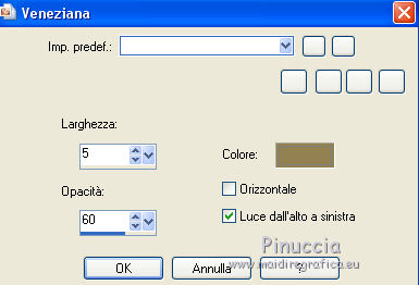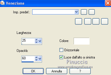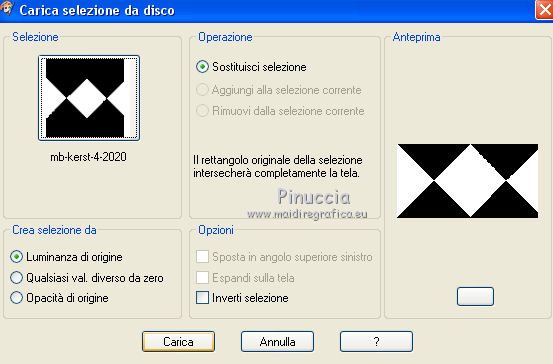 qui puoi trovare qualche risposta ai tuoi dubbi. Se l'argomento che ti interessa non è presente, ti prego di segnalarmelo. Per tradurre il tutorial ho usato Corel X7, ma può essere eseguito con ogni versione di PSP. Dalla versione X4, il comando Immagine>Rifletti è stato sostituito con Immagine>Capovolgi in orizzontale, e il comando Immagine>Capovolgi con Immagine>Capovolgi in verticale. Nelle versioni X5 e X6, le funzioni sono state migliorate rendendo disponibile il menu Oggetti. Con la nuova versione X7, sono tornati Rifletti/Capovolgi, ma con nuove differenze Vedi la scheda sull'argomento qui traduzione in francese qui Le vostre versioni quiOccorrente: Materiale qui (in questa pagina trovi i links ai siti dei creatori di tubes) Filtri in caso di dubbi, ricorda di consultare la mia sezione filtri qui Filters Unlimited 2.0 qui Filter Factory Gallery D - Tri-Tile, Legolator qui Carolaine and Sensibility - CS-Texture qui I filtri Factory Gallery si possono usare da soli o importati in Filters Unlimited (come fare vedi qui) Se un filtro fornito appare con questa icona ![]() ![]() ![]() se stai usando altri colori, sperimenta le modalità di miscelatura e opacità più adatte ai tuoi colori Nelle ultime versioni di PSP non c'è il gradiente di primo piano/sfondo (Corel_06_029) Puoi usare i gradienti delle versioni precedenti. Trovi qui i gradienti Corel X. Metti la selezione nella cartella Selezioni. 1. Imposta il colore di primo piano con #938151, e il colore di sfondo con #ffffff. ![]() Passa il colore di primo piano a Gradiente di primo piano/sfondo, stile Sprazzo di luce ![]() 2. Apri una nuova immagine trasparente 950 x 500 pixels. ![]() Riempi l'immagine trasparente con il gradiente.3. Effetti>Plugins>Filters Unlimited 2.0 - Filter Factory Gallery D -Tri Tile ![]() Effetti>Effetti di bordo>Aumenta. 4. Selezione>Carica/Salva selezione>Carica selezione da disco. Cerca e carica la selezione mb-kerst-4-2020. ![]() Selezione>Innalza selezione a livello. 5. Effetti>Effetti di trama>Veneziana, colore bianco. ![]() Selezione>Deseleziona. 6. Livelli>Duplica. Immagine>Rifletti. Abbassa l'opacità di questo livello al 60%. ![]() 7. Attiva il livello inferiore, Raster 1. Selezione>Carica/Salva selezione>Carica selezione da disco. Carica nuovamente la selezione mb-kerst-4-2020. ![]() Selezione>Inverti. Selezione>Innalza selezione a livello. 8. Effetti>Plugins>Carolaine and Sensibility - Cs_texture. ![]() 9. Attiva nuovamente il livello inferiore, Raster 1. Attiva lo strumento Selezione ![]() (non importa il tipo di selezione impostato, perchè con la selezione personalizzata si ottiene sempre un rettangolo) clicca sull'icona Selezione personalizzata ![]() e imposta i seguenti settaggi. ![]() Selezione>Innalza selezione a livello. Selezione>Deseleziona. 10. Effetti>Plugins>Filters Unlimited 2.0 - Filter Factory Gallery D - Legolator ![]() 11. Livelli>Disponi>Sposta su. Abbassa l'opacità di questo livello al 70%. ![]() 12. Effetti>Effetti 3D>Sfalsa ombra, colore #000000. ![]() Rimani su questo livello. 13. Apri deco-1-2020 e vai a Modifica>Copia. Torna al tuo lavoro e vai a Modifica>Incolla come nuovo livello. Regola>Messa a fuoco>Metti a fuoco. 14. Attiva il livello superiore. Apri deco-2-2020 e vai a Modifica>Copia. Torna al tuo lavoro e vai a Modifica>Incolla come nuovo livello. 15. Tasto K sulla tastiera per attivare lo strumento Puntatore ![]() e imposta Posizione X: 17,00 e Posizione Y: 3,00. ![]() 16. Apri deco-3-2020 e vai a Modifica>Copia. Torna al tuo lavoro e vai a Modifica>Incolla come nuovo livello. 17. Strumento Puntatore ![]() e imposta Posizione X: 169,00 e Posizione Y: 31,00. ![]() 18. Apri tube-4-2020 e vai a Modifica>Copia. Torna al tuo lavoro e vai a Modifica>Incolla come nuovo livello. 19. Strumento Puntatore ![]() e imposta Posizione X: 645,00 e Posizione Y: 115,00. ![]() Tasto M per deselezionare lo strumento. 20. Immagine>Aggiungi bordatura, 2 pixels, simmetriche, colore scuro. Immagine>Aggiungi bordatura, 4 pixels, simmetriche, colore chiaro. Immagine>Aggiungi bordatura, 2 pixels, simmetriche, colore scuro. 21. Selezione>Seleziona tutto. Immagine>Aggiungi bordatura, 50 pixels, simmetriche, colore chiaro. Selezione>Inverti. 22. Effetti>Effetti di trama>Veneziana, colore scuro di primo piano #938151. ![]() 23. Livelli>Nuovo livello raster. Attiva nuovamente il tube deco-1-2020 e vai a Modifica>Copia. Torna al tuo lavoro e vai a Modifica>Incolla nella selezione. Regola>Messa a fuoco>Metti a fuoco. 24. Selezione>Inverti. Effetti>Effetti 3D>Sfalsa ombra, colore #000000. ![]() Selezione>Deseleziona. 25. Immagine>Aggiungi bordatura, 2 pixels, simmetriche, colore di sfondo. Firma il tuo lavoro su un nuovo livello. Livelli>Unisci>Unisci tutto e salva in formato jpg. ![]() ![]() Se hai problemi o dubbi, o trovi un link non funzionante, o anche soltanto per un saluto, scrivimi. 21 Ottobre 2020 |