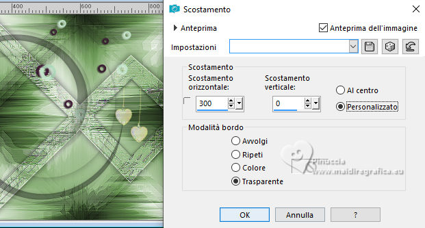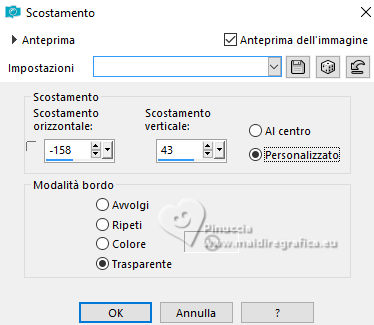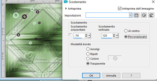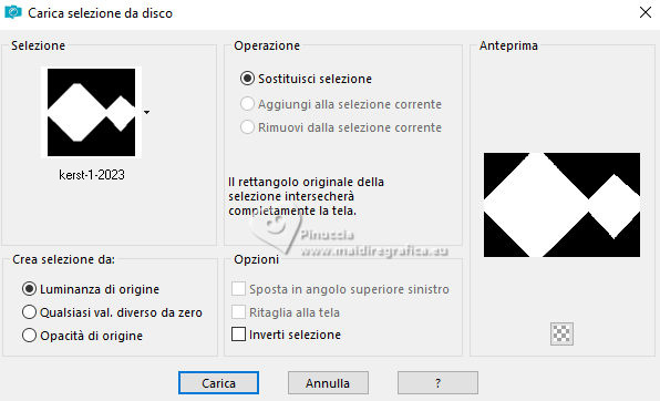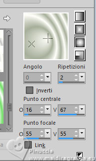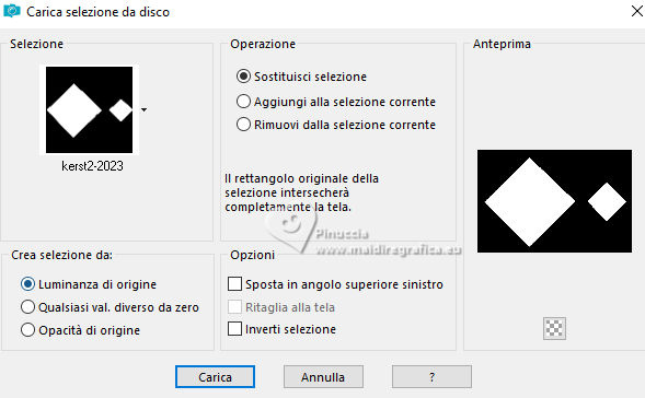 qui puoi trovare qualche risposta ai tuoi dubbi. Se l'argomento che ti interessa non è presente, ti prego di segnalarmelo. Per tradurre il tutorial ho usato PSPX9 e PSPX2020, ma può essere eseguito con ogni versione di PSP. Dalla versione X4, il comando Immagine>Rifletti è stato sostituito con Immagine>Capovolgi in orizzontale, e il comando Immagine>Capovolgi con Immagine>Capovolgi in verticale. Nelle versioni X5 e X6, le funzioni sono state migliorate rendendo disponibile il menu Oggetti. Con la nuova versione X7, sono tornati Rifletti/Capovolgi, ma con nuove differenze Vedi la scheda sull'argomento qui traduzione in francese qui Le vostre versioni qui![]() Occorrente: ![]() (in questa pagina trovi i links ai siti dei creatori di tubes) ![]() in caso di dubbi, ricorda di consultare la mia sezione filtri qui Filters Unlimited 2.0 qui Toadies - What are you qui Mehdi - Sorting Tiles qui Alien Skin Eye Candy 5 Impact - Glass qui AAA Frames - Texture Frame qui I filtri Toadies si possono usare da soli o importati in Filters Unlimited (come fare vedi qui) Se un filtro fornito appare con questa icona ![]() ![]() se stai usando altri colori, sperimenta le modalità di miscelatura e opacità più adatte ai tuoi colori Nelle ultime versioni di PSP non c'é il gradiente di primo piano/sfondo (Corel_06_029) Puoi usare i gradienti delle versioni precedenti. Trovi qui i gradienti Corel X. ![]() Metti le selezioni nella cartella Selezioni. 1. Imposta il colore di primo piano con fffffa, e il colore di sfondo con #afaf9a. ![]() Passa il colore di primo piano a Gradiente di primo piano/sfondo, stile Sprazzo di luce. ![]() 2. Apri una nuova immagine trasparente 900 x 600 pixels. ![]() Riempi l'immagine trasparente con il gradiente.3. Selezione>Seleziona tutto. Apri kerst67.png ![]() Modifica>Copia. Torna al tuo lavoro e vai a Modifica>Incolla nella selezione. Selezione>Deseleziona. 4. Effetti>Effetti di immagine>Motivo unico, con i settaggi standard. ![]() 5. Effetti>Plugins>Mehdi - Sorting Tiles. ![]() 6. Regola>Tonalità e Saturazione>Viraggio. ![]() 7. Effetti>Plugins>Filters Unlimited 2.0 - Toadies - What are you. ![]() Effetti>Effetti di bordo>Aumenta di più. 8. Selezione>Carica/Salva selezione>Carica selezione da disco. Cerca e carica la selezione Kerst-1-2023. ![]() Selezione>Innalza selezione a livello. Effetti>Effetti di bordo>Aumenta di più. 9. Effetti>Effetti 3D>Sfalsa ombra, colore nero. ![]() 10. Selezione>Carica/Salva selezione>Carica selezione da disco. Cerca e carica la selezione Kerst-2-2023. ![]() La nuova selezione sostituirà la precedente. ![]() Premi sulla tastiera il tasto CANC ![]() ![]() Mantieni selezionato. 11. Attiva il livello inferiore Raster 1. Selezione>Innalza selezione a livello. 12. Effetti>Plugings>Alien Skin Eye Candy 5 Impact - Glass. Seleziona il preset Clear e ok. ![]() Selezione>Deseleziona. 13. Apri Deco-1 ![]() Modifica>Copia. Torna al tuo lavoro e vai a Modifica>Incolla come nuovo livello. 14. Effetti>Effetti di immagine>Scostamento. ![]() Livelli>Disponi>Sposta su. 15. Apri Astrid deco 118a.png ![]() Modifica>Copia. Torna al tuo lavoro e vai a Modifica>Incolla come nuovo livello. E' al suo posto. 16. Apri deco2.png ![]() Modifica>Copia. Torna al tuo lavoro e vai a Modifica>Incolla come nuovo livello. 17. Effetti>Effetti di immagine>Scostamento. ![]() 18. Attiva nuovamente kerst-67.png ![]() Modifica>Copia. Torna al tuo lavoro e vai a Modifica>Incolla come nuovo livello. 19. Effetti>Effetti di immagine>Scostamento. ![]() 20. Effetti>Effetti 3D>Sfalsa ombra, colore nero. ![]() Regola>Messa a fuoco>Metti a fuoco. 21. Immagine>Aggiungi bordatura, 2 pixels, simmetriche, colore nero. Selezione>Seleziona tutto. Immagine>Aggiungi bordatura, 50 pixels, simmetriche, colore bianco. 22. Effetti>Effetti 3D>Sfalsa ombra, con i settaggi precedenti. ![]() Selezione>Deseleziona. 23. Effetti>Plugins>AAA Frames - Texture Frame. ![]() 24. Firma il tuo lavoro su un nuovo livello. Livelli>Unisci>Unisci tutto e salva in formato jpg. Per il tube di questo esempio grazie Renée ![]() ![]() Se hai problemi o dubbi, o trovi un link non funzionante, o anche soltanto per un saluto, scrivimi. |