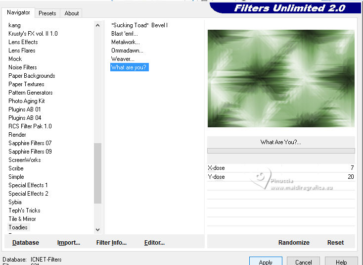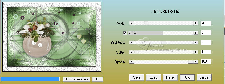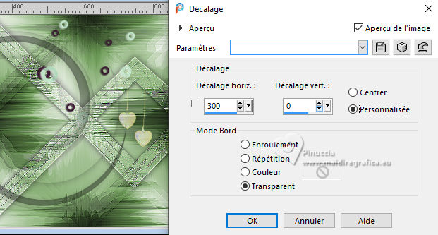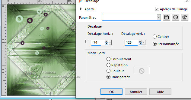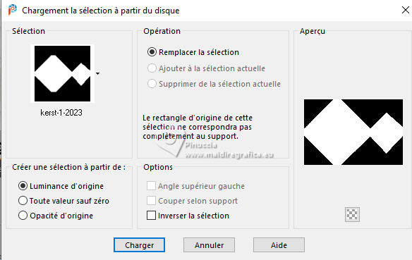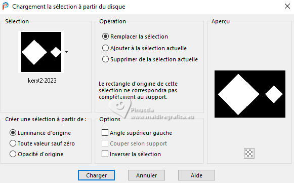 Pour traduire ce tutoriel j'ai utilisé PSPX9 et PSP2020, mais il peut également être exécuté avec les autres versions. Suivant la version utilisée, vous pouvez obtenir des résultats différents. Depuis la version X4, la fonction Image>Miroir a été remplacée par Image>Renverser horizontalement, et Image>Renverser avec Image>Renverser verticalement. Dans les versions X5 et X6, les fonctions ont été améliorées par la mise à disposition du menu Objets. Dans la nouvelle version X7, nous avons à nouveau Miroir/Renverser, mais avec autres différences. Voir plus les détails à ce sujet ici Certaines dénominations ont changées entre les versions de PSP. Les plus frequentes dénominations utilisées: ![]() Traduction en italien ici Vos versions ici![]() Nécessaire pour réaliser ce tutoriel: ![]() (les liens des sites des tubeuses ici) ![]() consulter, si nécessaire, ma section de filtre ici Filters Unlimited 2.0 ici Toadies - What are you ici Mehdi - Sorting Tiles ici Alien Skin Eye Candy 5 Impact - Glass ici AAA Frames - Texture Frame ici Filtres Toadies peuvent être utilisés seuls ou importés dans Filters Unlimited. voir comment le faire ici). Certains filtres peuvent donner des résultats différents selon la version d'Unlimited utilisée. Si un filtre est fourni avec cette icône, ![]() ![]() Si vous voulez utiliser vos propres couleurs, n'hésitez pas à changer le mode et l'opacité des calques Dans les plus récentes versions de PSP, vous ne trouvez pas le dégradé d'avant plan/arriére plan ou Corel_06_029. Vous pouvez utiliser le dégradé des versions antérieures. Ici le dossier Dégradés de CorelX. ![]() Placer les sélections dans le dossier Sélections. 1. Placer en avant plan la couleur #fffffa, et en arrière plan la couleur #afaf9a. ![]() Préparer en avant plan un dégradé de premier plan/arrière plan, style Halo. ![]() 2. Ouvrir une nouvelle image transparente 900 x 600 pixels. ![]() Remplir l'image transparente du dégradé.3. Sélections>Sélectionner tout. Ouvrir kerst67.png ![]() Édition>Copier. Revenir sur votre travail et Édition>Coller dans la sélection. Sélections>Désélectionner tout. 4. Effets>Effets d'image>Mosaïque sans jointures, par défaut. ![]() 5. Effets>Modules Externes>Mehdi - Sorting Tiles. ![]() 6. Réglage>Teinte et Saturation>Coloriser. ![]() 7. Effets>Modules Externes>Filters Unlimited 2.0 - Toadies - What are you. ![]() Effets>Effets de bords>Accentuer davantage. 8. Sélections>Charger/Enregistrer une sélection>Charger à partir du disque. Chercher et charger la sélection Kerst-1-2022. ![]() Sélections>Transformer la sélection en calque. Effets>Effets de bords>Accentuer davantage. 9. Effets>Effets 3D>Ombre portée, couleur noire. ![]() 10. Sélections>Charger/Enregistrer une sélection>Charger à partir du disque. Chercher et charger la sélection Kerst-2-2023. ![]() La nouvelle sélection remplacera la précédente. ![]() Presser CANC sur le clavier ![]() ![]() Garder sélectionné. 11. Vous positionner sur le calque du bas de la pile Raster 1. Sélections>Transformer la sélection en calque. 12. Effets>Modules Externes>Alien Skin Eye Candy 5 Impact - Glass. Sélectionner le preset Clear et ok. ![]() Sélections>Désélectionner tout. 13. Ouvrir Deco-1 ![]() Édition>Copier. Revenir sur votre travail et Édition>Coller comme nouveau calque. 14. Effets>Effets d'image>Décalage. ![]() Calques>Agencer>Déplacer vers le haut. 15. Ouvrir Astrid deco 118a.png ![]() Édition>Copier. Revenir sur votre travail et Édition>Coller comme nouveau calque. E' al suo posto. 16. Ouvrir deco2.png ![]() Édition>Copier. Revenir sur votre travail et Édition>Coller comme nouveau calque. 17. Effets>Effets d'image>Décalage. ![]() 18. Activer à nouveau kerst-67.png ![]() Édition>Copier. Revenir sur votre travail et Édition>Coller comme nouveau calque. 19. Effets>Effets d'image>Décalage. ![]() 20. Effets>Effets 3D>Ombre portée, couleur noire. ![]() Réglage>Netteté>Netteté. 21. Image>Ajouter des bordures, 2 pixels, symétrique, couleur noire. Sélections>Sélectionner tout. Image>Ajouter des bordures, 50 pixels, symétrique, couleur blanche. 22. Effets>Effets 3D>Ombre portée, comme précédemment. ![]() Sélections>Désélectionner tout. 23. Effets>Modules Externes>AAA Frames - Texture Frame. ![]() 24. Signer votre travail sur un nouveau calque. Calques>Fusionner>Tous et enregistrer en jpg. Pour le tube de cette version merci Renée. ![]() ![]() Si vous avez des problèmes, ou des doutes, ou vous trouvez un link modifié, ou seulement pour me dire que ce tutoriel vous a plu, vous pouvez m'écrire. |