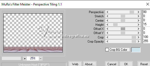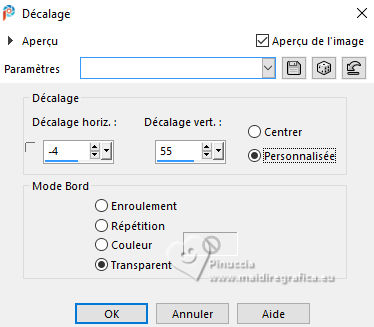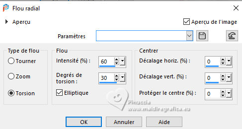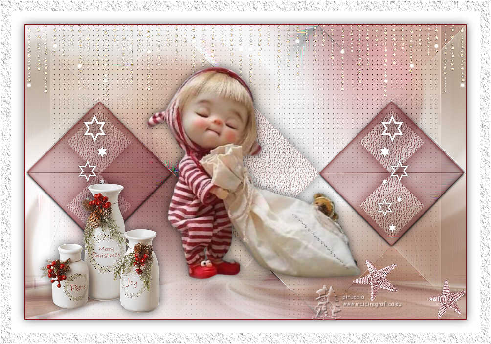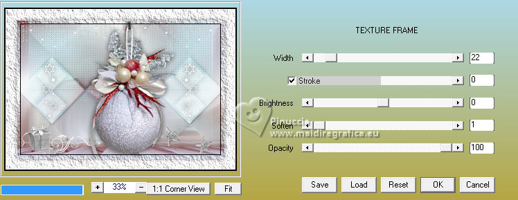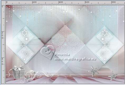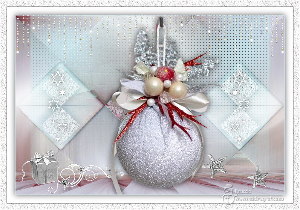 Ce tutoriel a été créé avec CorelX17, mais il peut également être exécuté avec les autres versions. Pour traduire le tutoriel j'ai utilisé CorelX17 pour l'italien et CorelX2 pour le français. Suivant la version utilisée, vous pouvez obtenir des résultats différents. Depuis la version X4, la fonction Image>Miroir a été remplacée par Image>Renverser horizontalement, et Image>Renverser avec Image>Renverser verticalement. Dans les versions X5 et X6, les fonctions ont été améliorées par la mise à disposition du menu Objets. Dans la nouvelle version X7, nous avons à nouveau Miroir/Renverser, mais avec autres différences. Voir plus les détails à ce sujet ici Certaines dénominations ont changées entre les versions de PSP. Les plus frequentes dénominations utilisées: ![]() Traduction en italien ici Vos versions ici![]() Nécessaire pour réaliser ce tutoriel: ![]() (les liens des sites des tubeuses ici) ![]() consulter, si nécessaire, ma section de filtre ici Mehdi - Sorting Tiles ici Mura's Meister - Perspective Tiling ici AAA Frames - Texture Frame ici ![]() Si vous voulez utiliser vos propres couleurs, n'hésitez pas à changer le mode et l'opacité des calques ![]() 1. Placer en avant plan la couleur #ffffff, et en arrière plan la couleur #cde4ec. ![]() 2. Ouvrir une nouvelle image transparente 900 x 600 pixels. ![]() Remplir l'image transparente avec la couleur blanche.3. Calques>Nouveau calque raster. Sélections>Sélectionner tout. 4. Ouvrir Kerstbal ![]() Édition>Copier. Revenir sur votre travail et Édition>Coller dans la sélection. Sélections>Désélectionner tout. 5. Effets>Effets d'image>Mosaïque sans jointures, par défaut. ![]() 6. Réglage>Flou>Flou radial. ![]() Effets>Effets de bords>Accentuer davantage. 7. Calques>Dupliquer. Effets>Modules Externes>Mehdi - Sorting Tiles. ![]() Effets>Effets de bords>Accentuer. 8. Vous positionner sur le calque Raster 2. Effets>Modules Externes>Mura's Meister - Perspective Tiling. ![]() Calques>Agencer>Placer en haut de la pile. 9. Activer l'outil Baguette magique , tolérance et progressivité 0,et cliquer dans la partie transparente pour la sélectionner. 10. Sélections>Modifier>Progressivité - 60 pixels. Presser 4 fois CANC sur le clavier ![]() Sélections>Désélectionner tout. 11. Ouvrir deco-1.png ![]() Édition>Copier. Revenir sur votre travail et Édition>Coller comme nouveau calque. Calques>Agencer>Déplacer vers le bas. 12. Ouvrir deco-4.png ![]() Édition>Copier. Revenir sur votre travail et Édition>Coller comme nouveau calque. Objets>Aligner>Haut. 13. Ouvrir deco-2.png ![]() Édition>Copier. Revenir sur votre travail et Édition>Coller comme nouveau calque. Placer le calque en mode Multiplier. 14. Vous positionner sur le calque du haut de la pile. Ouvrir deco-3.png ![]() Édition>Copier. Revenir sur votre travail et Édition>Coller comme nouveau calque. Effets>Effets d'image>Décalage. ![]() 15. Effets>Effets 3D>Ombre portée, couleur noire. ![]() 16. Ouvrir deco-5.png ![]() Édition>Copier. Revenir sur votre travail et Édition>Coller comme nouveau calque. Déplacer le tube en bas à gauche.17. Ouvrir deco-6.png ![]() Édition>Copier. Revenir sur votre travail et Édition>Coller comme nouveau calque. Déplacer ce tube en bas à droite.![]() 18. Activer à nouveau le tube Kerstbal ![]() Édition>Copier. Revenir sur votre travail et Édition>Coller comme nouveau calque. Positionner bien le tube au centre.![]() 19. Effets>Effets 3D>Ombre portée, comme précédemment. ![]() 20. Image>Ajouter des bordures, 2 pixels, symétrique, couleur d'arrière plan #cde4ec. Sélections>Sélectionner tout. Image>Ajouter des bordures, 50 pixels, symétrique, couleur #ffffff. 21. Effets>Effets 3D>Ombre portée, comme précédemment. ![]() Sélections>Désélectionner tout. 22. Effets>Modules Externes>AAA Frames - Texture Frame. ![]() 23. Signer votre travail sur un nouveau calque. 24. Calques>Fusionner>Tous et enregistrer en jpg. Pour le tube de cette version merci Wieskes ![]() ![]() Si vous avez des problèmes, ou des doutes, ou vous trouvez un link modifié, ou seulement pour me dire que ce tutoriel vous a plu, vous pouvez m'écrire. |