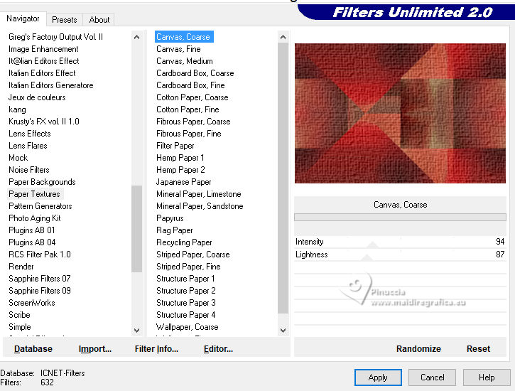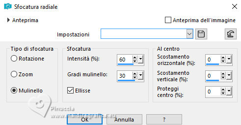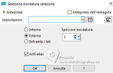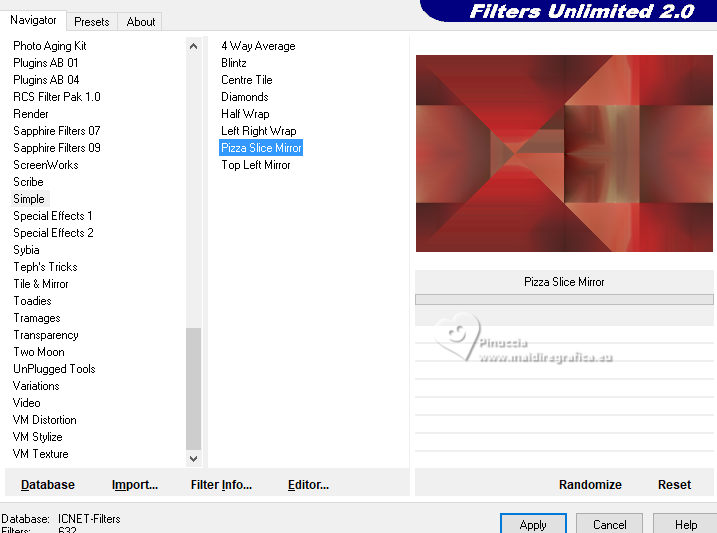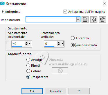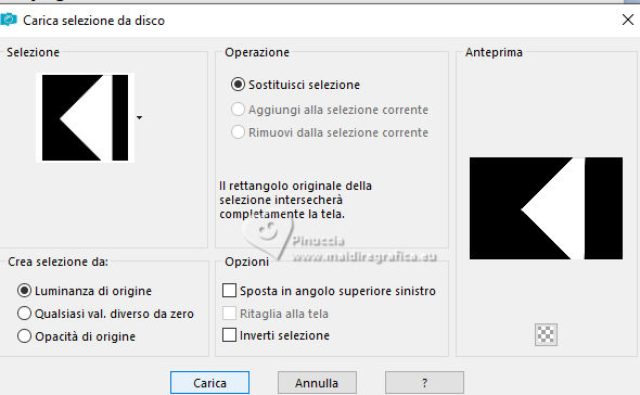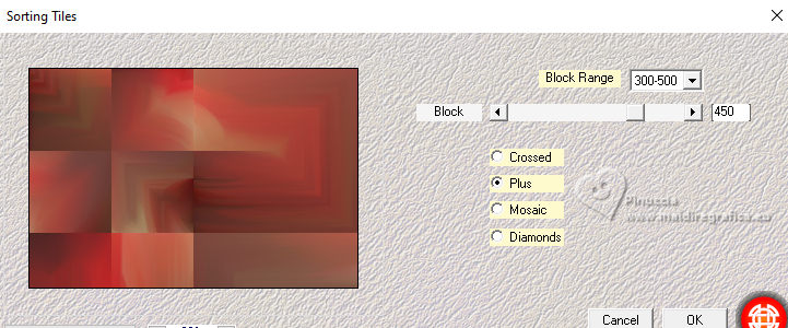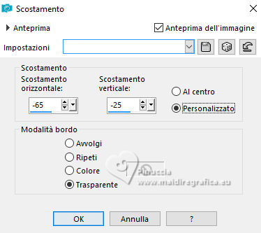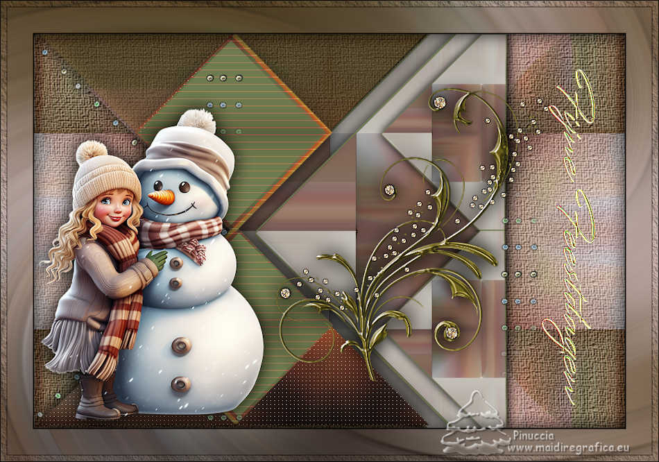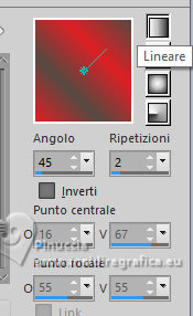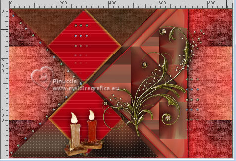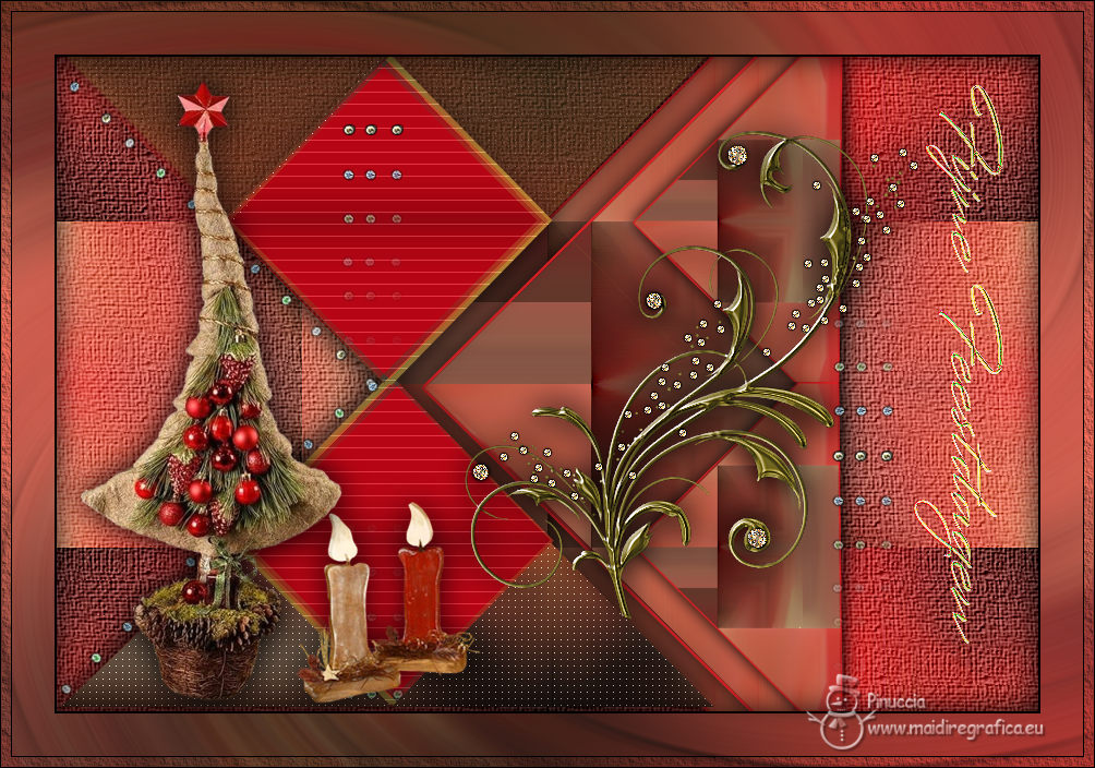 qui puoi trovare qualche risposta ai tuoi dubbi. Se l'argomento che ti interessa non è presente, ti prego di segnalarmelo. Per tradurre il tutorial ho usato PSPX9 e PSP2020, ma può essere eseguito con ogni versione di PSP. Dalla versione X4, il comando Immagine>Rifletti è stato sostituito con Immagine>Capovolgi in orizzontale, e il comando Immagine>Capovolgi con Immagine>Capovolgi in verticale. Nelle versioni X5 e X6, le funzioni sono state migliorate rendendo disponibile il menu Oggetti. Con la nuova versione X7, sono tornati Rifletti/Capovolgi, ma con nuove differenze Vedi la scheda sull'argomento qui traduzione in francese qui Le vostre versioni qui![]() Occorrente: ![]() (in questa pagina trovi i links ai siti dei creatori di tubes) ![]() in caso di dubbi, ricorda di consultare la mia sezione filtri qui Filters Unlimited 2.0 qui Simple - Pizza Slice Mirror qui Mehdi - Sorting Tiles qui AAA Frames - Texture Frame qui I filtri Simple si possono usare da soli o importati in Filters Unlimited (come fare vedi qui) Se un filtro fornito appare con questa icona ![]() se stai usando altri colori, sperimenta le modalità di miscelatura e opacità più adatte ai tuoi colori Nelle ultime versioni di PSP non c'é il gradiente di primo piano/sfondo (Corel_06_029) Puoi usare i gradienti delle versioni precedenti. Trovi qui i gradienti Corel X. ![]() Metti la selezione nella cartella Selezioni. 1. Imposta il colore di primo piano con #dd2025, e il colore di sfondo con #564a42. ![]() Passa il colore di primo piano a Gradiente di primo piano/sfondo, stile Lineare. ![]() 2. Apri una nuova immagine trasparente 900 x 600 pixels. ![]() Riempi l'immagine trasparente con il gradiente.3. Selezione>Seleziona tutto. Apri kerst-ertf.png ![]() Modifica>Copia. Torna al tuo lavoro e vai a Modifica>Incolla nella selezione. Selezione>Deseleziona. 4. Effetti>Effetti di immagine>Motivo unico, con i settaggi standard. ![]() 5. Regola>Sfocatura>Sfocatura radiale. ![]() Effetti>Effetti di bordo>Aumenta di più. 6. Effetti>Plugins>Mehdi - Sorting Tiles. ![]() 7. Effetti>Plugins>Filters Unlimited 2.0 - Simple - Pizza Slice Mirror. ![]() 8. Selezione>Carica/Salva selezione>Carica selezione da disco. Cerca e carica la selezione mb-kerst-4-2023 ![]() Selezione>Innalza selezione a livello. 9. Selezione>Modifica>Seleziona bordature selezione. ![]() 10. Passa il colore di primo piano a Colore. Modalità di corrispondenza dello strumento Riempimento su Nessuno ![]() Riempi la selezione con il colore di primo piano #dd2025.Selezione>Deseleziona. 11. Effetti>Effetti 3D>Sfalsa ombra, colore nero. ![]() 12. Livelli>Duplica. Effetti>Effetti di immagine>Scostamento. ![]() 13. Livelli>Duplica. Immagine>Ridimensiona, al 50%, tutti i livelli non selezionato. ![]() 14. Effetti>Effetti di immagine>Scostamento. ![]() 15. Livelli>Duplica. Immagine>Capovolgi. Livelli>Unisci>Unisci giù. 16. Apri deco-4-kerst-4.png ![]() Modifica>Copia. Torna al tuo lavoro e vai a Modifica>Incolla come nuovo livello. 17. Tasto K per attivare lo strumento Puntatore ![]() e imposta Posizione X: 4,00 e Posizione Y: -4,00. ![]() Tasto M per deselezionare lo strumento. 18. Effetti>Effetti 3D>Sfalsa ombra, con i settaggi precedenti. ![]() 19. Attiva il livello di sfondo, Raster 1. Effetti>Plugins>Filters Unlimited 2.0 - Paper Textures - Canvas Coarse, con i settaggi standard. ![]() 20. Regola>Correzione fotografica intelligente, con i settaggi standard. 21. Attiva il livello superiore. Apri deco-1-kerst-4.png ![]() Modifica>Copia. Torna al tuo lavoro e vai a Modifica>Incolla come nuovo livello. 22. Effetti>Effetti di immagine>Scostamento. ![]() 23. Apri deco-2.png ![]() Modifica>Copia. Torna al tuo lavoro e vai a Modifica>Incolla come nuovo livello. Spostalo a destra.24. Apri deco3- kerst-4.png ![]() Modifica>Copia. Torna al tuo lavoro e vai a Modifica>Incolla come nuovo livello. Spostalo in basso a sinistra.![]() 25. Attiva nuovamente il tube kerst-ertf.png ![]() Modifica>Copia. Torna al tuo lavoro e vai a Modifica>Incolla come nuovo livello. Spostalo a sinistra.![]() 26. Effetti>Effetti 3D>Sfalsa ombra, con i settaggi precedenti. ![]() 27. Immagine>Aggiungi bordatura, 2 pixels, simmetriche, colore nero. Selezione>Seleziona tutto. Immagine>Aggiungi bordatura, 50 pixels, simmetriche, colore bianco #ffffff. 28. Modifica>Copia Selezione>Inverti. Modifica>Incolla nella selezione 29. Regola>Sfocatura>Sfocatura radiale, con i settaggi precedenti. ![]() 30. Effetti>Effetti 3D>Sfalsa ombra, con i settaggi precedenti. ![]() Selezione>Deseleziona. 31. Effetti>Plugins>AAA Frames - Texture Frame. ![]() 32. Apri texst ![]() Modifica>Copia. Torna al tuo lavoro e vai a Modifica>Incolla come nuovo livello. Spostalo a destra.33. Firma il tuo lavoro su un nuovo livello. 34. Livelli>Unisci>Unisci tutto e salva in formato jpg. Per il tube grazie Catty Creations ![]() ![]() Se hai problemi o dubbi, o trovi un link non funzionante, o anche soltanto per un saluto, scrivimi. |