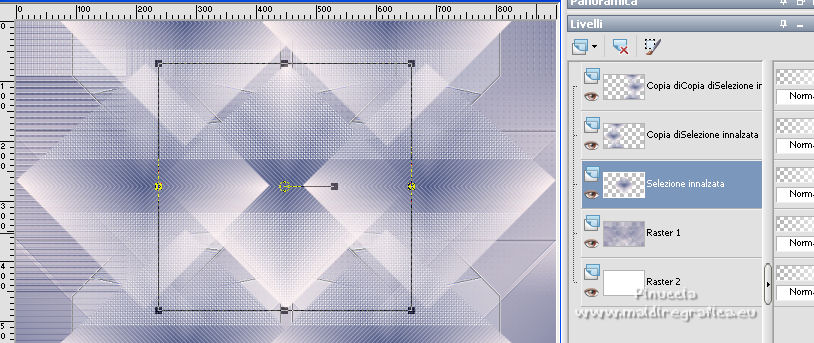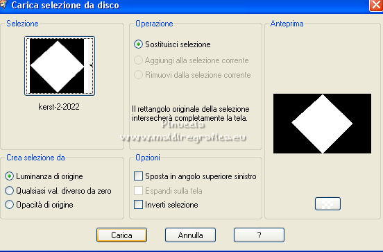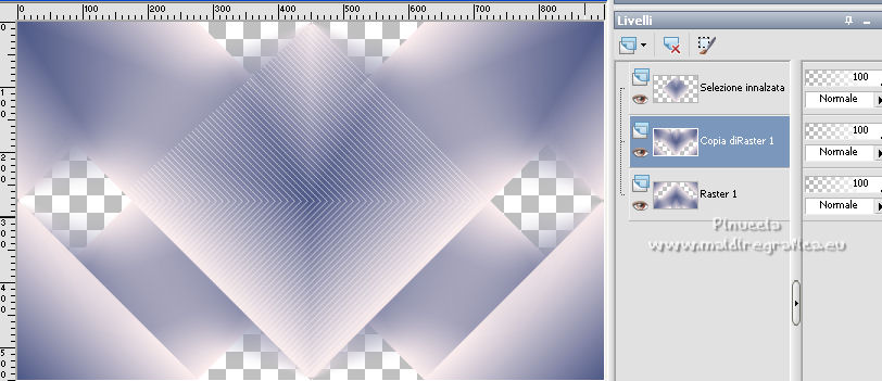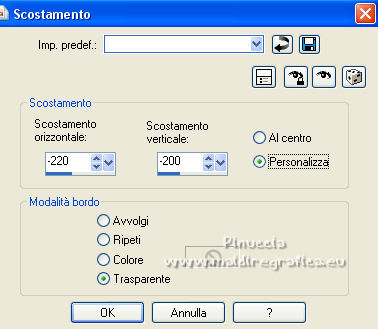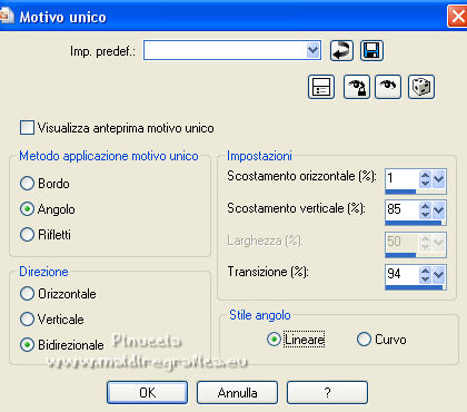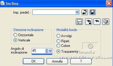qui puoi trovare qualche risposta ai tuoi dubbi. Se l'argomento che ti interessa non è presente, ti prego di segnalarmelo. Per tradurre il tutorial ho usato PSPX e PSPX2, ma può essere eseguito con ogni versione di PSP. Dalla versione X4, il comando Immagine>Rifletti è stato sostituito con Immagine>Capovolgi in orizzontale, e il comando Immagine>Capovolgi con Immagine>Capovolgi in verticale. Nelle versioni X5 e X6, le funzioni sono state migliorate rendendo disponibile il menu Oggetti. Con la nuova versione X7, sono tornati Rifletti/Capovolgi, ma con nuove differenze Vedi la scheda sull'argomento qui traduzione in francese qui Le vostre versioni qui![]() Occorrente: ![]() (in questa pagina trovi i links ai siti dei creatori di tubes) ![]() in caso di dubbi, ricorda di consultare la mia sezione filtri qui Filters Unlimited 2.0 qui Toadies - What are you qui [AFS IMPORT] - sqborder2 qui AP 01 [Innovations] - Lines SilverLining qui I filtri Toadies e [AFS IMPORT] si possono usare da soli o importati in Filters Unlimited (come fare vedi qui) Se un filtro fornito appare con questa icona ![]() se stai usando altri colori, sperimenta le modalità di miscelatura e opacità più adatte ai tuoi colori Nelle ultime versioni di PSP non c'é il gradiente di primo piano/sfondo (Corel_06_029) Puoi usare i gradienti delle versioni precedenti. Trovi qui i gradienti Corel X. Metti la selezione nella cartella Selezioni. 1. Imposta il colore di primo piano con #4e5987, e il colore di sfondo con #fdefef. ![]() Passa il colore di primo piano a Gradiente di primo piano/sfondo, stile Rettangolare. ![]() 2. Apri una nuova immagine trasparente 900 x 550 pixels. ![]() Riempi l'immagine trasparente con il gradiente.3. Effetti>Effetti geometrici>Inclina. ![]() 4. Effetti>Effetti di immagine>Motivo unico, con i settaggi standard. ![]() 5. Effetti>Effetti di riflesso>Specchio rotante. ![]() 6. Livelli>Duplica. Immagine>Capovolgi. 7. Selezione>Carica/Salva selezione>Carica selezione da disco. Cerca e carica la selezione Kerstles-2-2022. ![]() Selezione>Innalza selezione a livello. Selezione>Deseleziona. 8. Rimani sul livello superiore, Selezione innalzata. Effetti>Plugins>AP 01 [Innovations] - Lines SilverLining. ![]() 9. Attiva il livello Copia di Raster 1. ![]() Effetti>Plugins>AP 01 [Innovations] - Lines SilverLining. ![]() 10. Livelli>Unisci>Unisci giù. 11. Rimani posizionato sul livello Raster 1. Effetti>Plugins>Toadies - What Are you. ![]() Effetti>Effetti di bordo>Aumenta di più. 12. Imposta il colore di sfondo con il colore bianco #ffffff. Livelli>Nuovo livello raster. Riempi il livello con il colore bianco.Livelli>Disponi>Porta sotto. 13. Attiva il livello superiore, Selezione Innalzata. Immagine>Ridimensiona, al 75%, tutti i livelli non selezionato. 14. Effetti>Plugins>[AFS IMPORT] - sqborder2. ![]() 15. Livelli>Duplica. Immagine>Ruota a sinistra. 16. Effetti>Effetti di immagine>Motivo unico. ![]() 17. Immagine>Ruota a destra. 18. Oggetti>Allinea>Sinistra O attiva lo strumento Puntatore ![]() e imposta Posizione X 0,00. ![]() ![]() 19. Livelli>Duplica. Immagine>Rifletti. 20. Attiva il livello Selezione innalzata. ![]() Effetti>Effetti di immagine>Motivo unico, con i settaggi precedenti. ![]() 21. Effetti>Effetti 3D>Sfalsa ombra, colore nero. ![]() Attiva il livello soprastante, Copia di Selezione innalzata. Modifica>Ripeti Sfalsa ombra. Attiva il livello superiore, Copia (2) di Selezione innalzata. Modifica>Ripeti Sfalsa ombra. 22. Rimani posizionato sul livello superiore. Apri il tube deco-35.png e vai a Modifica>Copia.Torna al tuo lavoro e vai a Modifica>Incolla come nuovo livello. Cambia la modalità di miscelatura di questo livello in Luminanza (esistente). 23. Rimani sempre sul livello superiore. Apri il tube 0_a4063_766bd2b_XXL.png e vai a Modifica>Copia.Torna al tuo lavoro e vai a Modifica>Incolla come nuovo livello. 24. Effetti>Effetti di immagine>Scostamento. ![]() 25. Apri il tube deco-2.png e vai a Modifica>Copia.Torna al tuo lavoro e vai a Modifica>Incolla come nuovo livello. 26. Effetti>Effetti di immagine>Scostamento. ![]() 27. Apri tube-Tekst e vai a Modifica>Copia.Torna al tuo lavoro e vai a Modifica>Incolla come nuovo livello. 28. Effetti>Effetti di immagine>Scostamento. ![]() 29. Immagine>Aggiungi bordatura, 1 pixel, simmetriche, colore scuro di primo piano #4e5987. Selezione>Seleziona tutto. Immagine>Aggiungi bordatura, 50 pixels, simmetriche, colore bianco. Effetti>Effetti 3D>Sfalsa ombra, colore nero. ![]() Selezione>Deseleziona. 30. Immagine>Aggiungi bordatura, 1 pixel, simmetriche, colore scuro di primo piano #4e5987. 31. Apri il tube Rand e vai a Modifica>Copia.Torna al tuo lavoro e vai a Modifica>Incolla come nuovo livello. 32. Firma il tuo lavoro su un nuovo livello. Livelli>Unisci>Unisci tutto e salva in formato jpg. Per i tubes di questo esempio grazie Leloo e Kathy ![]() ![]() Se hai problemi o dubbi, o trovi un link non funzionante, o anche soltanto per un saluto, scrivimi. |