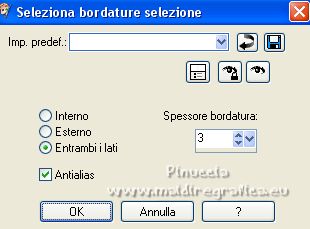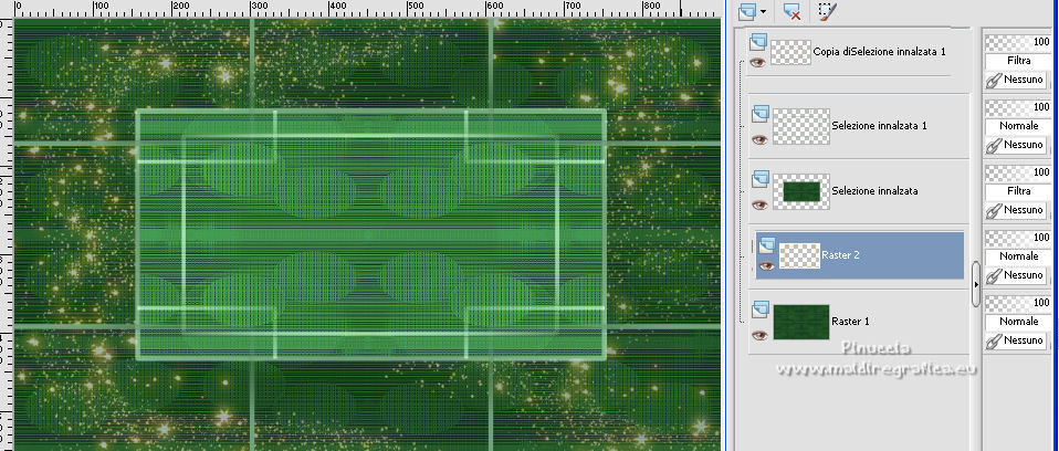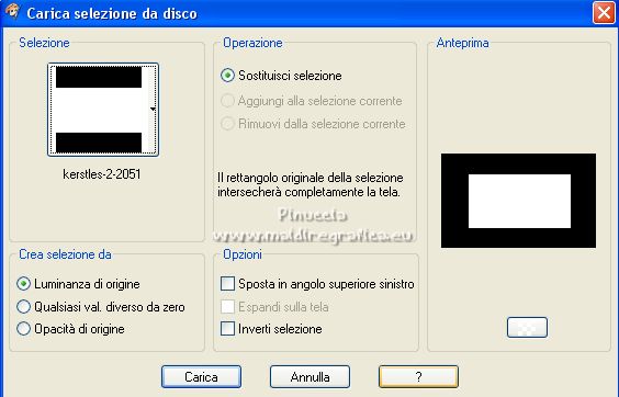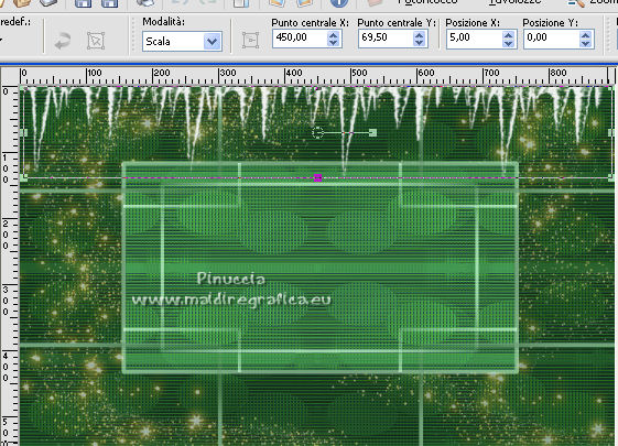 qui puoi trovare qualche risposta ai tuoi dubbi. Se l'argomento che ti interessa non è presente, ti prego di segnalarmelo. Per tradurre il tutorial ho usato Corel X7, ma può essere eseguito con ogni versione di PSP. Dalla versione X4, il comando Immagine>Rifletti è stato sostituito con Immagine>Capovolgi in orizzontale, e il comando Immagine>Capovolgi con Immagine>Capovolgi in verticale. Nelle versioni X5 e X6, le funzioni sono state migliorate rendendo disponibile il menu Oggetti. Con la nuova versione X7, sono tornati Rifletti/Capovolgi, ma con nuove differenze Vedi la scheda sull'argomento qui traduzione in francese qui Le vostre versioni quiOccorrente: Materiale qui (in questa pagina trovi i links ai siti dei creatori di tubes) Filtri in caso di dubbi, ricorda di consultare la mia sezione filtri qui Filters Unlimited 2.0 qui Andrew's Filter 30 - Fours Times to Grid qui il singolo effetto nel materiale Filters Andrew's can be used alone or imported into Filters Unlimited. (How do, you see here) If a plugin supplied appears with this icon ![]() ![]() se stai usando altri colori, sperimenta le modalità di miscelatura e opacità più adatte ai tuoi colori Metti la selezione nella cartella Selezioni. 1. Imposta il colore di primo piano con 73a37b, e il colore di sfondo con #477e50. ![]() 2. Apri una nuova immagine trasparente 900 x 550 pixels. ![]() 3. Selezione>Seleziona tutto. Apri X-Mas Time by_Mago74 pp (3).klein.png e vai a Modifica>Copia. Torna al tuo lavoro e vai a Modifica>Incolla nella selezione. Selezione>Deseleziona. 4. Effetti>Effetti di immagine>Motivo unico, con i settaggi standard. ![]() 5. Effetti>Plugins>Filters Unlimited 2.0 - Andrew's Filter 30 - Fours Times to Grid, con i settaggi standard. ![]() 6. Effetti>Effetti di bordo>Aumenta. 7. Selezione>Carica/Salva selezione>Carica selezione da disco. Cerca e carica la selezione kerstles-2-2051.PspSelection ![]() Selezione>Innalza selezione a livello. 8. Selezione>Modifica>Seleziona bordature selezione. ![]() Riempi la selezione con il colore chiaro di primo piano.9. Cambia la modalità di miscelatura di questo livello in Filtra. Selezione>Innalza selezione a livello. Selezione>Deseleziona. 10. Effetti>Effetti di immagine>Motivo unico, con i settaggi standard. ![]() 11. Livelli>Duplica. Immagine>Ridimensiona, all'80%, tutti i livelli non selezionato. 12. Selezione>Carica/Salva selezione>Carica selezione da disco. Carica nuovamente la selezione kerstles-2-2051.PspSelection ![]() 13. Selezione>Inverti. Premi sulla tastiera il tasto CANC ![]() Selezione>Deseleziona. 14. Cambia la modalità di miscelatura di questo livello in Filtra. Regola>Messa a fuoco>Accentua messa a fuoco. 15. Apri deco-1 e vai a Modifica>Copia. Torna al tuo lavoro e vai a Modifica>Incolla come nuovo livello. 16. Livelli>Disponi>Sposta giù - 3 volte. ![]() 17. Apri deco-2 e vai a Modifica>Copia. Torna al tuo lavoro e vai a Modifica>Incolla come nuovo livello. Livelli>Disponi>Porta in alto. Oggetti>Allinea>Superiore, o attiva lo strumento Puntatore ![]() e imposta Posizione Y a 0,00. ![]() 18. Apri deco-3 e vai a Modifica>Copia. Torna al tuo lavoro e vai a Modifica>Incolla come nuovo livello. 19. Apri eprf2rnw.png e vai a Modifica>Copia. Torna al tuo lavoro e vai a Modifica>Incolla come nuovo livello. Sposta il tube un po' più in basso (a scelta).20. Effetti>Effetti 3D>Sfalsa ombra, colore nero. ![]() 21. Immagine>Aggiungi bordatura, 2 pixels, simmetriche, colore scuro. Immagine>Aggiungi bordatura, 2 pixels, simmetriche, colore bianco #ffffff. Immagine>Aggiungi bordatura, 2 pixels, simmetriche, colore scuro. Immagine>Aggiungi bordatura, 50 pixels, simmetriche, colore bianco #ffffff. 22. Apri ster e vai a Modifica>Copia. Torna al tuo lavoro e vai a Modifica>Incolla come nuovo livello. 23. Immagine>Aggiungi bordatura, 2 pixels, simmetriche, colore scuro. 24. Firma il tuo lavoro su un nuovo livello. 25. Salva in formato jpg. . ![]() ![]() Se hai problemi o dubbi, o trovi un link non funzionante, o anche soltanto per un saluto, scrivimi. |