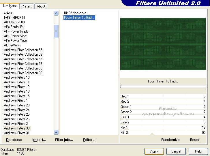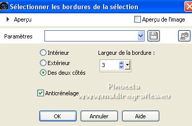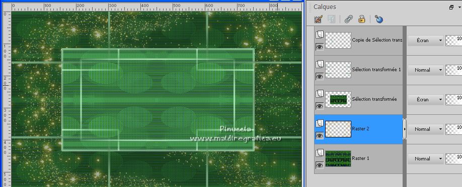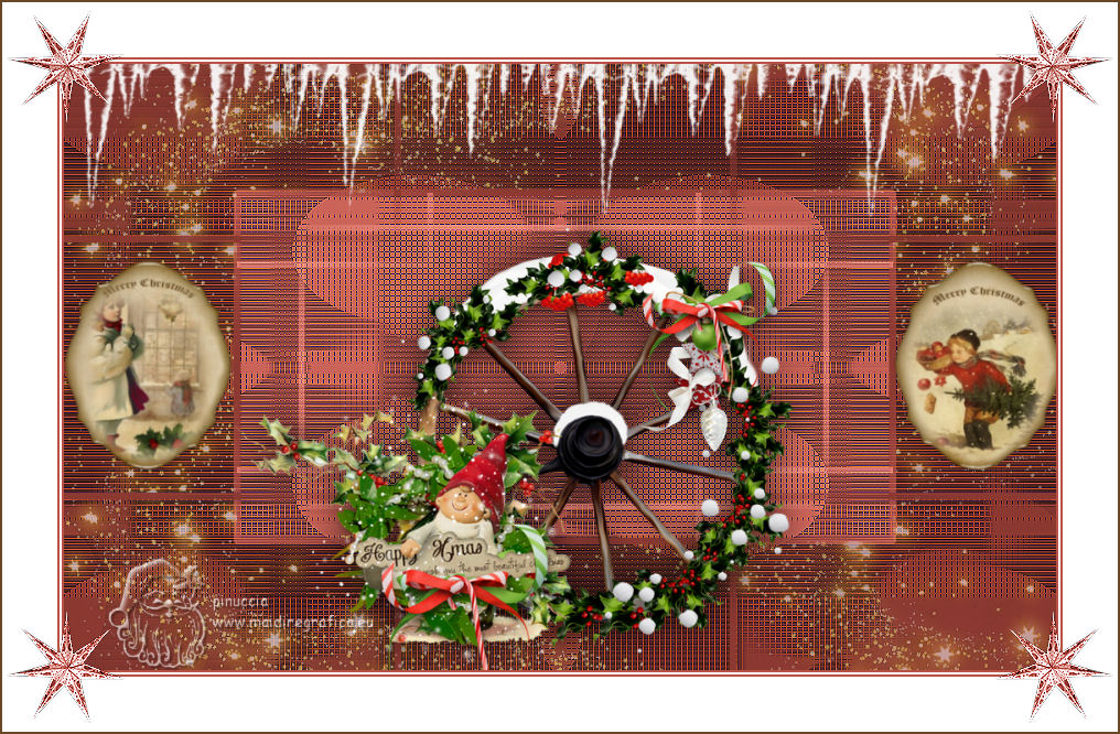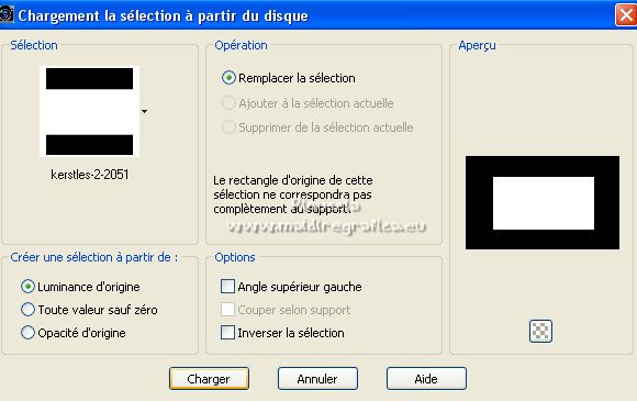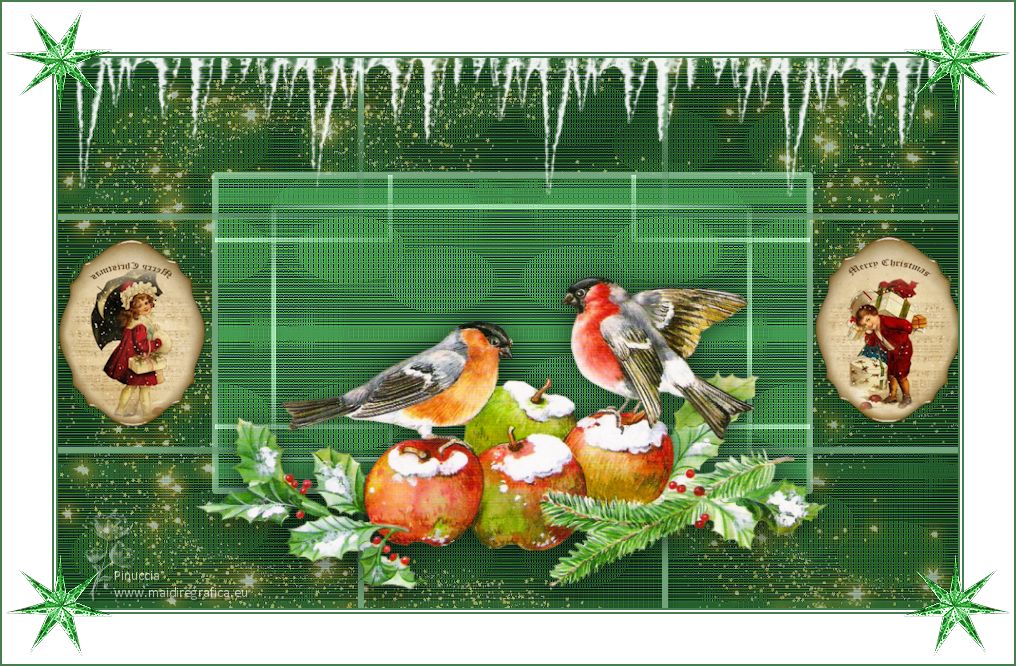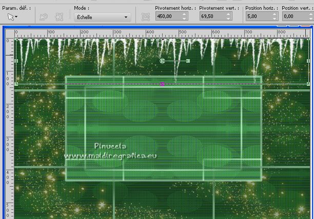 Ce tutoriel a été créé avec CorelX17, mais il peut également être exécuté avec les autres versions. Pour traduire le tutoriel j'ai utilisé CorelX17 pour l'italien et CorelX2 pour le français. Suivant la version utilisée, vous pouvez obtenir des résultats différents. Depuis la version X4, la fonction Image>Miroir a été remplacée par Image>Renverser horizontalement, et Image>Renverser avec Image>Renverser verticalement. Dans les versions X5 et X6, les fonctions ont été améliorées par la mise à disposition du menu Objets. Dans la nouvelle version X7, nous avons à nouveau Miroir/Renverser, mais avec autres différences. Voir plus les détails à ce sujet ici Certaines dénominations ont changées entre les versions de PSP. Les plus frequentes dénominations utilisées: ![]() Traduction en italien ici Vos versions iciNécessaire pour réaliser ce tutoriel: Matériel qui (les liens des sites des tubeuses ici) Modules Externes consulter, si nécessaire, ma section de filtre ici Filters Unlimited 2.0 ici Andrew's Filter 30 - Fours Times to Grid ici (le single effet dans le matériel) Filters Andrew's peuvent être utilisés seuls ou importés dans Filters Unlimited. voir comment le faire ici). Si un filtre est fourni avec cette icône, ![]() ![]() Si vous voulez utiliser vos propres couleurs, n'hésitez pas à changer le mode et l'opacité des calques Placer la sélection dans le dossier Sélections. 1. Placer en avant plan la couleur 73a37b, et en arrière plan la couleur #477e50. ![]() 2. Ouvrir une nouvelle image transparente 900 x 550 pixels. ![]() 3. Sélections>Sélectionner tout. Ouvrir X-Mas Time by_Mago74 pp (3).klein.png et Édition>Copier. Revenir sur votre travail et Édition>Coller dans la sélection. Sélections>Désélectionner tout. 4. Effets>Effets d'image>Mosaïque sans jointures, par défaut. ![]() 5. Effets>Modules Externes>Filters Unlimited 2.0 - Andrew's Filter 30 - Fours Times to Grid, par défaut ![]() 6. Effets>Effets de bords>Accentuer. 7. Sélections>Charger/Enregistrer une sélection>Charger à partir du disque. Chercher et charger la sélection kerstles-2-2051.PspSelection ![]() Sélections>Transformer la sélection en calque. 8. Sélections>Modifier>Sélectionner les bordures de la sélection. ![]() Remplir la sélection avec la couleur claire d'avant plan.9. Placer le calque en mode Écran. Sélections>Transformer la sélection en calque. Sélections>Désélectionner tout. 10. Effets>Effets d'image>Mosaïque sans jointures, par défaut. ![]() 11. Calques>Dupliquer. Image>Redimensionner, à 80%, redimensionner tous les calques décoché. 12. Sélections>Charger/Enregistrer une sélection>Charger à partir du disque. Charger à nouveau la sélection kerstles-2-2051.PspSelection ![]() 13. Sélections>Inverser. Presser CANC sur le clavier ![]() Sélections>Désélectionner tout. 14. Placer le calque en mode Écran. Réglage>Netteté>Davantage de netteté. 15. Ouvrir deco-1 et Édition>Copier. Revenir sur votre travail et Édition>Coller comme nouveau calque. 16. Calques>Agencer>Déplacer vers le bas - 3 fois. ![]() 17. Ouvrir deco-2 et Édition>Copier. Revenir sur votre travail et Édition>Coller comme nouveau calque. Calques>Agencer>Placer en haut de la pile. Objets>Alignes>Haut, ou activer l'outil Sélecteur ![]() et placer Position vert. 0,00. ![]() 18. Ouvrir deco-3 et Édition>Copier. Revenir sur votre travail et Édition>Coller comme nouveau calque. 19. Ouvrir eprf2rnw.png et Édition>Copier. Revenir sur votre travail et Édition>Coller comme nouveau calque. Déplacer le tube en peu plus en bas (à choix).20. Effets>Effets 3D>Ombre portée, couleur noire. ![]() 21. Image>Ajouter des bordures, 2 pixels, symétrique, couleur foncée. Image>Ajouter des bordures, 2 pixels, symétrique, couleur blanche #ffffff. Image>Ajouter des bordures, 2 pixels, symétrique, couleur foncée. Image>Ajouter des bordures, 50 pixels, symétrique, couleur blanche #ffffff. 22. Ouvrir ster et Édition>Copier. Revenir sur votre travail et Édition>Coller comme nouveau calque. 23. Image>Ajouter des bordures, 2 pixels, symétrique, couleur foncée. 24. Signer votre travail sur un nouveau calque. 25. Enregistrer en jpg. . ![]() ![]() Si vous avez des problèmes, ou des doutes, ou vous trouvez un link modifié, ou seulement pour me dire que ce tutoriel vous a plu, vous pouvez m'écrire. |